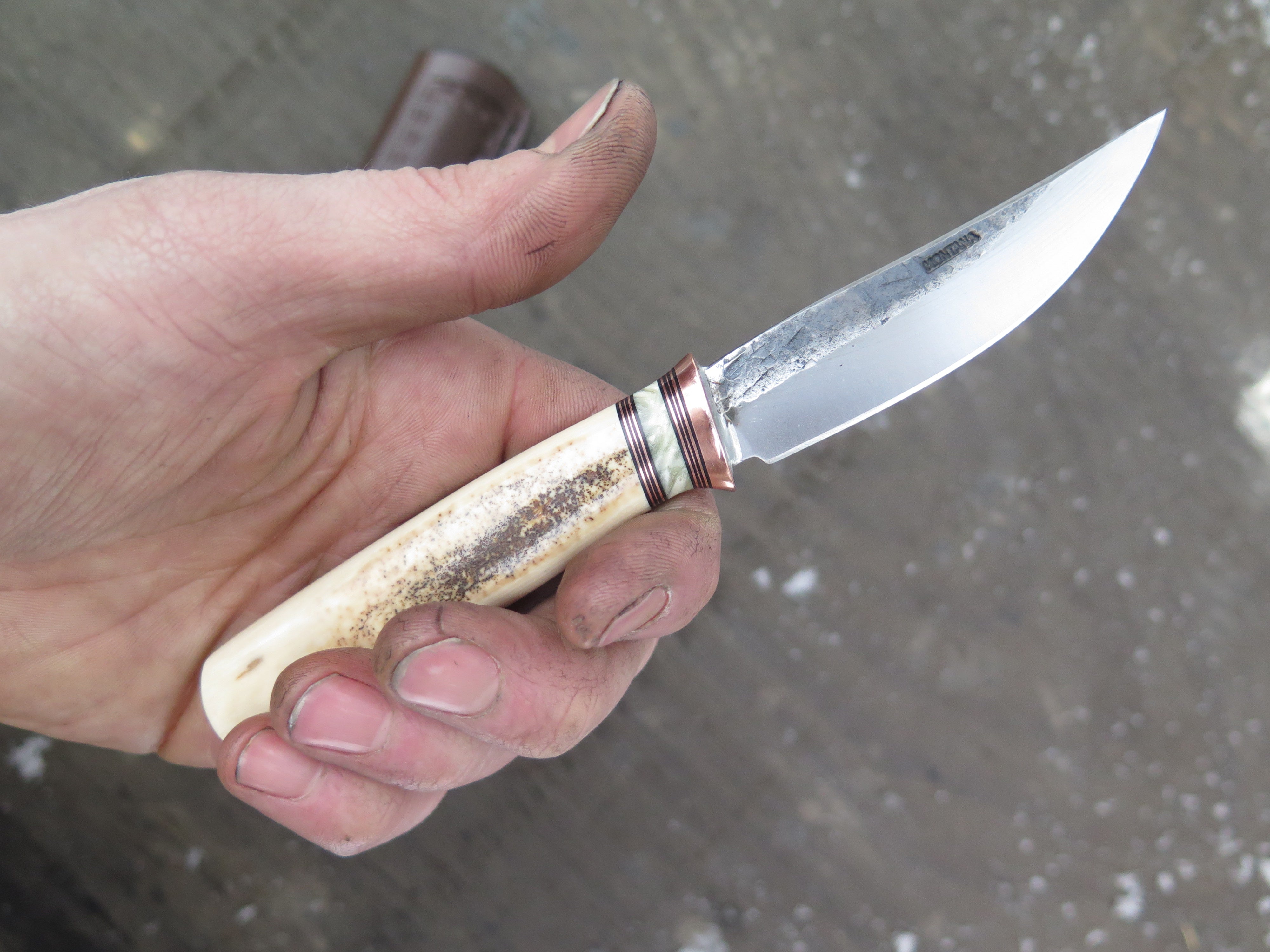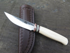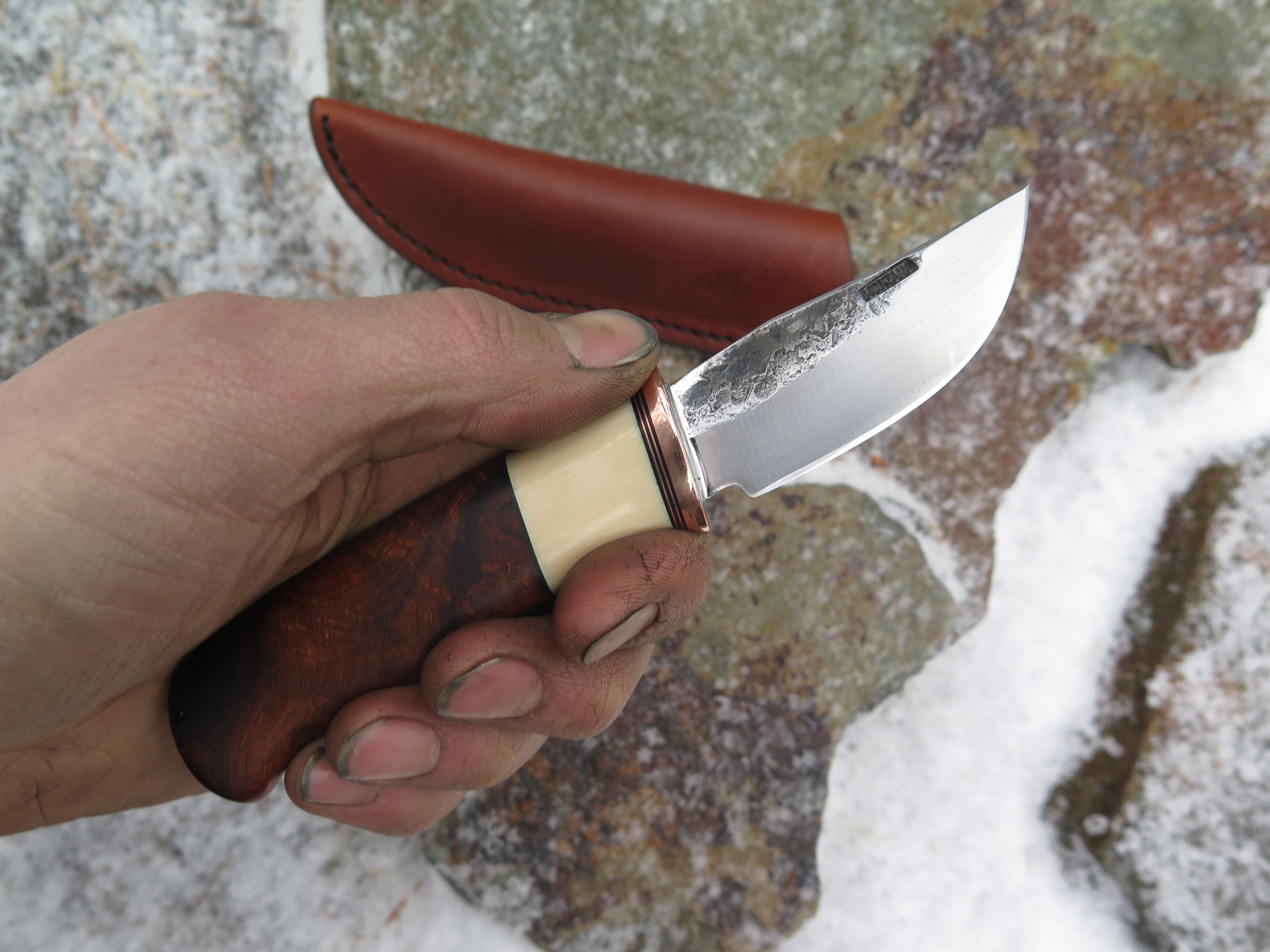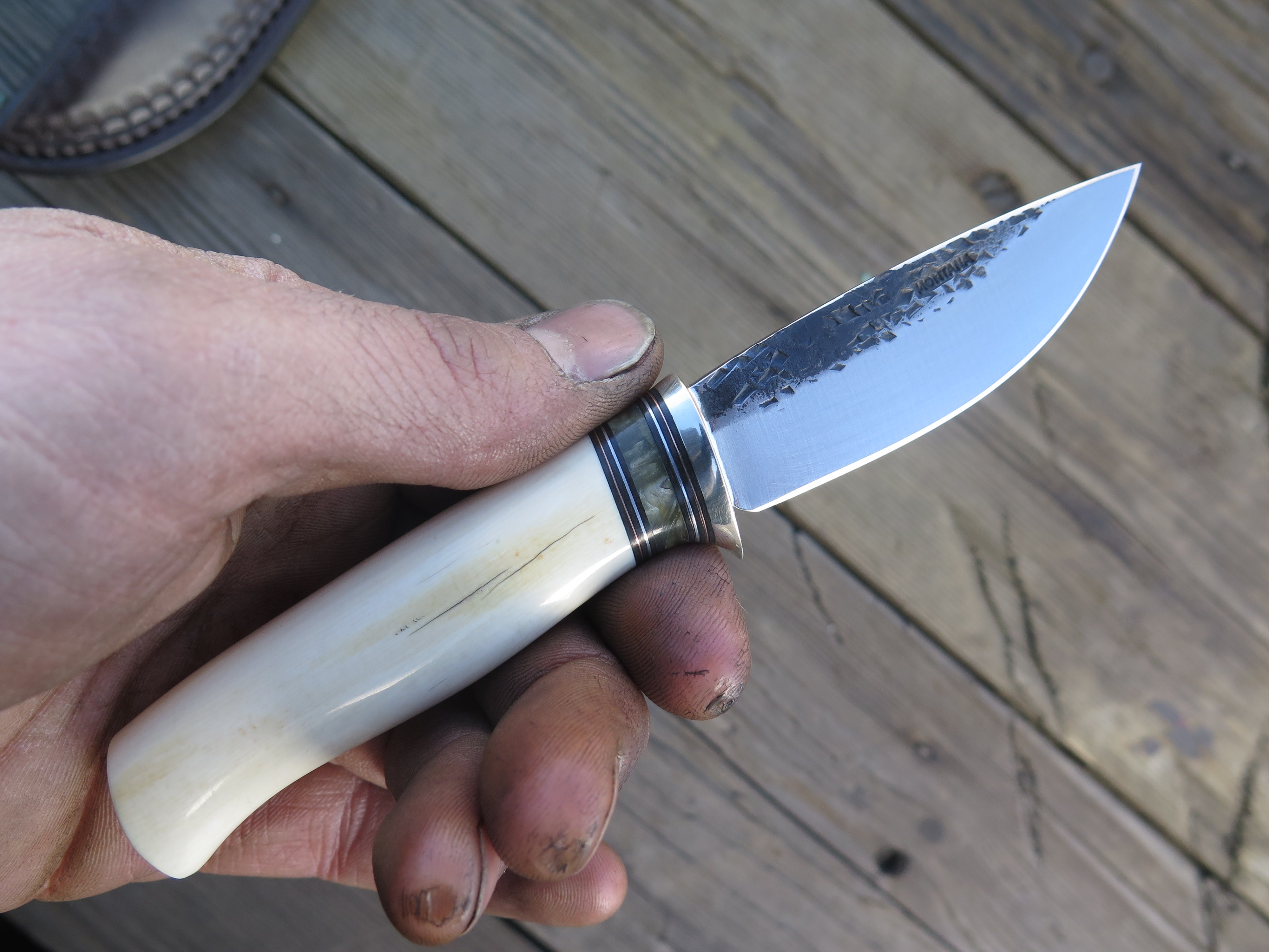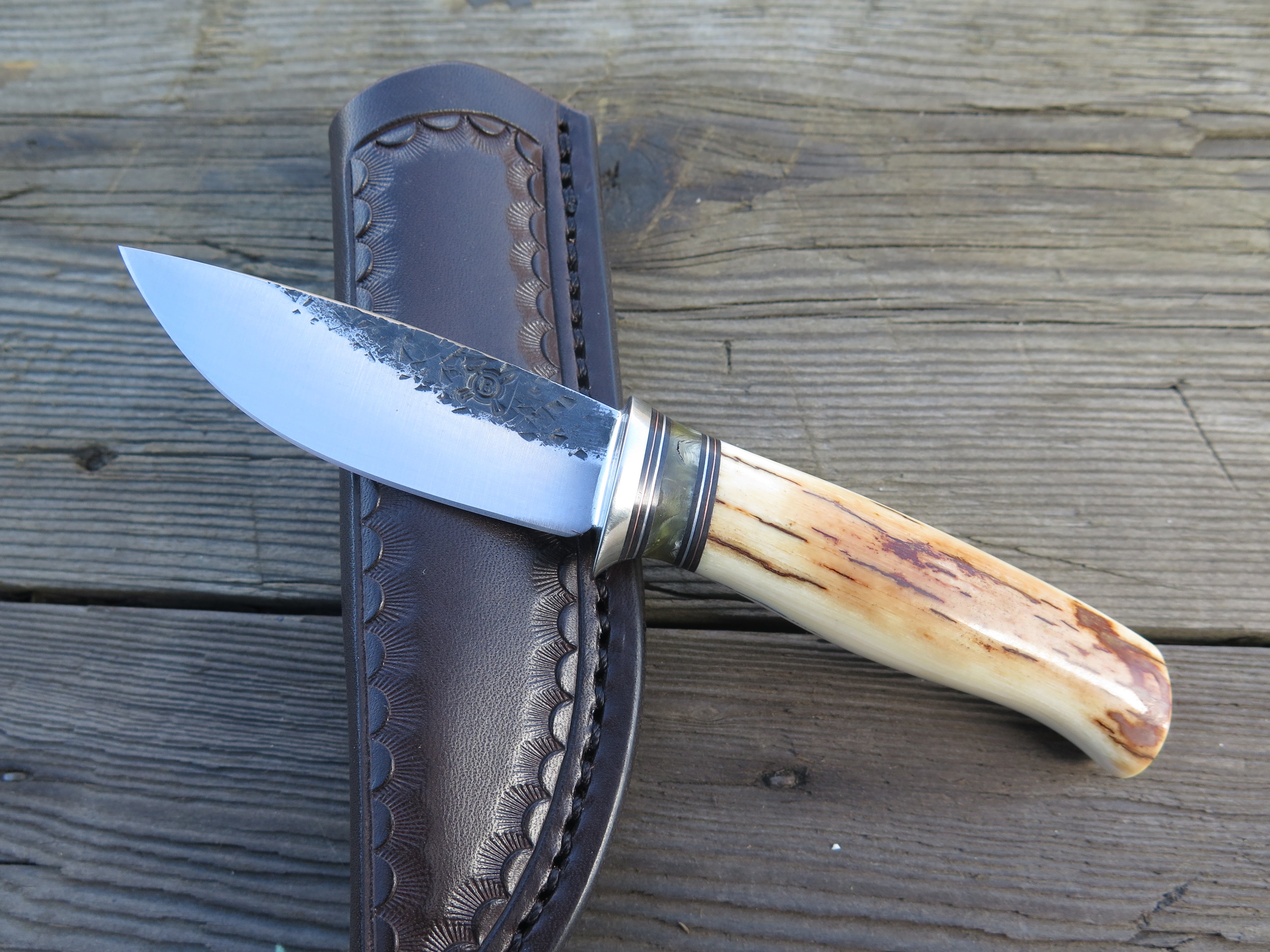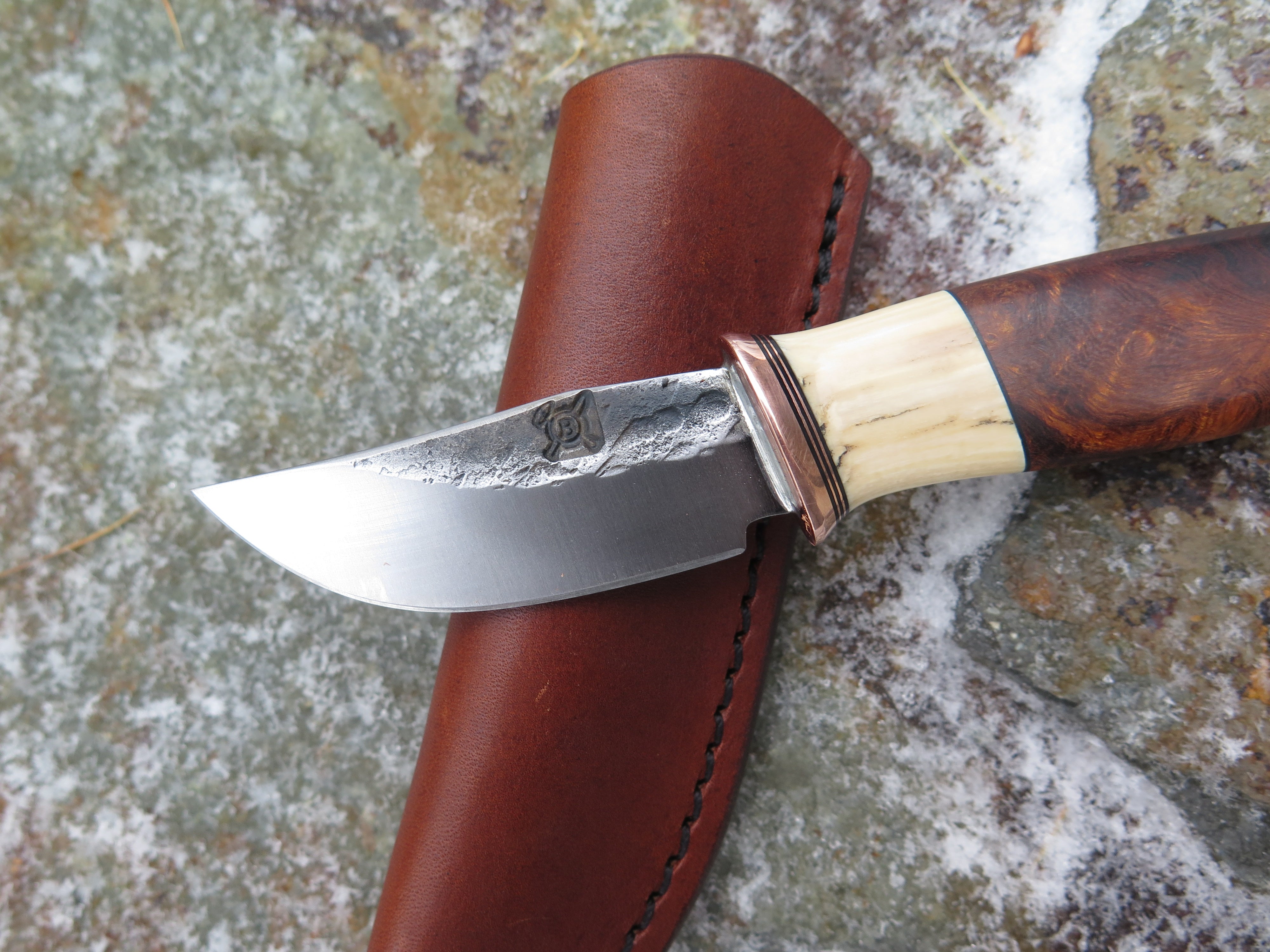 This remarkable fixed blade Pocket Knife from Behring Made© is hand forged from 1/8" thick high carbon 01 tool steel and it measures 3" from tip to guard with a razor sharp hollow grind and our hammermark finish. The copper guard is soldered in place above black fiber, copper and musk ox boss spacers as well as a gorgeous handle of ancient mammoth ivory. The overall length measures a total of 6 1/2" and it comes in a leather pocket clip sheath.