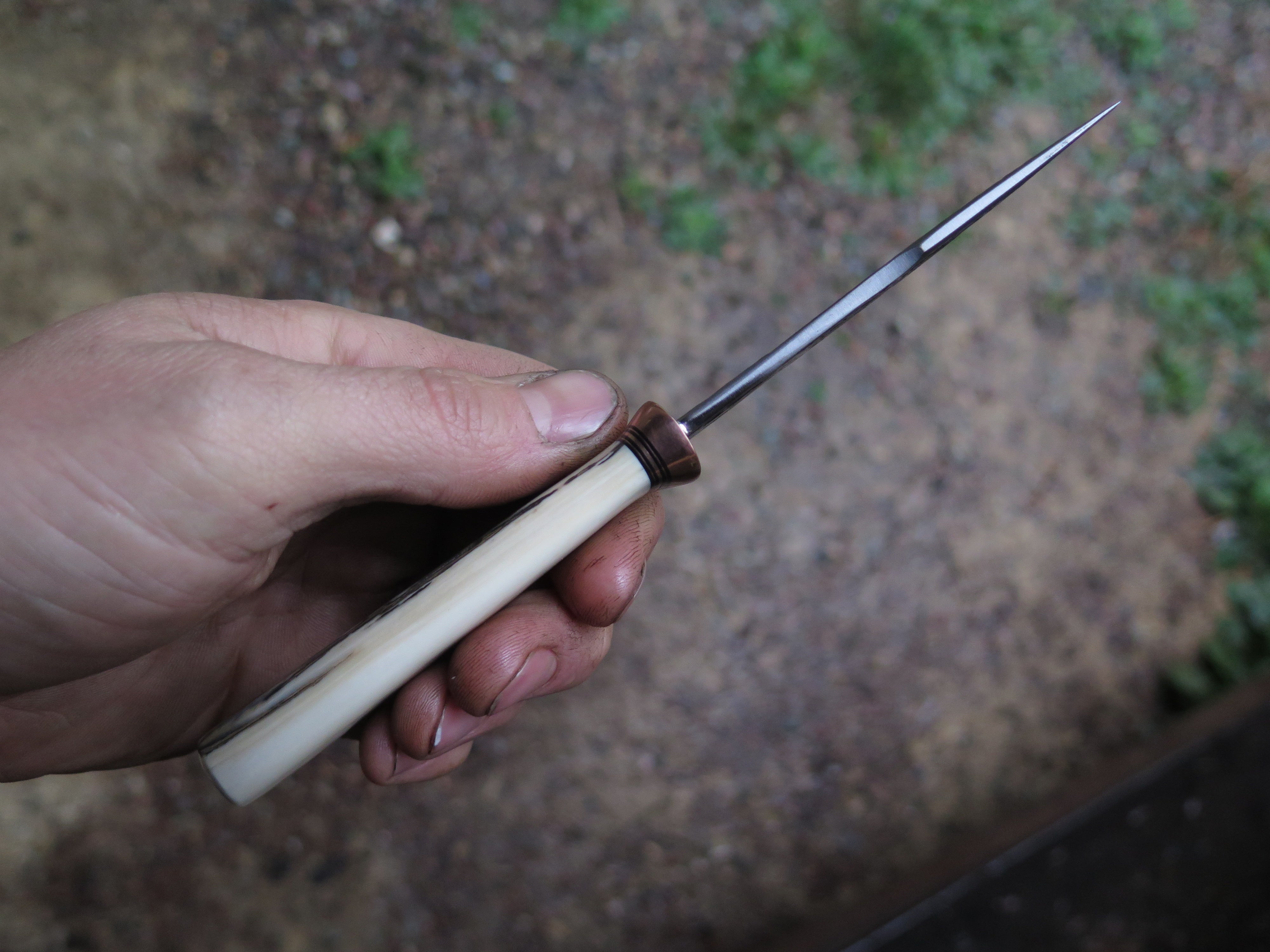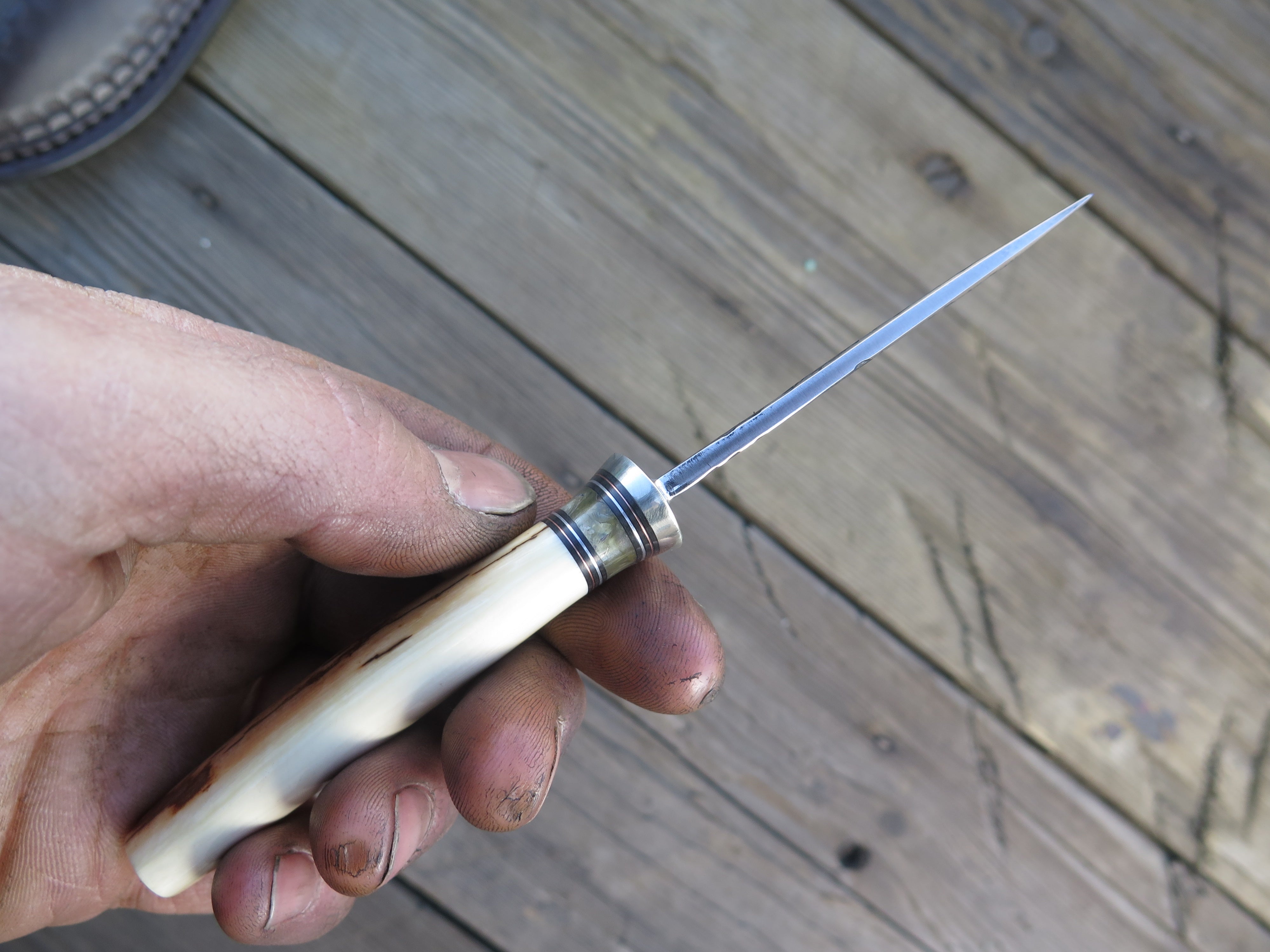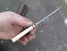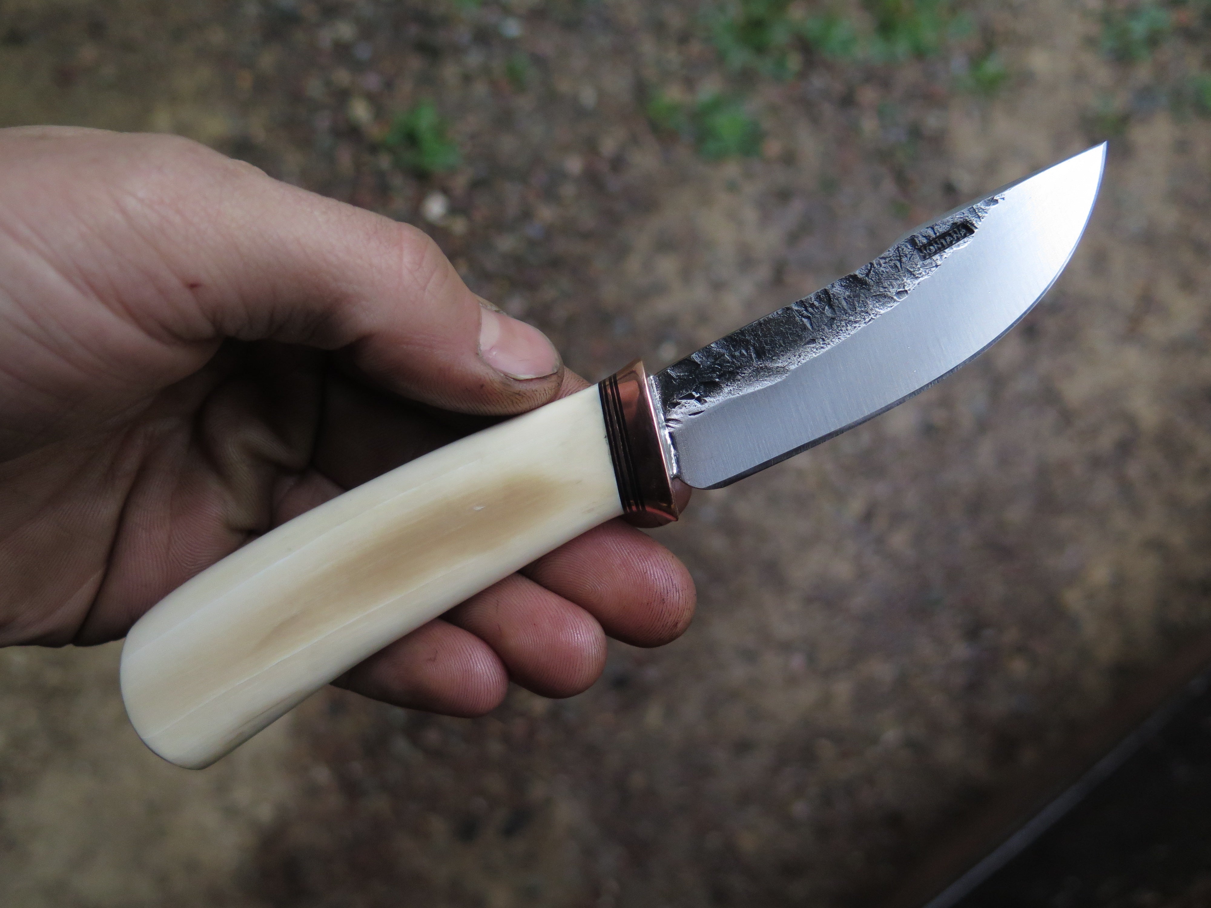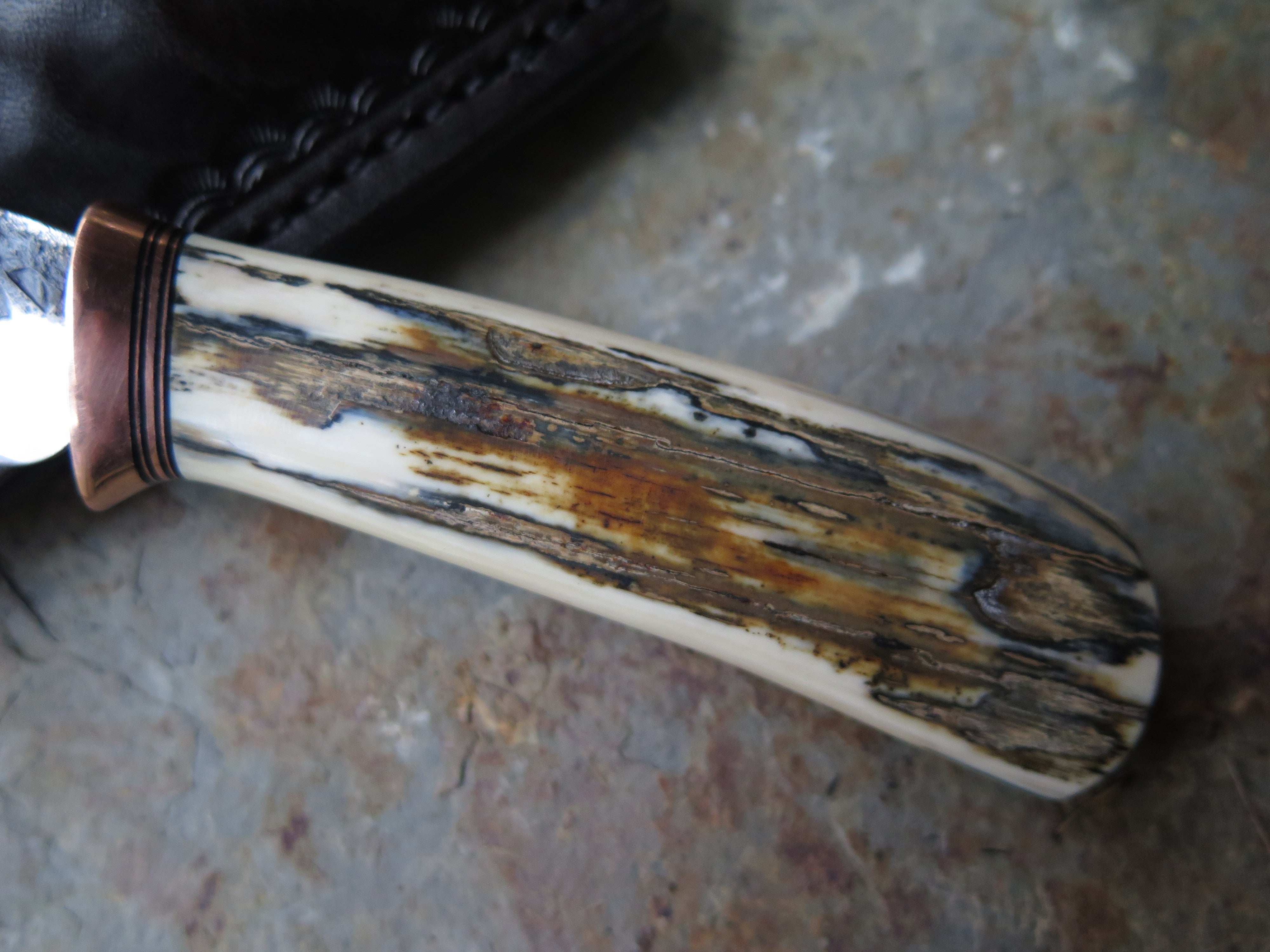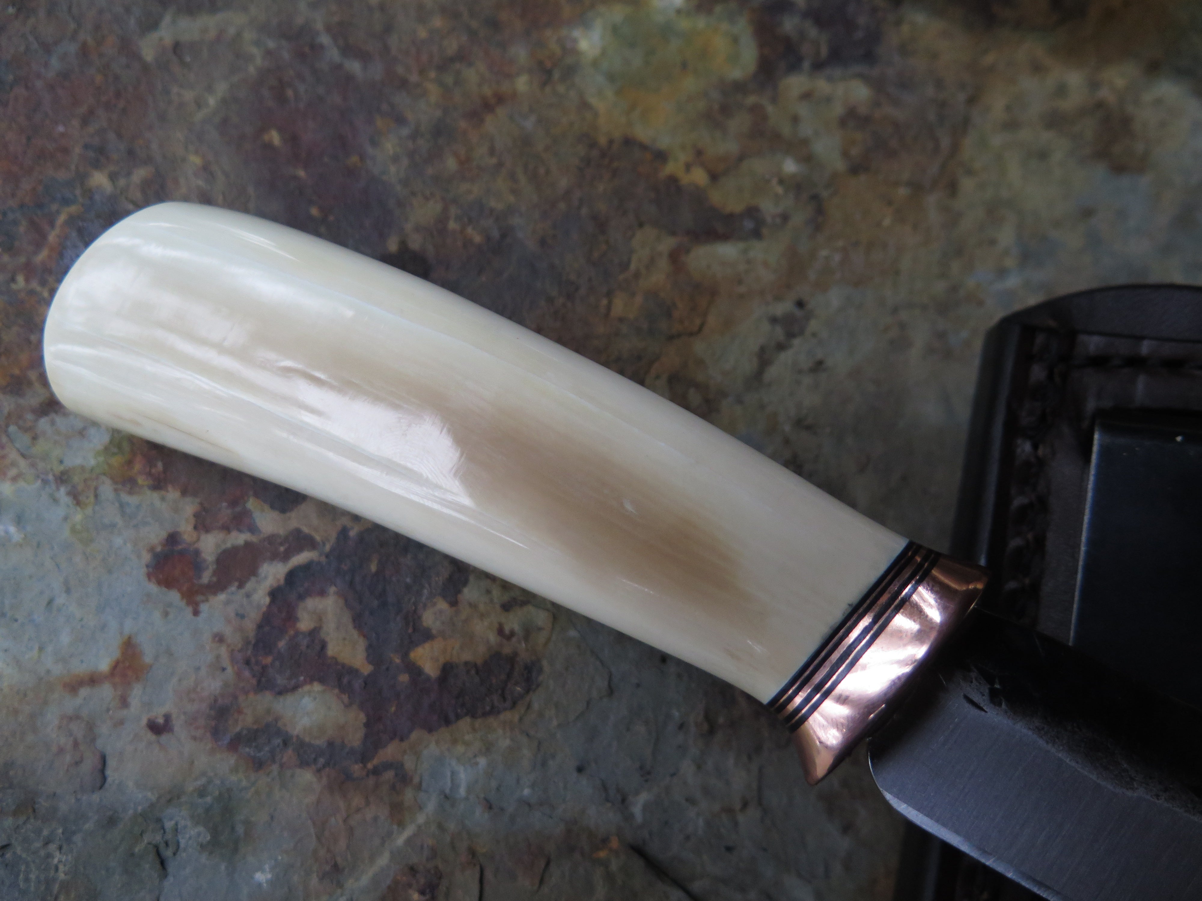 This remarkable fixed blade Pocket Knife from Behring Made© is hand forged from 1/8" thick high carbon 01 tool steel and it measures 3" from tip to guard with a razor sharp hollow grind and our hammermark finish. The copper guard is soldered in place above black fiber, copper and musk ox boss spacers as well as a gorgeous handle of ancient mammoth ivory. The overall length measures a total of 6 1/2" and it comes in a leather pocket clip sheath.