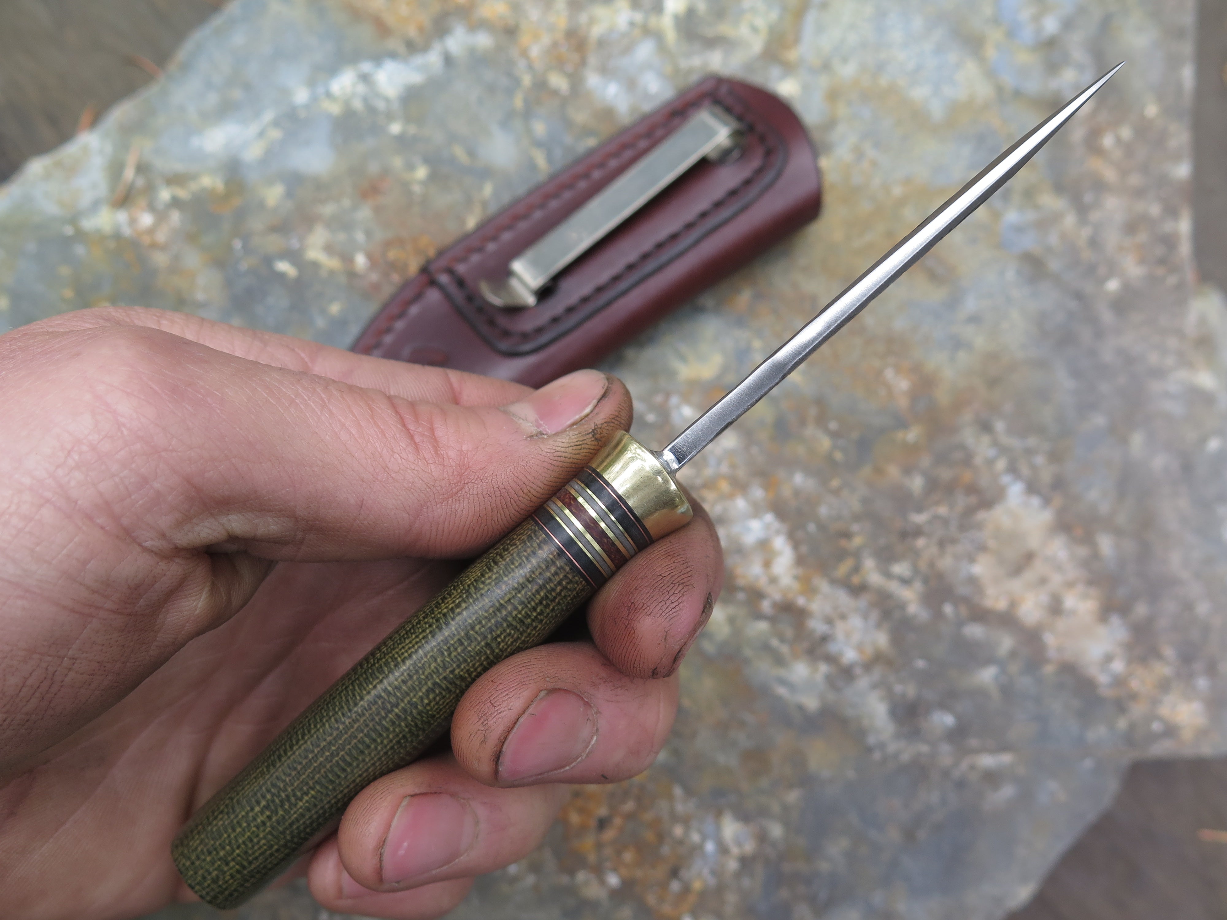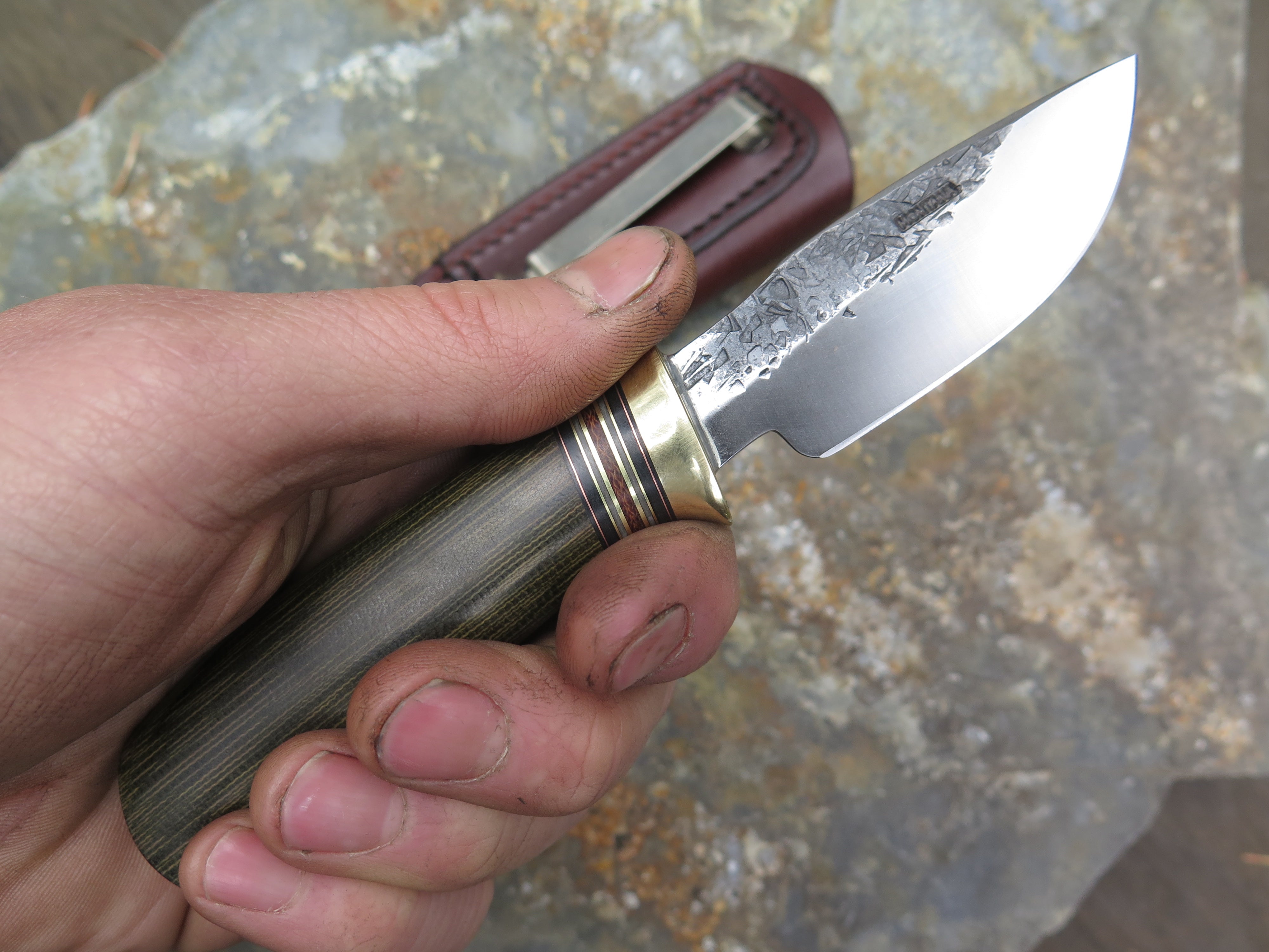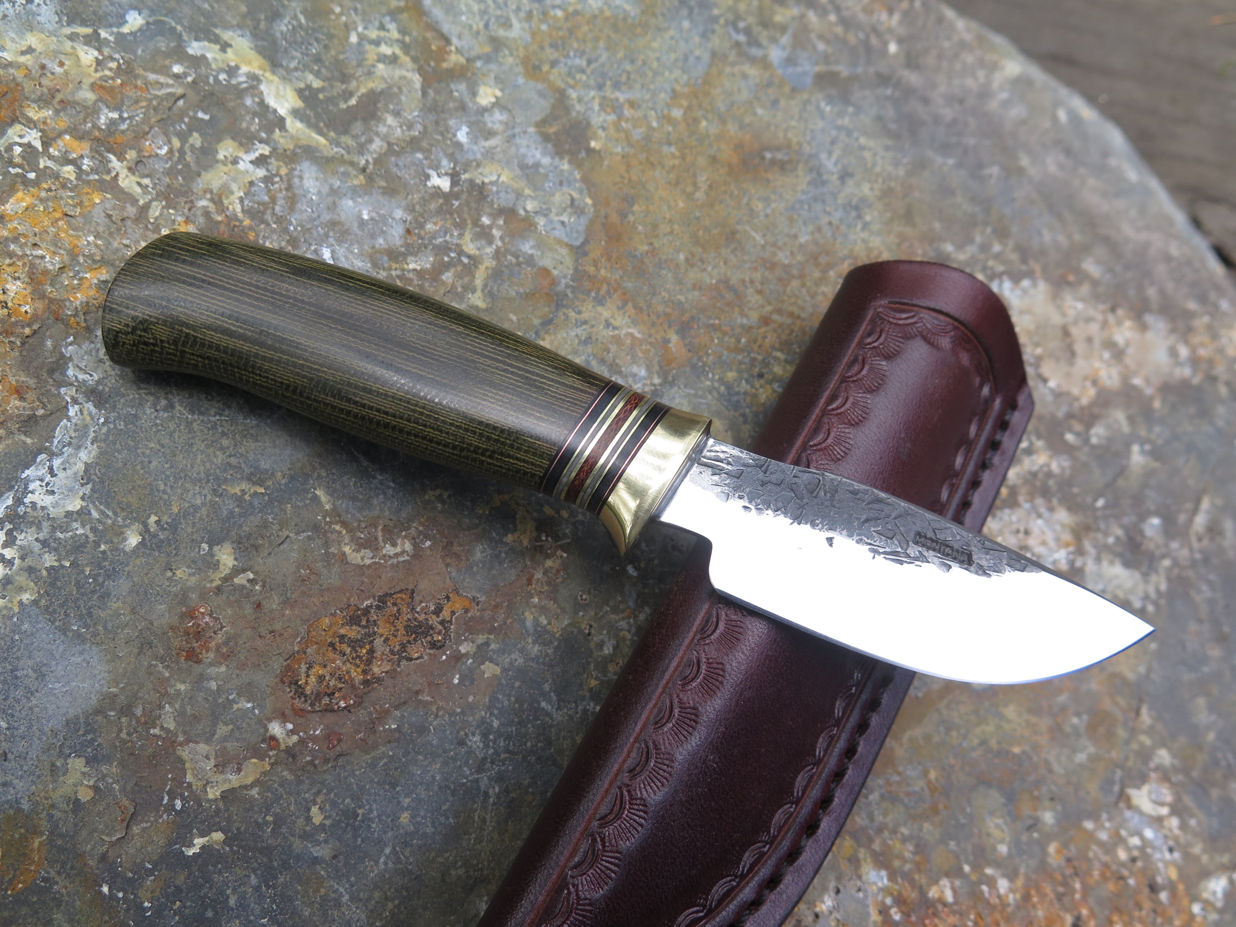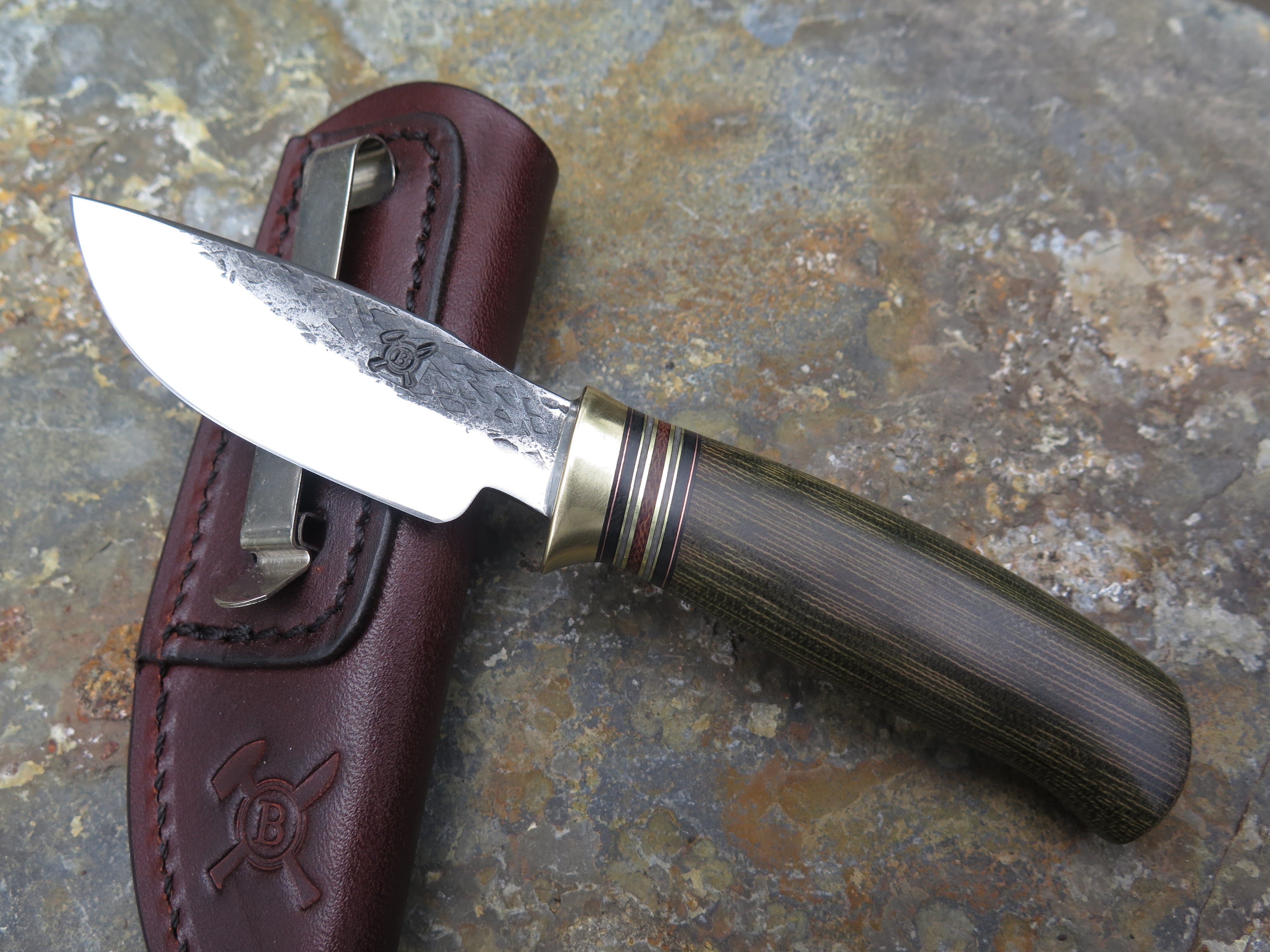 This beautiful Alaskan Pocket from Behring Made© is hand forged from 1/8" thick high carbon 01 tool steel and it measures 3" from tip to guard with a razor sharp hollow grind and our hammermark finish. The brass guard is soldered in place above black and gray fiber, brown micarta and brass spacers with a green canvas micarta handle. The overall length measures 6 1/4" and it comes in a clip style sheath designed to ride in the right hand pocket.