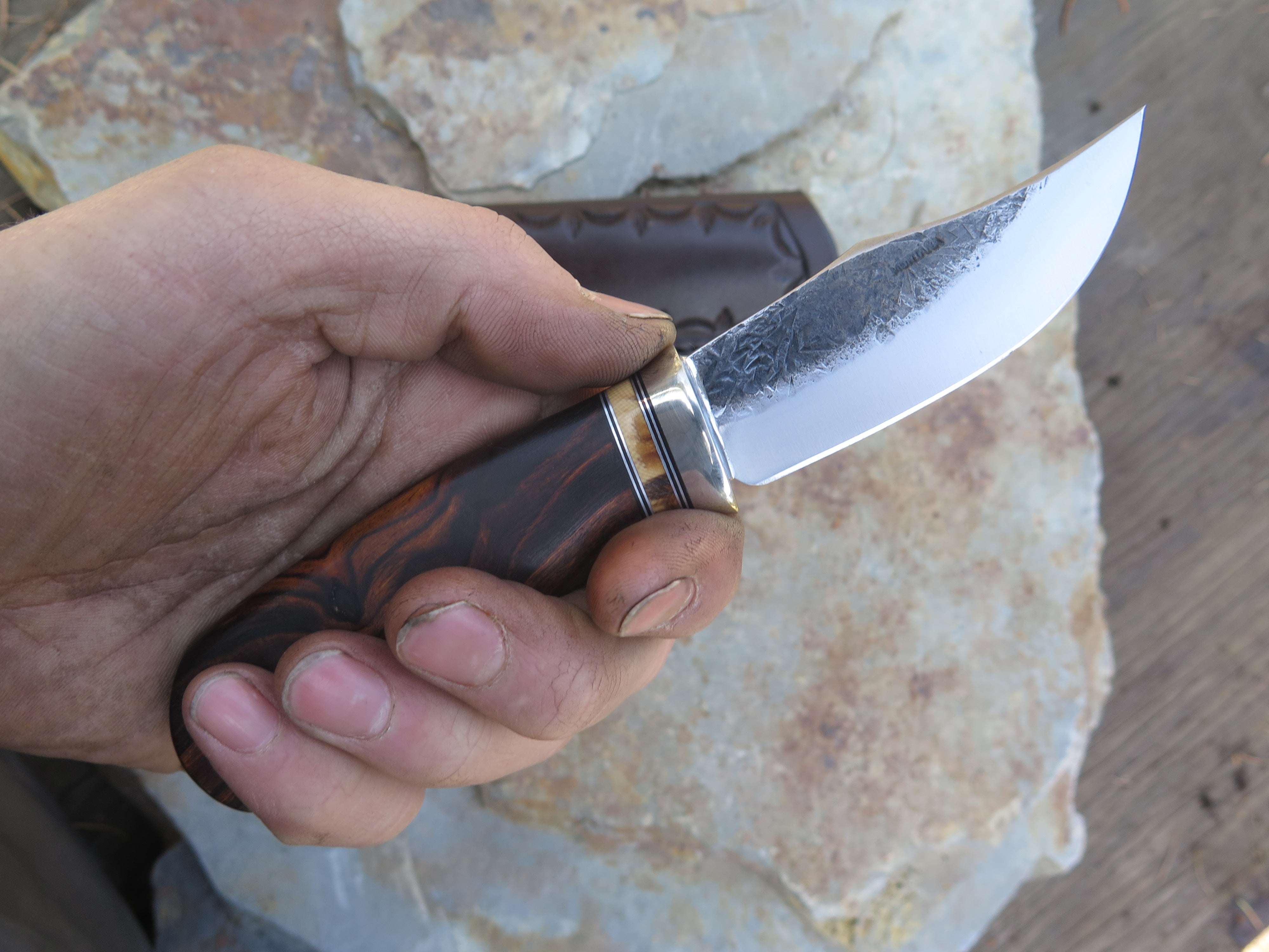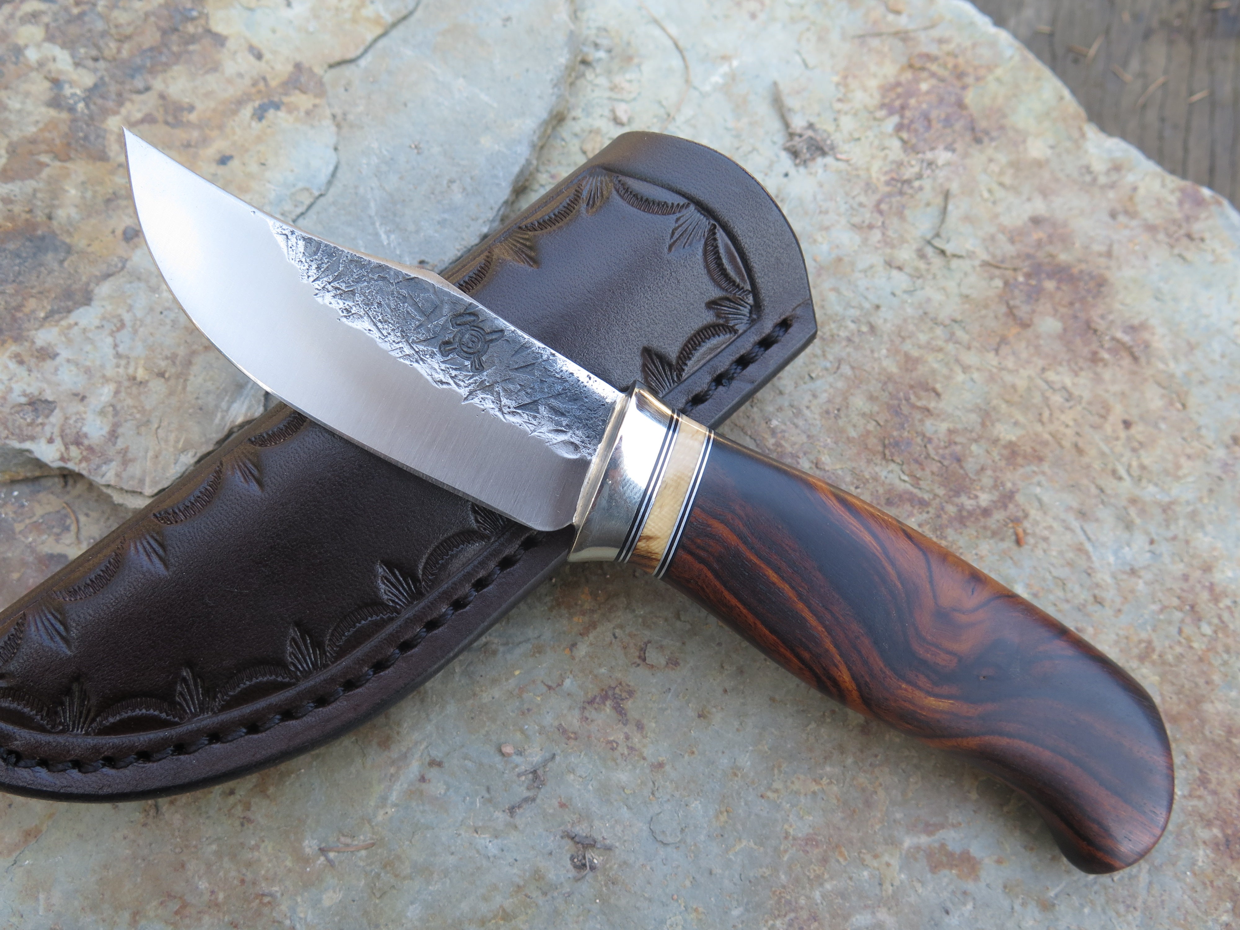 This beautiful new Clip Point Pocket from Behring Made© is hand forged from 1/8" thick high carbon 01 tool steel and it measures just over 3" from tip to guard with a razor sharp hollow grind and our hammermark finish. The nickel silver guard is soldered in place above black fiber, aluminum and mammoth ivory spacers as well as a premium desert ironwood burl handle. The overall length measures 6 7/8" and this one comes in a pocket clip sheath designed for a right-hand carry.