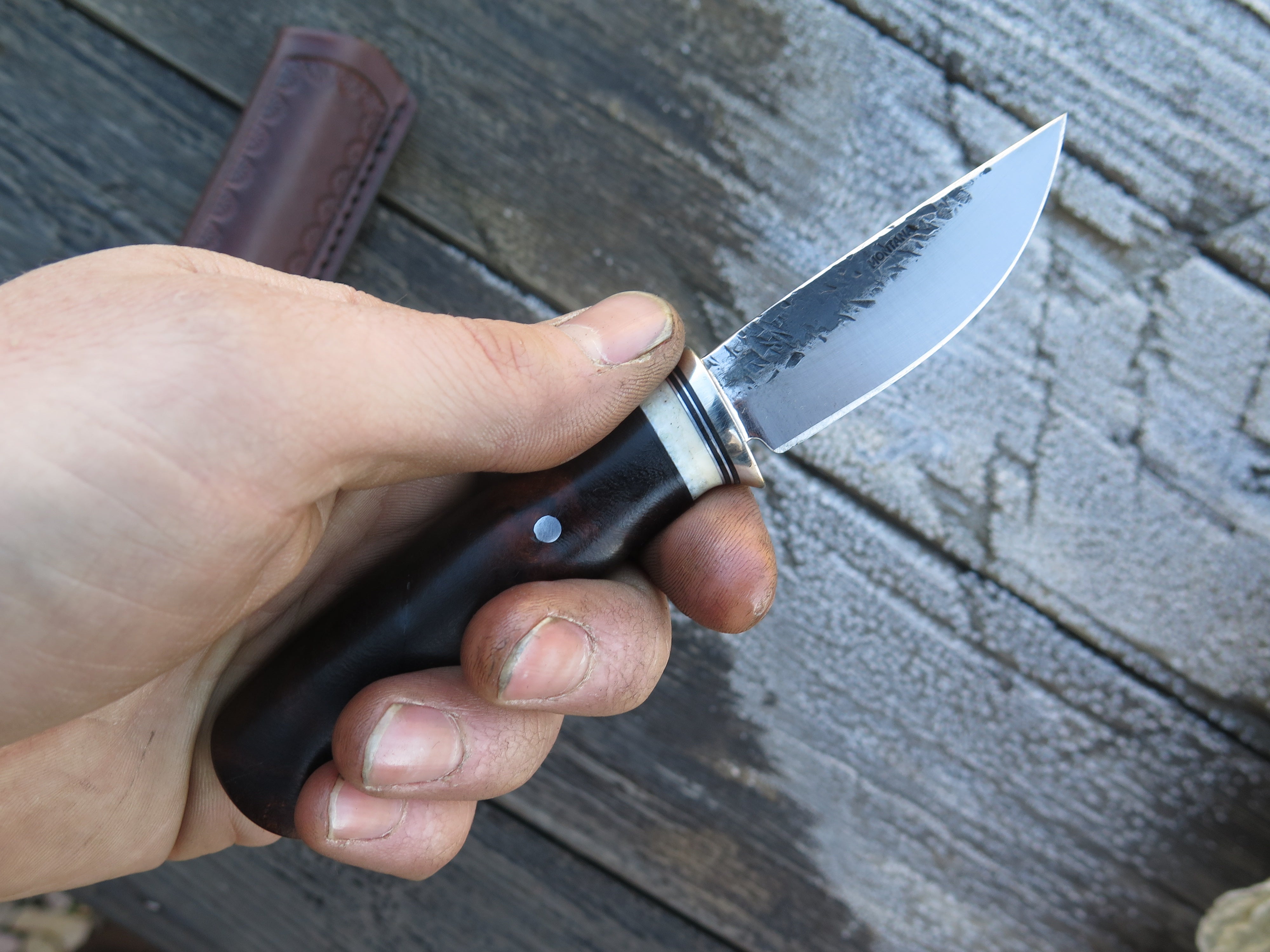 This incredible new Pocket Knife from Behring Made© is hand forged from 1/8" thick high carbon 01 tool steel and it measures 2 1/2" from tip to guard with a razor sharp hollow grind and our hammermark finish. The nickel silver guard is soldered in place above black fiber, aluminum and premium fossil walrus ivory that is a wonderful contrast to the desert ironwood burl handle. The overall length measures 6 1/4" and it comes in the shown Warlander Leather pocket sheath.