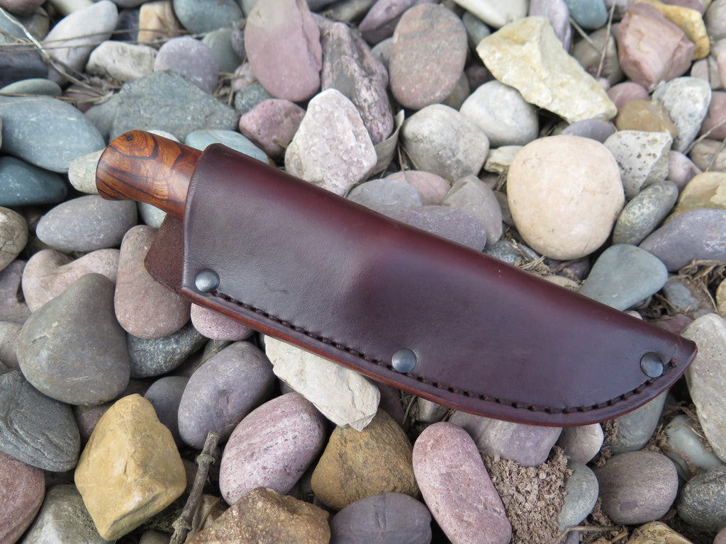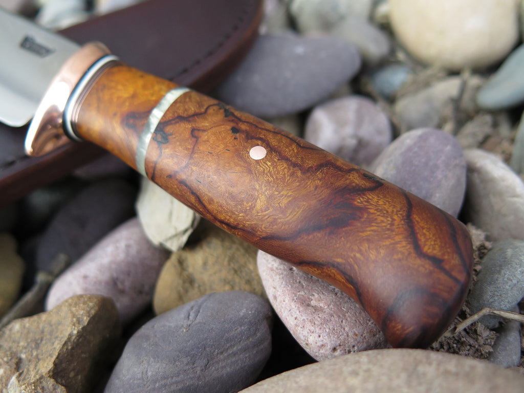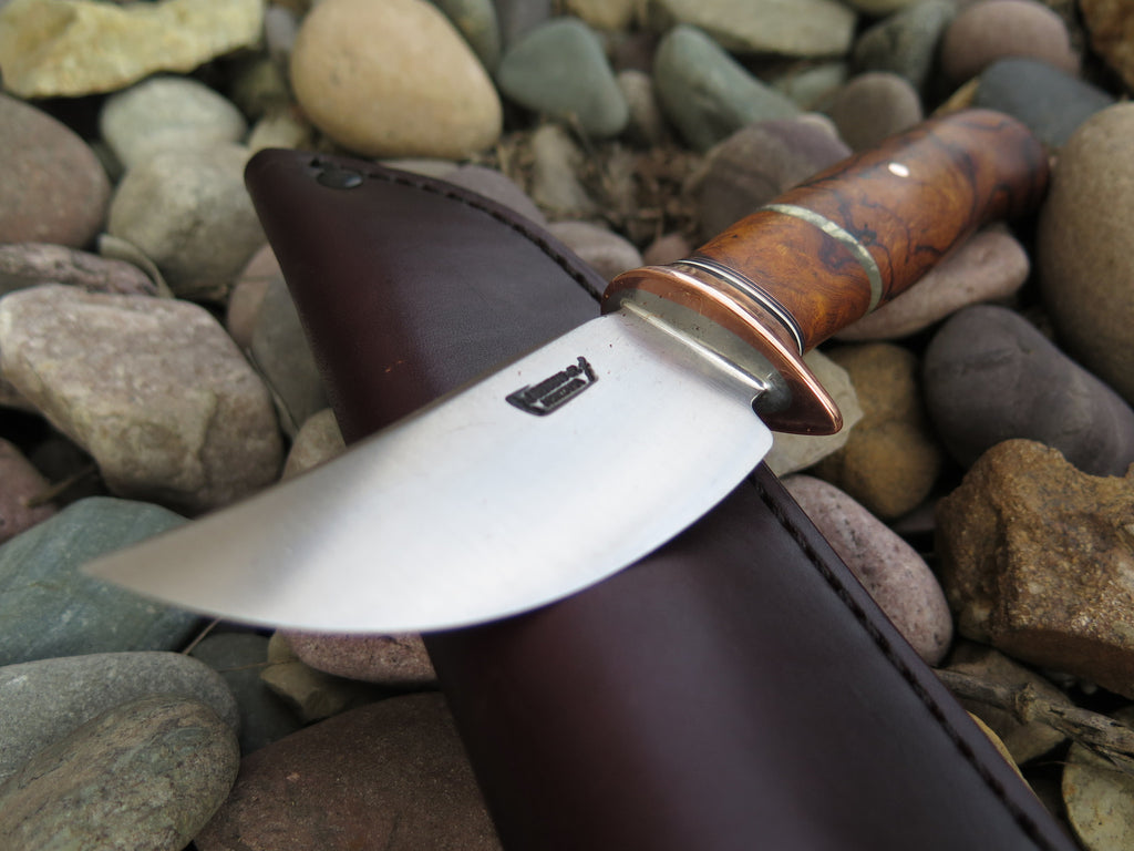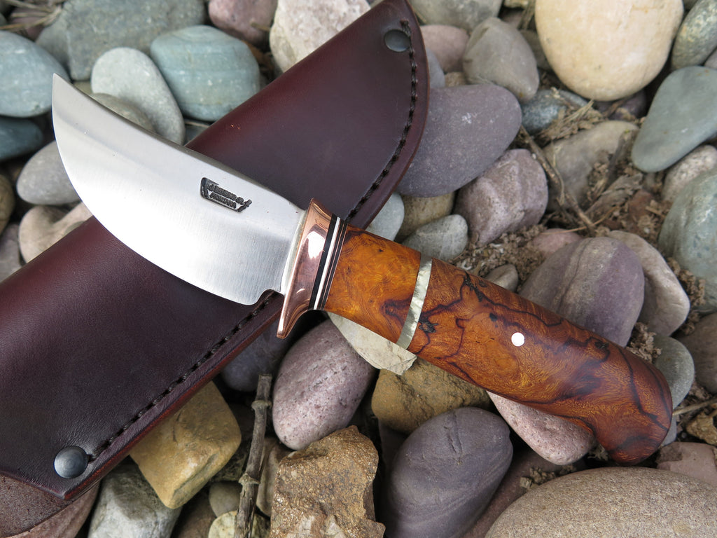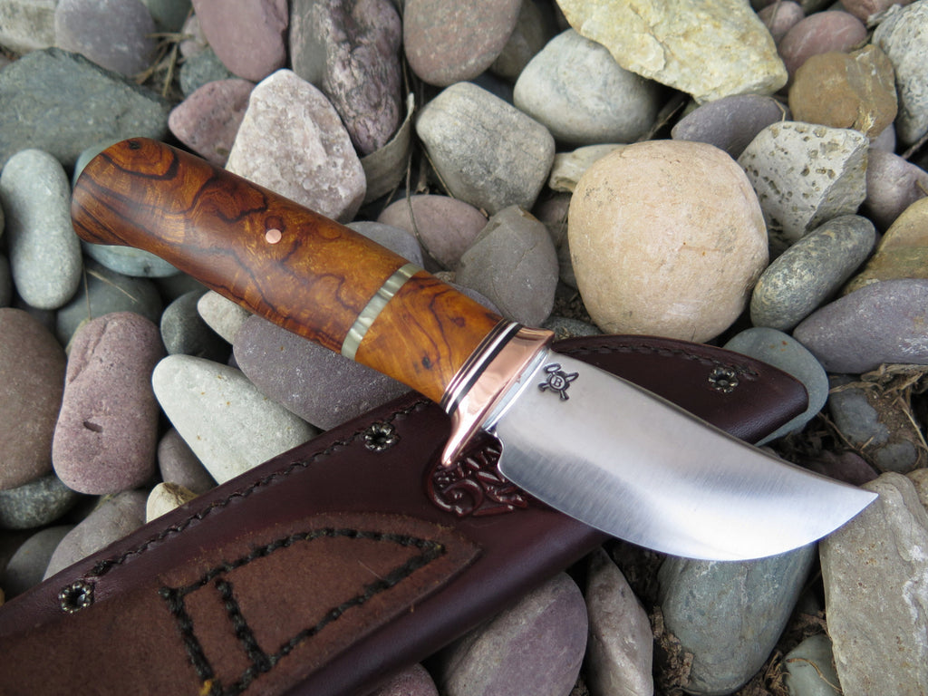 This Behring Made Sharptail is the perfect knife for those who love burl wood handles. The high carbon 01 tool steel blade is hand forged from high carbon 01 tool steel to 3" from tip to guard with a razor sharp convex grind. The copper guard is soldered in place above black, white, copper, desert ironwood burl and musk ox boss spacers as well as a beautiful desert ironwood burl handle. The overall length measures just under 7 1/4" and it comes in a Behring Made pouch.