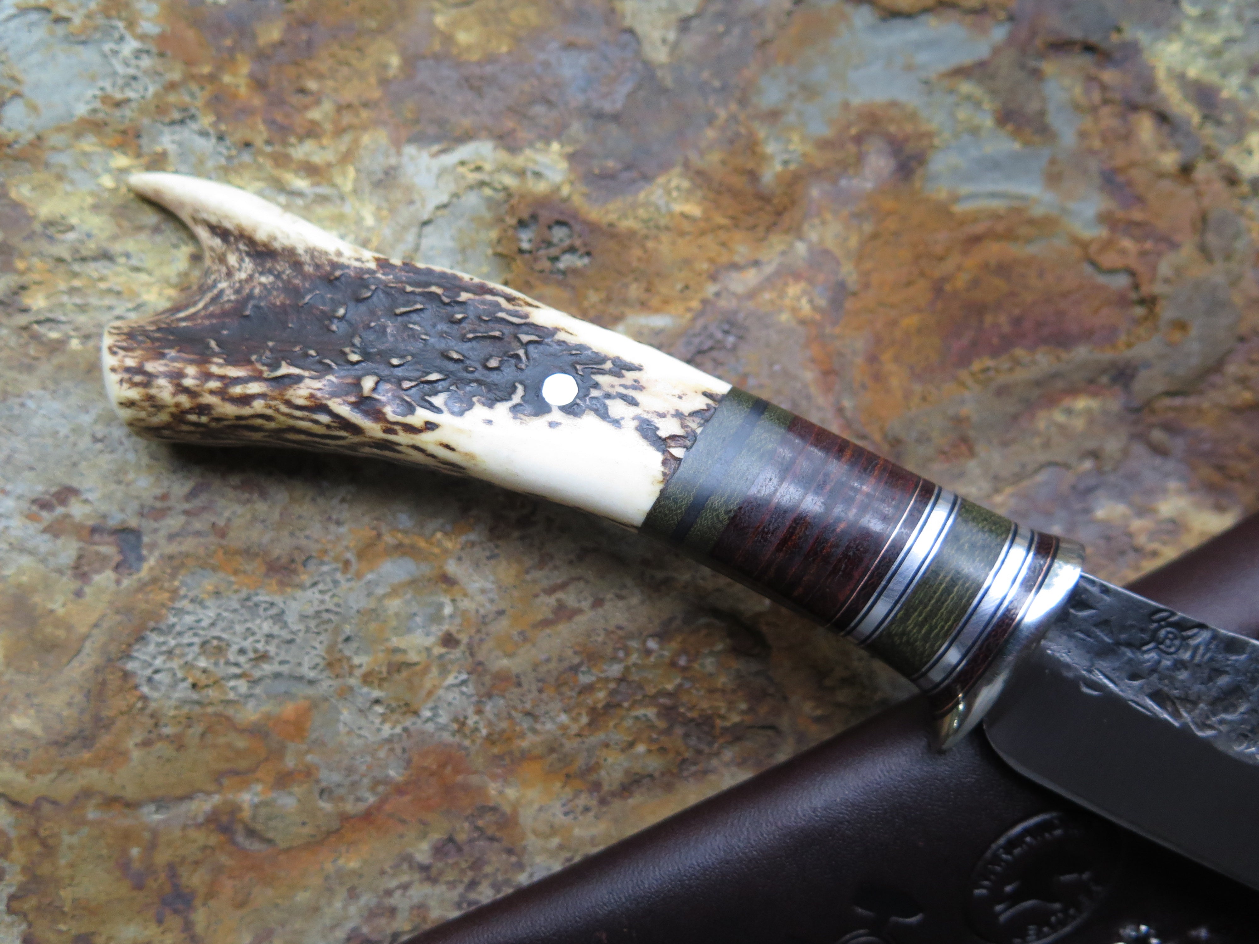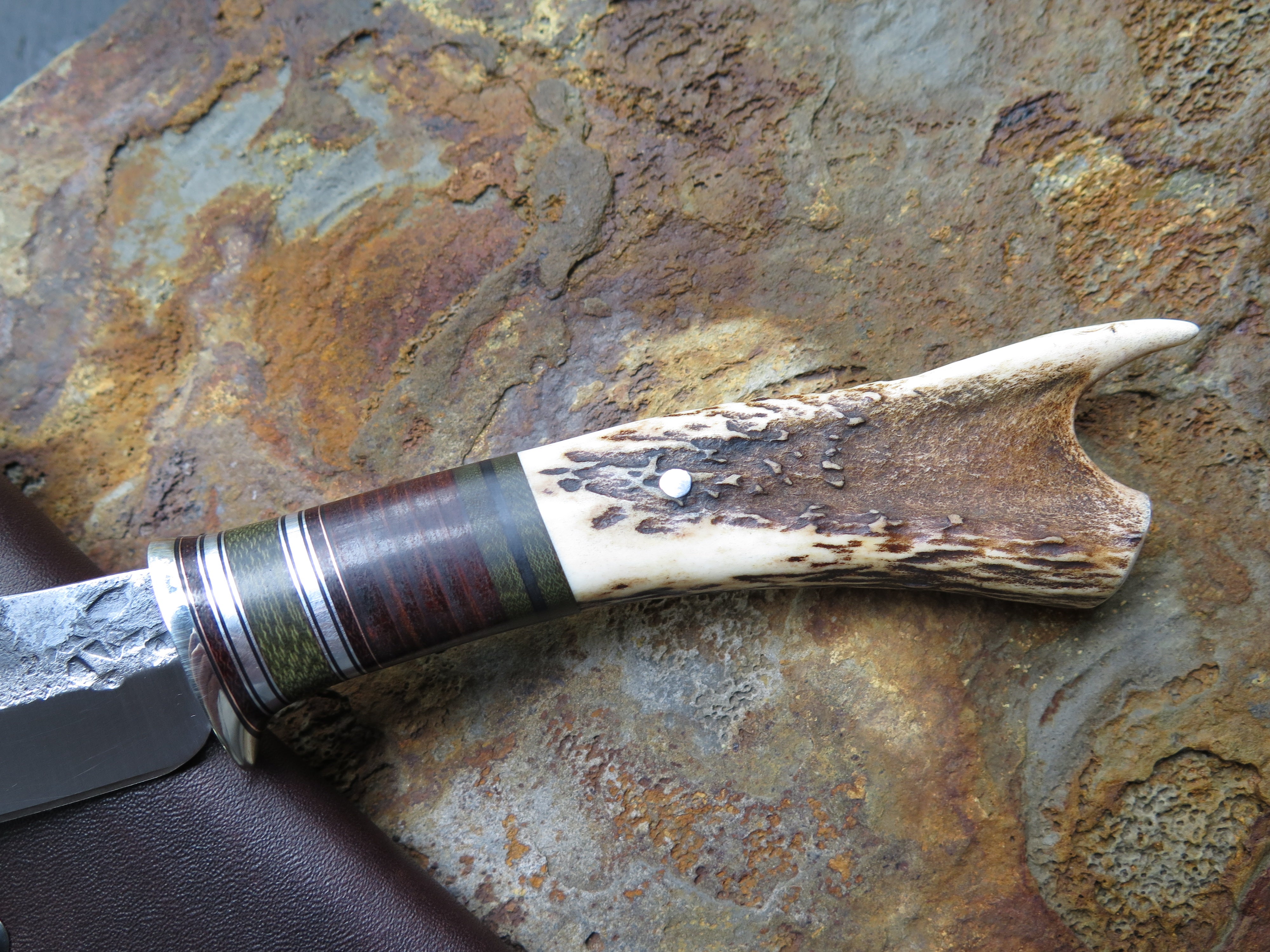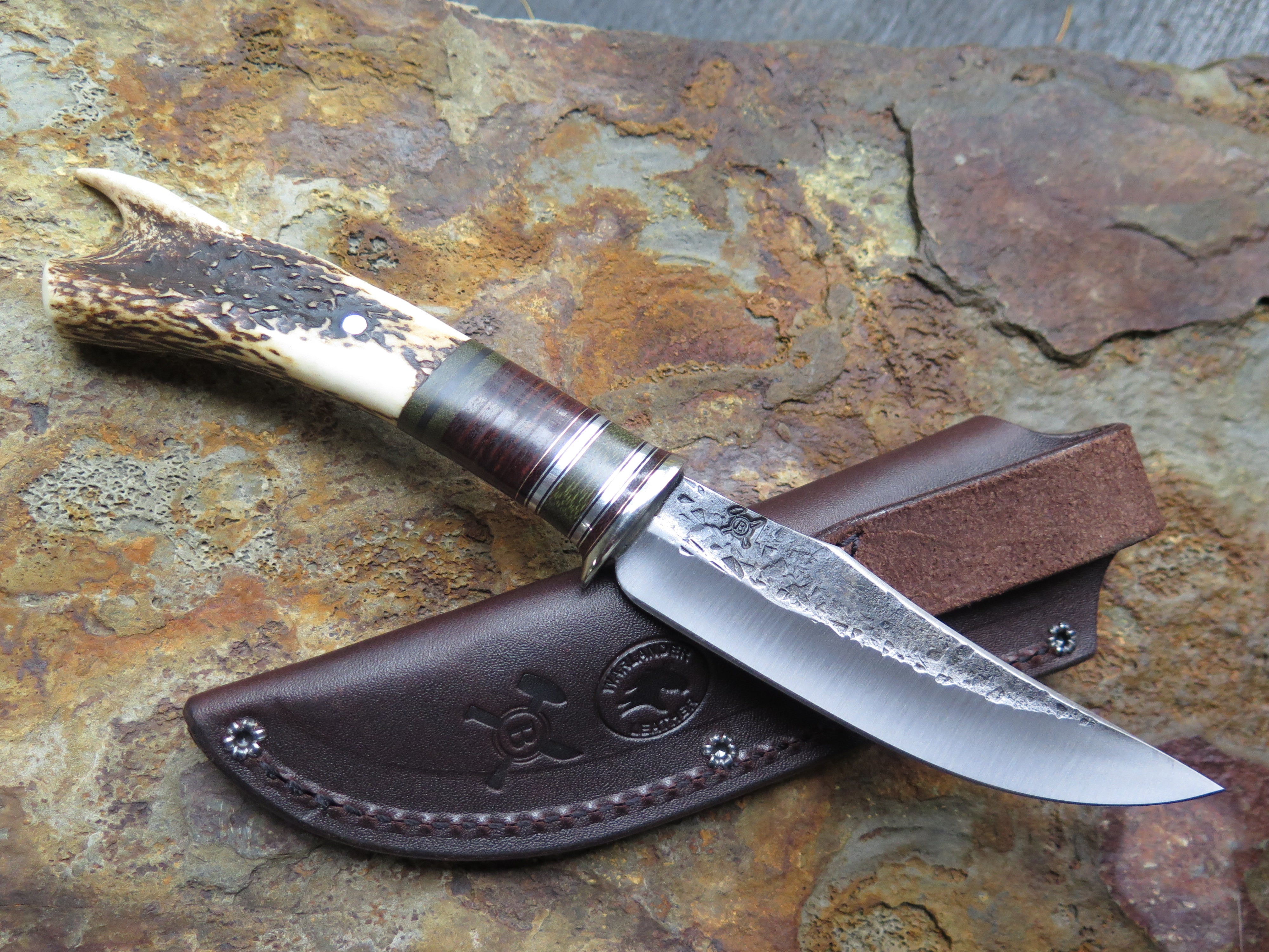 This beautiful new Trout & Bird from Behring Made© is hand forged from 1/8" thick high carbon 01 tool steel and it measures 4 3/4" from tip to guard with a razor sharp hollow grind and our hammermark finish. The nickel silver guard is soldered in place above black, green, brown, aluminum, and horsehide leather spacers. The premium axis deer handle features a crotch end and is pinned through the tang with aluminum. The overall length measures 10" and it comes in a classic leather belt pouch sheath.