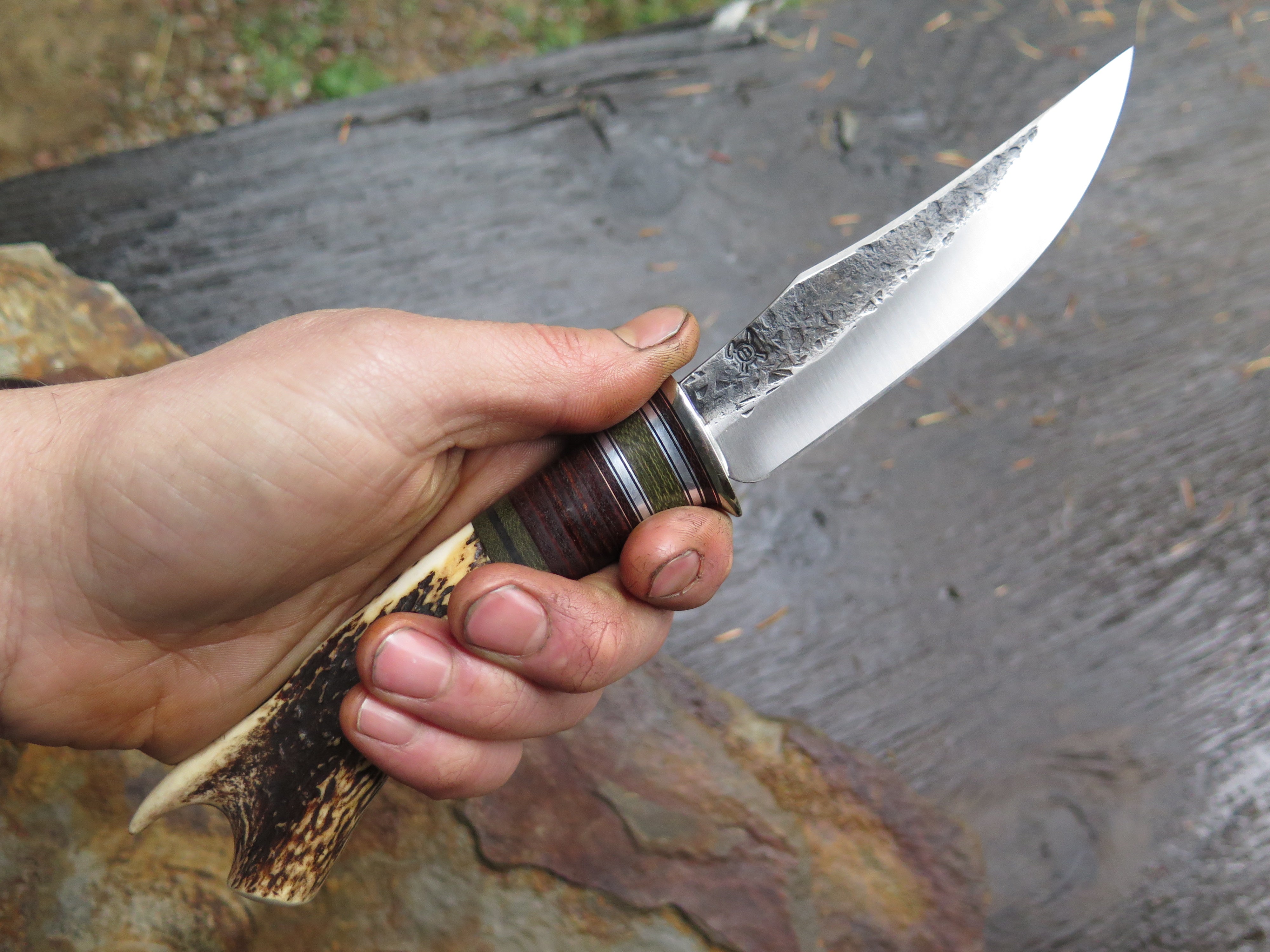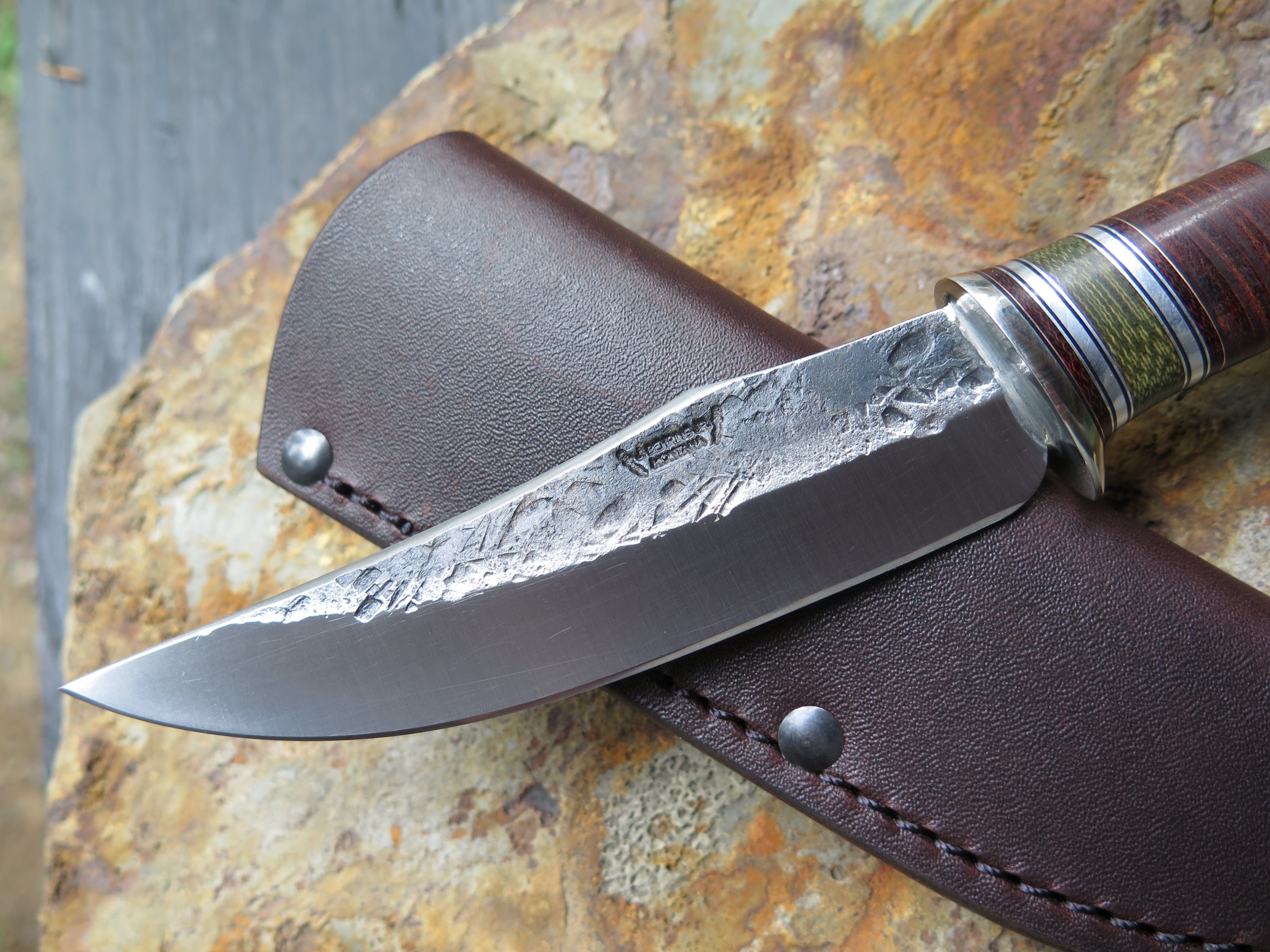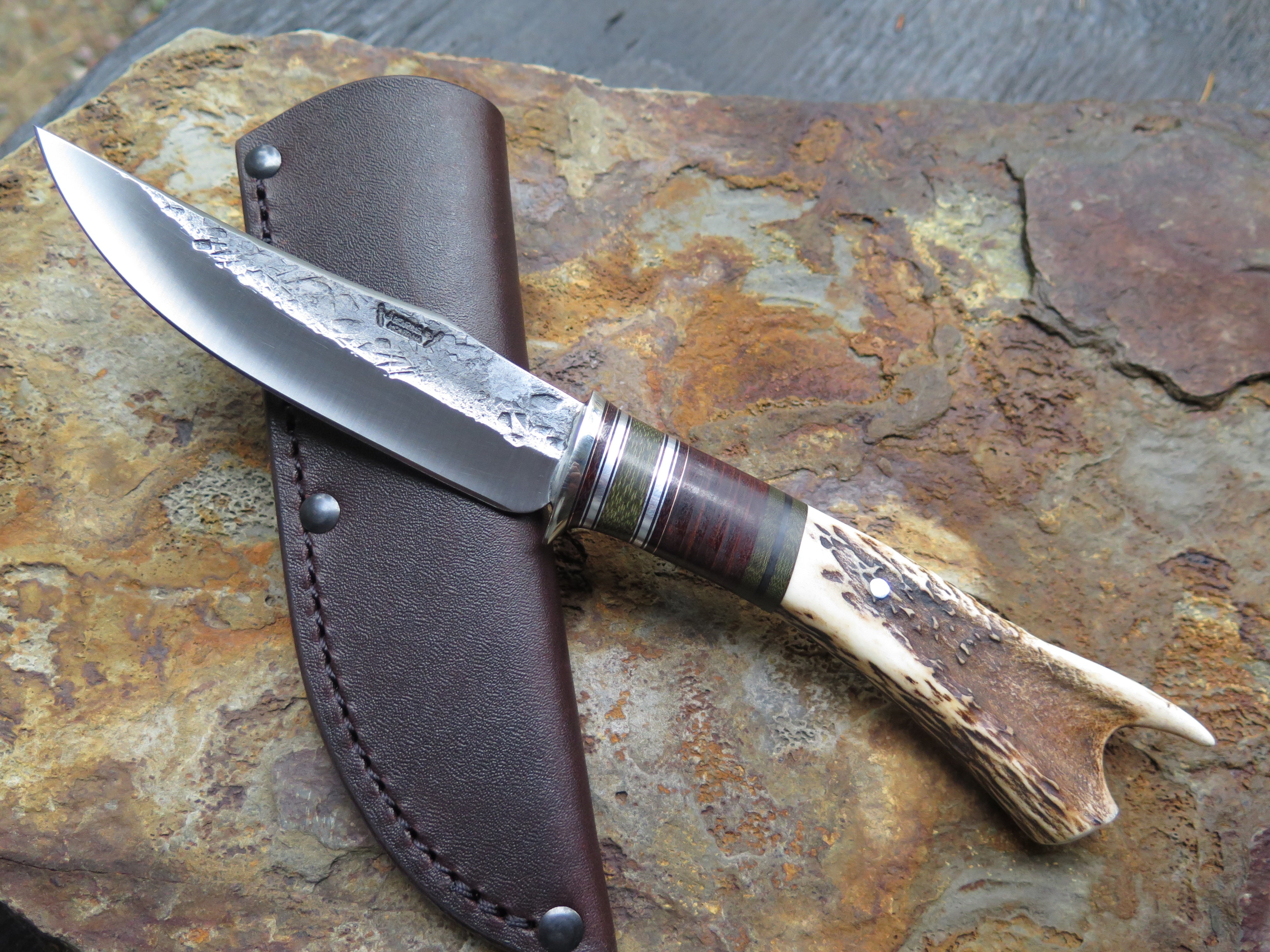 This beautiful new Trout & Bird from Behring Made© is hand forged from 1/8" thick high carbon 01 tool steel and it measures 4 3/4" from tip to guard with a razor sharp hollow grind and our hammermark finish. The nickel silver guard is soldered in place above black, green, brown, aluminum, and horsehide leather spacers. The premium axis deer handle features a crotch end and is pinned through the tang with aluminum. The overall length measures 10" and it comes in a classic leather belt pouch sheath.