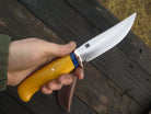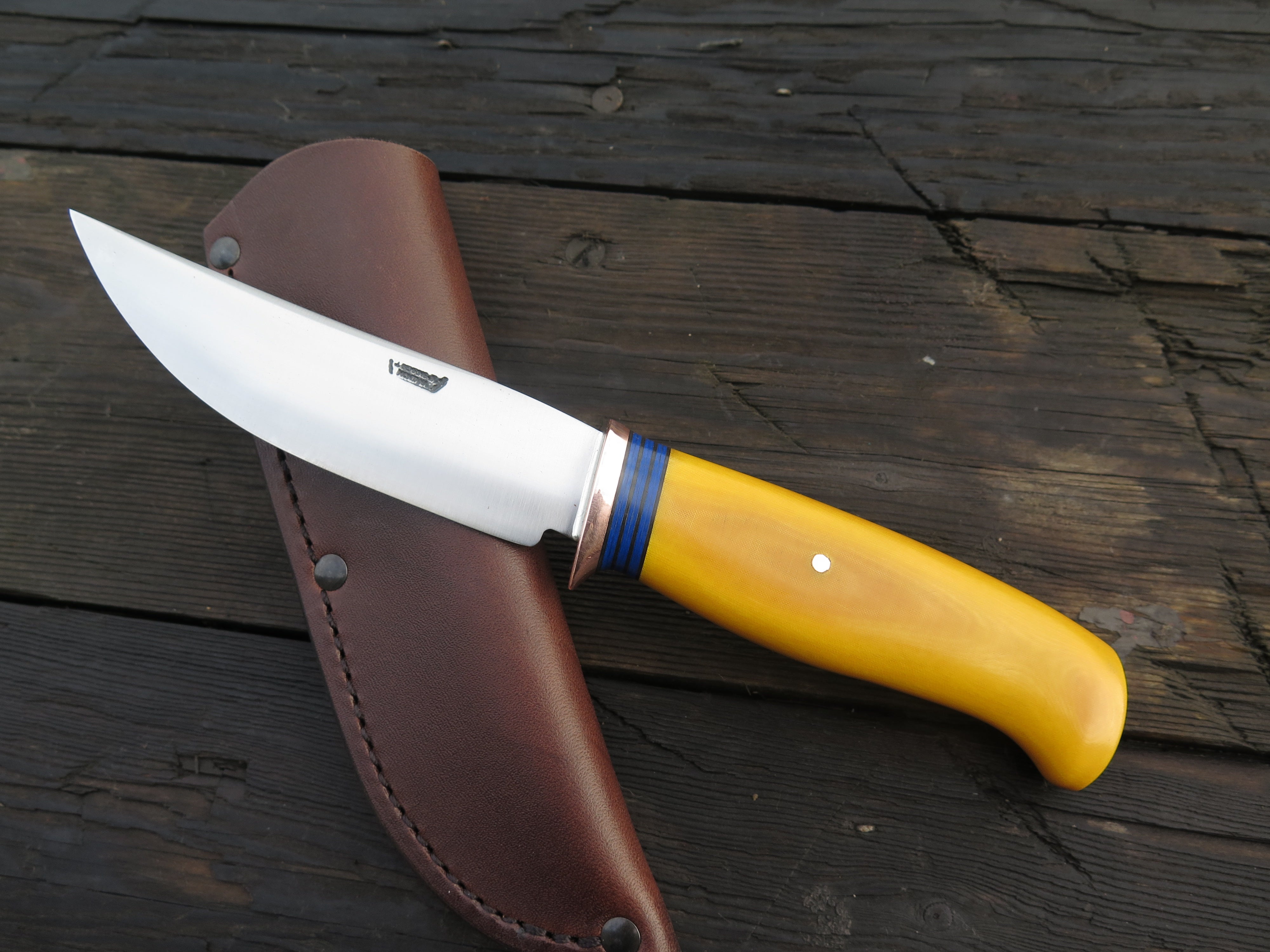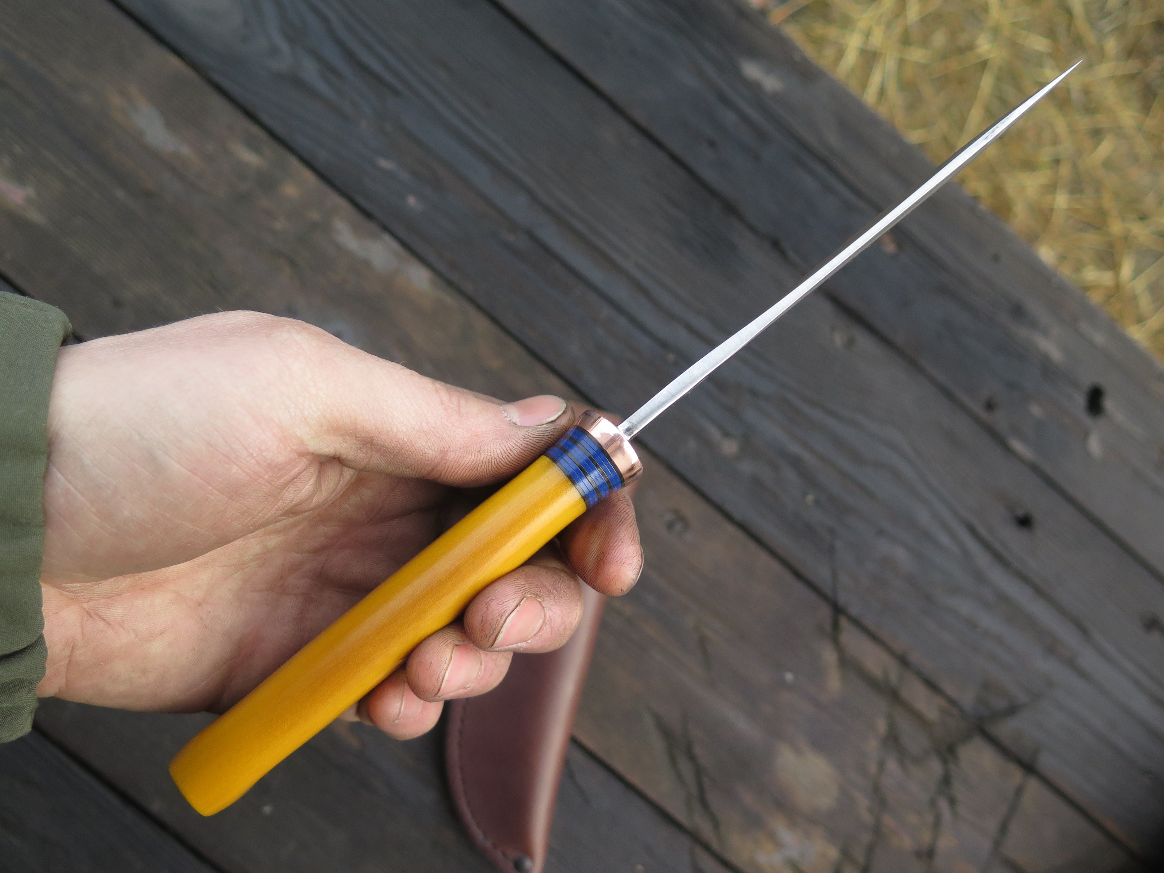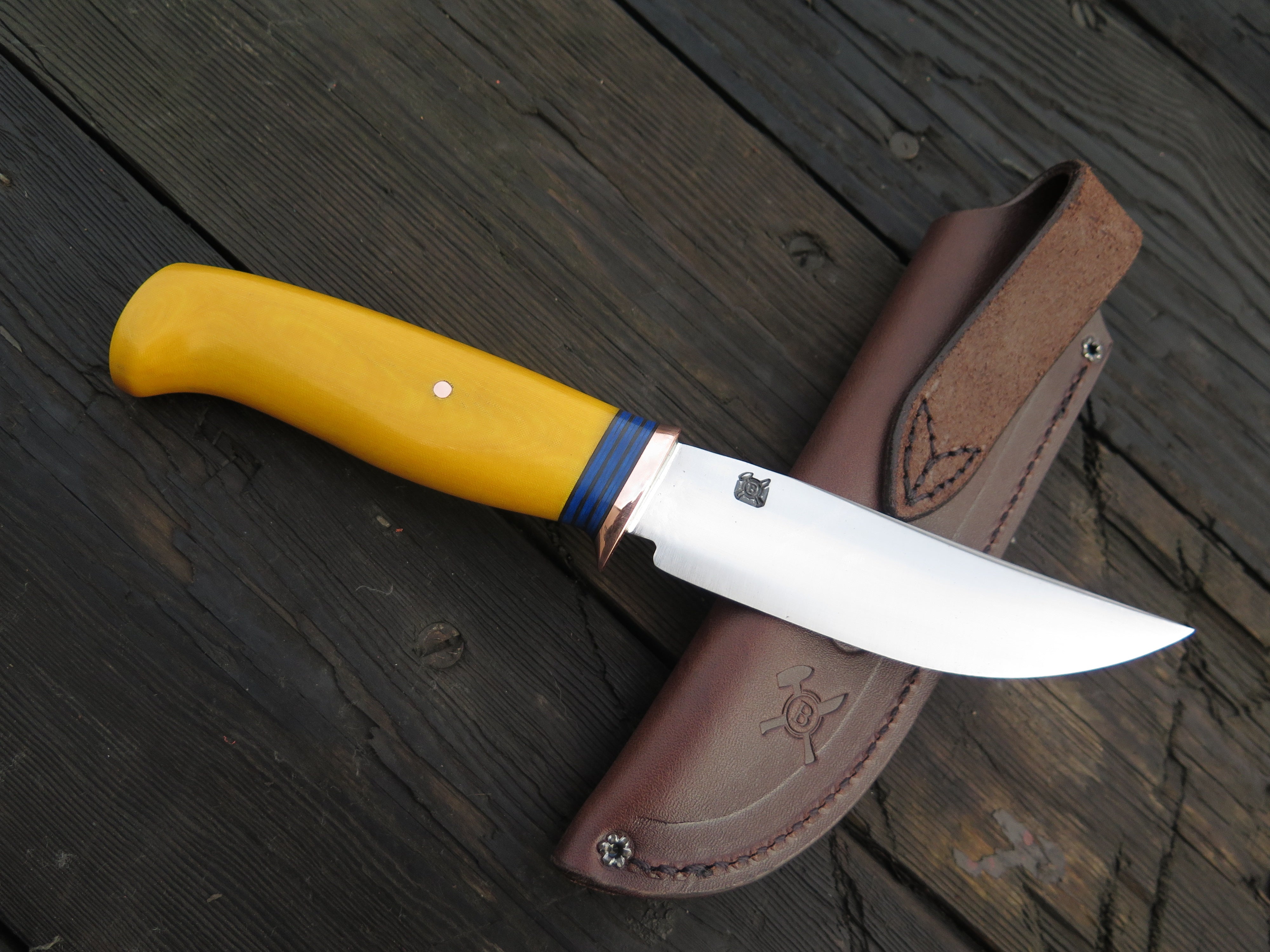 This beautiful Behring Made© Trout & Bird is hand forged from 3/16" thick high carbon 01 tool steel and it measures 5" from tip to guard with a razor sharp convex grind. The copper guard is soldered in place above black and blue fibre spacers as well as a classic yellow westinghouse micarta handle that's also pinned with copper. The overall length measures 9 5/8" and it also comes in a Warlander Leather pouch sheath.