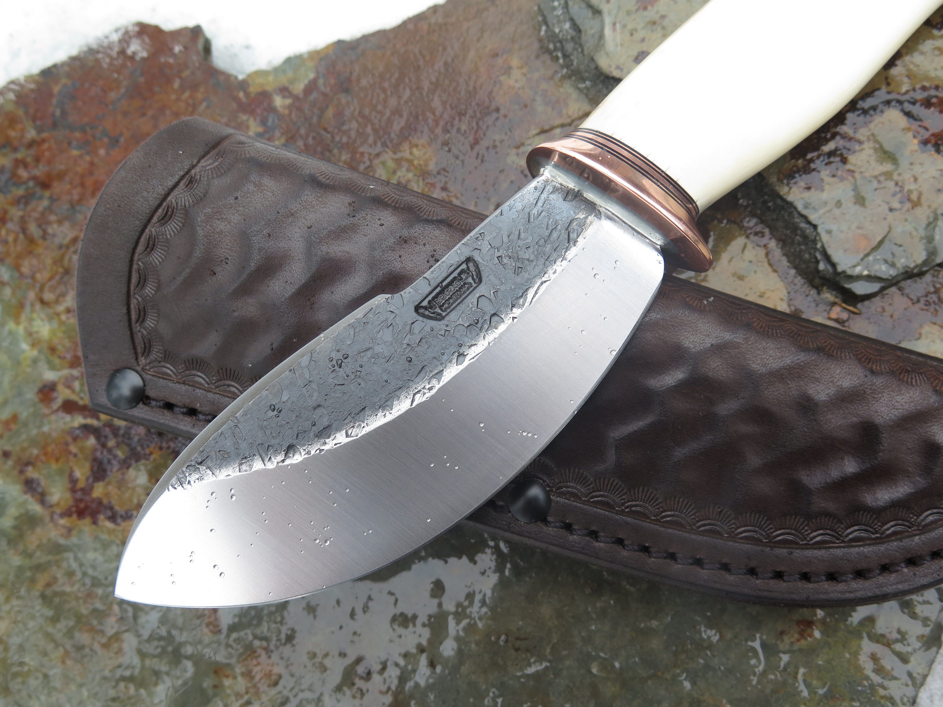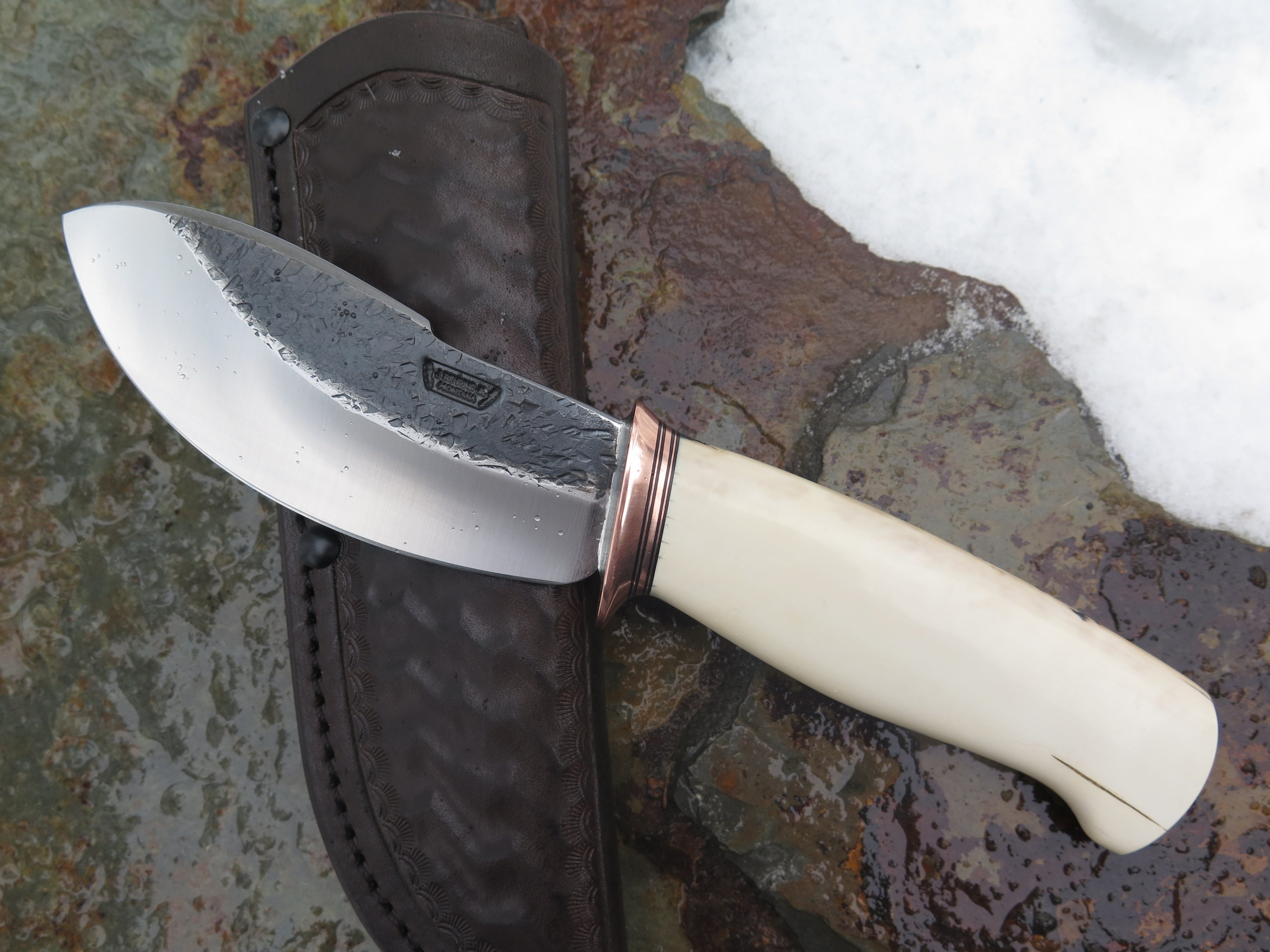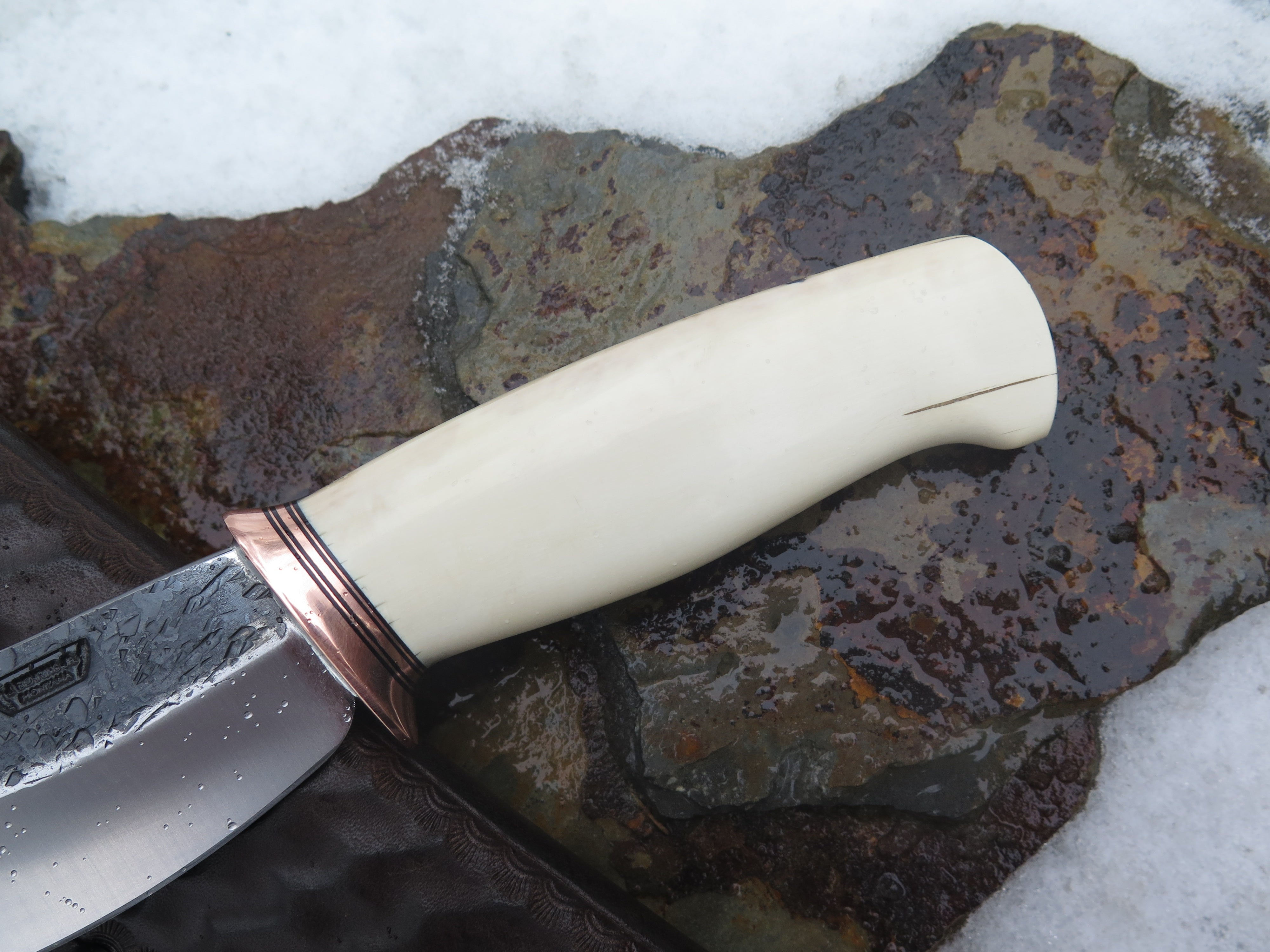 This outstanding new Canoe knife from Behring Made© is hand forged from 3/16" thick high carbon 01 tool steel and it measures 4 1/2" from tip to guard with a razor hollow convex grind and our hammermark finish. The copper guard is soldered in place above black fiber and copper spacers with a remarkable mammoth ivory handle to boot. The overall length measures 8 5/8" and it comes in a premium tooled belt pouch sheath.
