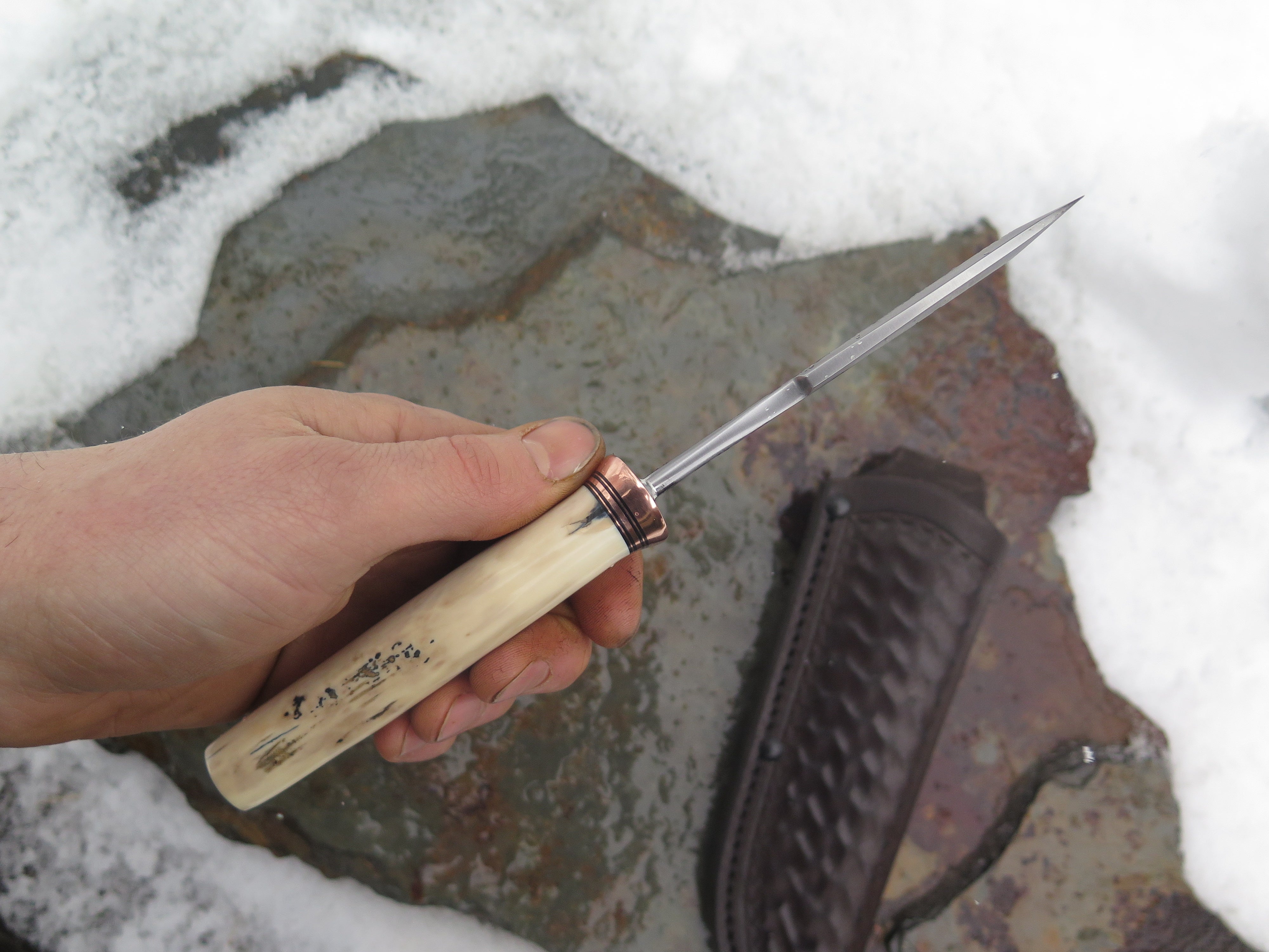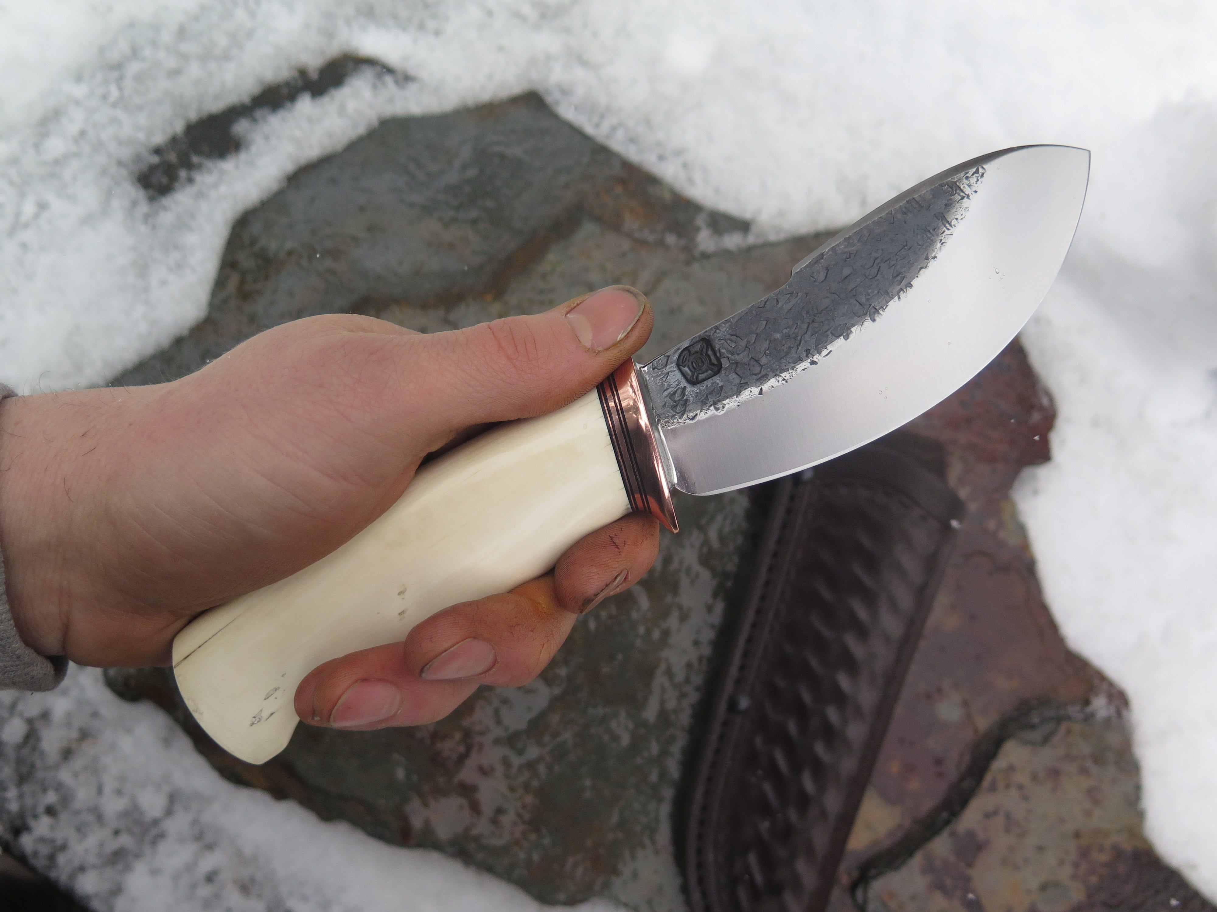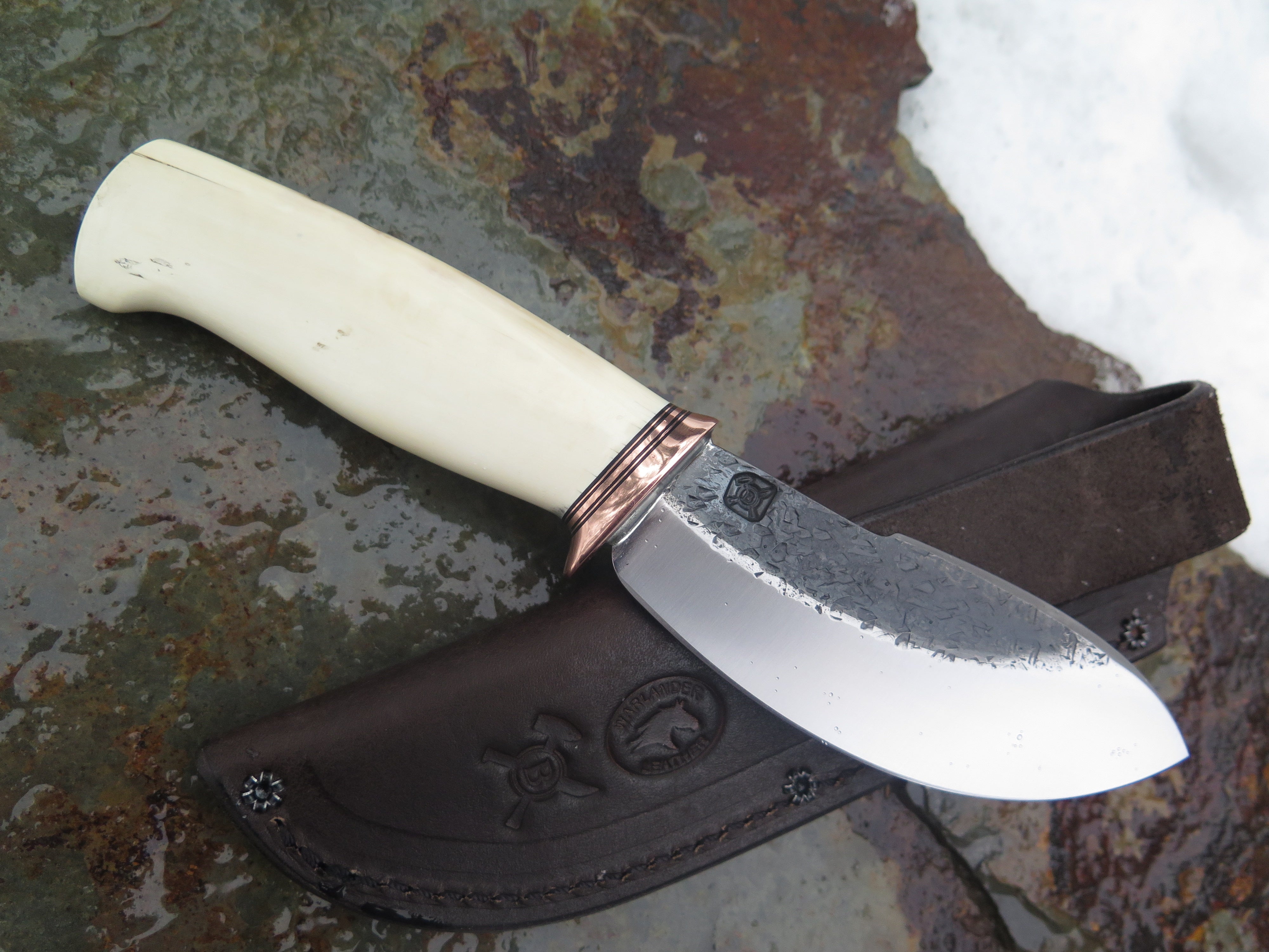 This outstanding new Canoe knife from Behring Made© is hand forged from 3/16" thick high carbon 01 tool steel and it measures 4 1/2" from tip to guard with a razor hollow convex grind and our hammermark finish. The copper guard is soldered in place above black fiber and copper spacers with a remarkable mammoth ivory handle to boot. The overall length measures 8 5/8" and it comes in a premium tooled belt pouch sheath.