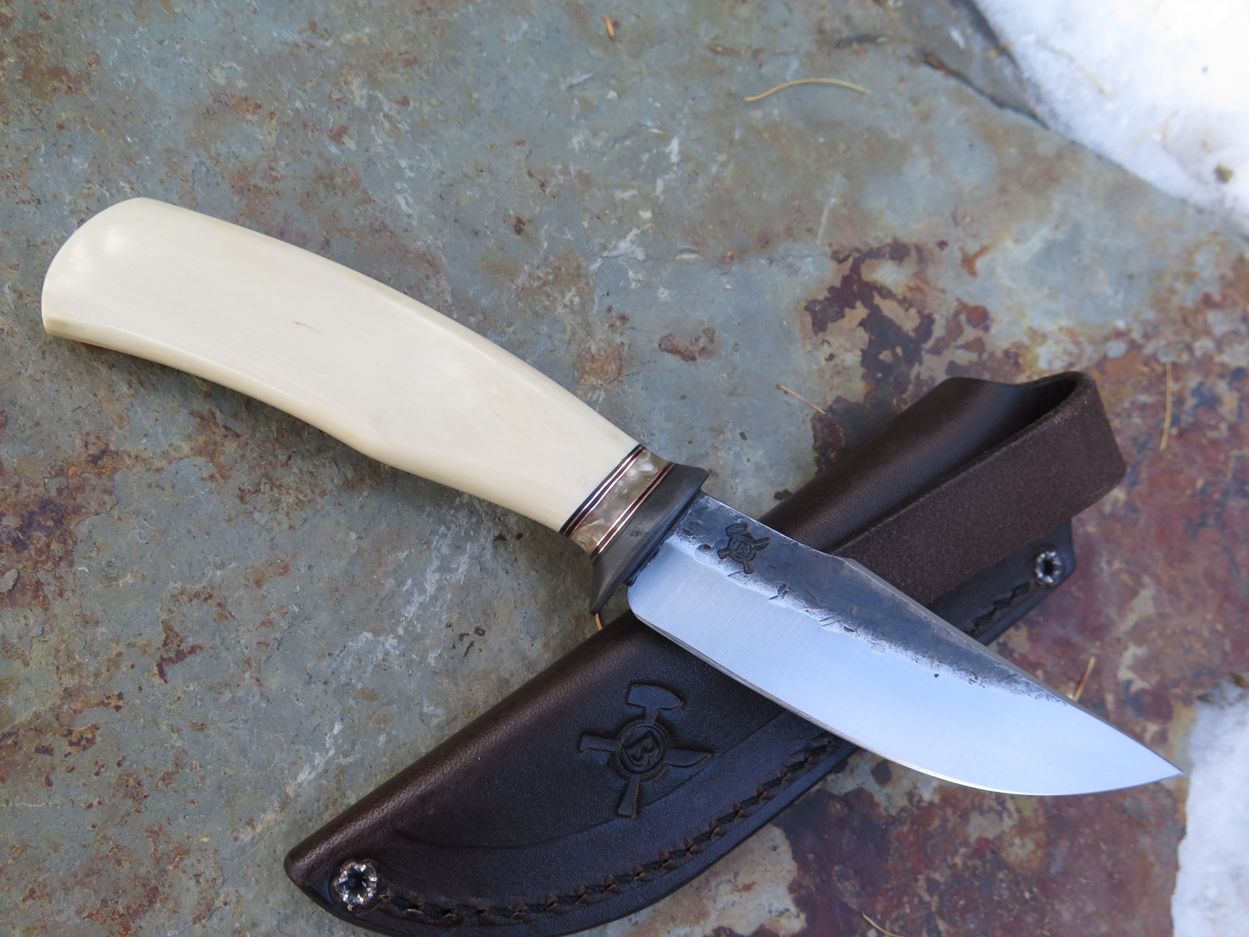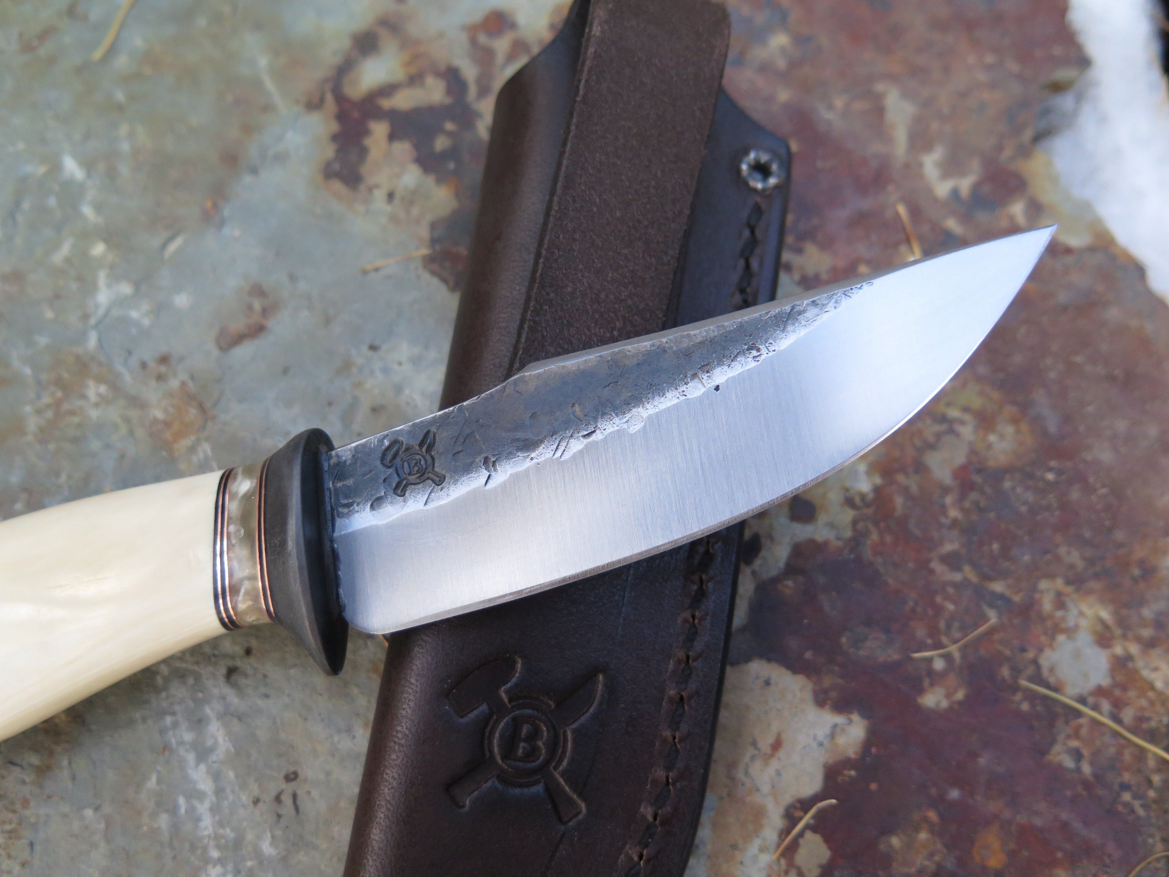 This beautiful new Clip Point from Behring Made© is hand forged from 1/8" thick high carbon 01 tool steel and measures 3 3/4" from tip to guard with a razor sharp hollow grind and our hammermark finish. The blued steel guard is soldered in place above black fiber, copper and musk ox boss spacers as well as an ancient mammoth ivory handle. The overall length measures 7 5/8" and it comes in the shown premium leather belt pouch sheath, though substitutions are available upon request.