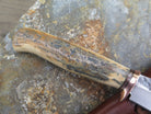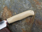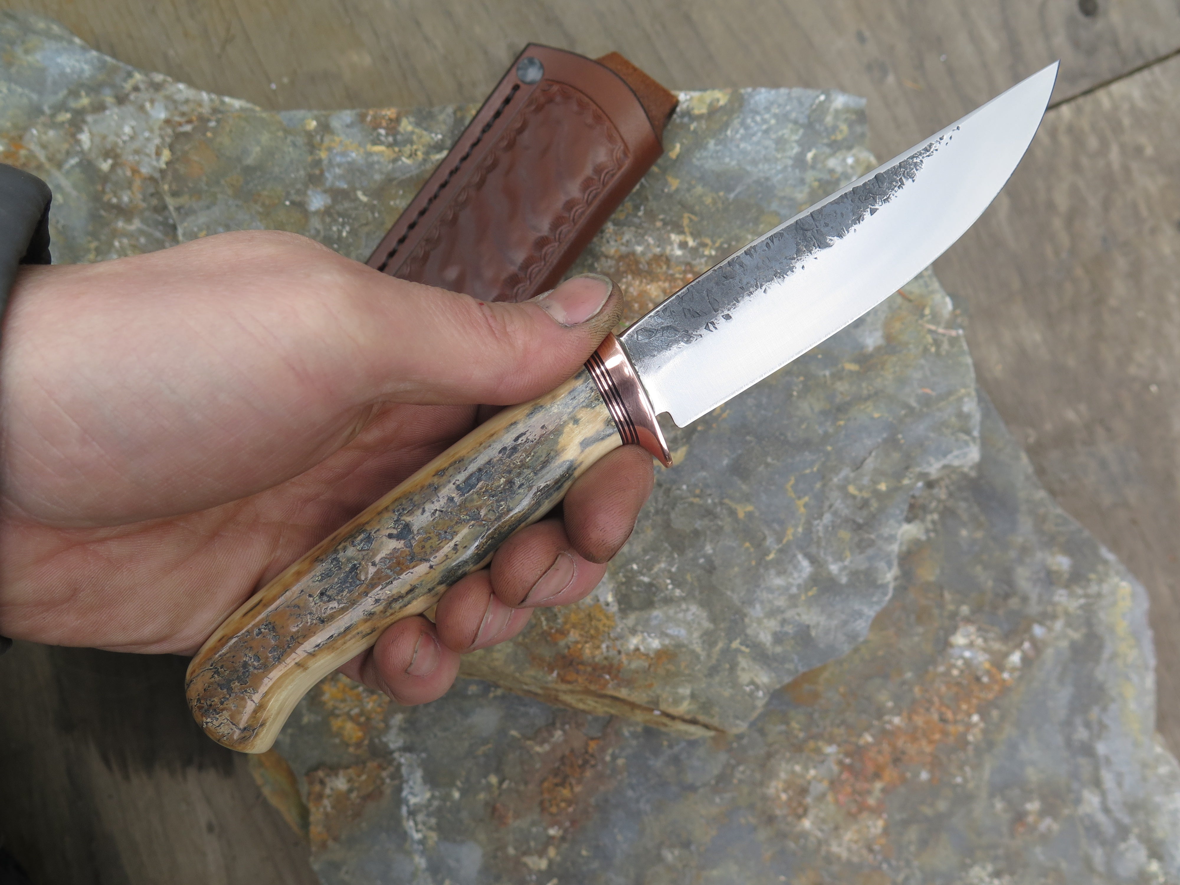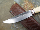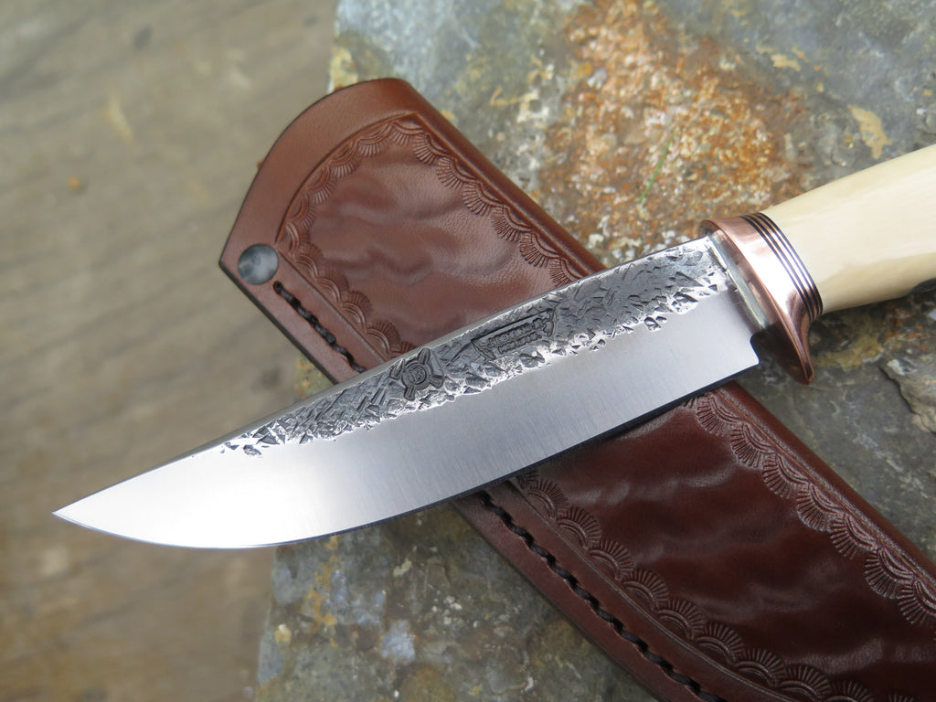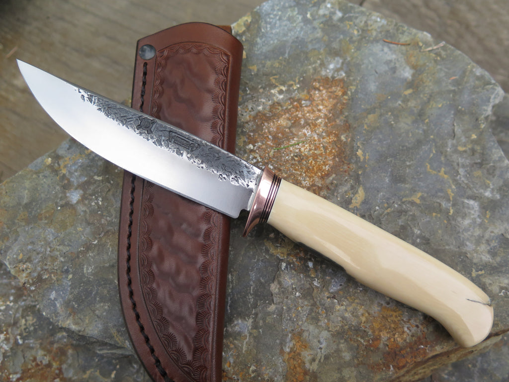This beautiful Trout & Bird from Behring Made© is hand forged from 1/8" thick high carbon 01 tool steel and it measures 4 1/2" from tip to guard with a razor sharp hollow grind and our hammermark finish. The copper guard is soldered in place above black fiber and copper spacers as well as a premium mammoth ivory handle with a contrast ranging from light creams to deep blues- you will be astounded! Overall length measures 8 7/8" and it comes with a premium tooled pouch sheath.