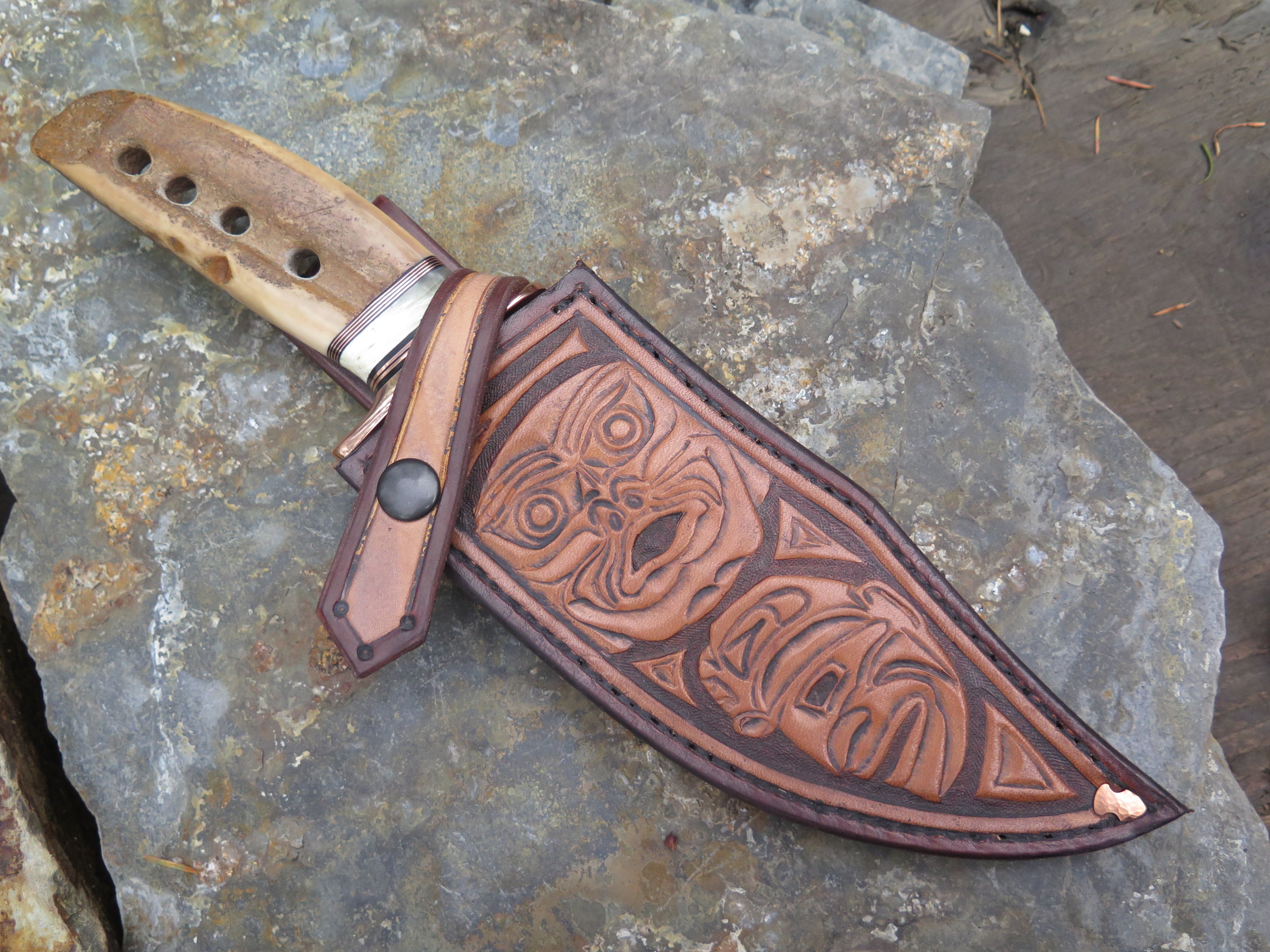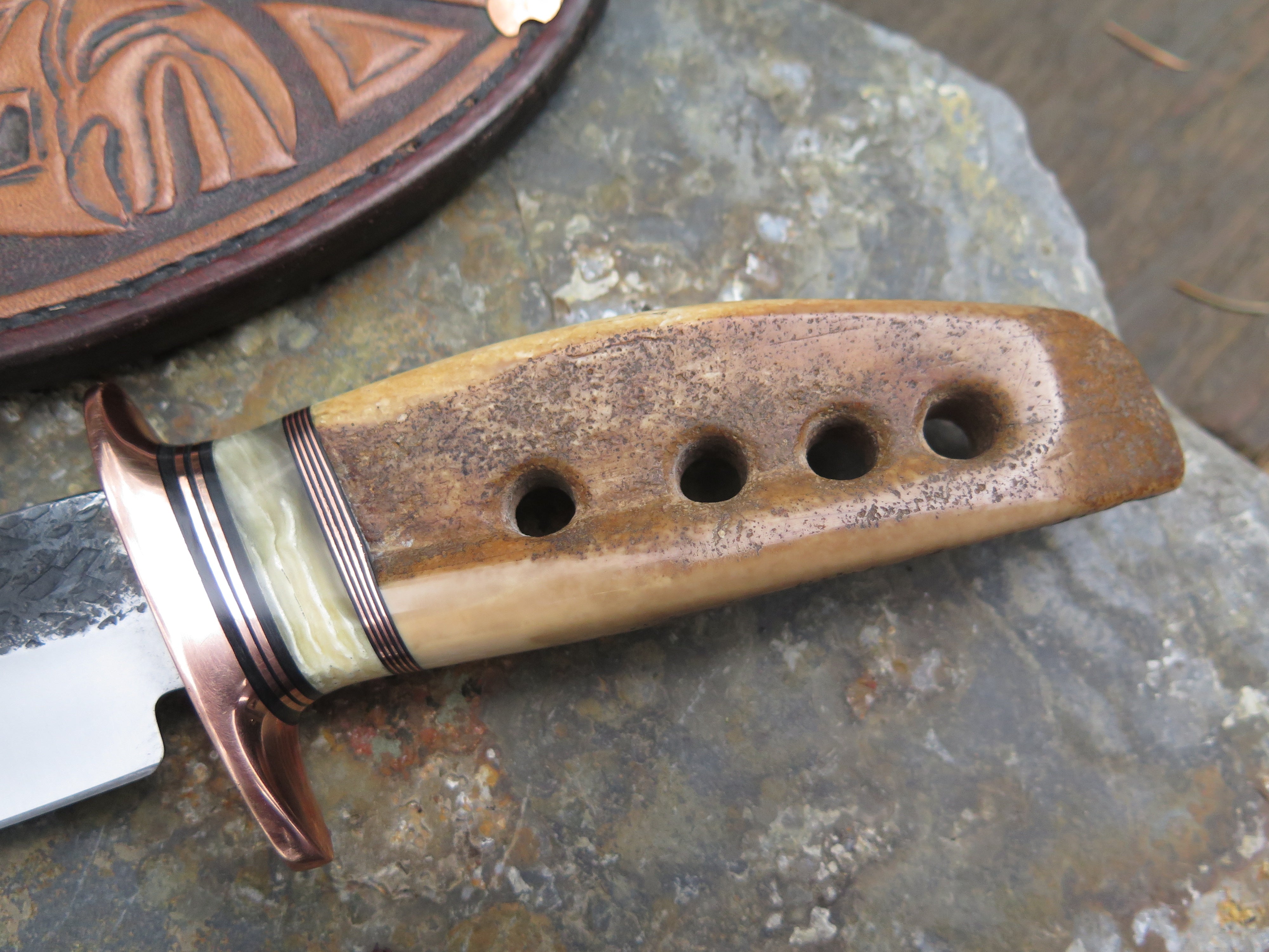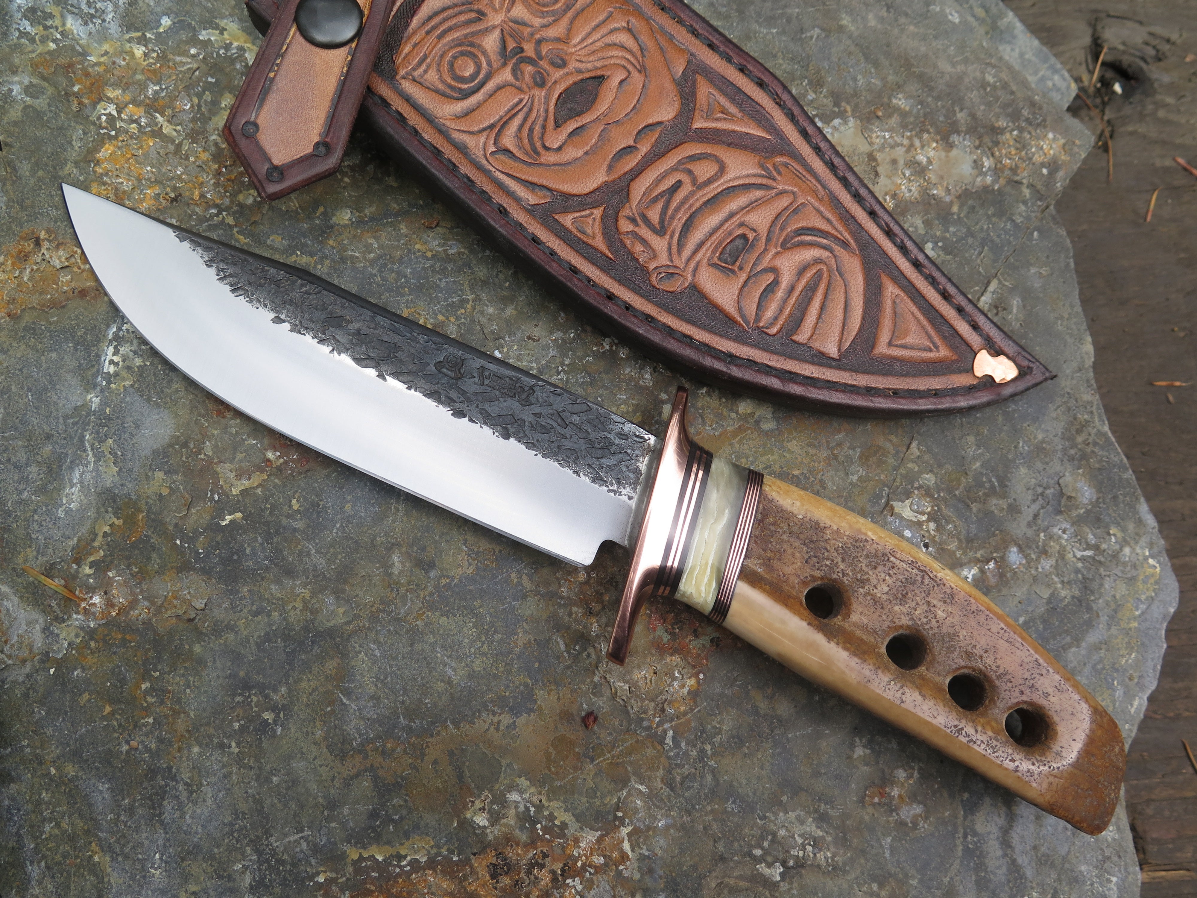 This new Behring Made© Fighter is loaded to the max with options!! To start the blade is hand forged from a Studebaker leaf spring from 1949-51 and it measures 6 1/2" from tip to guard with a razor sharp hollow grind, our hammermark finish and the Studebaker logo stamped into the blade. The copper guard is soldered in place above black fiber, copper and musk ox boss spacers as well as a mind boggling artifact walrus ivory handle that was an Inuit sled runner hundreds if not thousands of years ago. The overall length measures 11 1/2" and it comes in a totem themed sheath from Mudbone Jones. You can't top this!