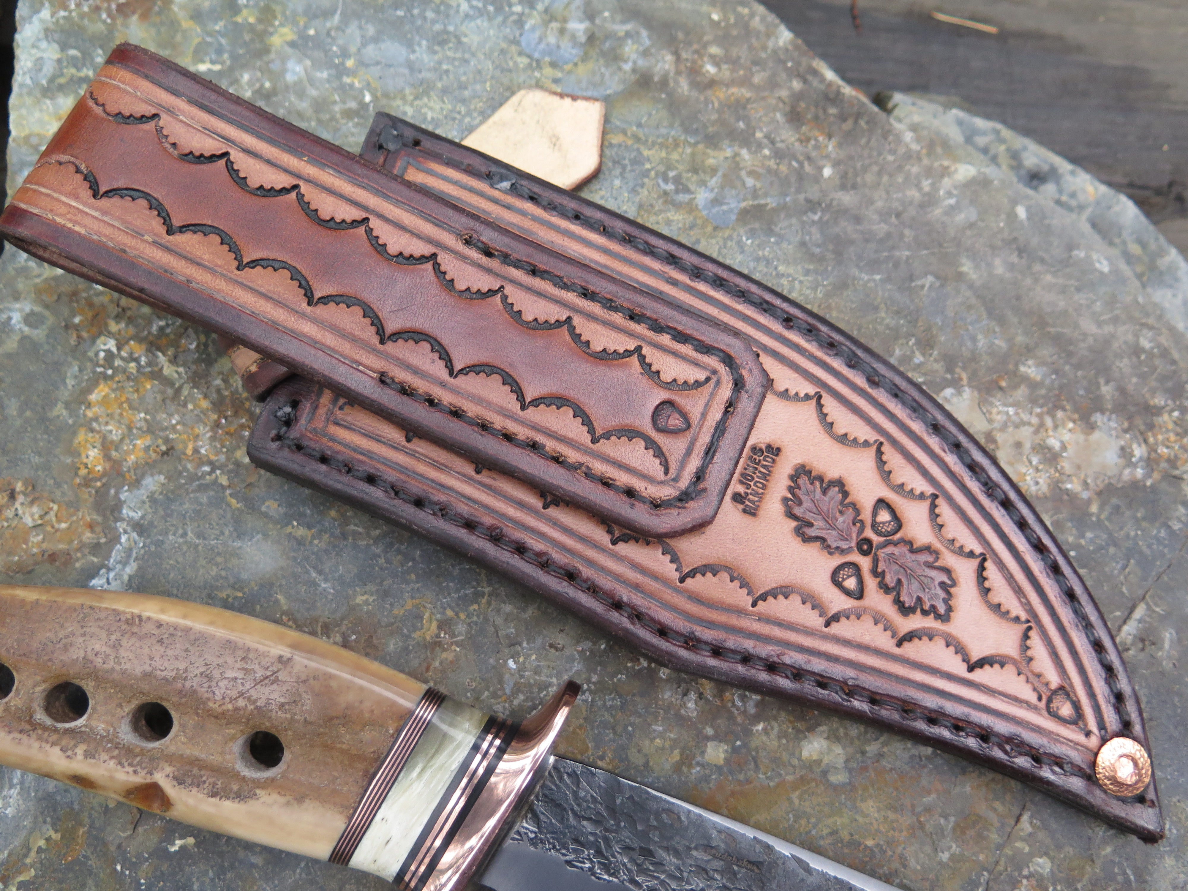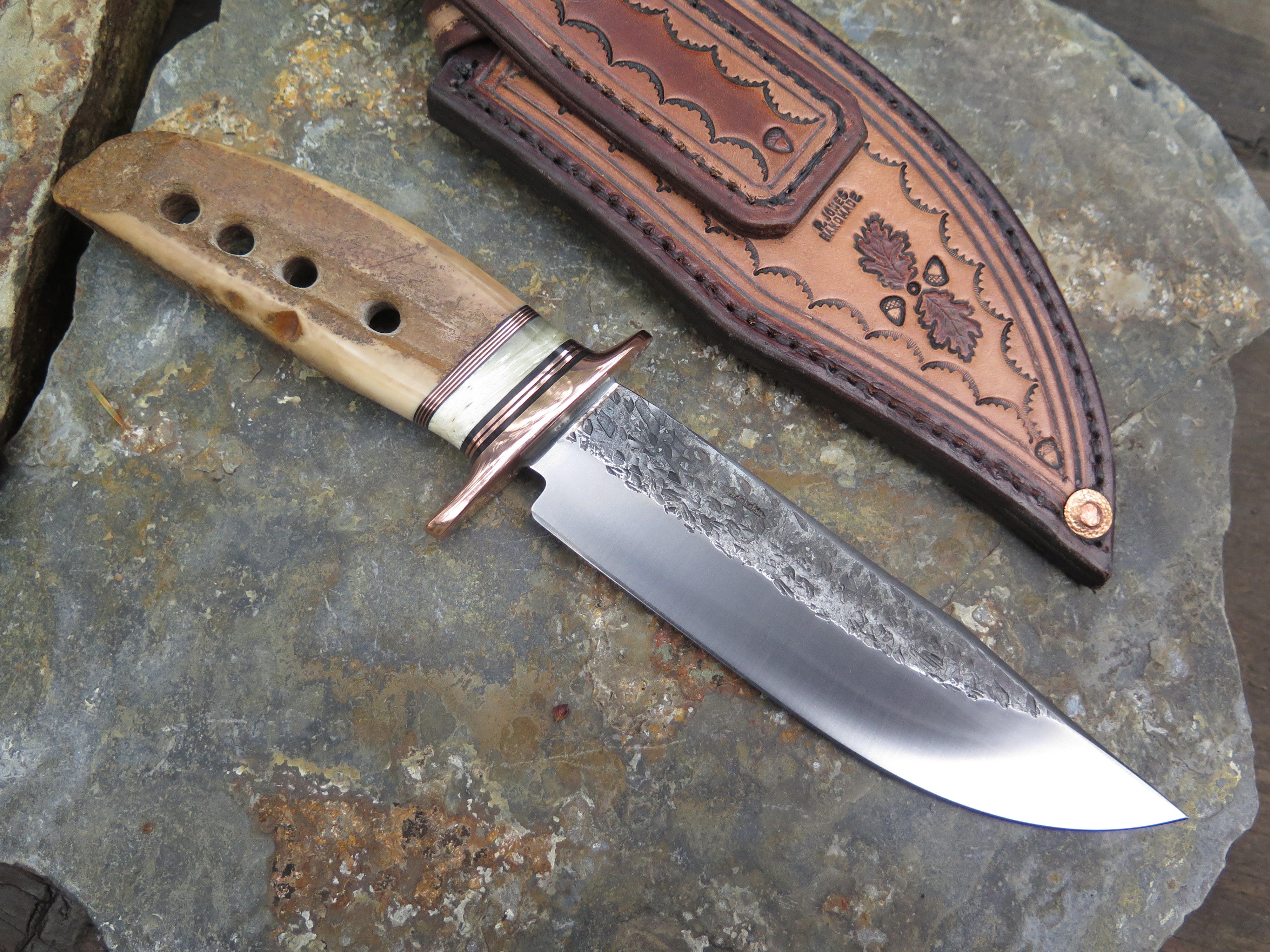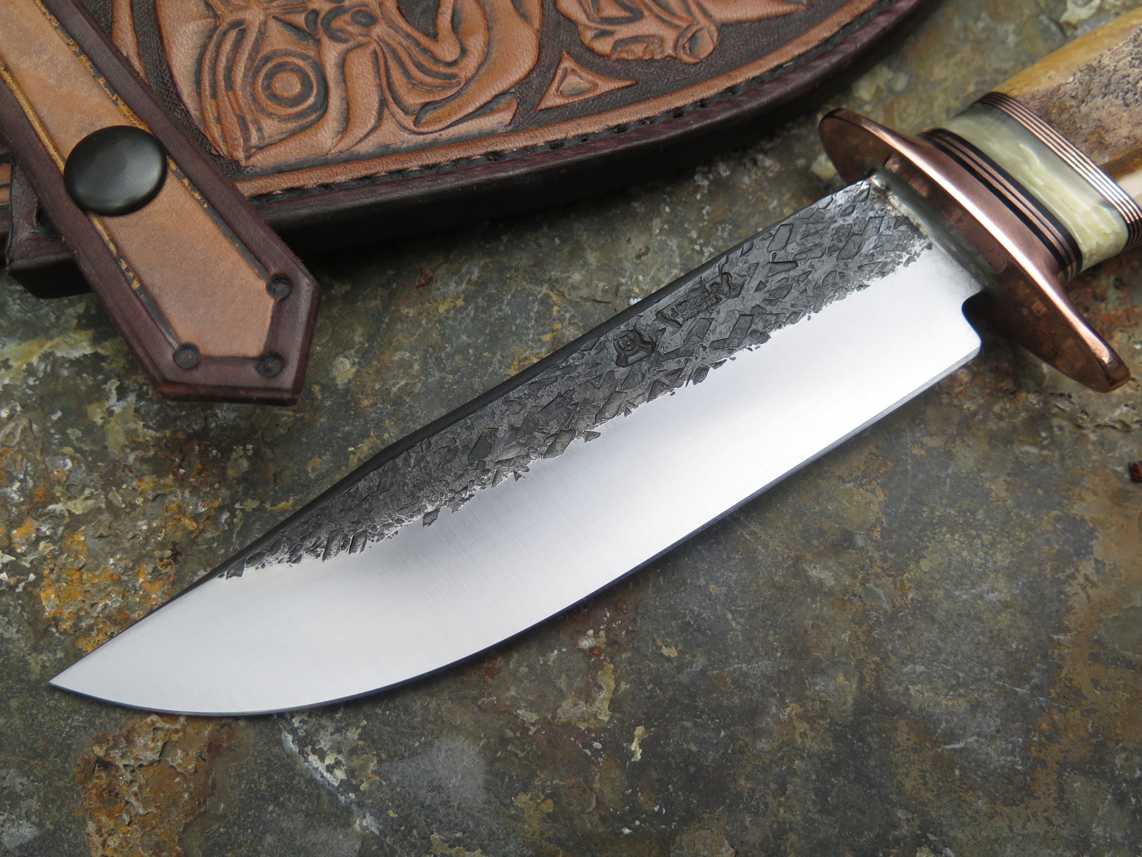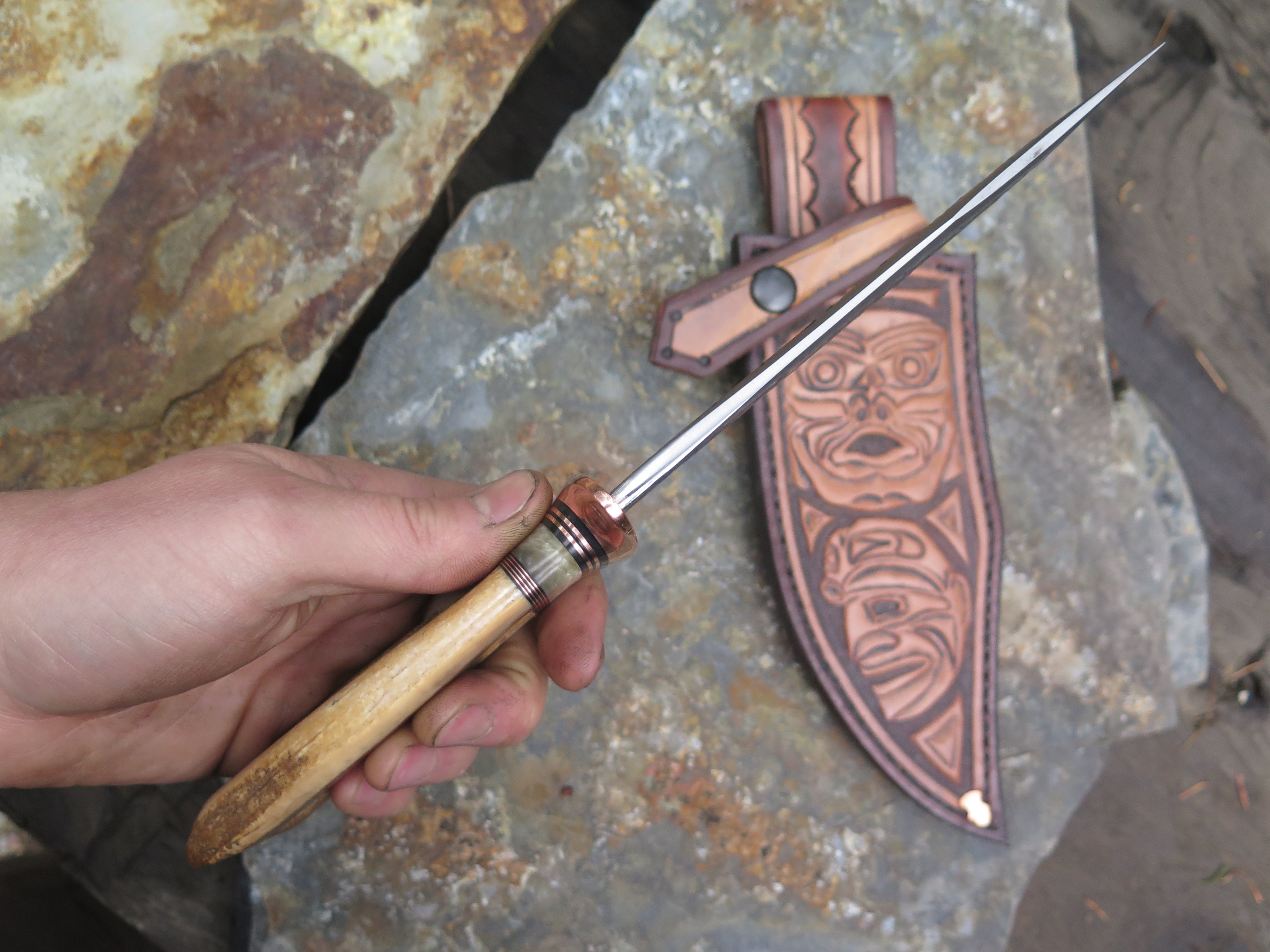 This new Behring Made© Fighter is loaded to the max with options!! To start the blade is hand forged from a Studebaker leaf spring from 1949-51 and it measures 6 1/2" from tip to guard with a razor sharp hollow grind, our hammermark finish and the Studebaker logo stamped into the blade. The copper guard is soldered in place above black fiber, copper and musk ox boss spacers as well as a mind boggling artifact walrus ivory handle that was an Inuit sled runner hundreds if not thousands of years ago. The overall length measures 11 1/2" and it comes in a totem themed sheath from Mudbone Jones. You can't top this!
