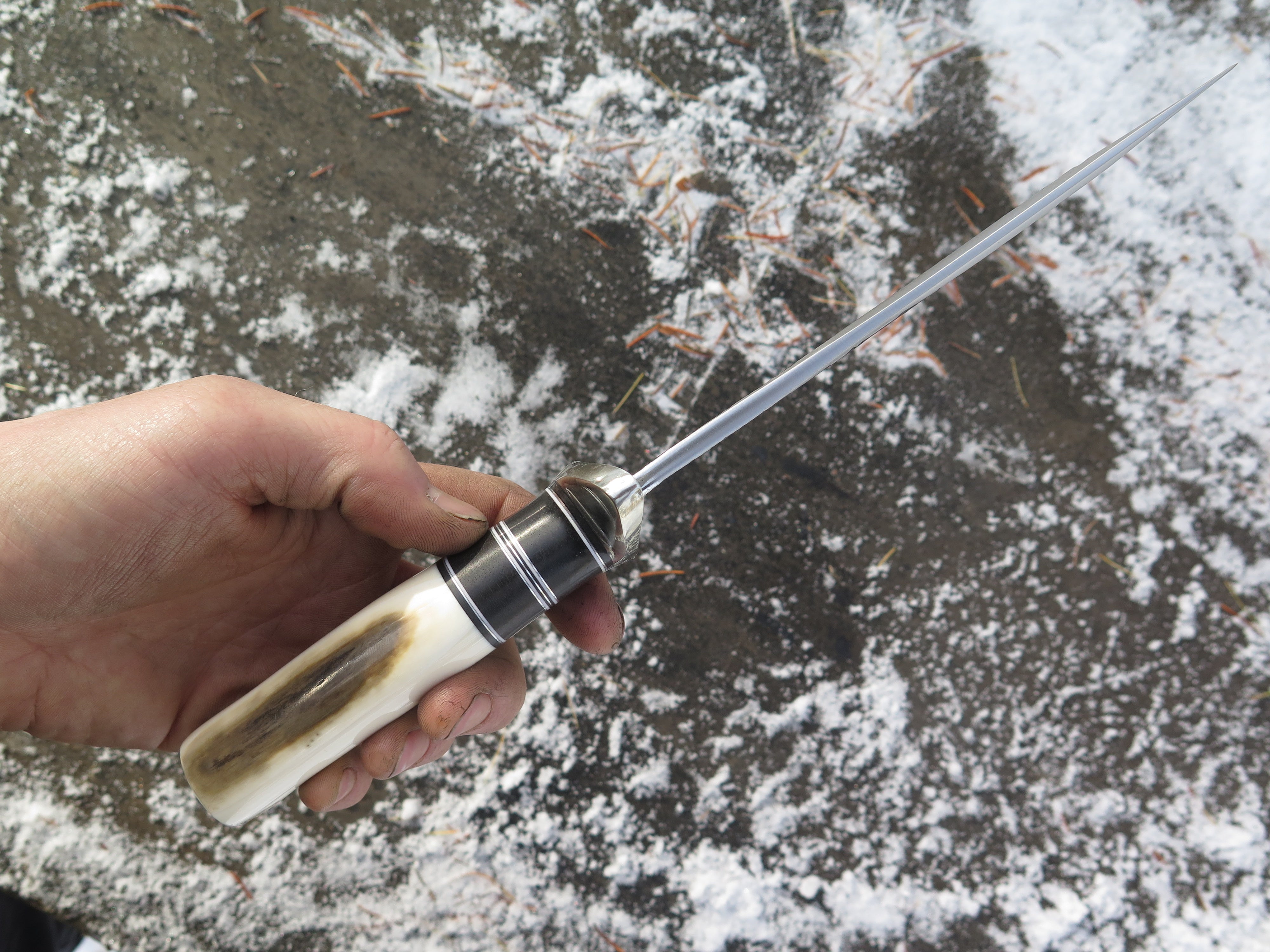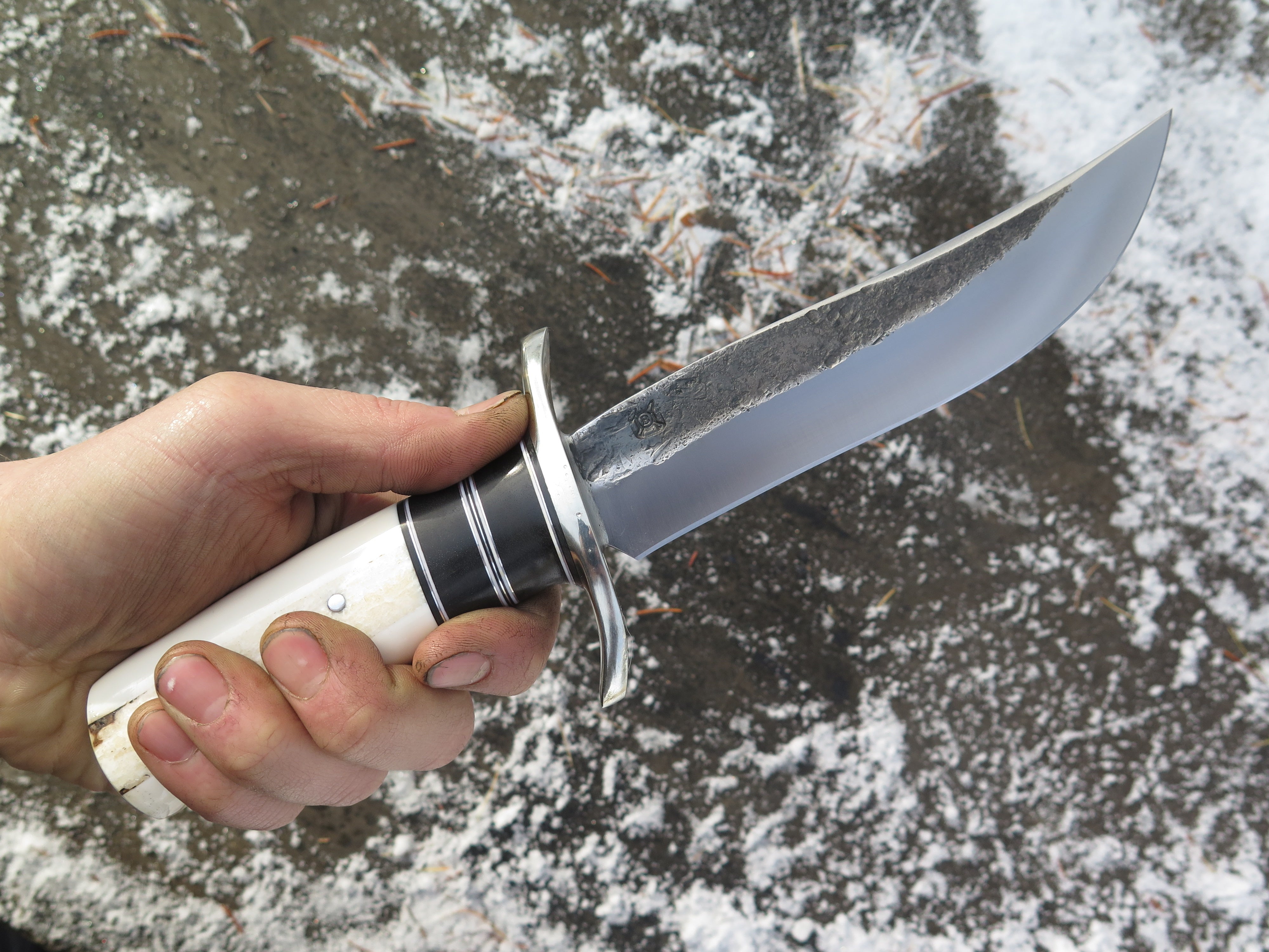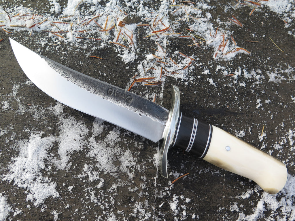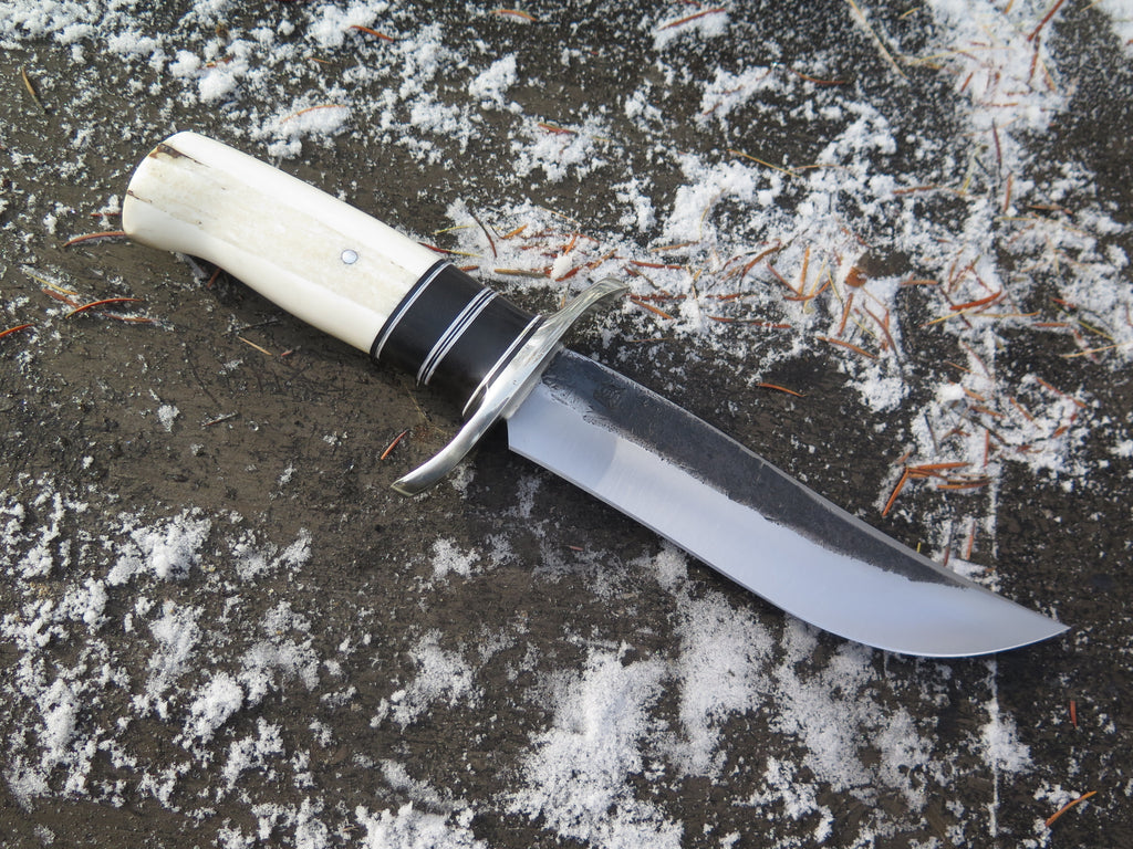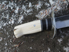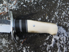 This outstanding new one from Behring Made© is a true crown jewel- one you don't see often and one you will likely not again for some time. It's a Kris Fighter, and truly an icon that will stand out far from the rest of your collecting. We hand forged it from 13/64" thick 5160 spring steel and it measures 6 3/4" from tip to guard with a razor sharp recurve hollow grind and our hammermark finish. The forged nickel silver s-guard is soldered in place above black and white fiber, aluminum and black ebony spacers as well as an artifact walrus ivory handle that comes together with rigid and beautiful contrast. The overall length measures just under 11 1/4" and it will come in a custom sheath from Warlander Leather. *CONTACT TO ORDER