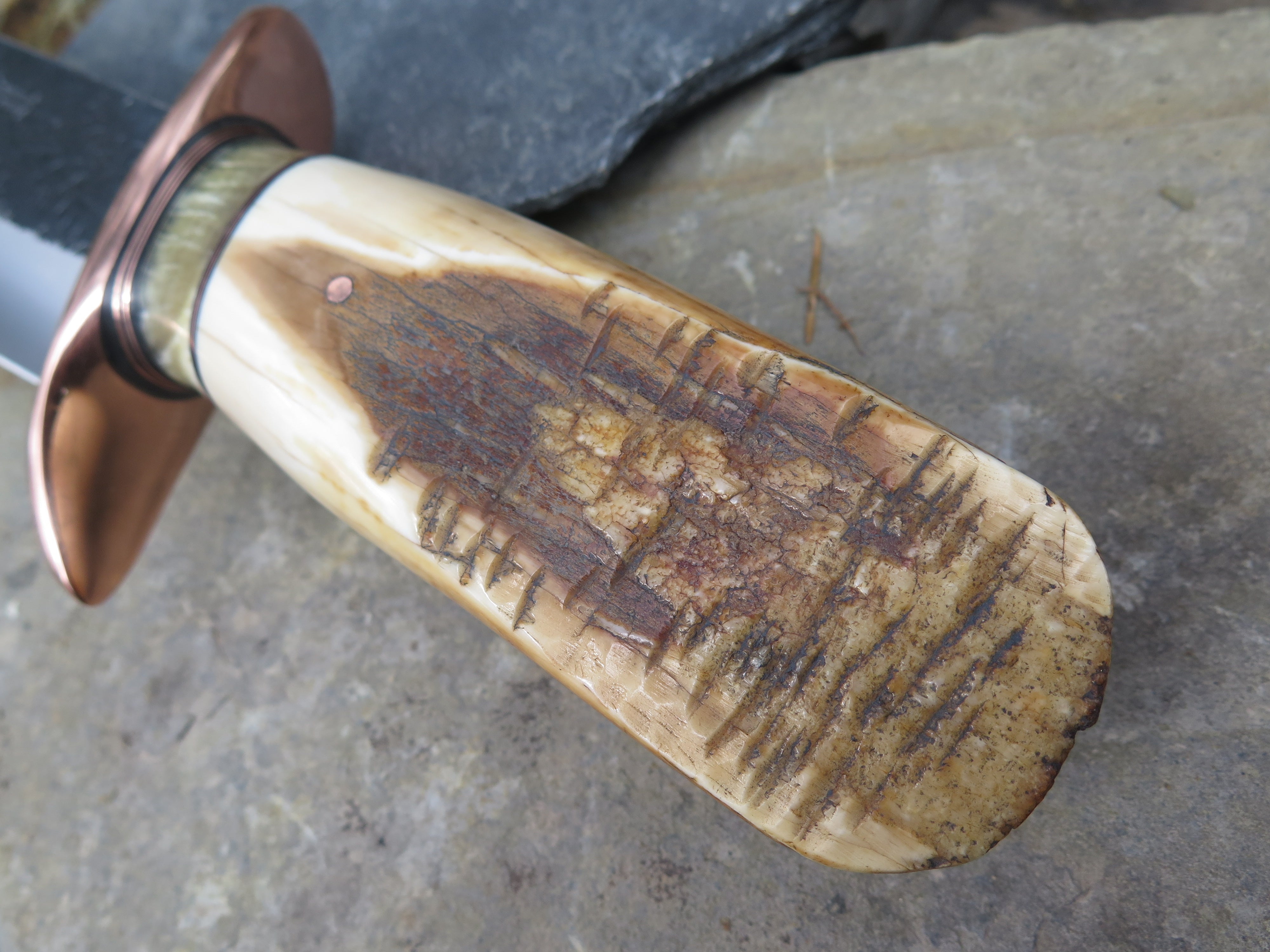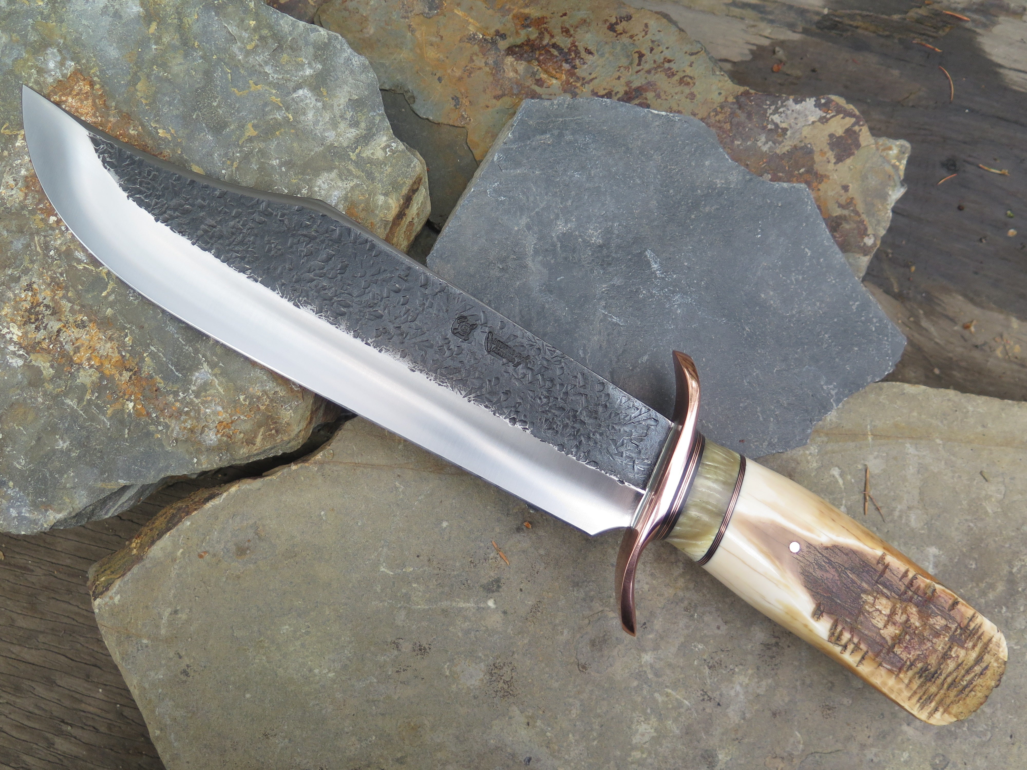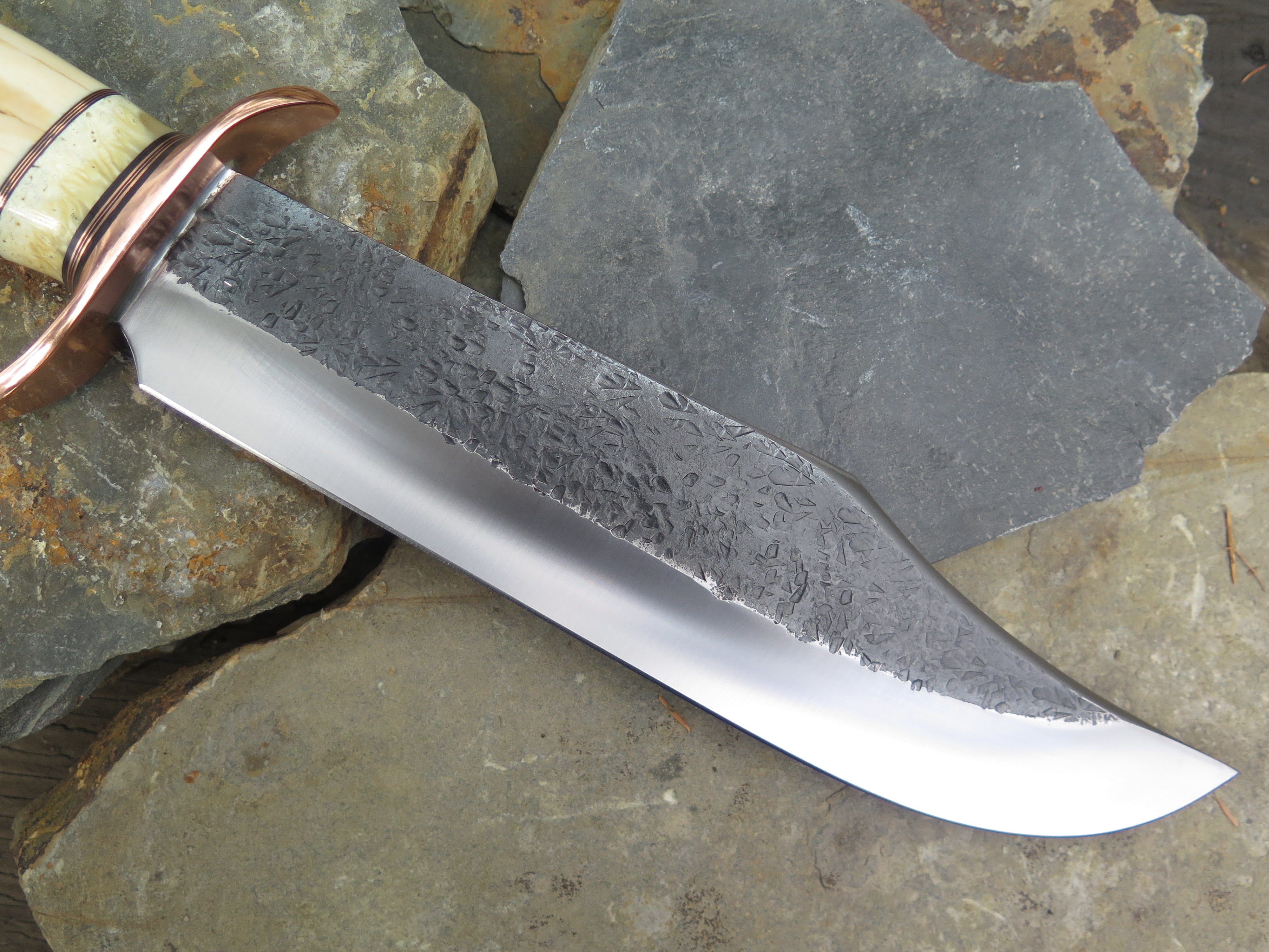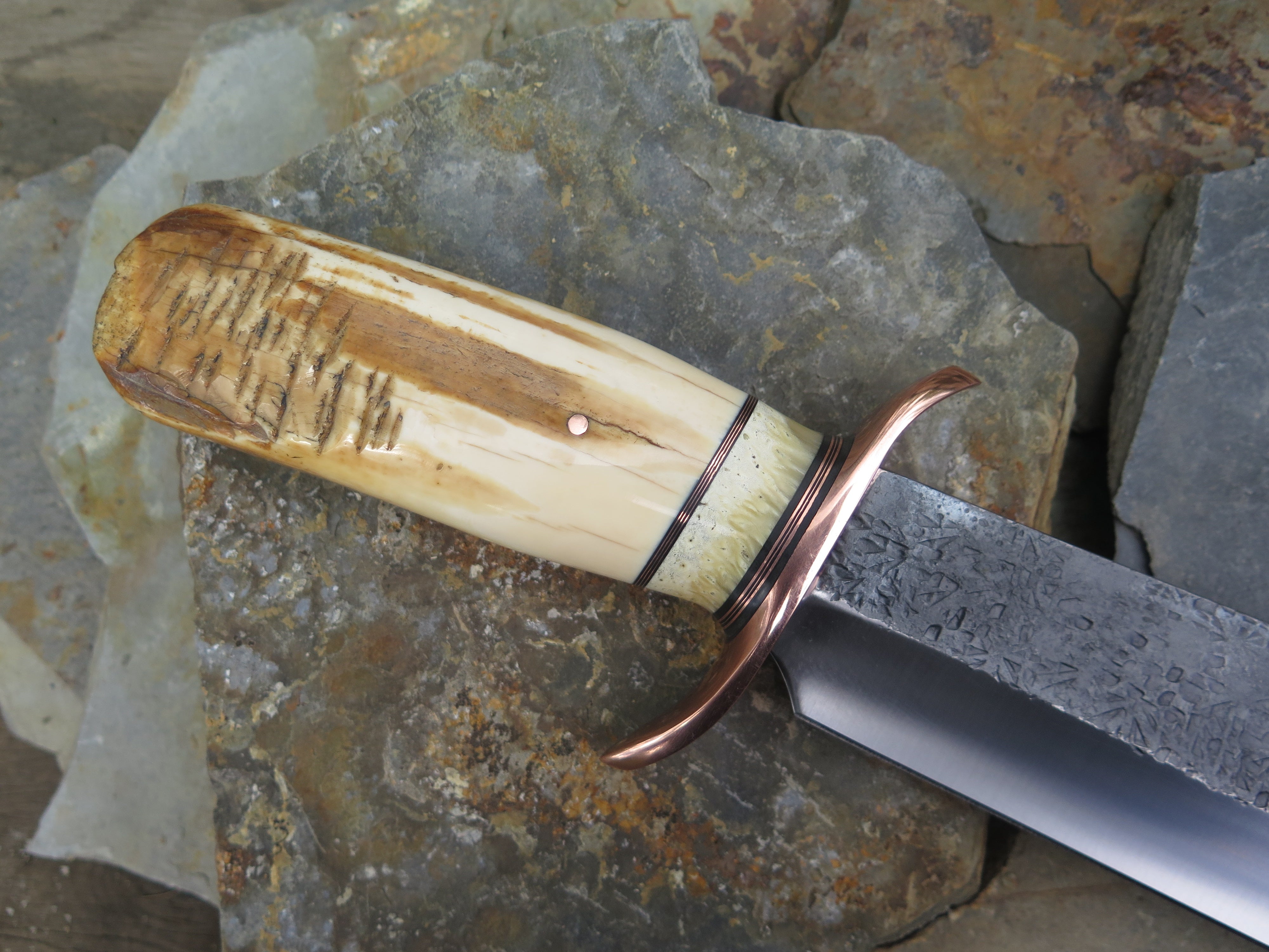 This incredible Smithsonian Bowie from Behring Made© is hand forged from 1/4" thick high carbon 01 tool steel and it measures 11 1/4" from tip to guard with a razor sharp hollow grind and our hammermark finish. The forged copper s-guard is soldered in place above black fiber, copper and musk ox boss spacers as well as a premium artifact walrus ivory handle that's pinned through the tang with copper. The overall length measures 17 1/4" and it comes in a custom sheath from Rowe's Leather.