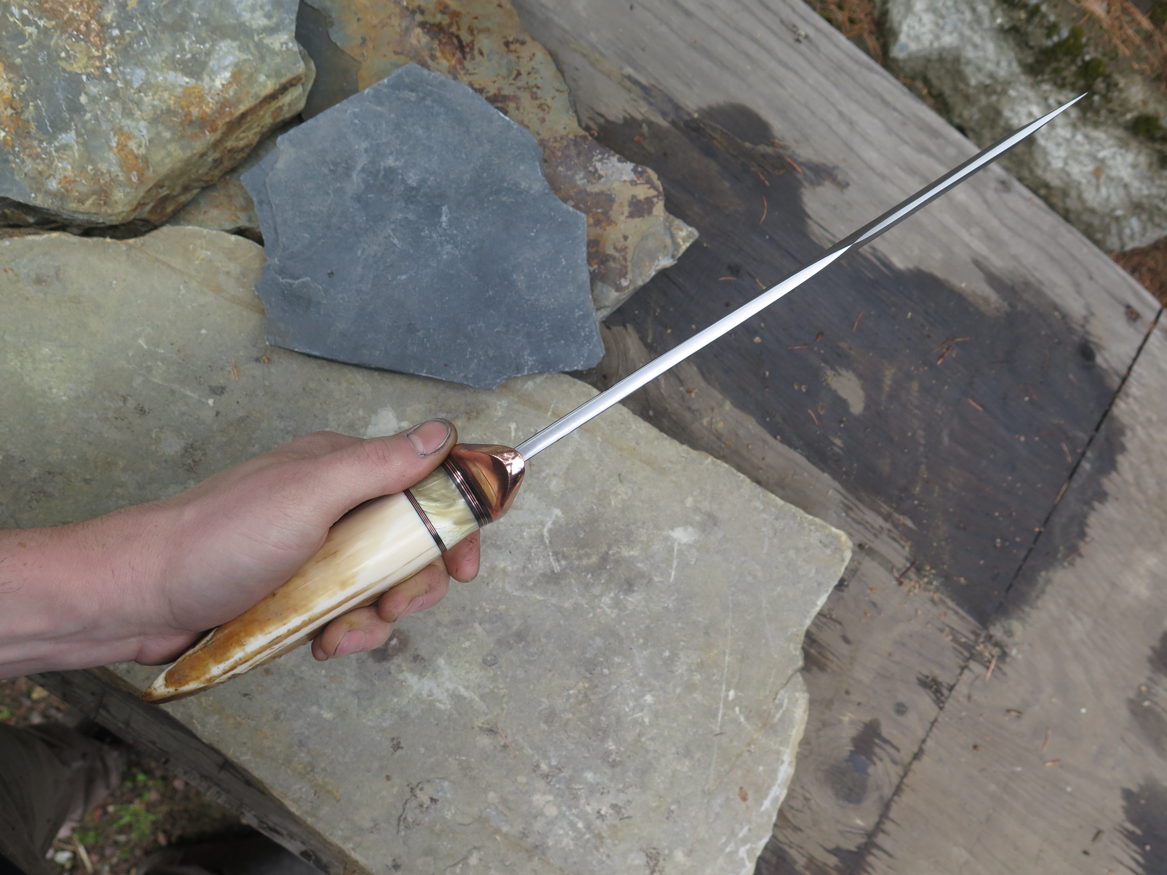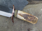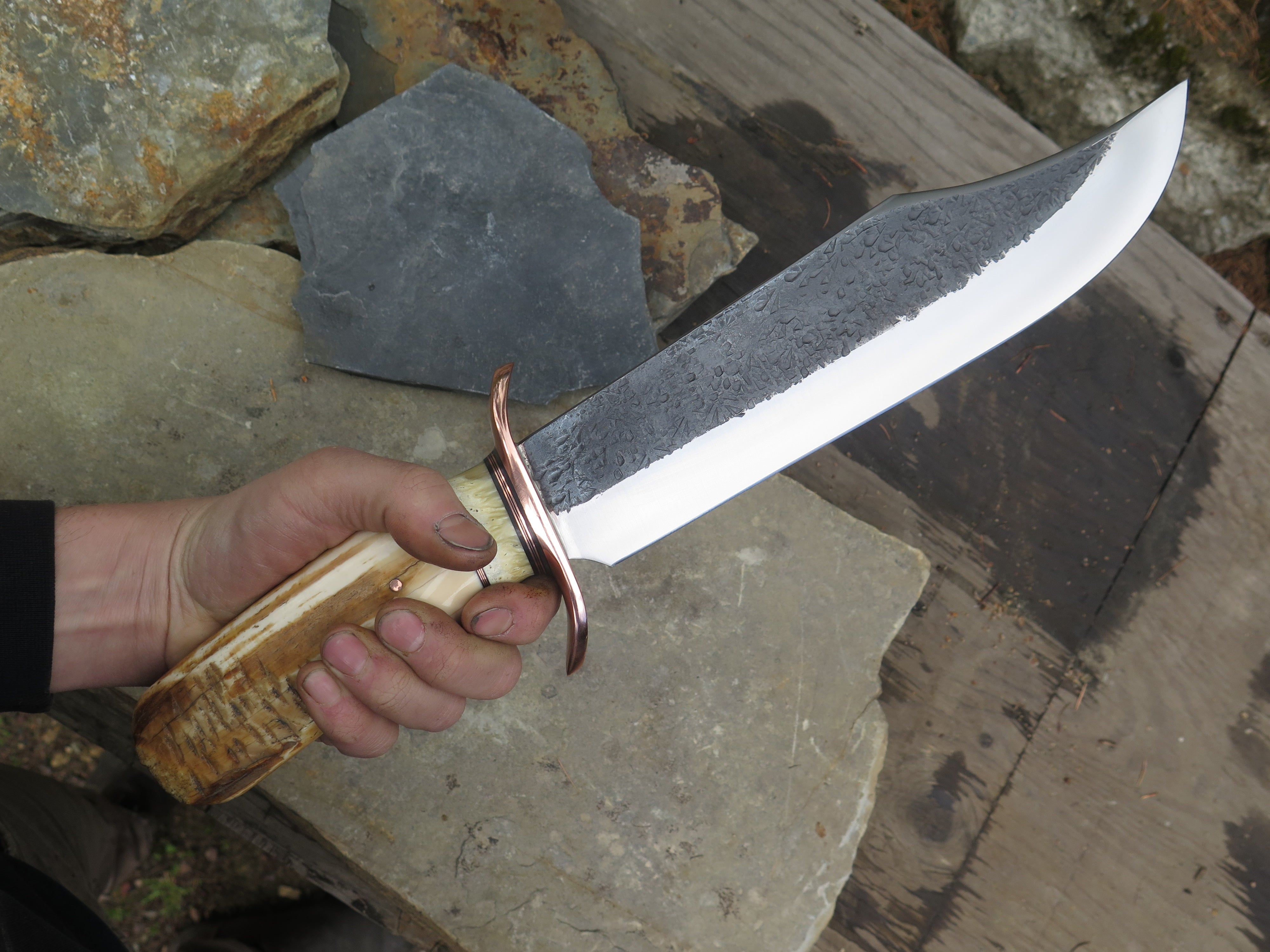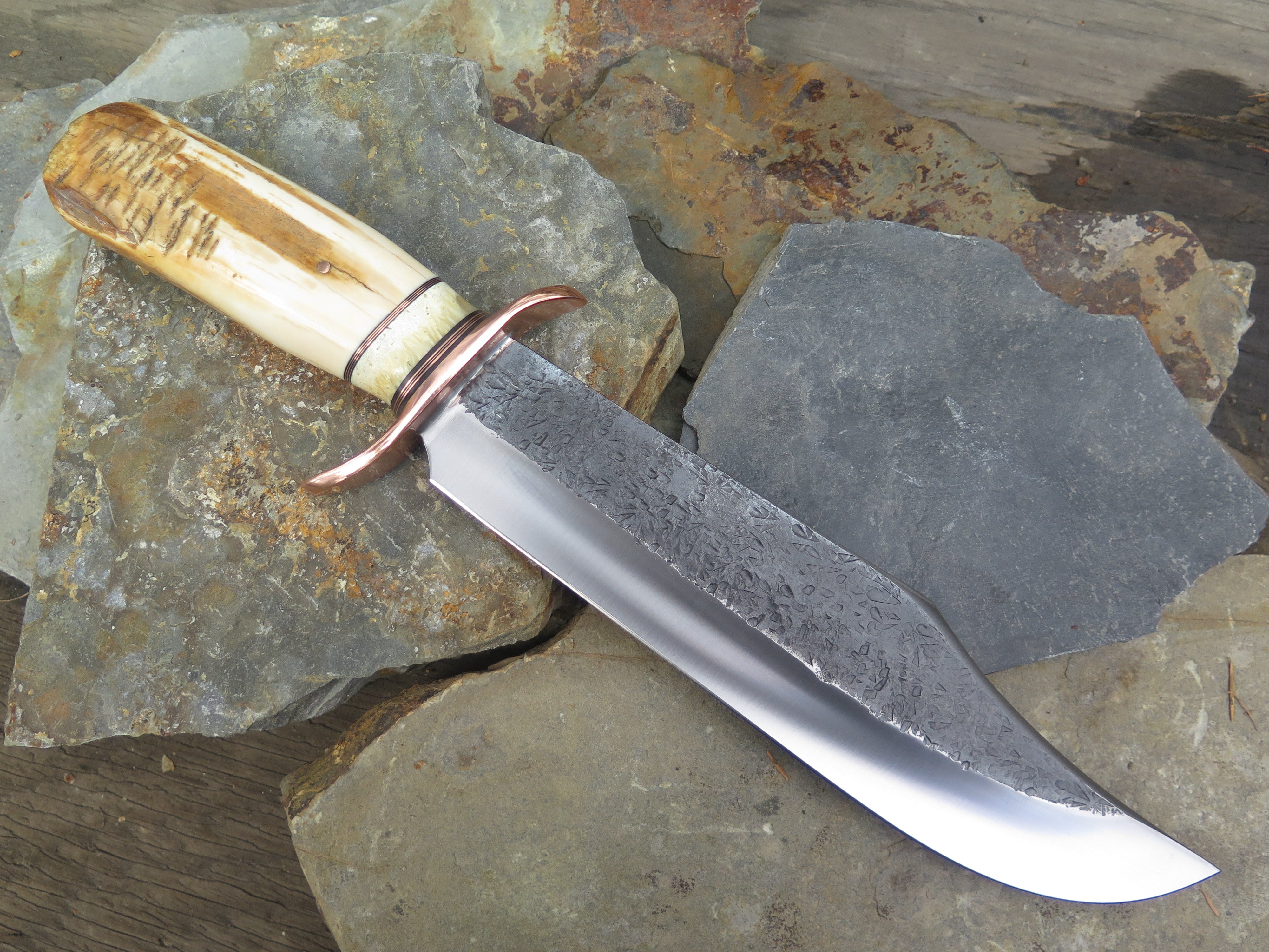 This incredible Smithsonian Bowie from Behring Made© is hand forged from 1/4" thick high carbon 01 tool steel and it measures 11 1/4" from tip to guard with a razor sharp hollow grind and our hammermark finish. The forged copper s-guard is soldered in place above black fiber, copper and musk ox boss spacers as well as a premium artifact walrus ivory handle that's pinned through the tang with copper. The overall length measures 17 1/4" and it comes in a custom sheath from Rowe's Leather.