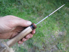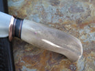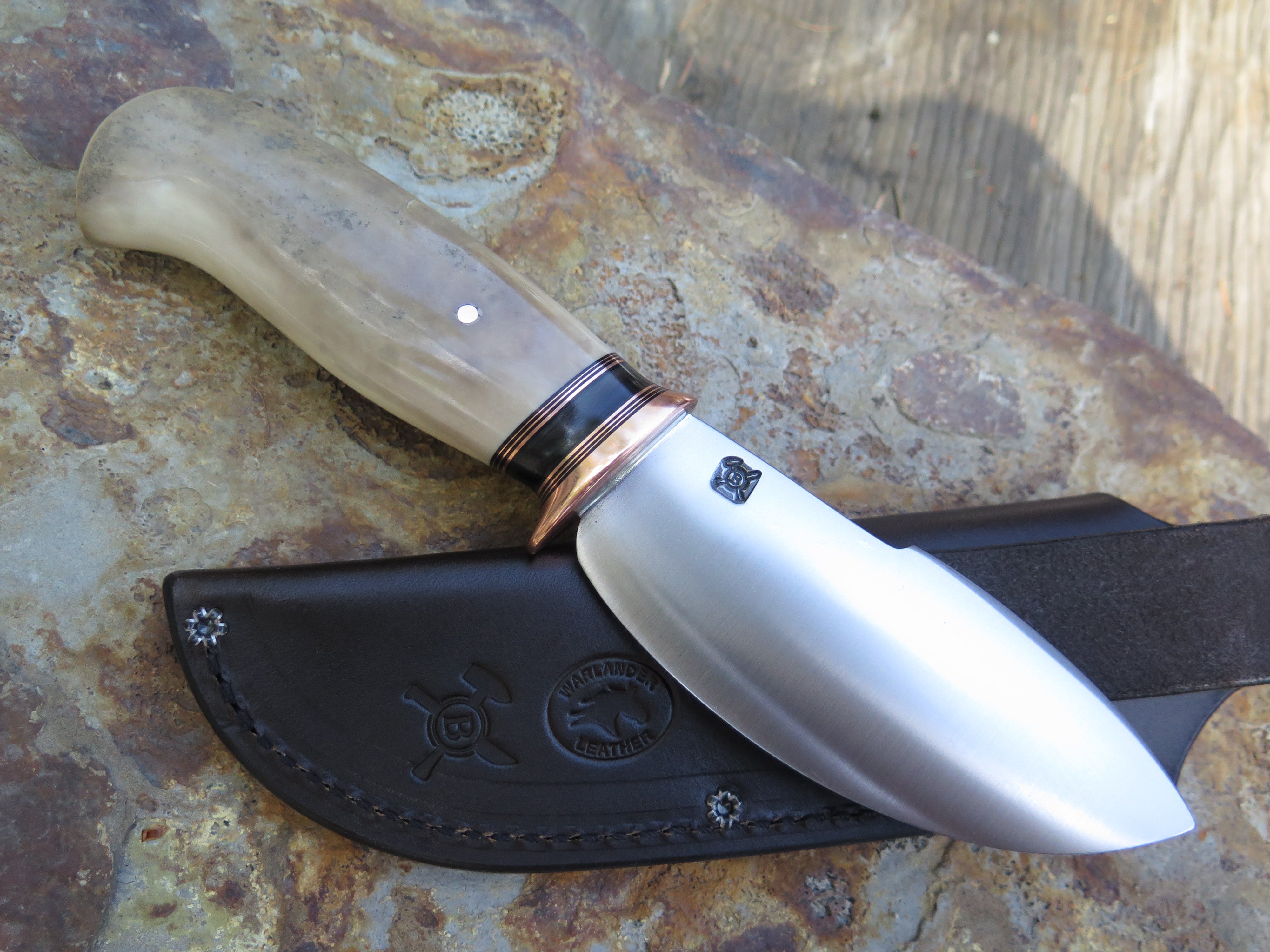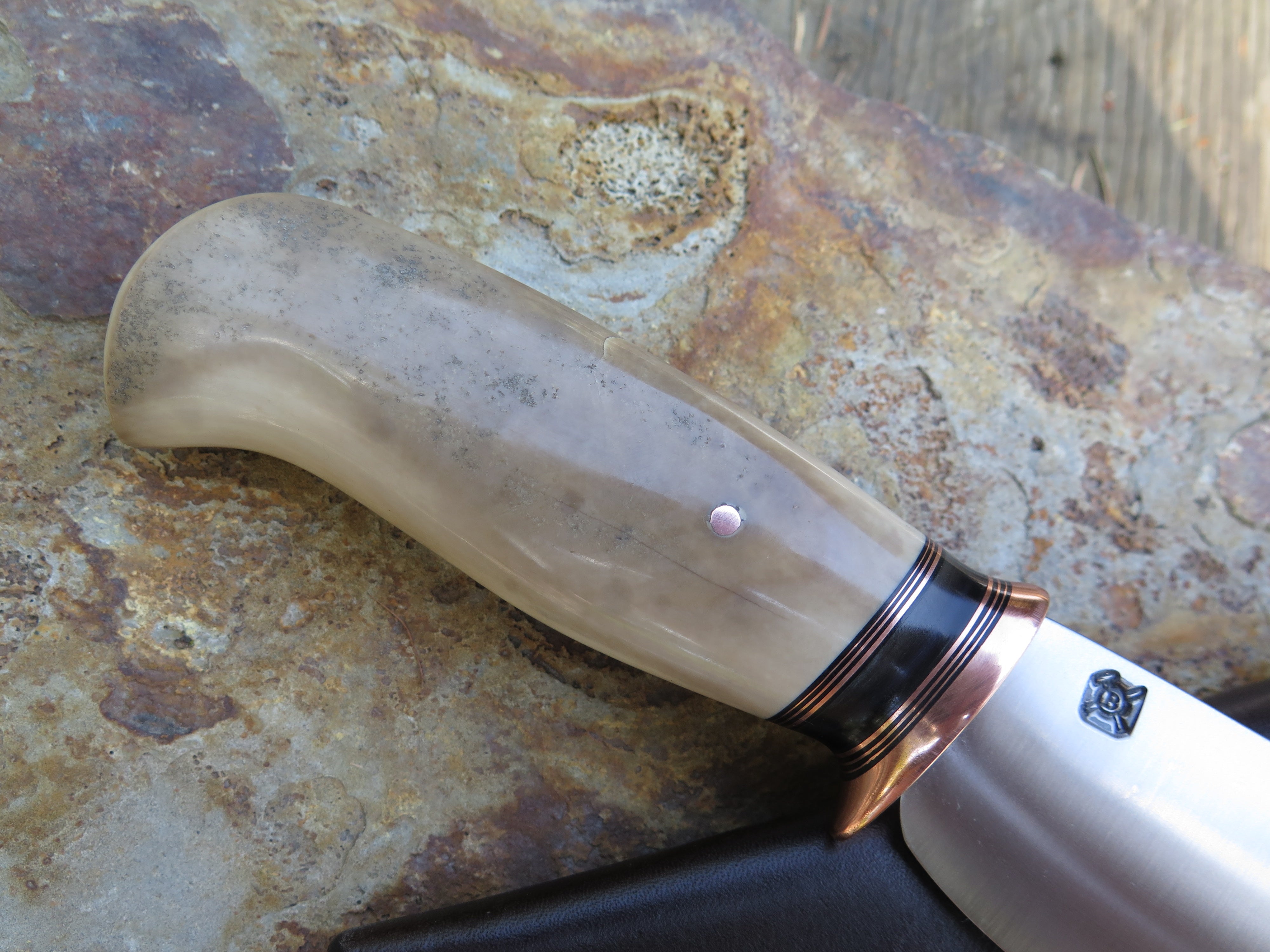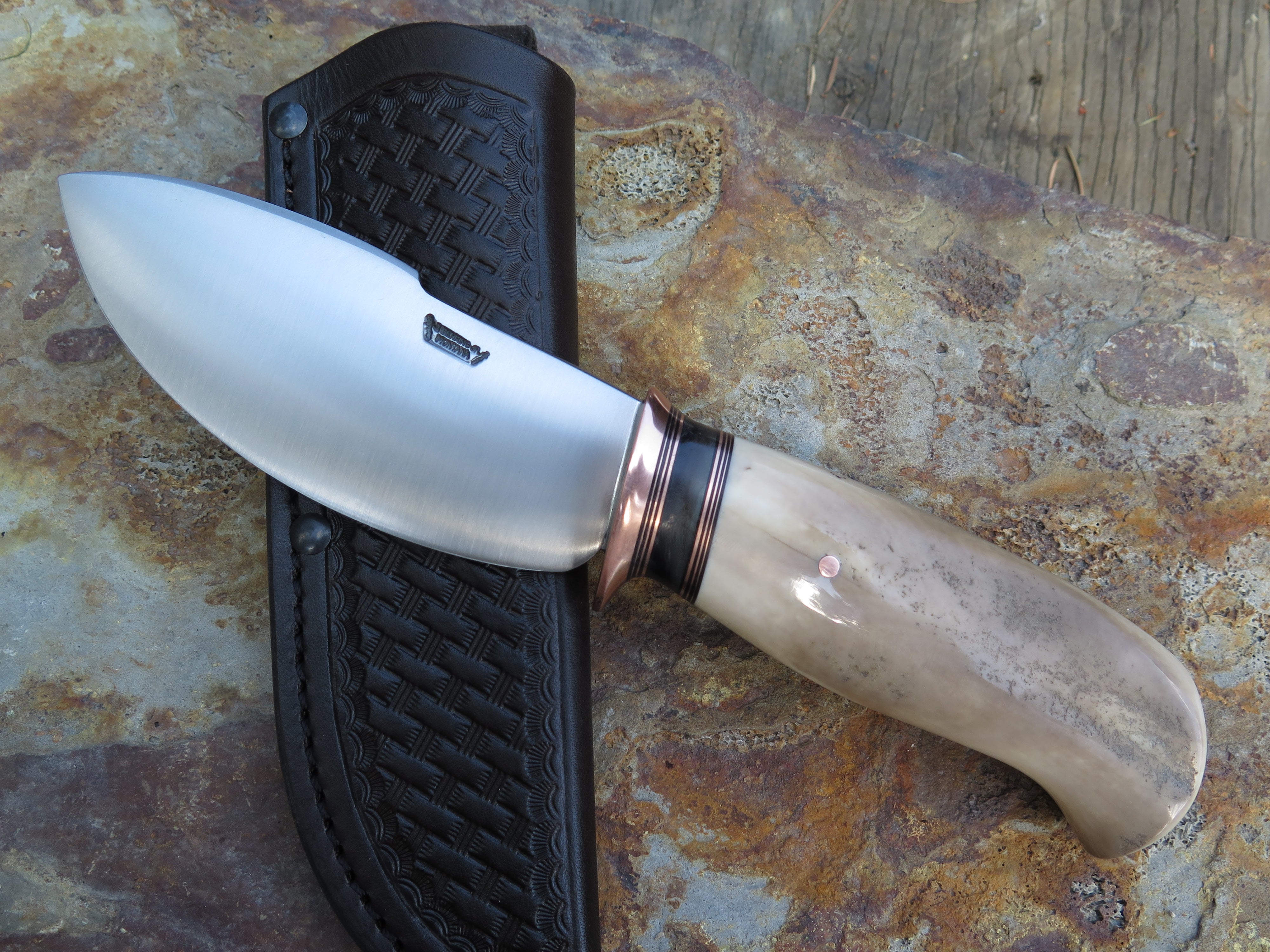 This outstanding new Behring Made© Canoe Knife is hand forged from 3/16" thick high carbon 01 tool steel and it measures 4 3/4" from tip to guard with a razor sharp convex grind. The copper guard is soldered in place above black fiber, copper and big horn sheep spacers which connect with a premium artifact walrus ivory that's pinned through the tang with copper. The overall length measures 9 1/4" and it comes in a basketweave tooled pouch sheath.