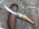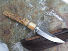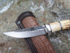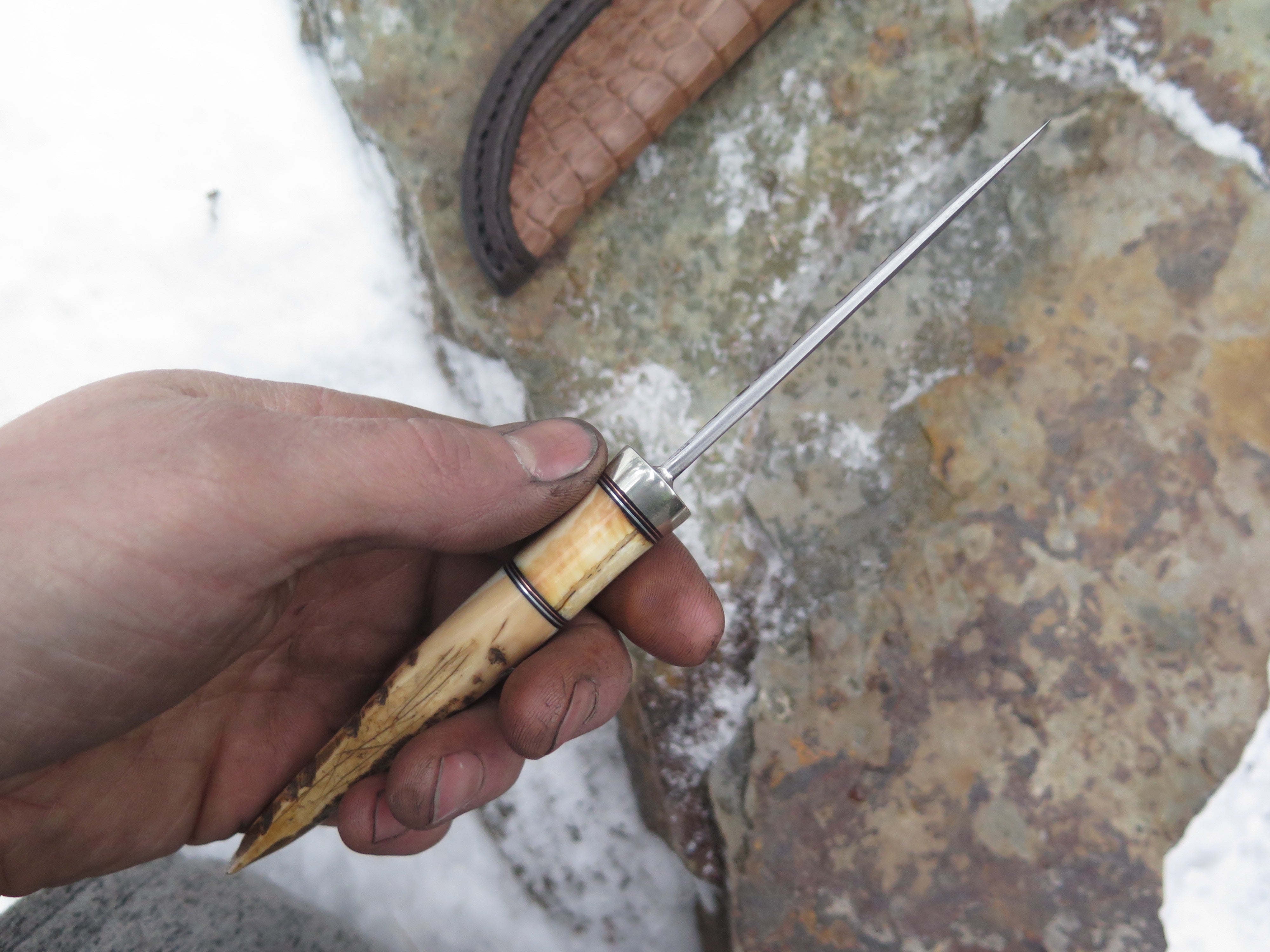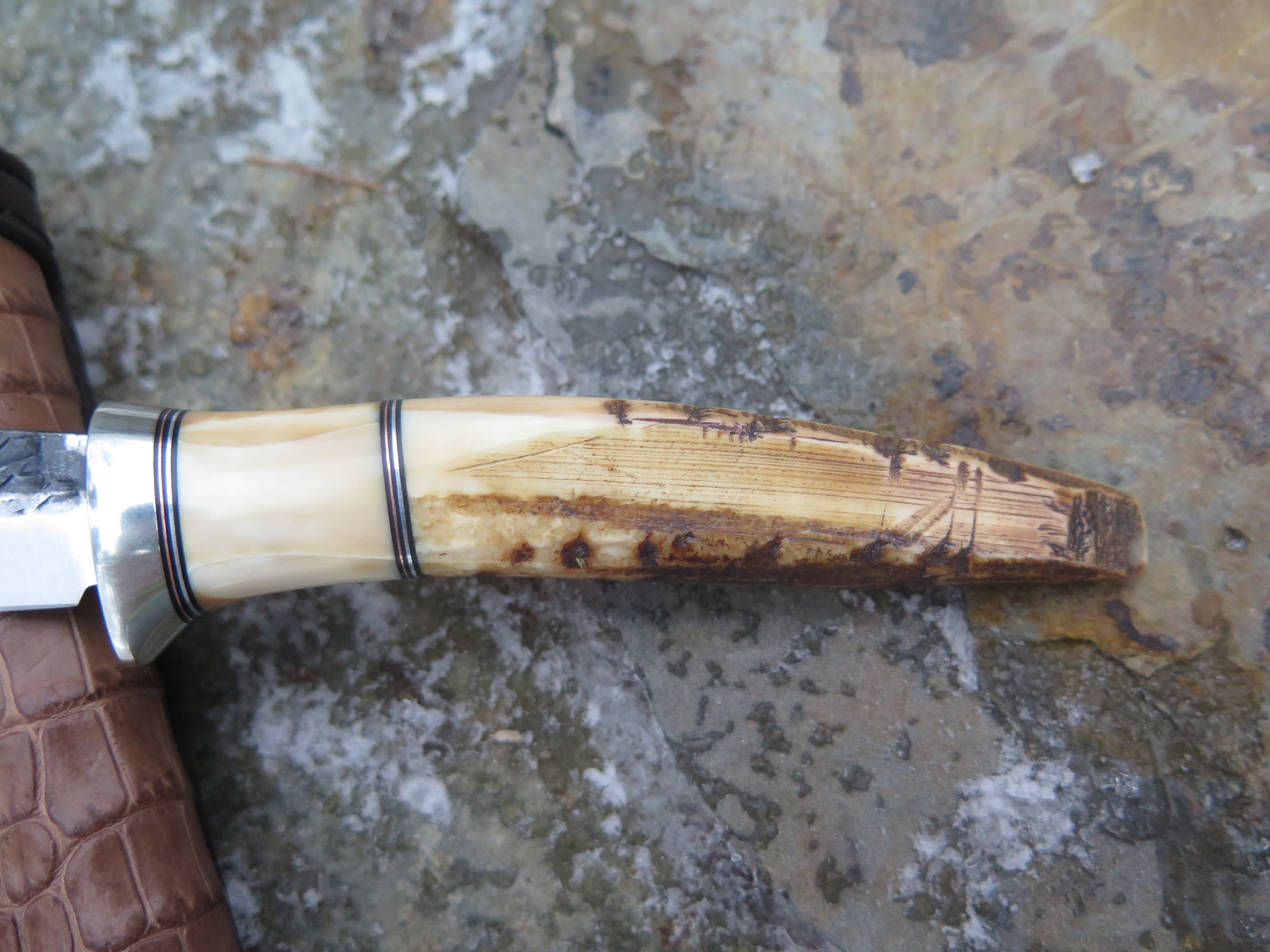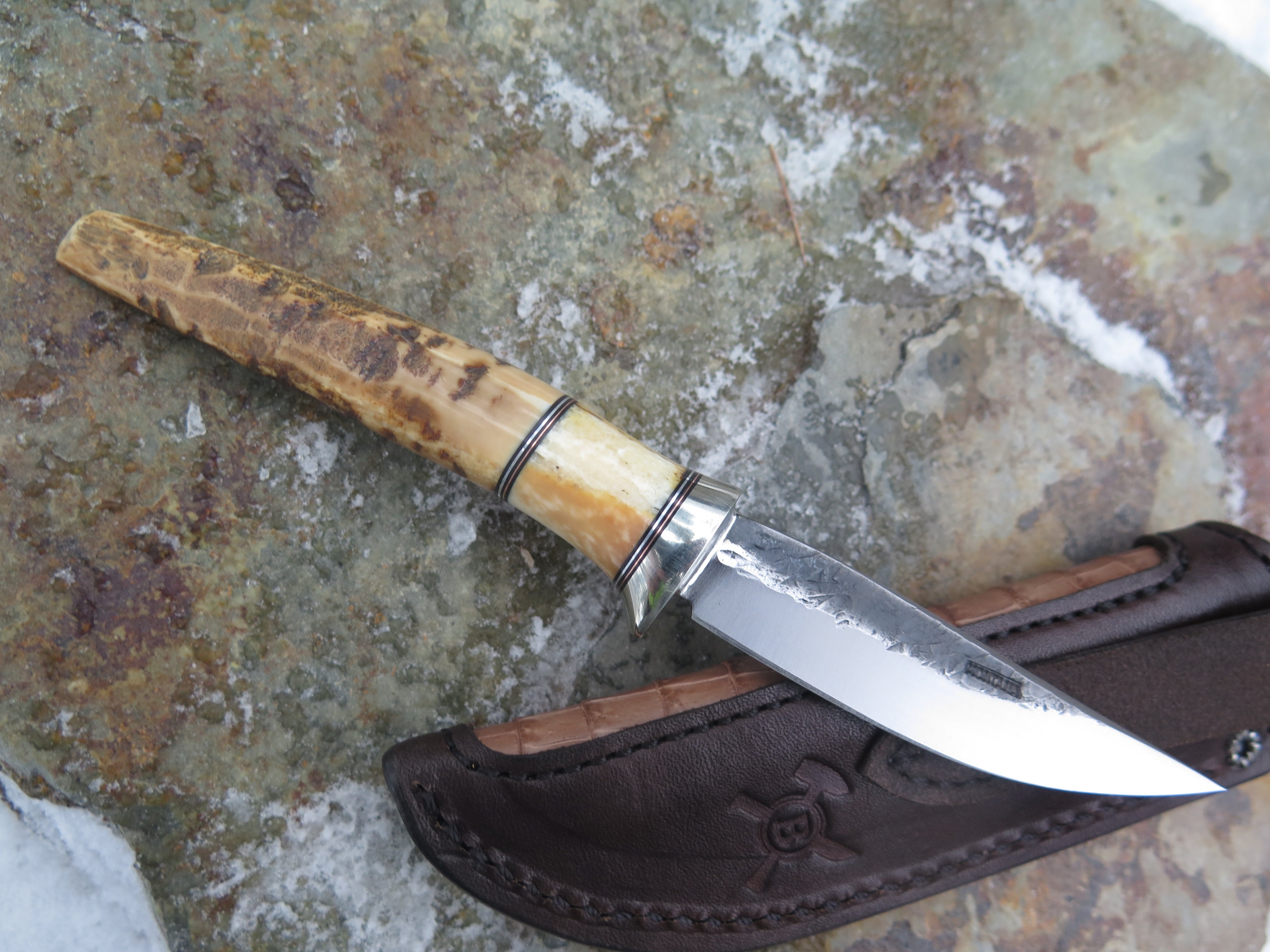 This incredible new Pintail from Behring Made© is hand forged from 1/8" thick high carbon 01 tool steel and it measures 3 1/4" from tip to guard with a razor sharp hollow grind and our hammermark finish. The nickel silver guard is soldered in place above black fiber, copper, aluminum and fossil walrus ivory spacers above an artifact walrus ivory handle with a range of light creams to deep browns. Overall length measures 7 1/2" and it comes in an exotic caiman inlay.