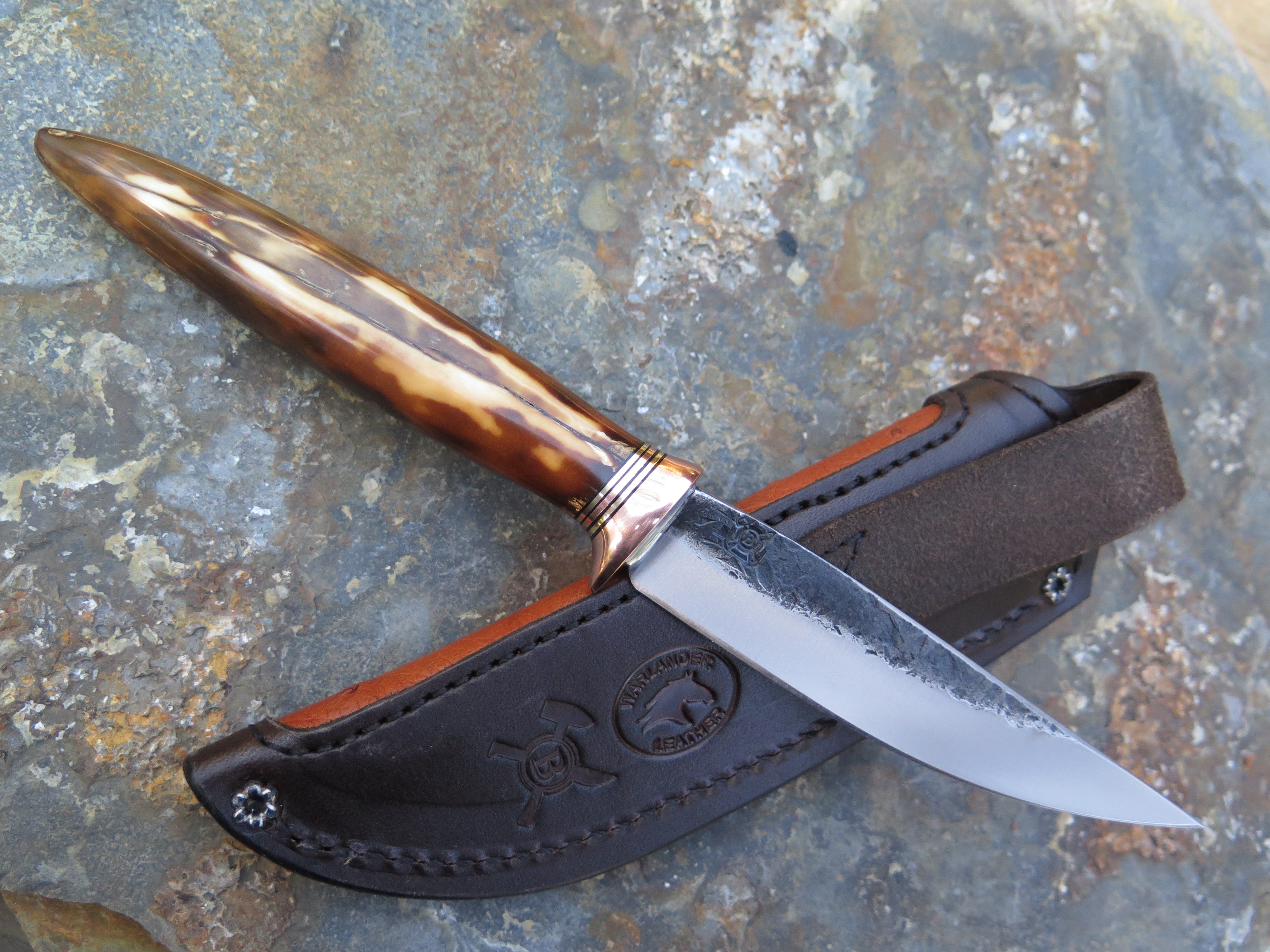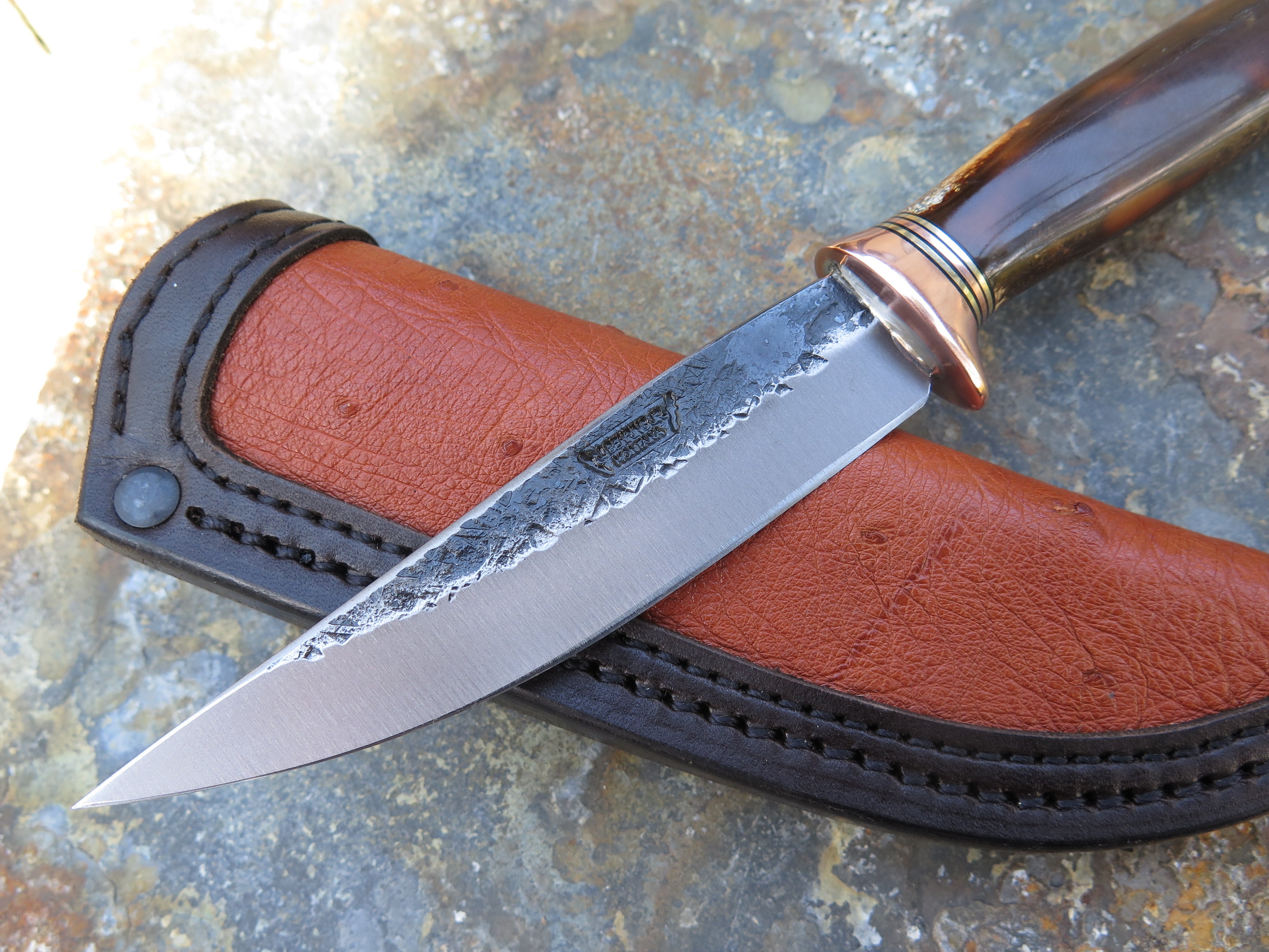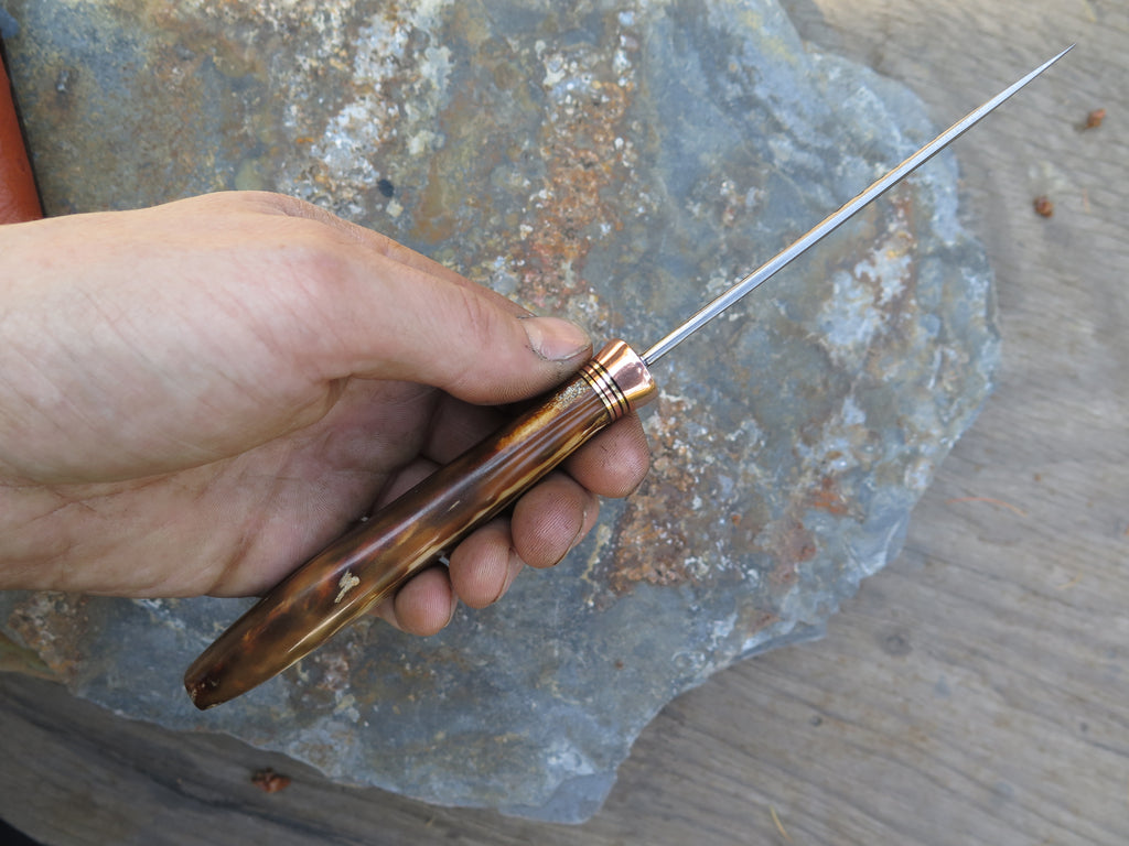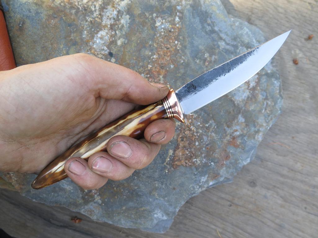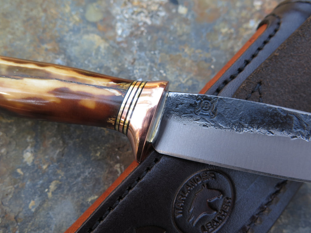 This incredible new Pintail from Behring Made© is hand forged from 1/8" thick high carbon 01 tool steel and it measures 4 1/4" from tip to guard with a razor sharp hollow grind and our hammermark finish. The copper guard is soldered in place above black, brass and copper spacers and the handle is made from a premium walrus ivory artifact. The overall length measures 9" and it comes in a custom ostrich inlaid pouch sheath.