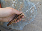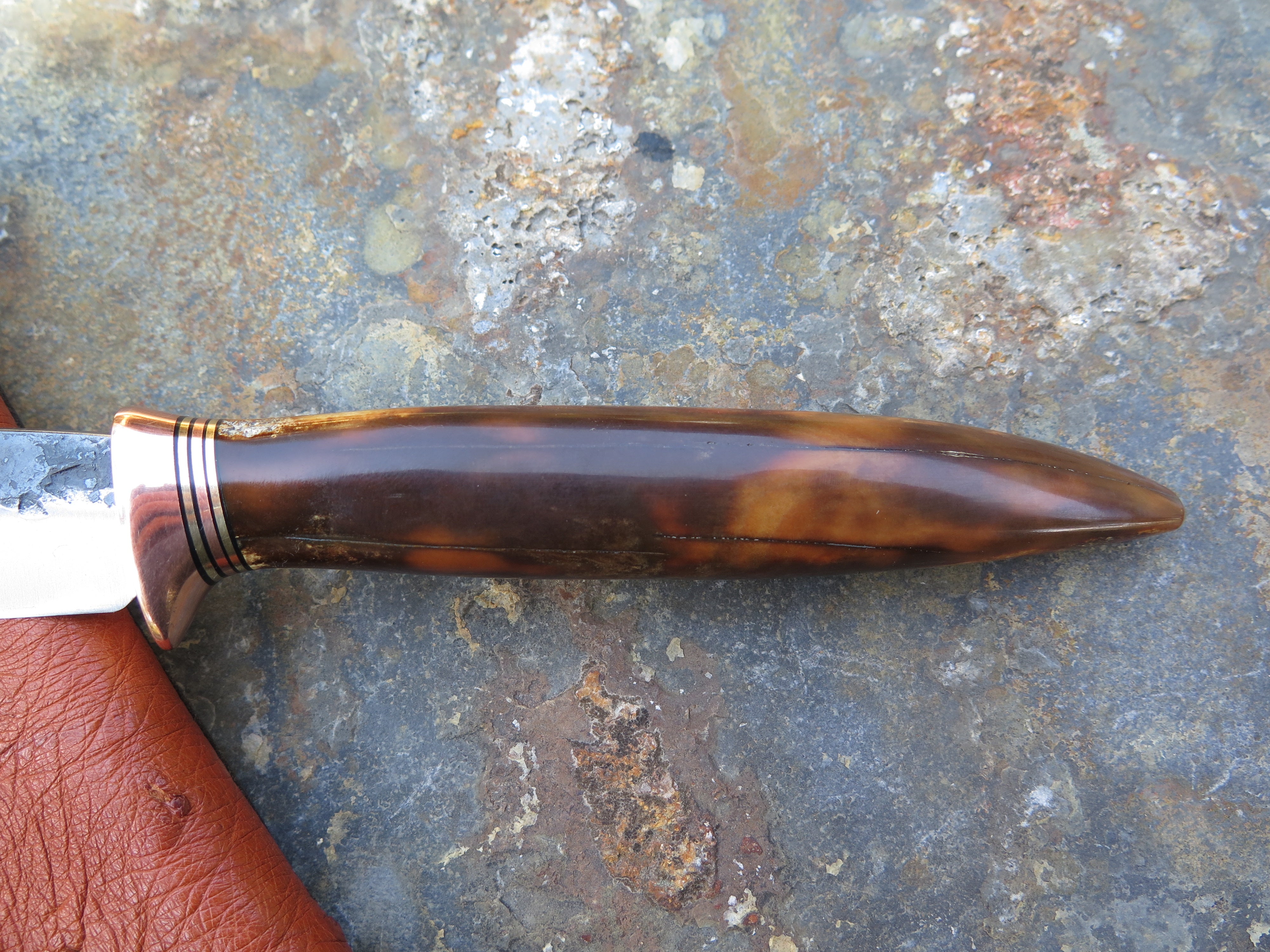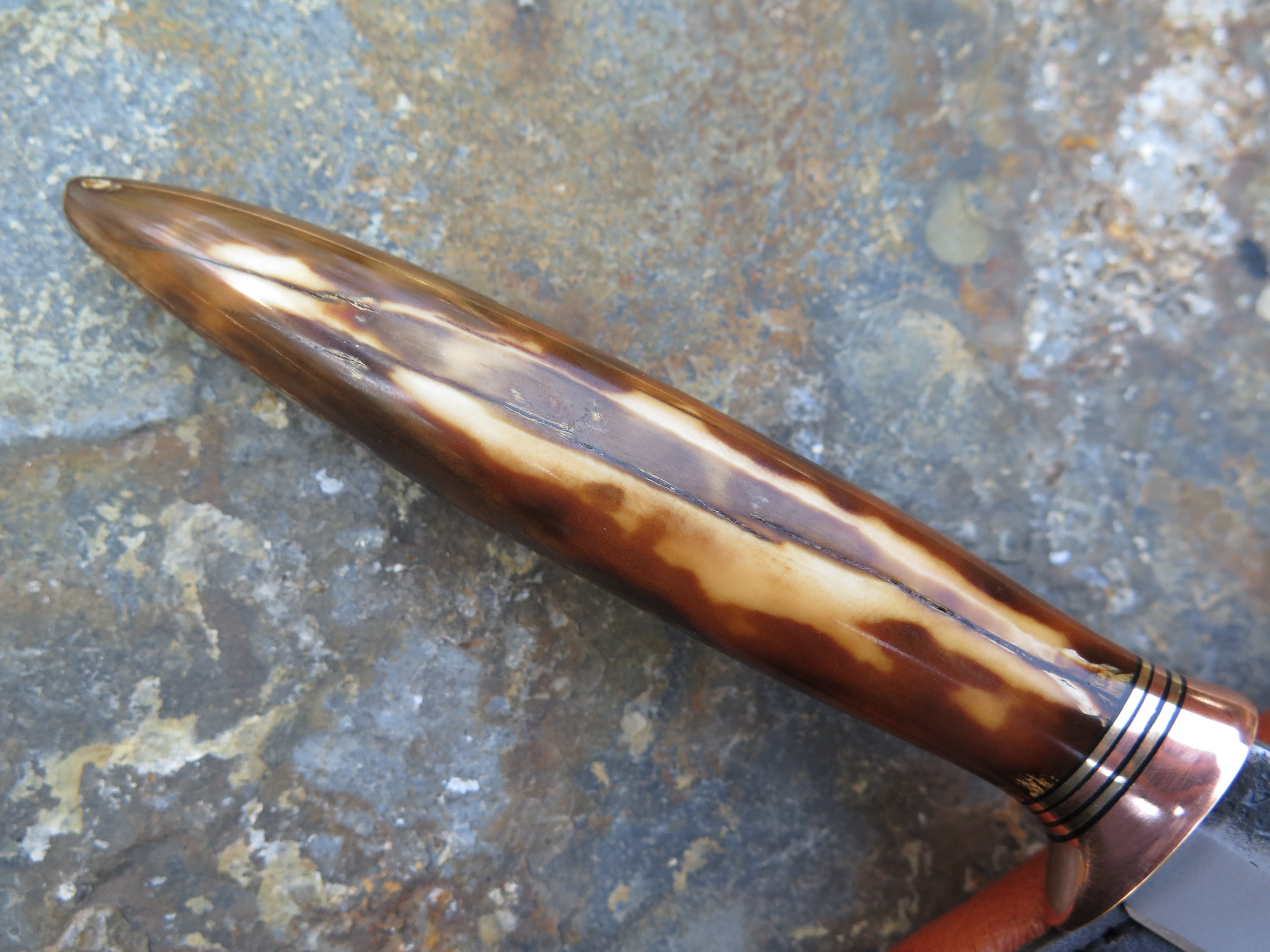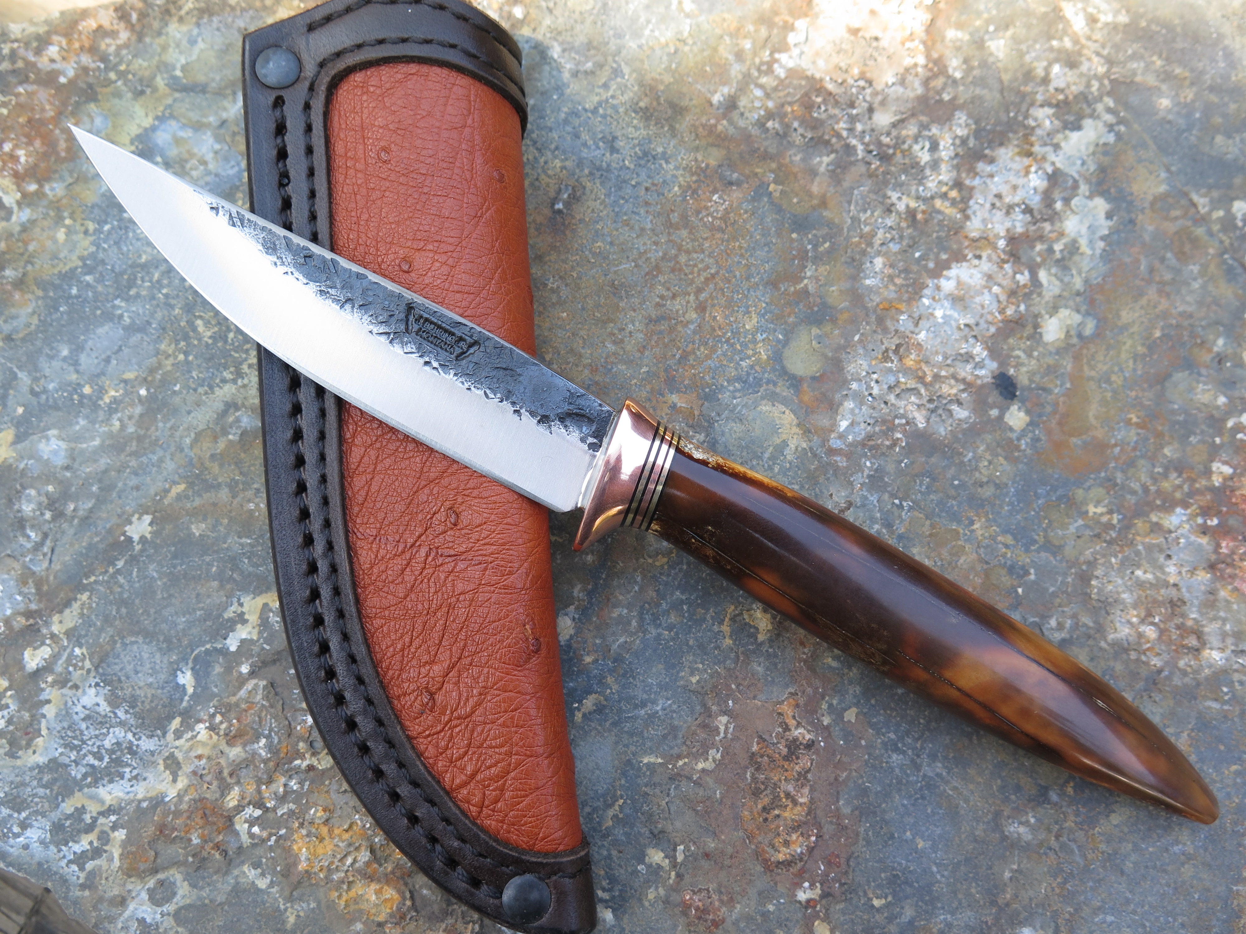 This incredible new Pintail from Behring Made© is hand forged from 1/8" thick high carbon 01 tool steel and it measures 4 1/4" from tip to guard with a razor sharp hollow grind and our hammermark finish. The copper guard is soldered in place above black, brass and copper spacers and the handle is made from a premium walrus ivory artifact. The overall length measures 9" and it comes in a custom ostrich inlaid pouch sheath.