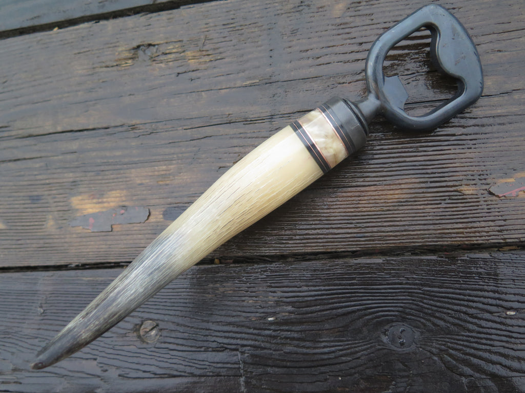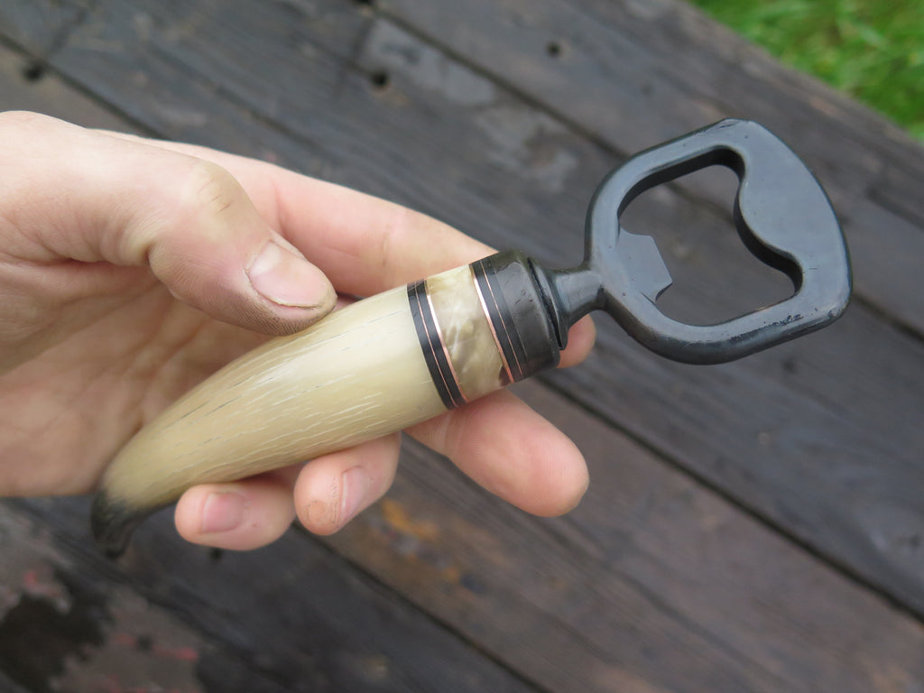 There's really no better compliment to your beer than the Behring Made© bottle opener. We soldered the blued steel guard in place above black fiber, copper and musk ox boss spacers that join a beautiful musk ox tine with a beautiful range of blacks to cream tones. Overall length measures 7 3/8" and it comes in a Behring Made© zipper case.