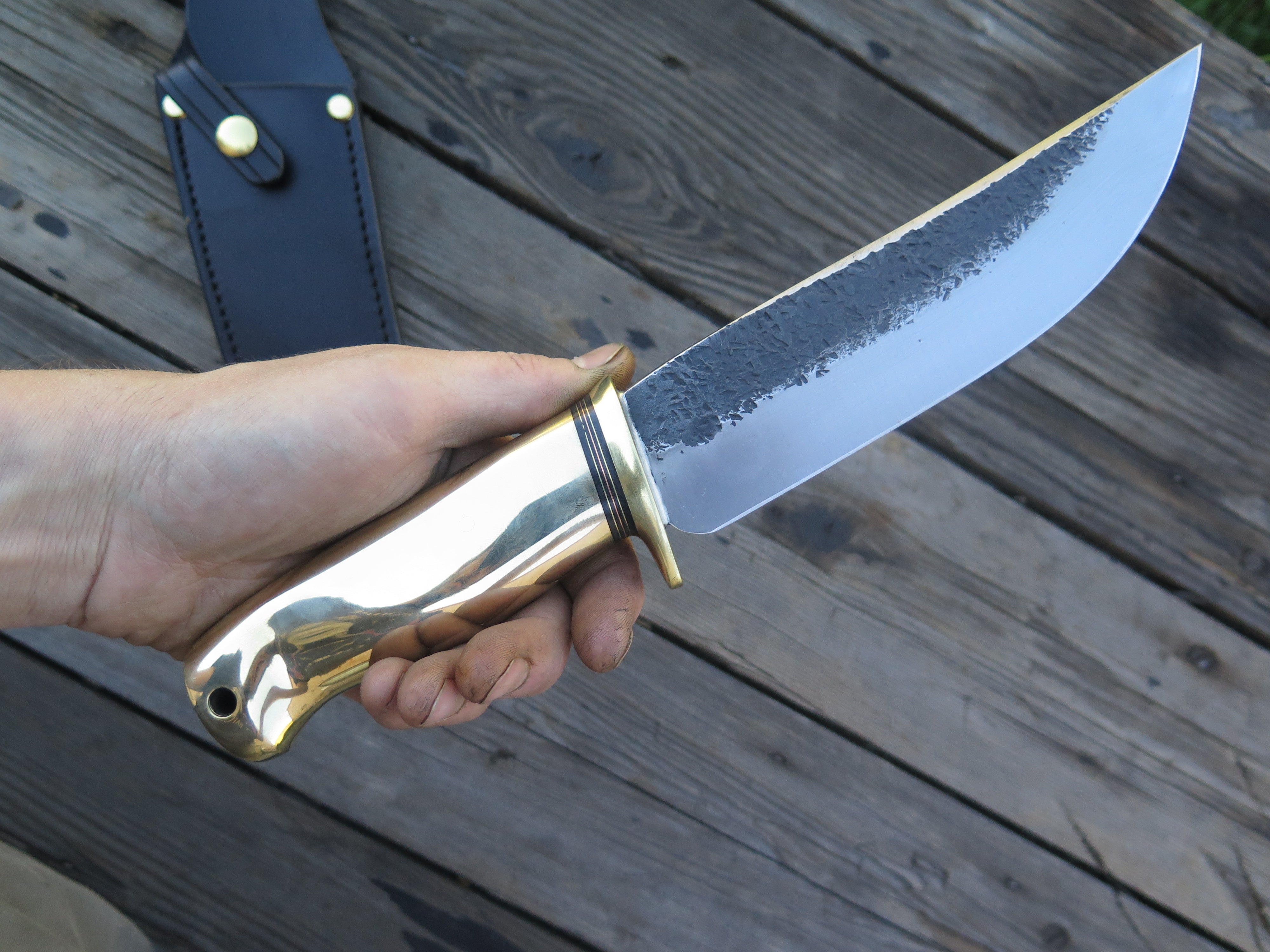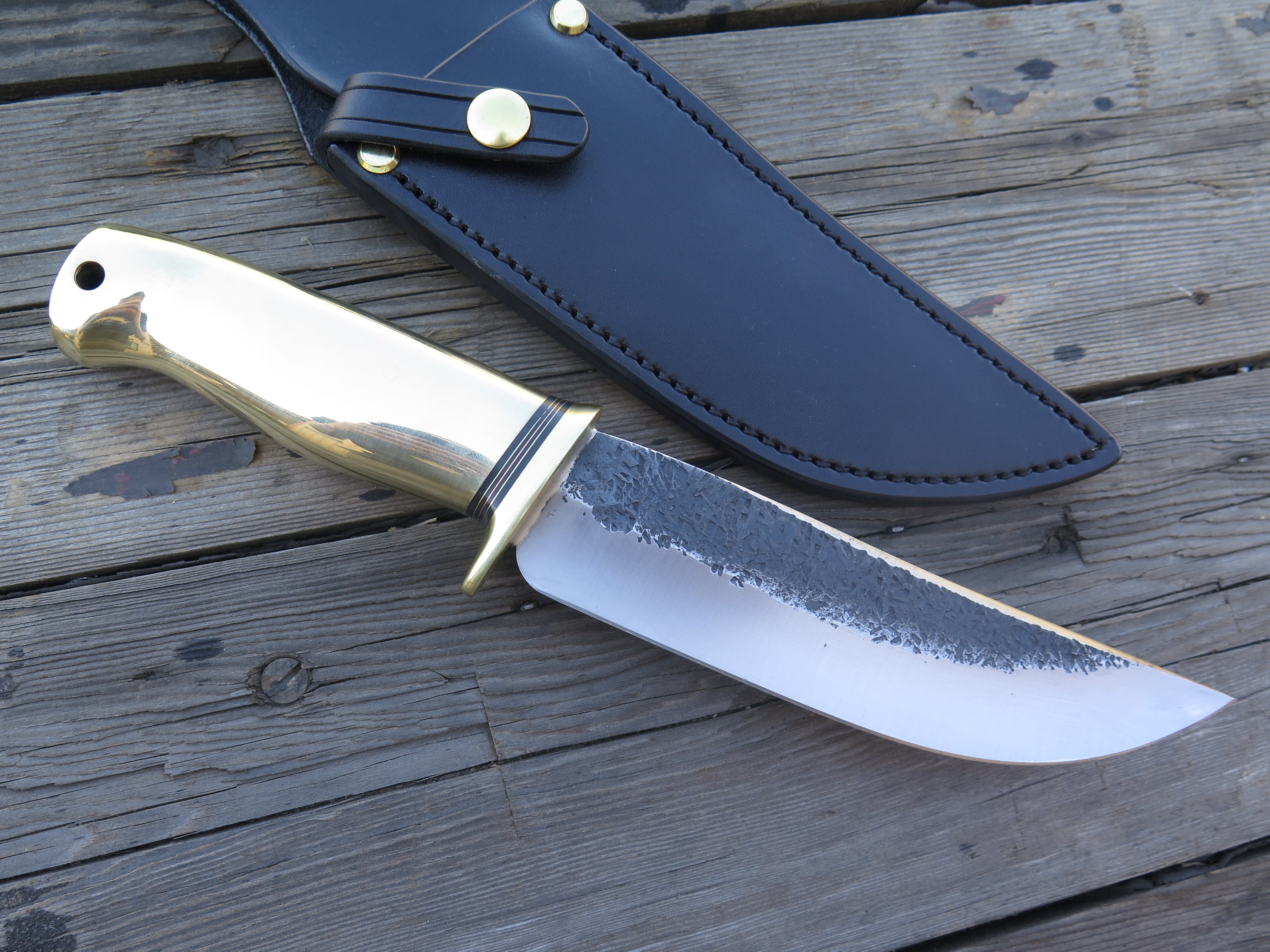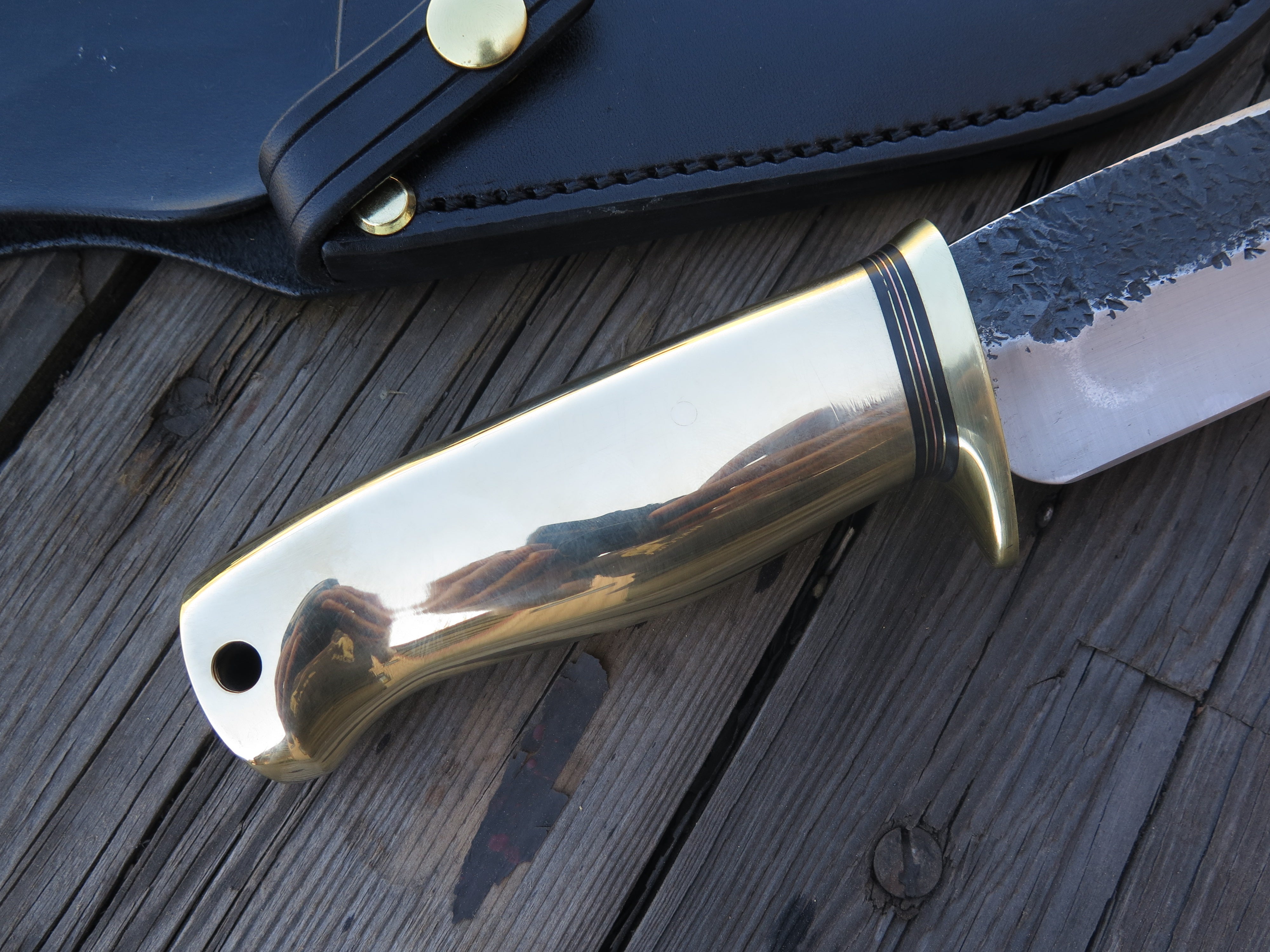 This epic new Hunter from Behring Made© is hand forged from 1/4" thick high carbon 01 tool steel and measures a whoppin' 7" from tip to guard with a razor sharp hollow grind and our hammermark finish. The brass guard is soldered in place above black fiber, brass and copper spacers with a colossal handle made from solid brass- you won't believe the presence in hand! Overall length measures 11 3/4" and it comes in a custom sheath like the one shown. Please allow 8-12 weeks for delivery as this is an archive listing and is made to order.