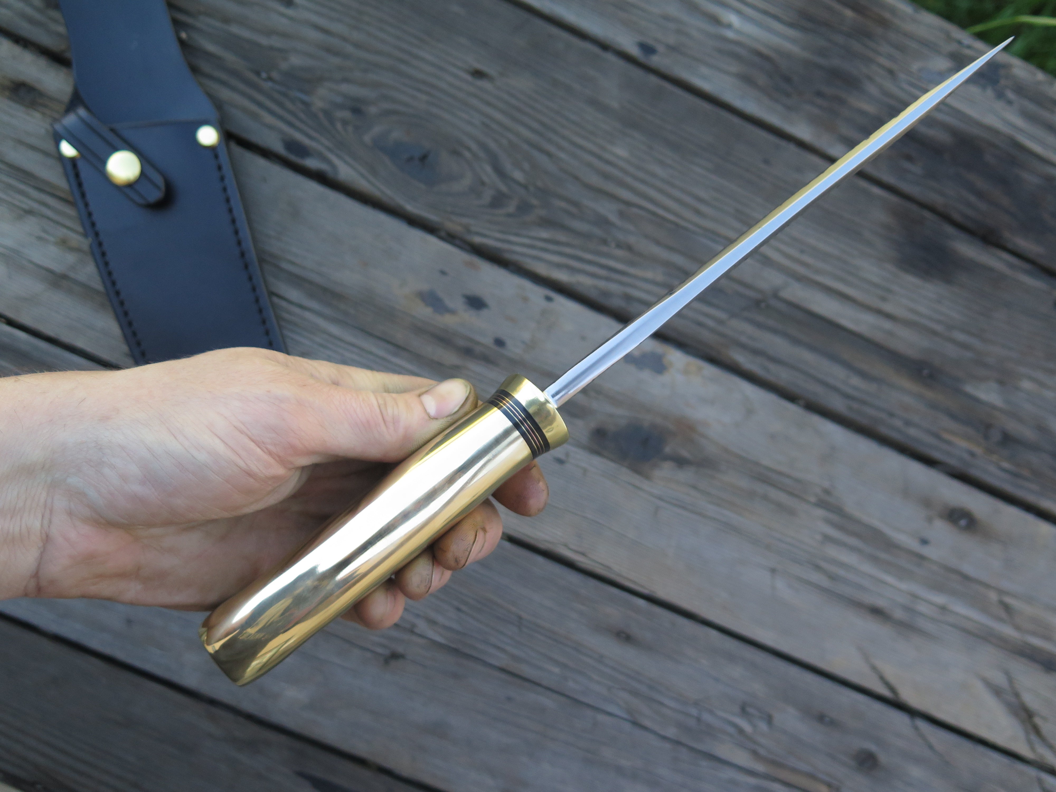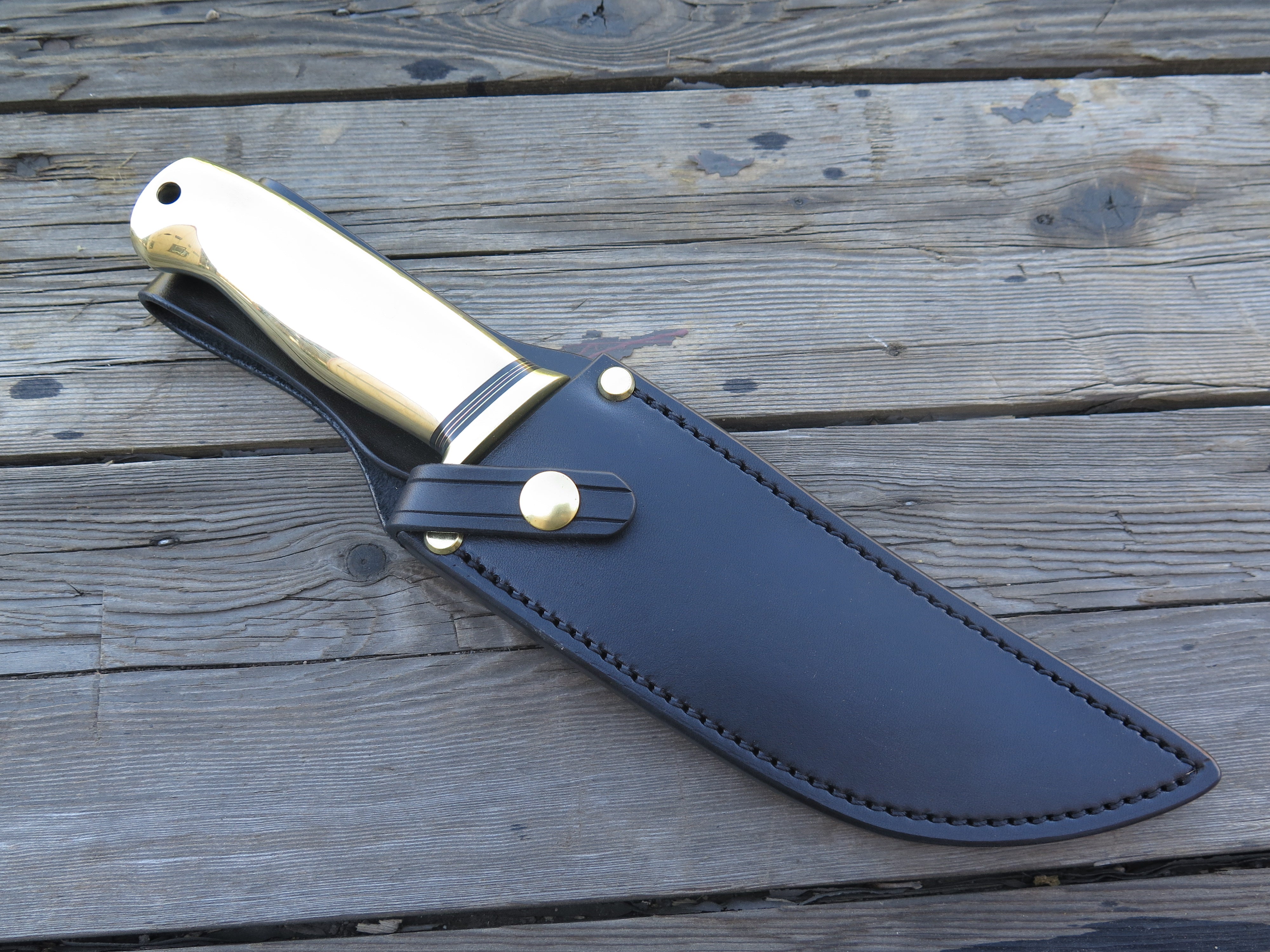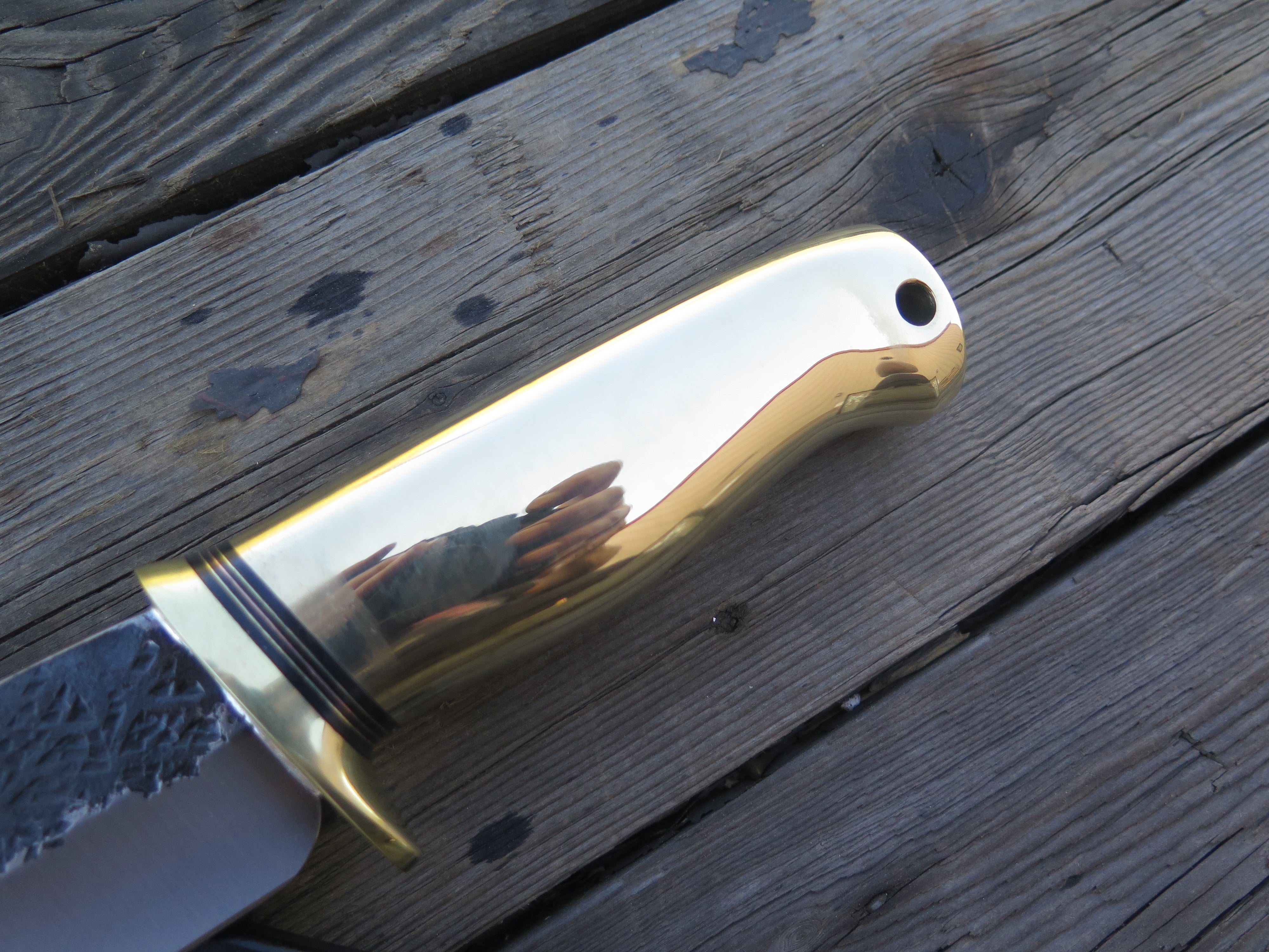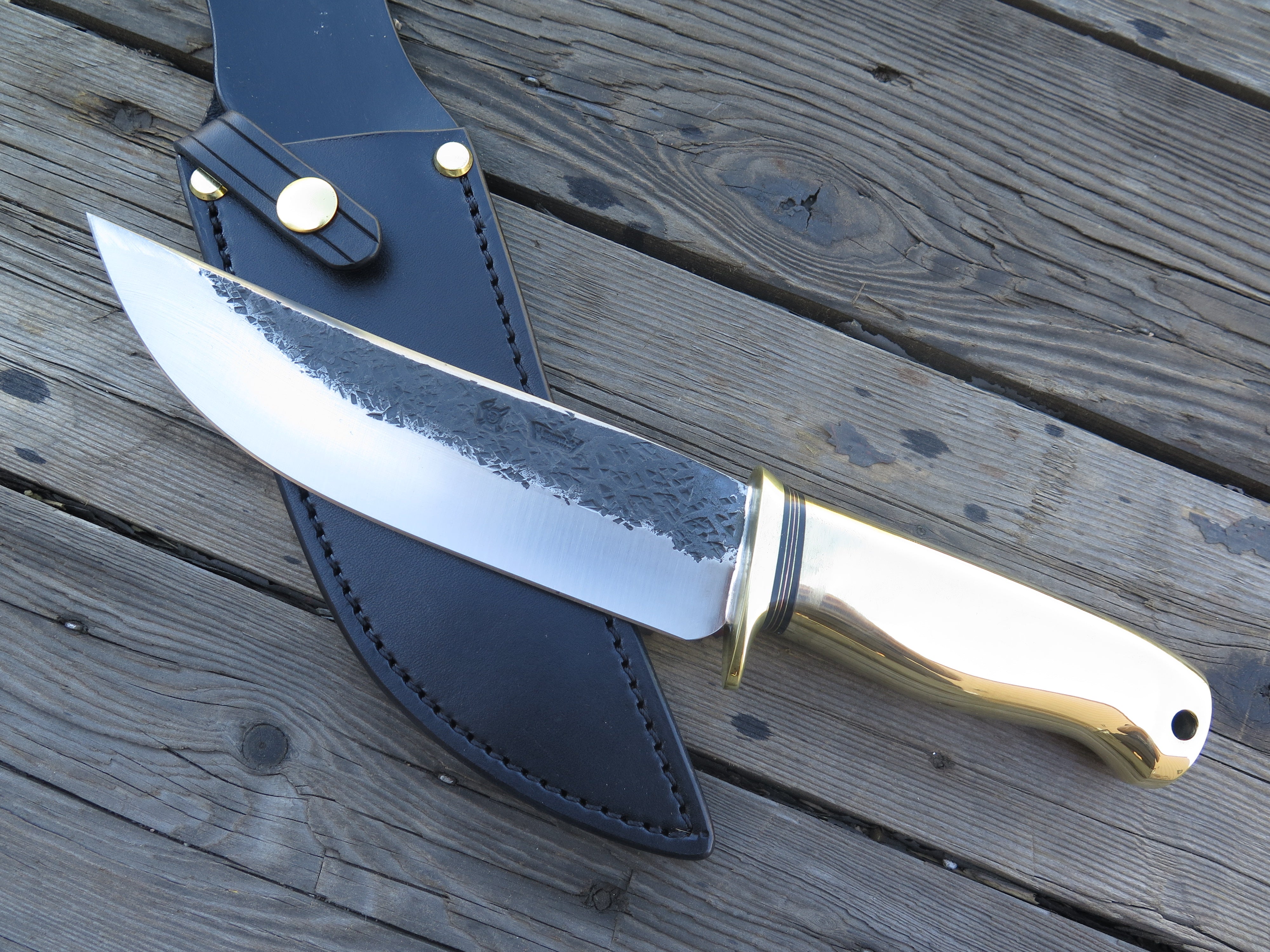 This epic new Hunter from Behring Made© is hand forged from 1/4" thick high carbon 01 tool steel and measures a whoppin' 7" from tip to guard with a razor sharp hollow grind and our hammermark finish. The brass guard is soldered in place above black fiber, brass and copper spacers with a colossal handle made from solid brass- you won't believe the presence in hand! Overall length measures 11 3/4" and it comes in a custom sheath like the one shown. Please allow 8-12 weeks for delivery as this is an archive listing and is made to order.