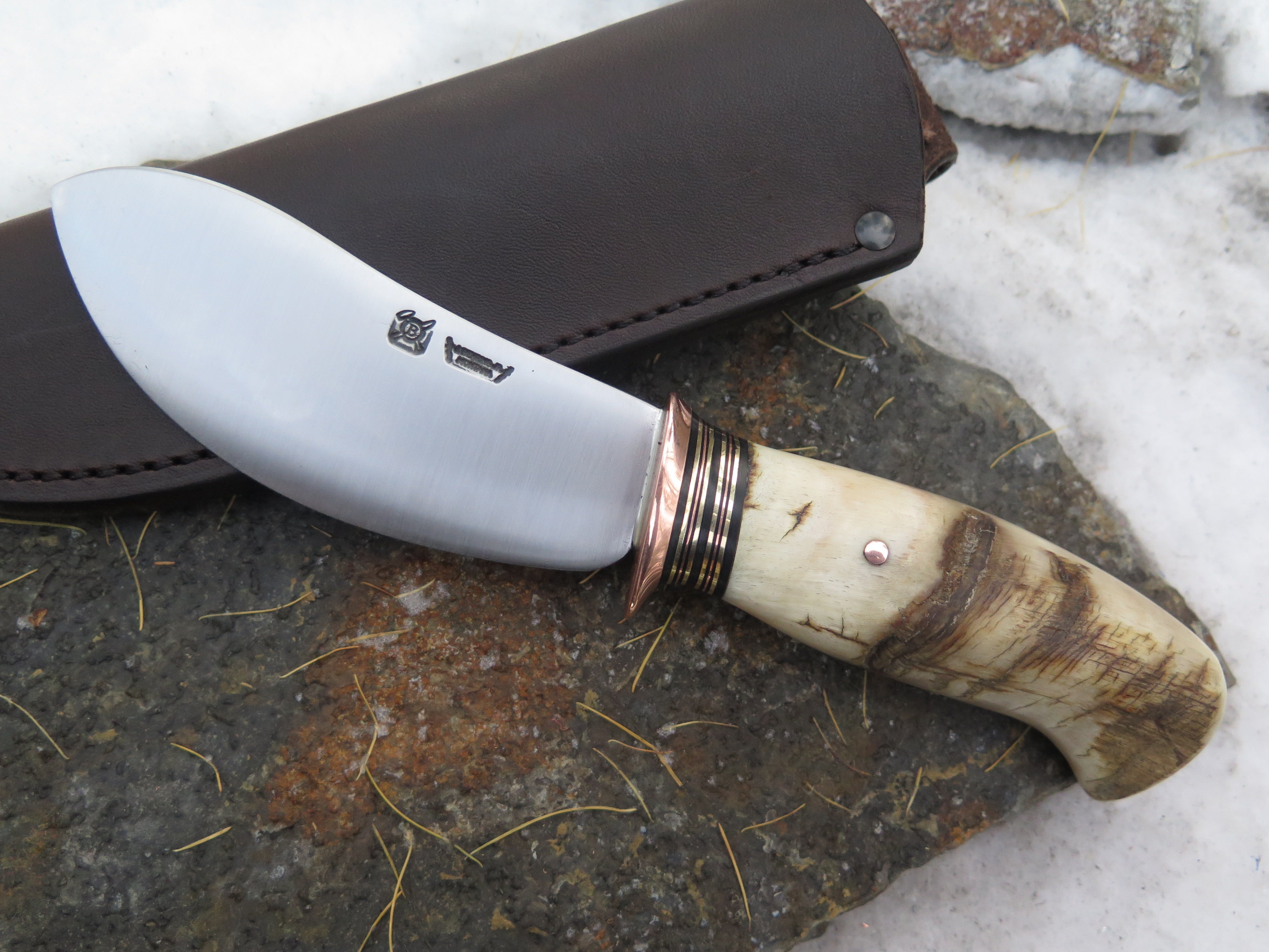 This remarkable Nessmuk from Behring Made© is hand forged from 3/16" thick high carbon 01 tool steel and it measures 4 3/4" from tip to guard with a razor sharp convex grind. The copper guard is soldered in place above black, brass and copper spacers in addition to the top shelf big sheep horn handle with a wonderful texture and color range. The overall length measures 9 3/8" and it comes in a full cover classic belt pouch sheath.