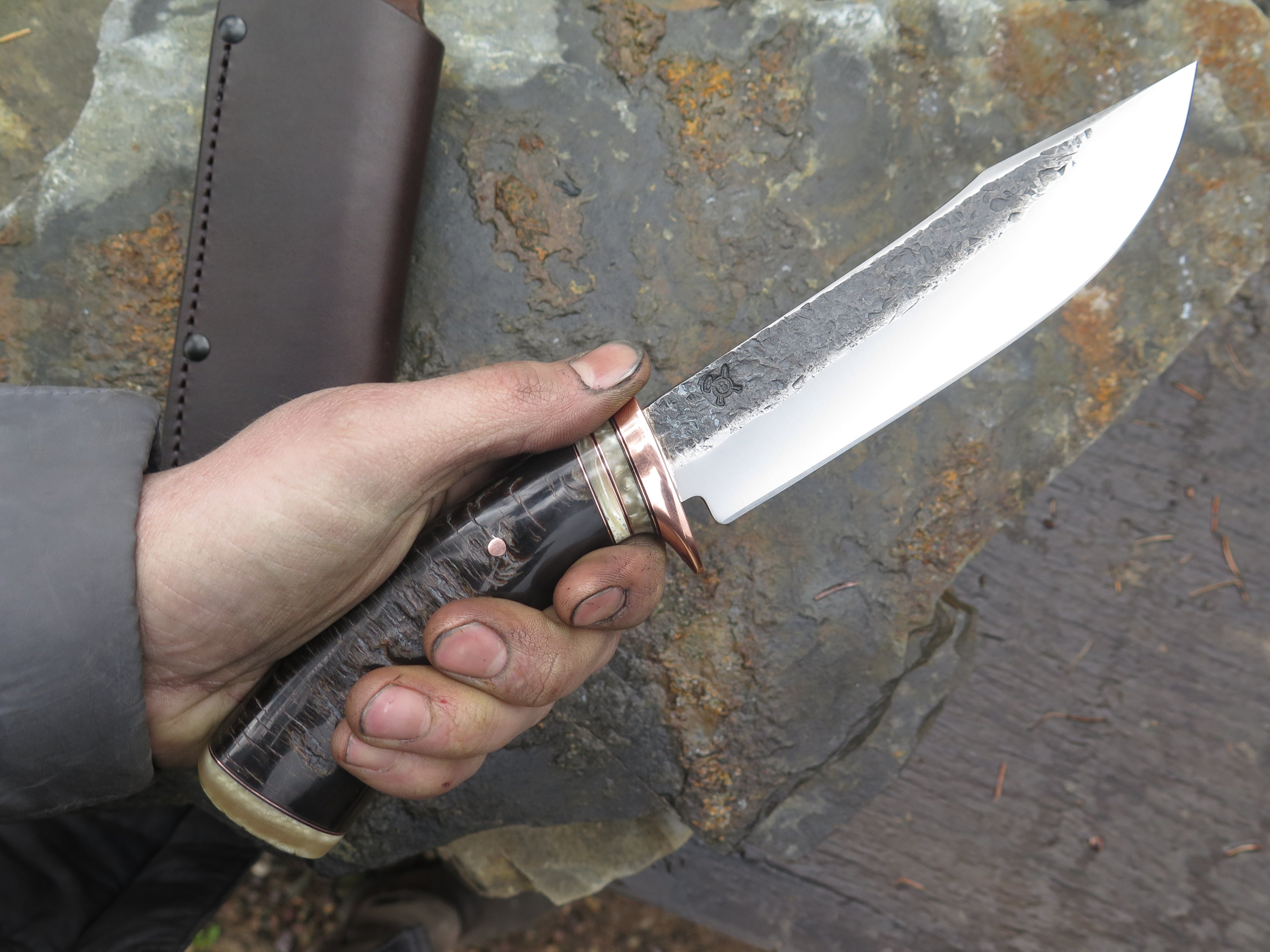 This new Clip Point from Behring Made© is hand forged from 13/64" thick high carbon 01 tool steel and it measures 6 1/4" from tip to guard with a razor sharp hollow grind and our hammermark finish. The copper guard is soldered in place above black fiber, copper and musk ox boss spacers with an African water buffalo horn that's pinned with copper and capped with musk ox boss as well. The overall length measures 11" and it comes in a classic leather belt pouch sheath.