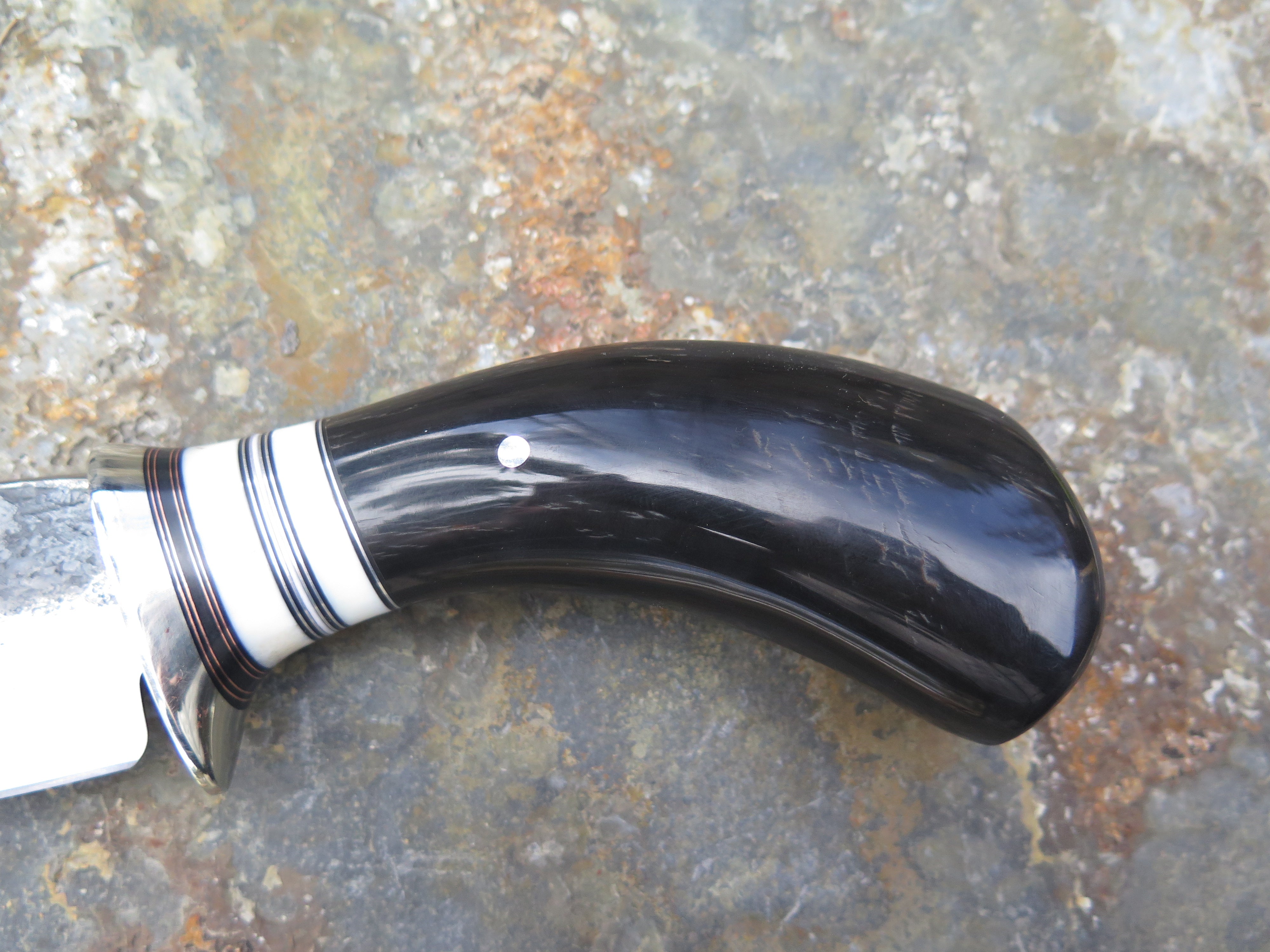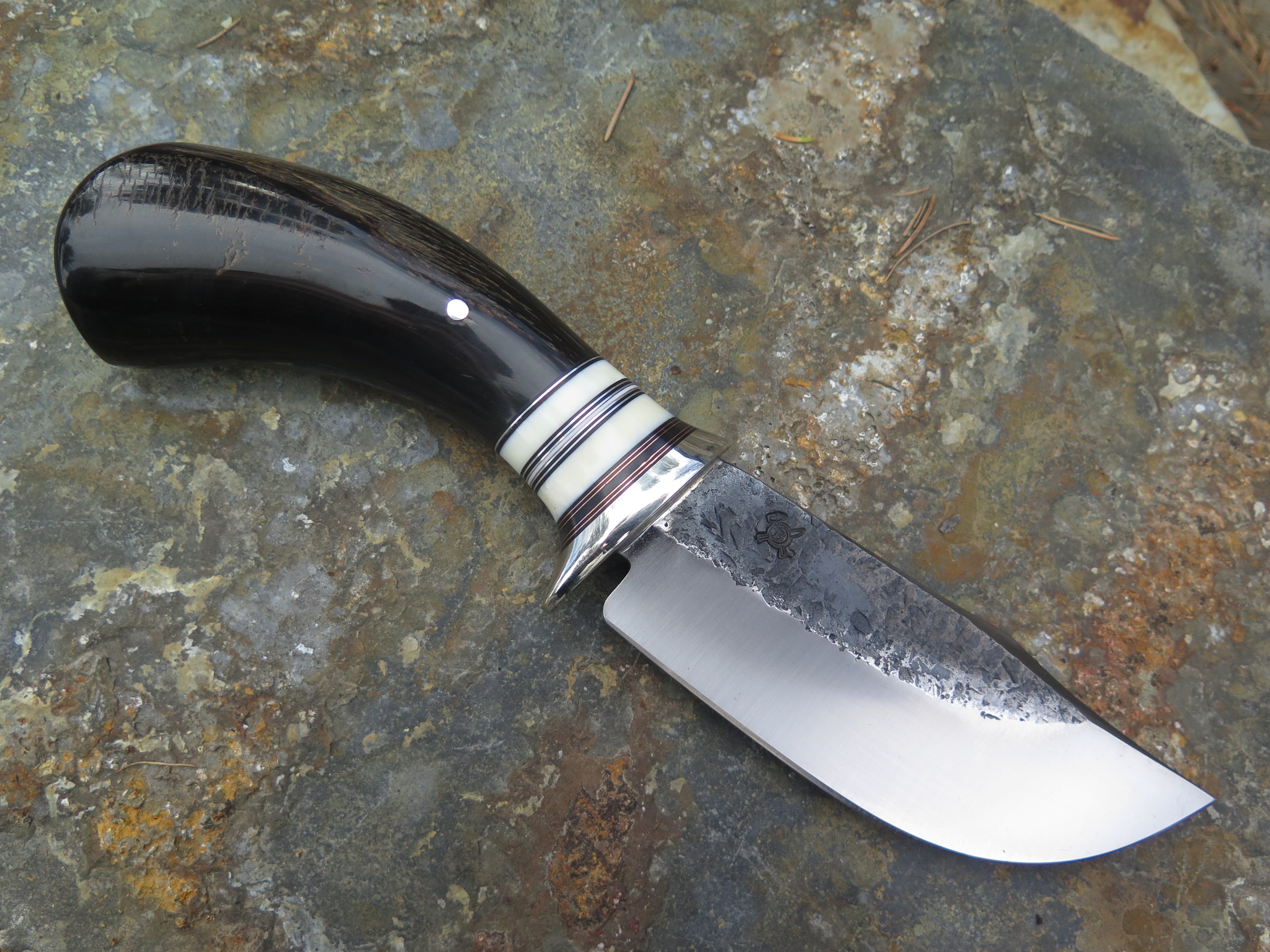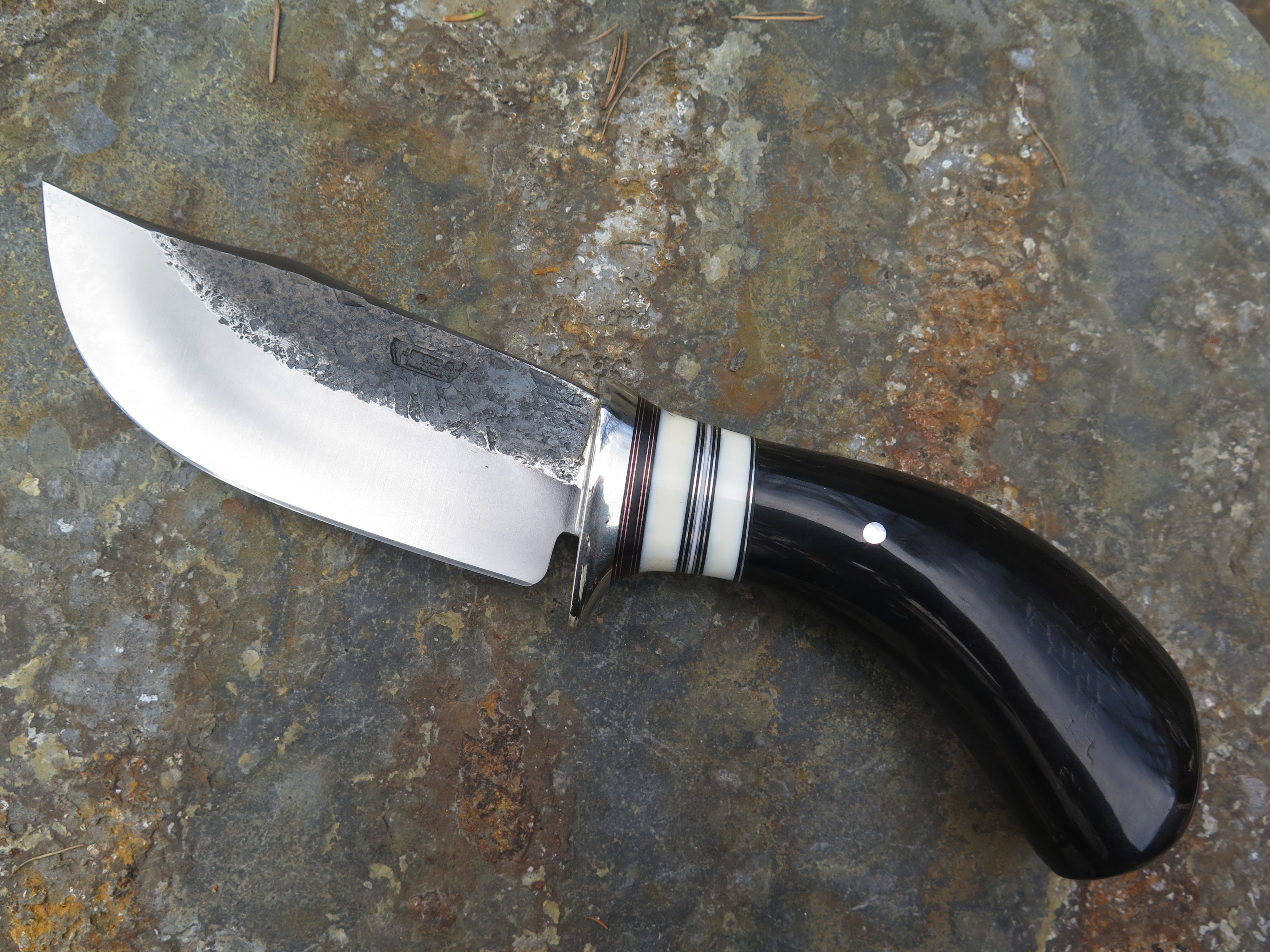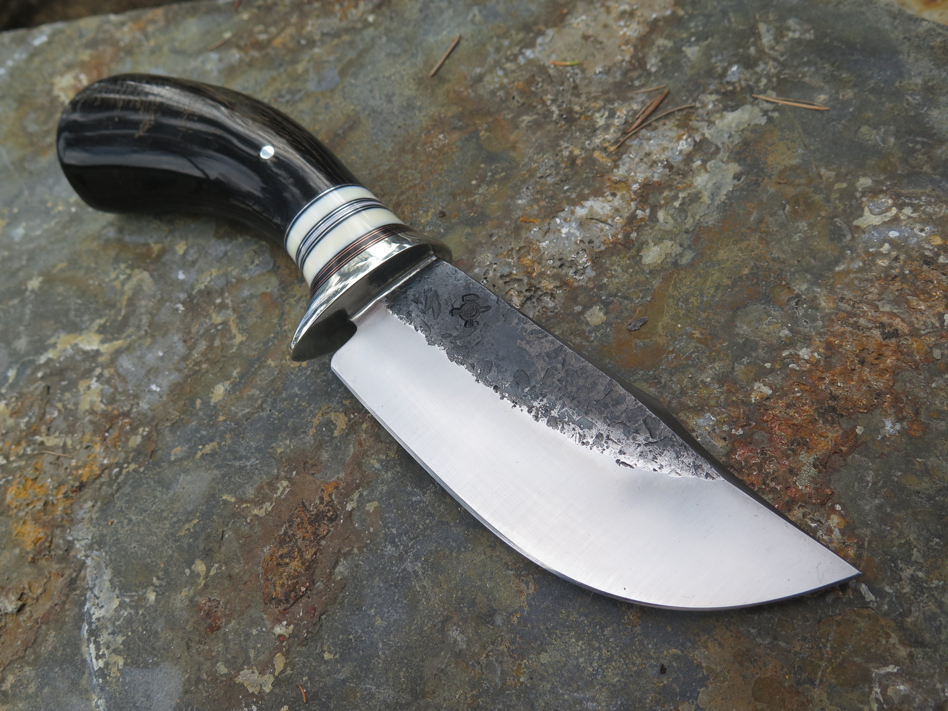 This beautiful new Clip Point from Behring Made© is hand forged from 3/16" thick high carbon 01 tool steel and it measures 4 1/2" from tip to guard with a razor sharp hollow grind and our hammermark finish. The copper guard is soldered in place above black, white, copper, aluminum and two fossil walrus ivory spacers which give a nice contrast against the buffalo horn handle that's pinned through the tang with aluminum. The overall length measures 9 1/8" and we're sending this one out to Rowe's Leather for a perfect fitting custom sheath.