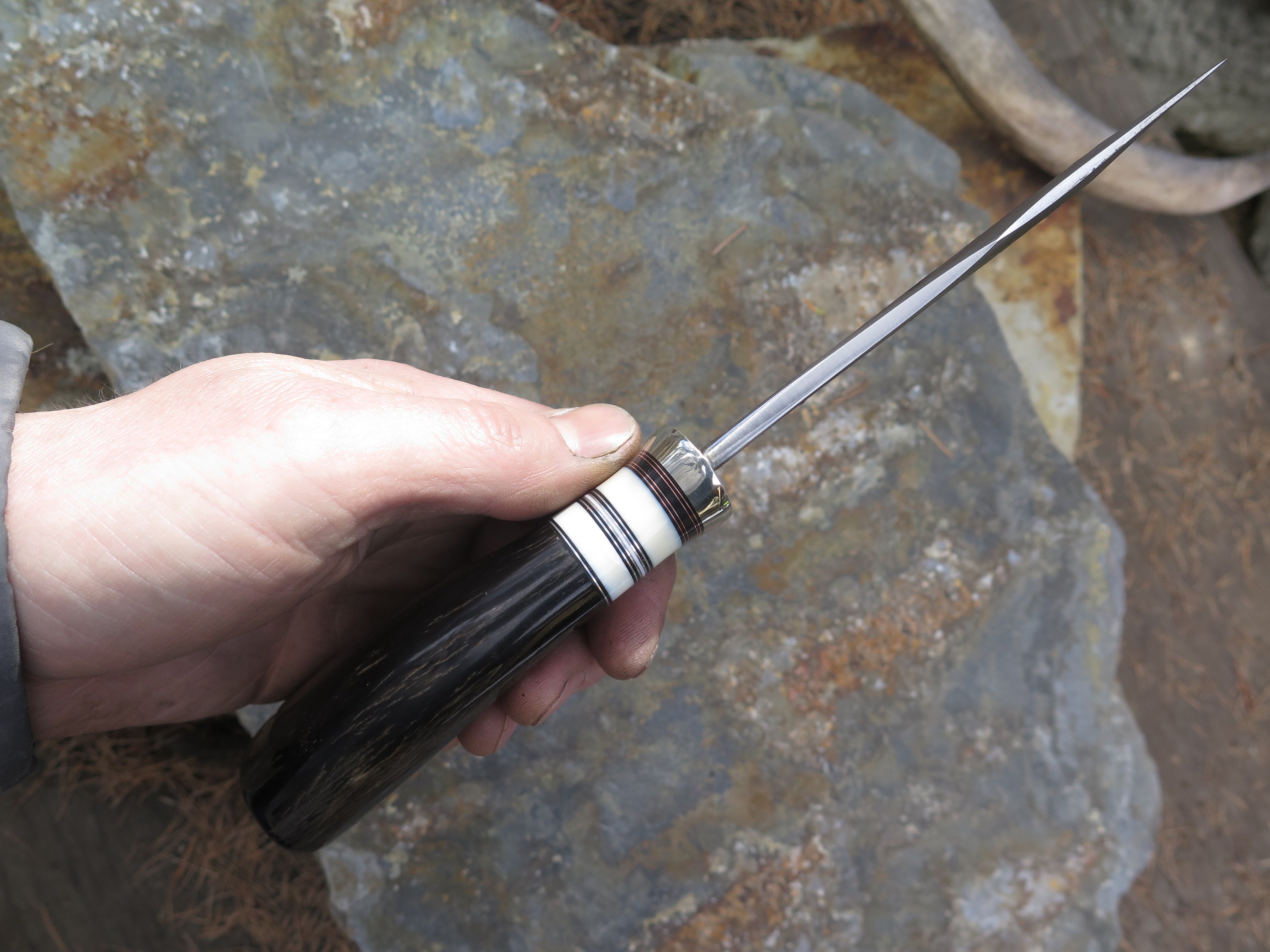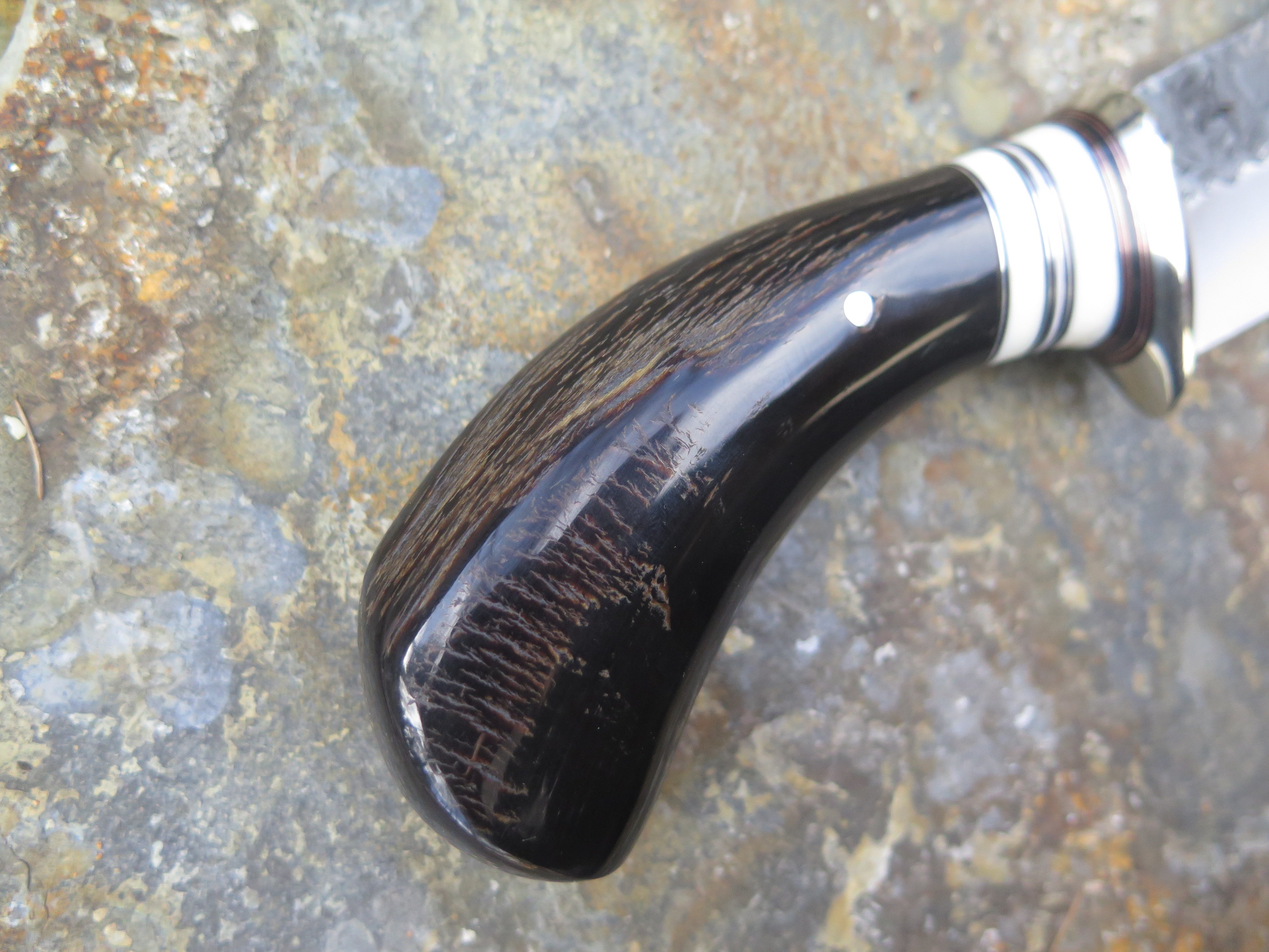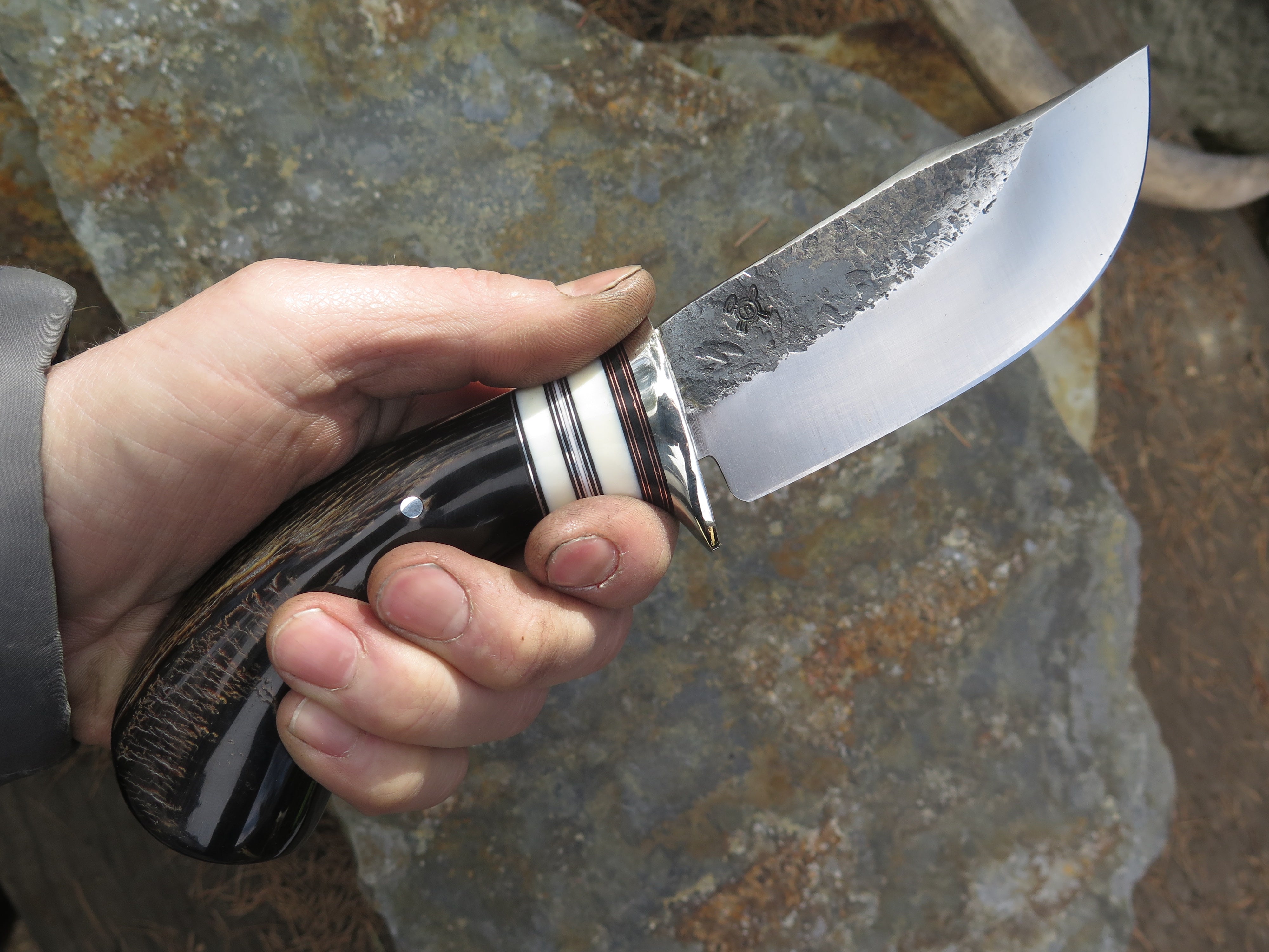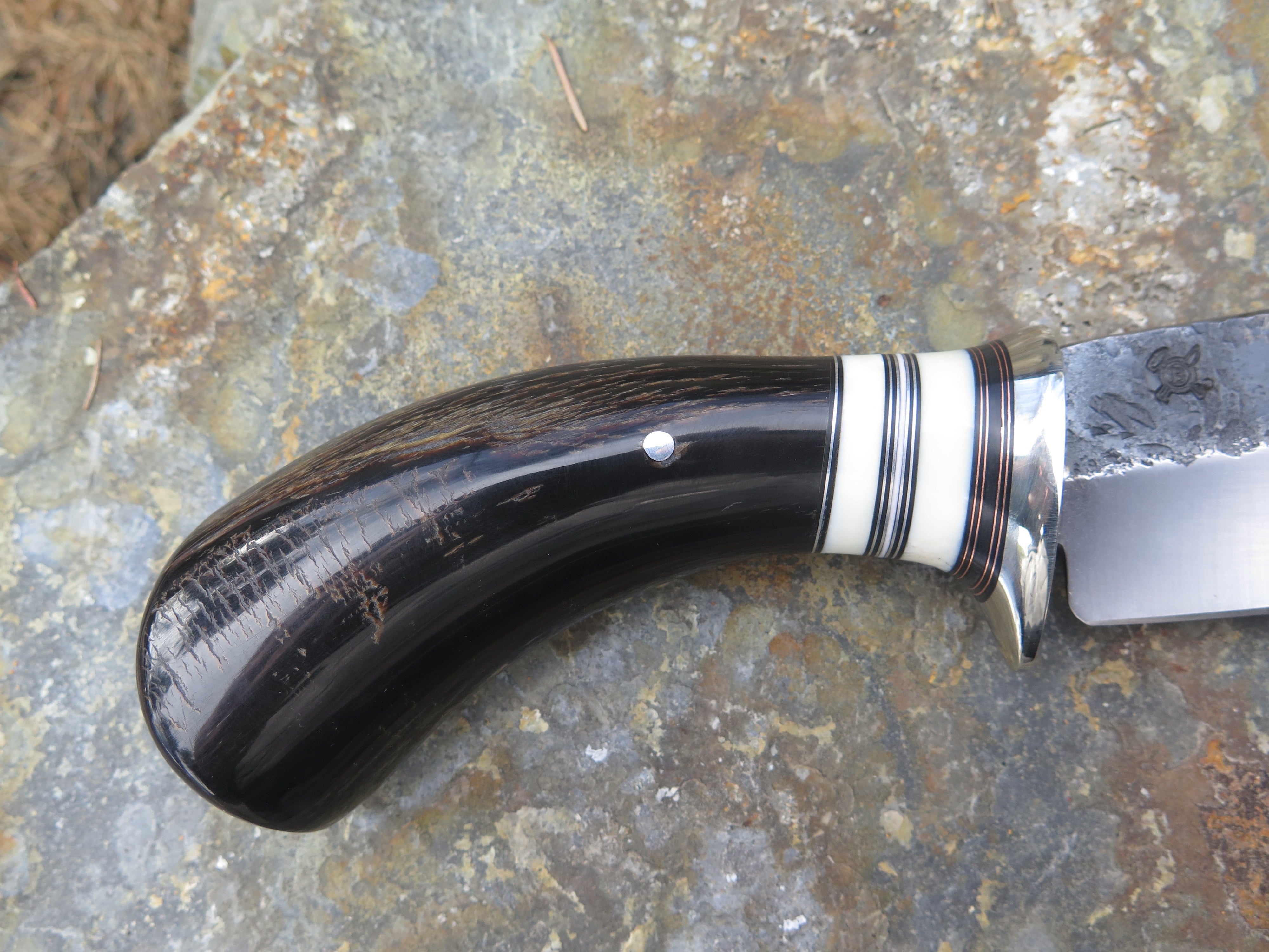 This beautiful new Clip Point from Behring Made© is hand forged from 3/16" thick high carbon 01 tool steel and it measures 4 1/2" from tip to guard with a razor sharp hollow grind and our hammermark finish. The copper guard is soldered in place above black, white, copper, aluminum and two fossil walrus ivory spacers which give a nice contrast against the buffalo horn handle that's pinned through the tang with aluminum. The overall length measures 9 1/8" and we're sending this one out to Rowe's Leather for a perfect fitting custom sheath.