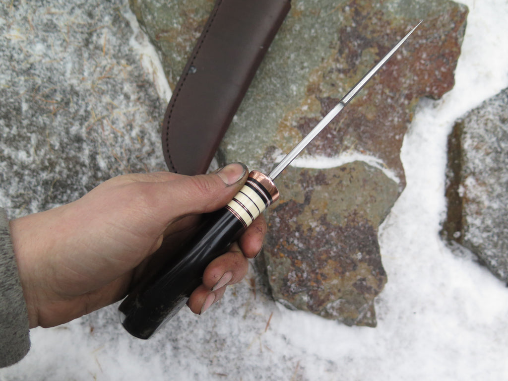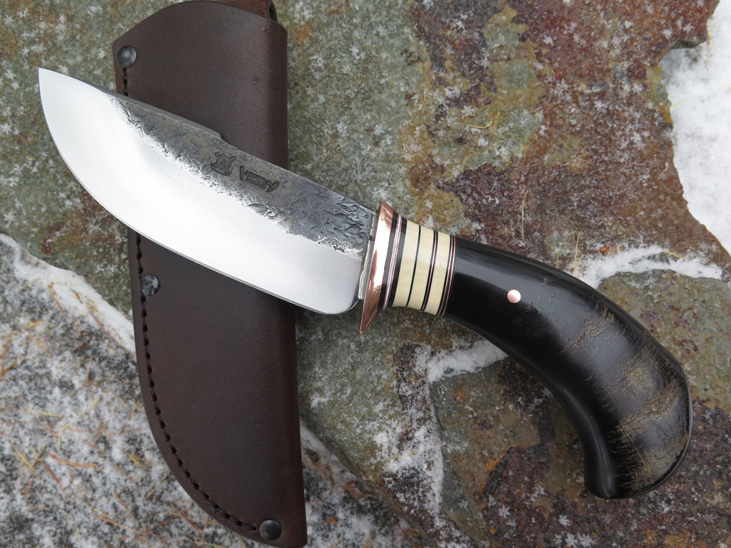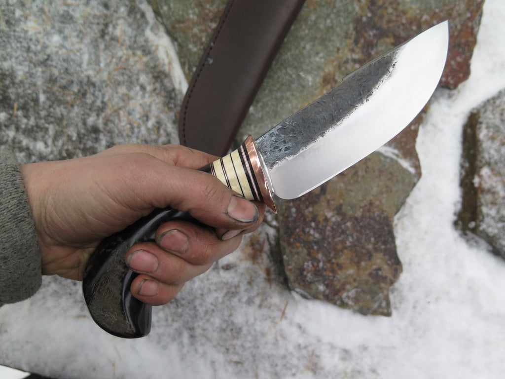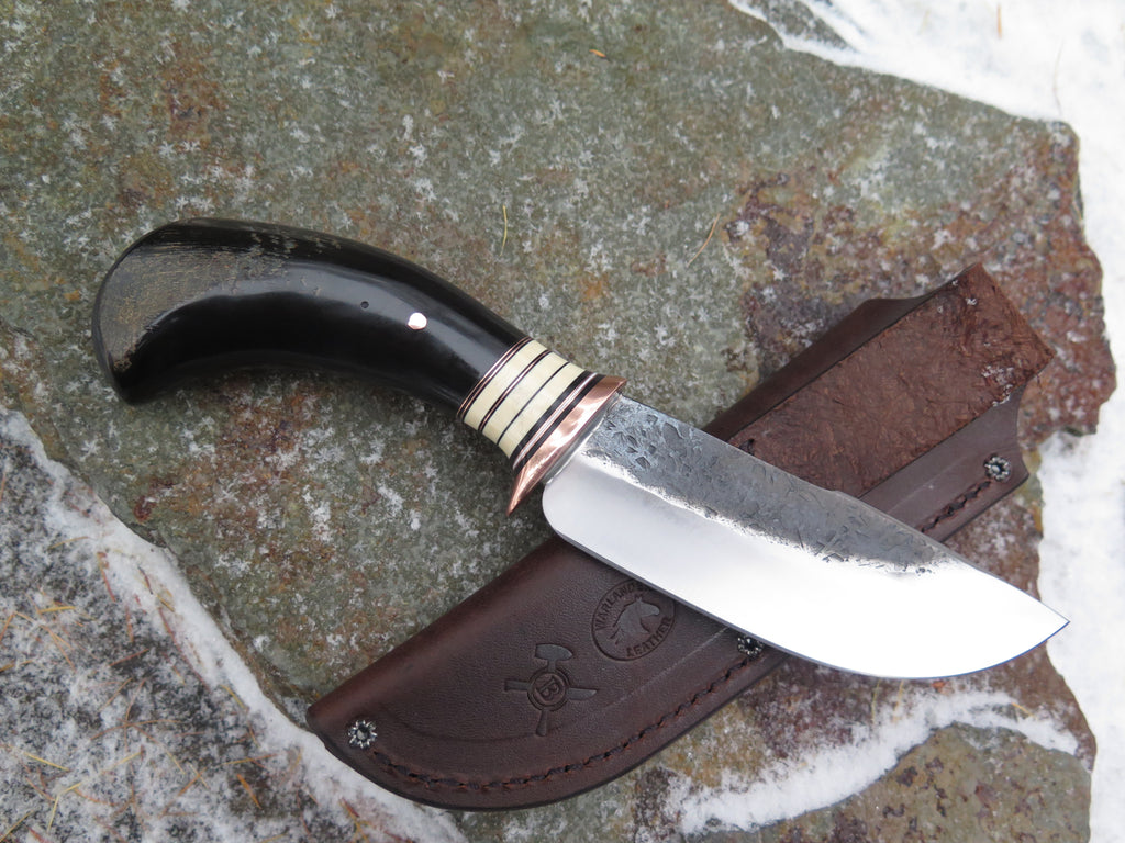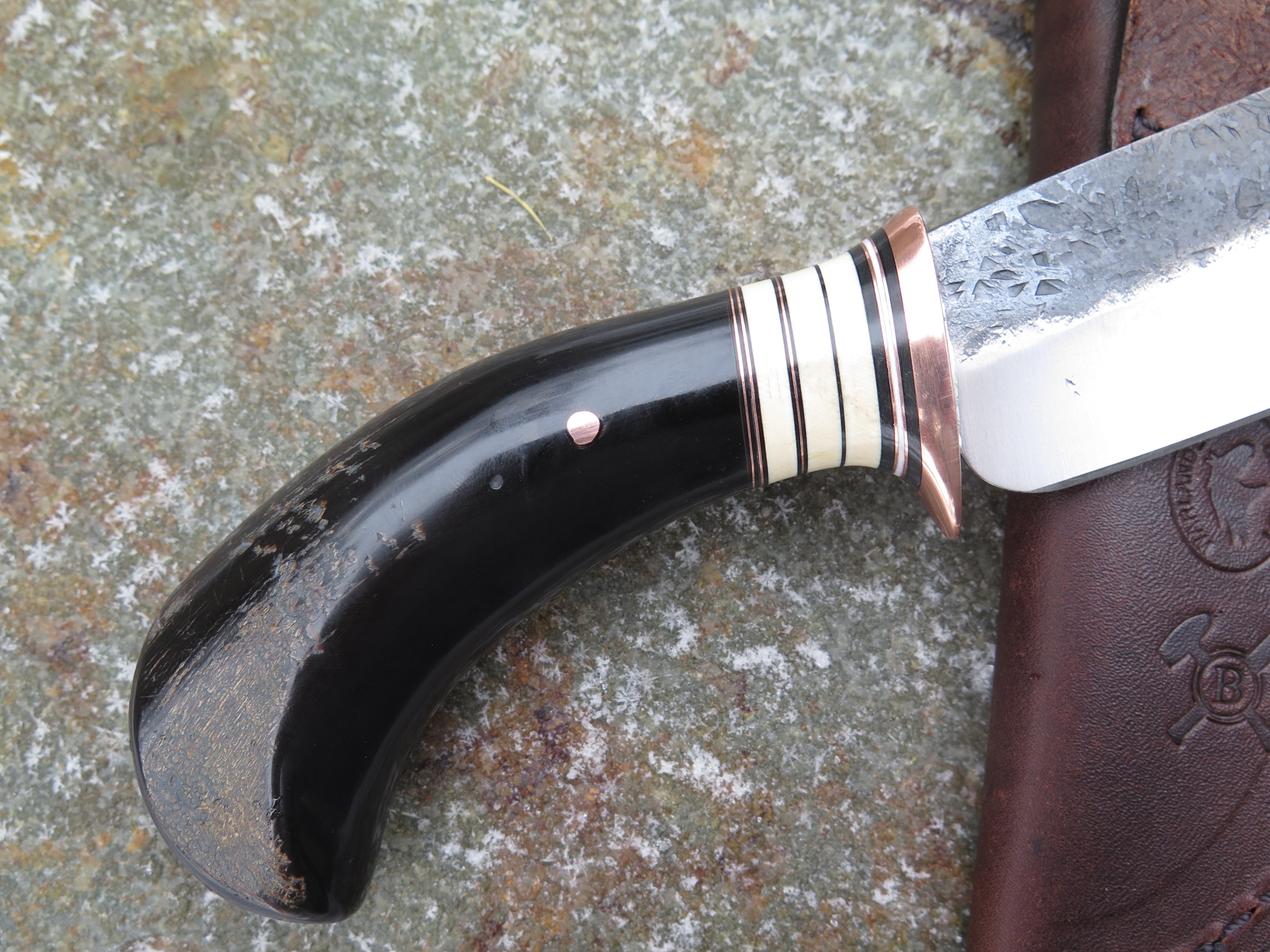 This bad ass new Woodcraft from Behring Made© is hand forged from 3/16" high carbon 01 tool steel and it measures 5" from tip to guard with a razor sharp hollow grind and our hammermark finish. The copper guard is soldered in place above black and white fiber, copper and mammoth spacers which top a buffalo horn handle that's pinned through the tang with copper. The overall length measures just under 10" and it comes in classic leather belt pouch.