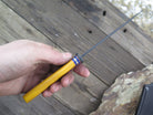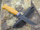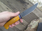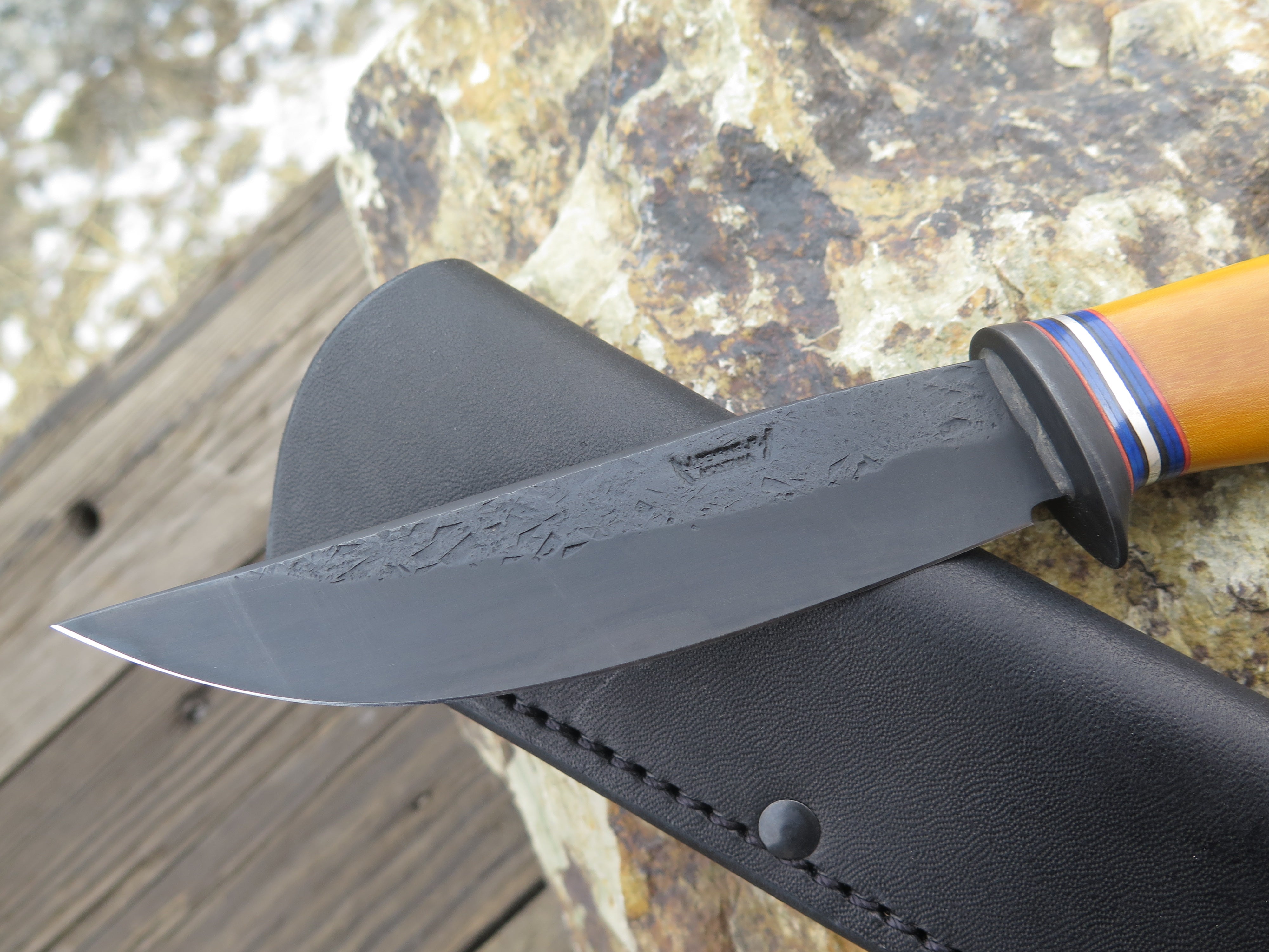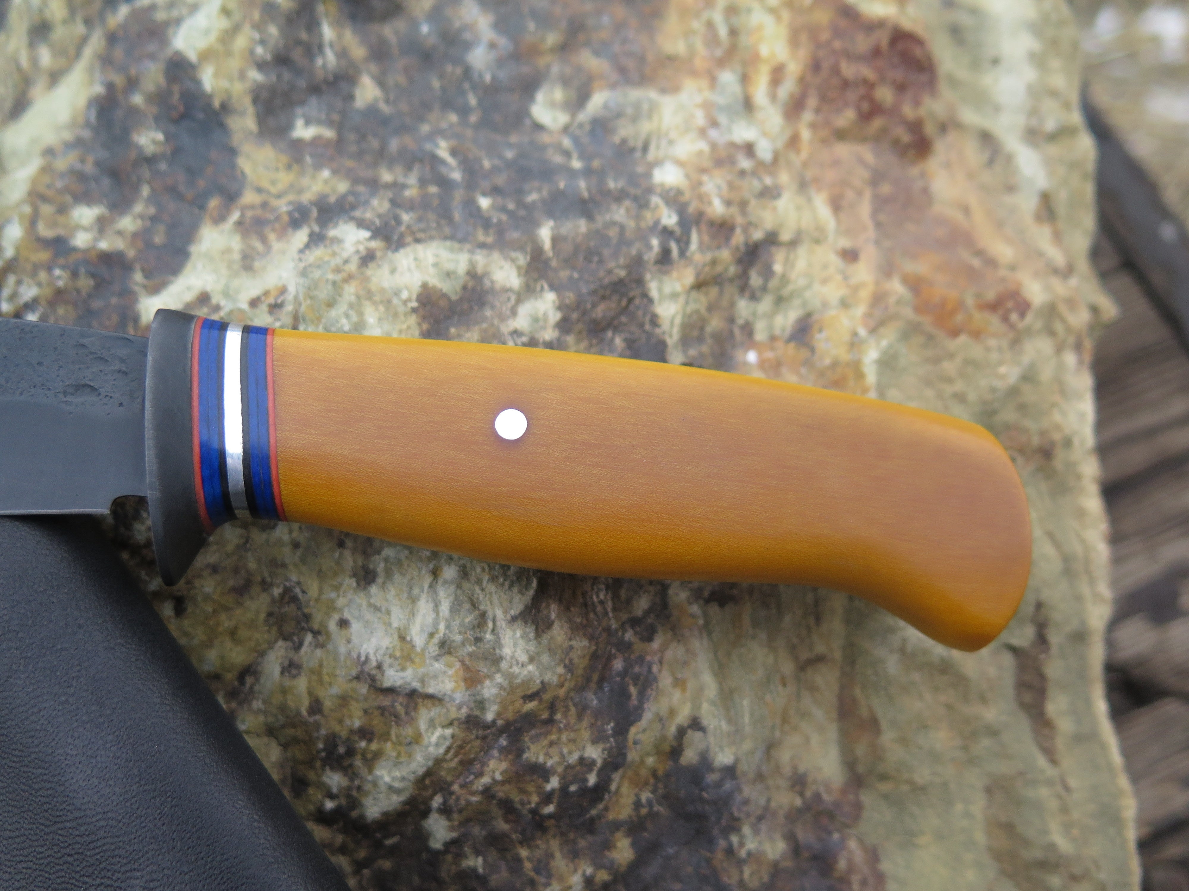 This new Trout & Bird from Behring Made© is a straight forward ultra user that excels in all things hunting, fishing, and steakhouse show-boatin'. The blade is hand forged from 1/8" thick high carbon 01 tool steel and measures 4 3/4" from tip to guard with a razor sharp hollow grind and our forced patina blued finish. The blued steel guard is soldered in place above black, maroon and blue fiber with aluminum spacers atop a classic westinghouse yellow micarta handle that's pinned through the tang with aluminum. Overall length measures 9" and it comes in a Warlander Leather pouch sheath.