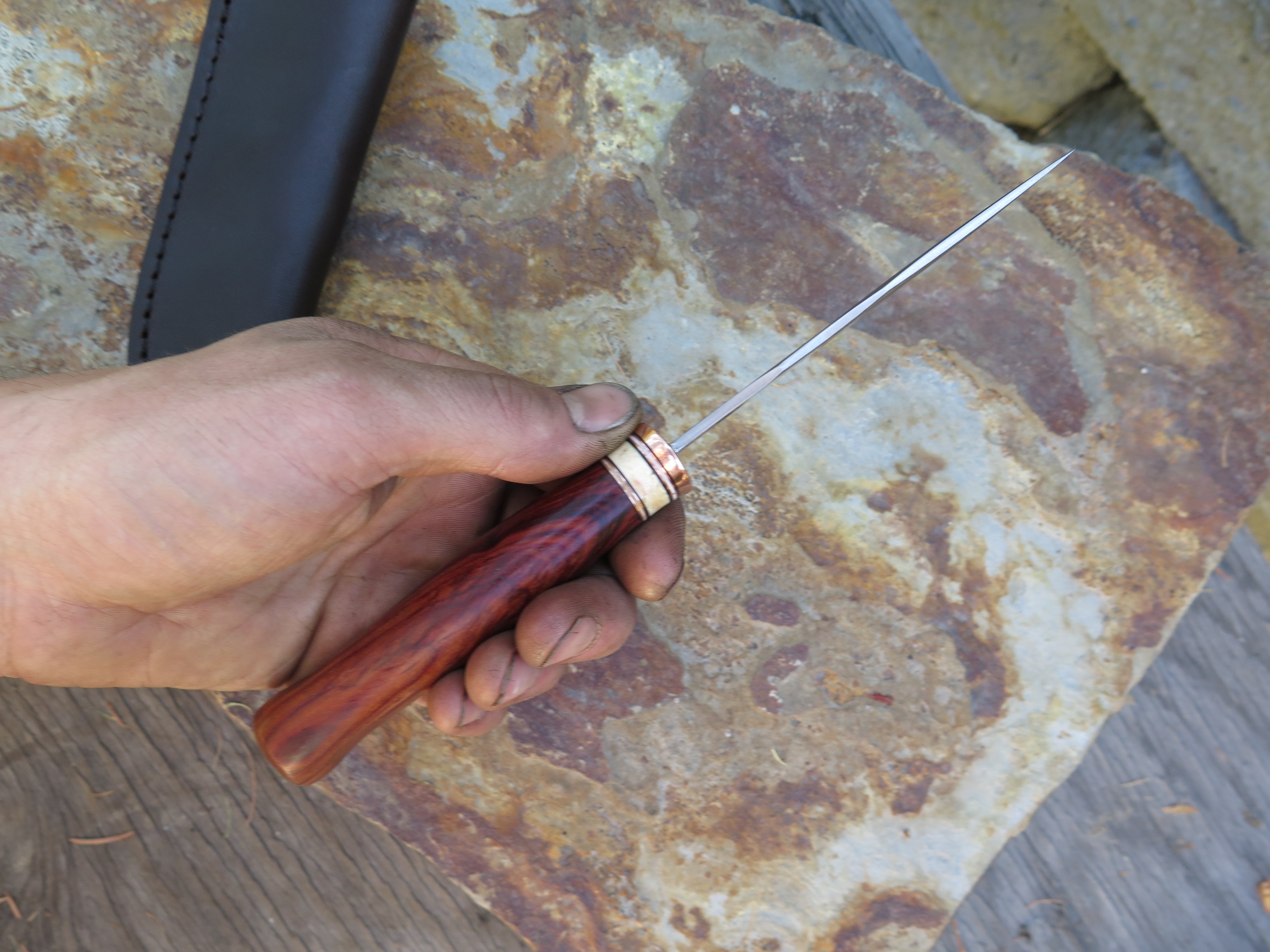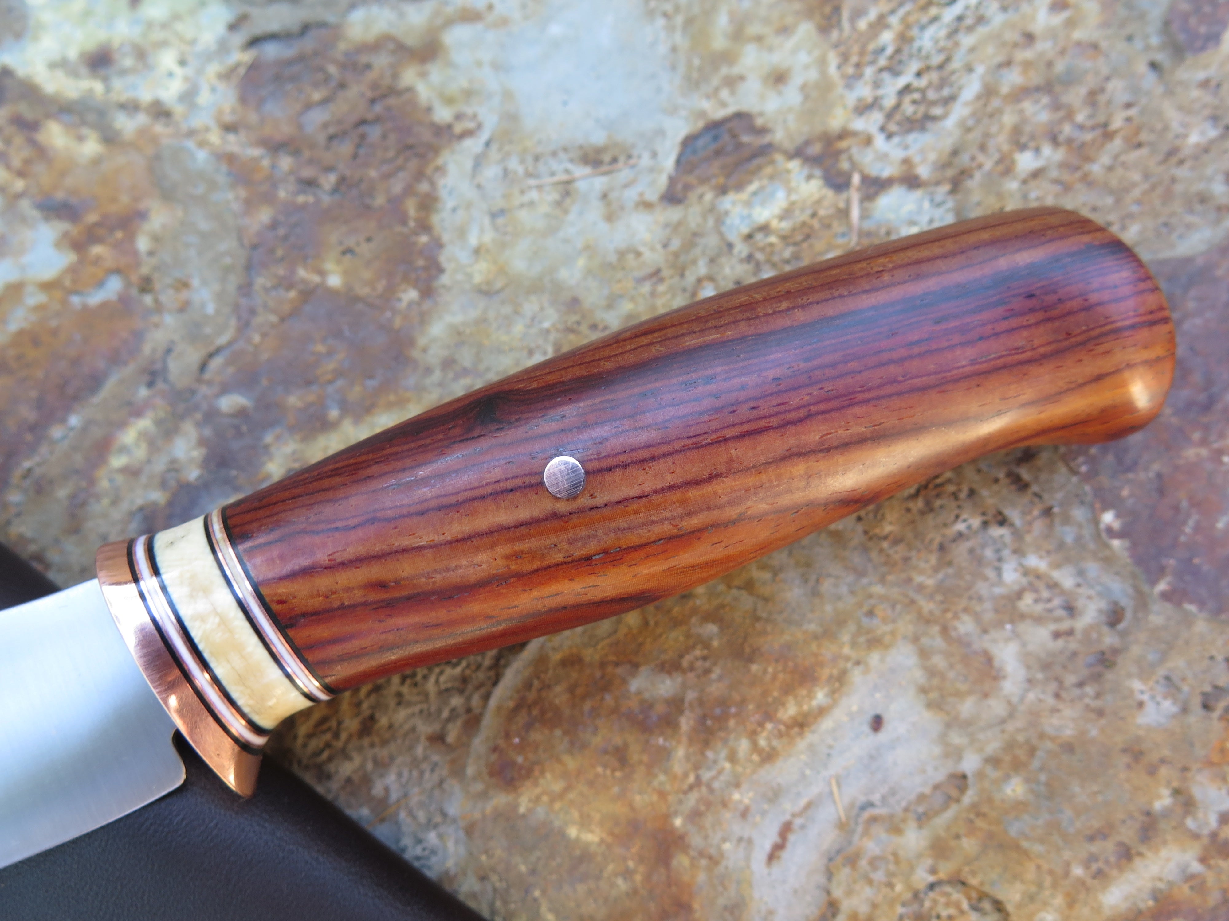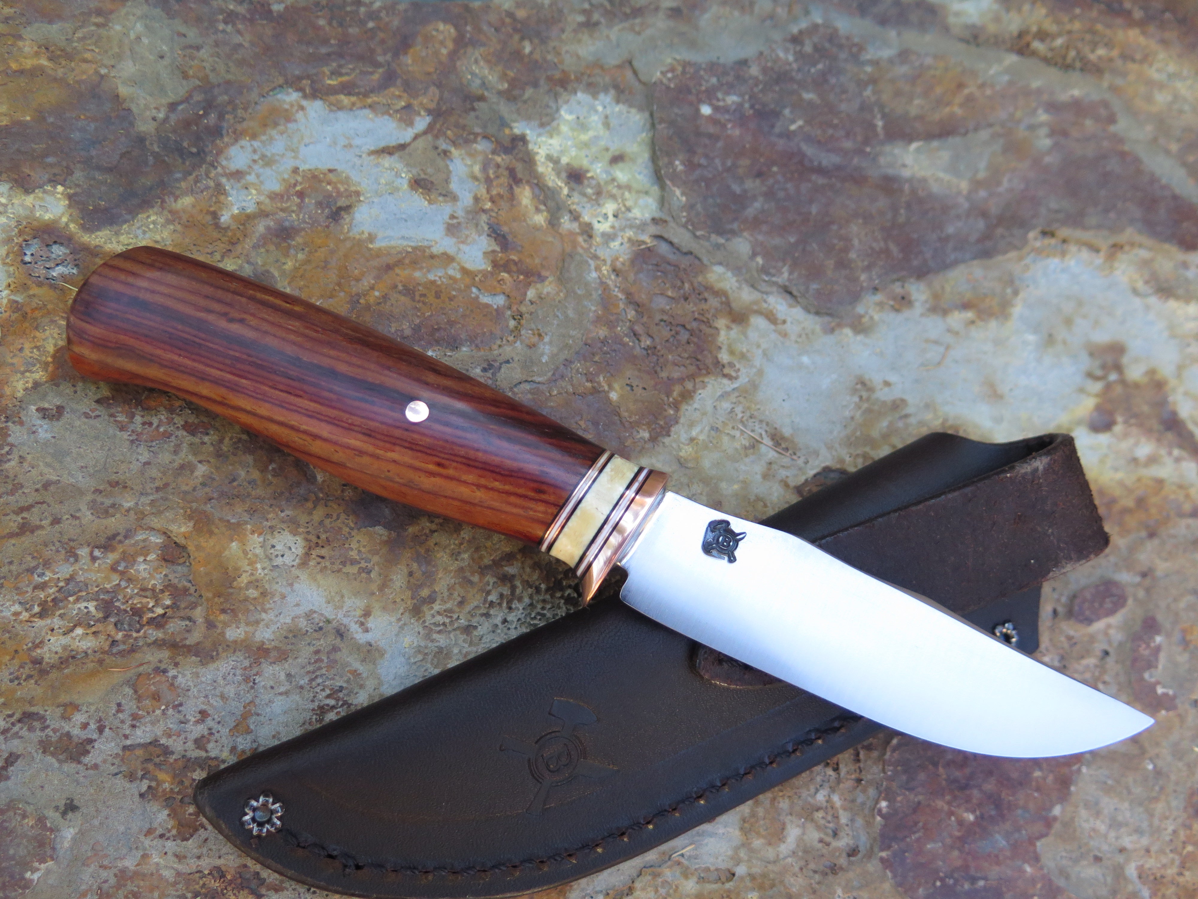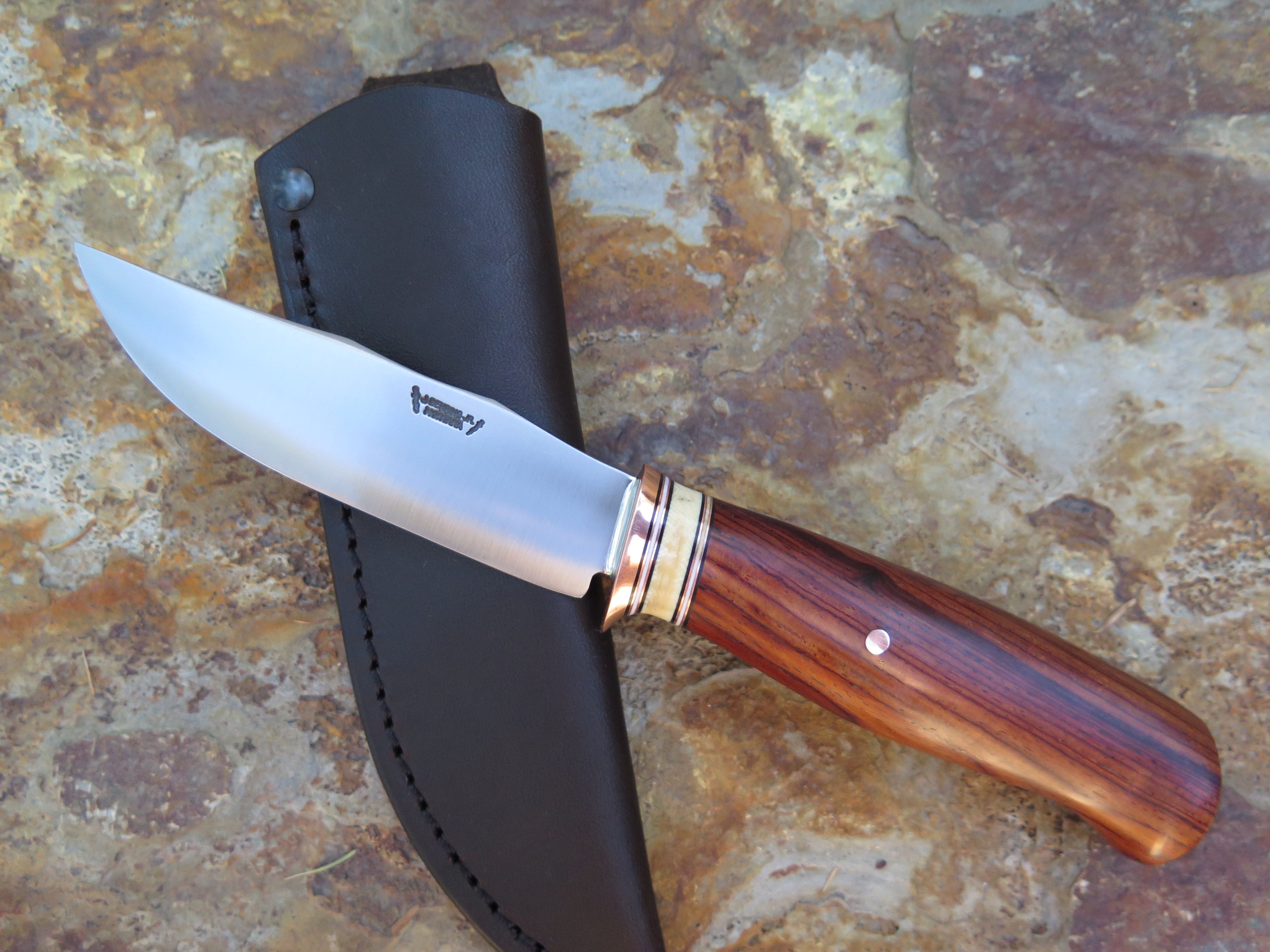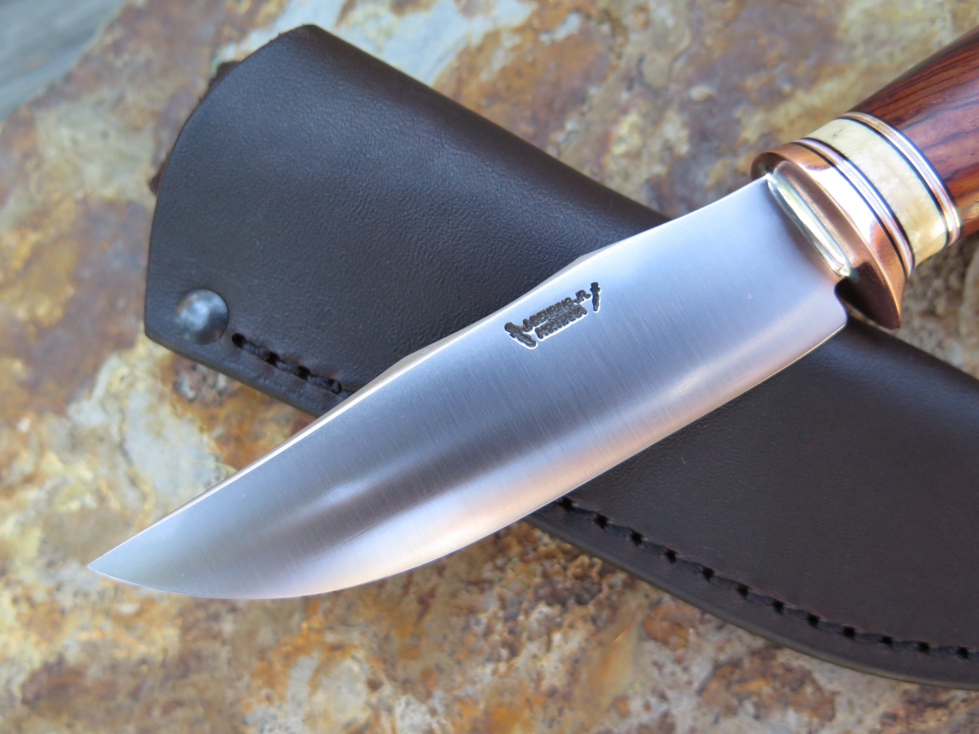 This beautiful new Scagel Tribute blade shape from Behring Made© is hand forged from 1/8" thick high carbon 01 tool steel and it measures 4" from tip to guard with a razor sharp convex grind. The copper guard is soldered in place above black and white fiber, copper and ancient mammoth ivory spacers. The handle is premium cocobolo wood that is pinned through the tang with copper, and overall it measures 8 3/8". This one comes in a classic leather belt pouch sheath and is guaranteed field ready!
