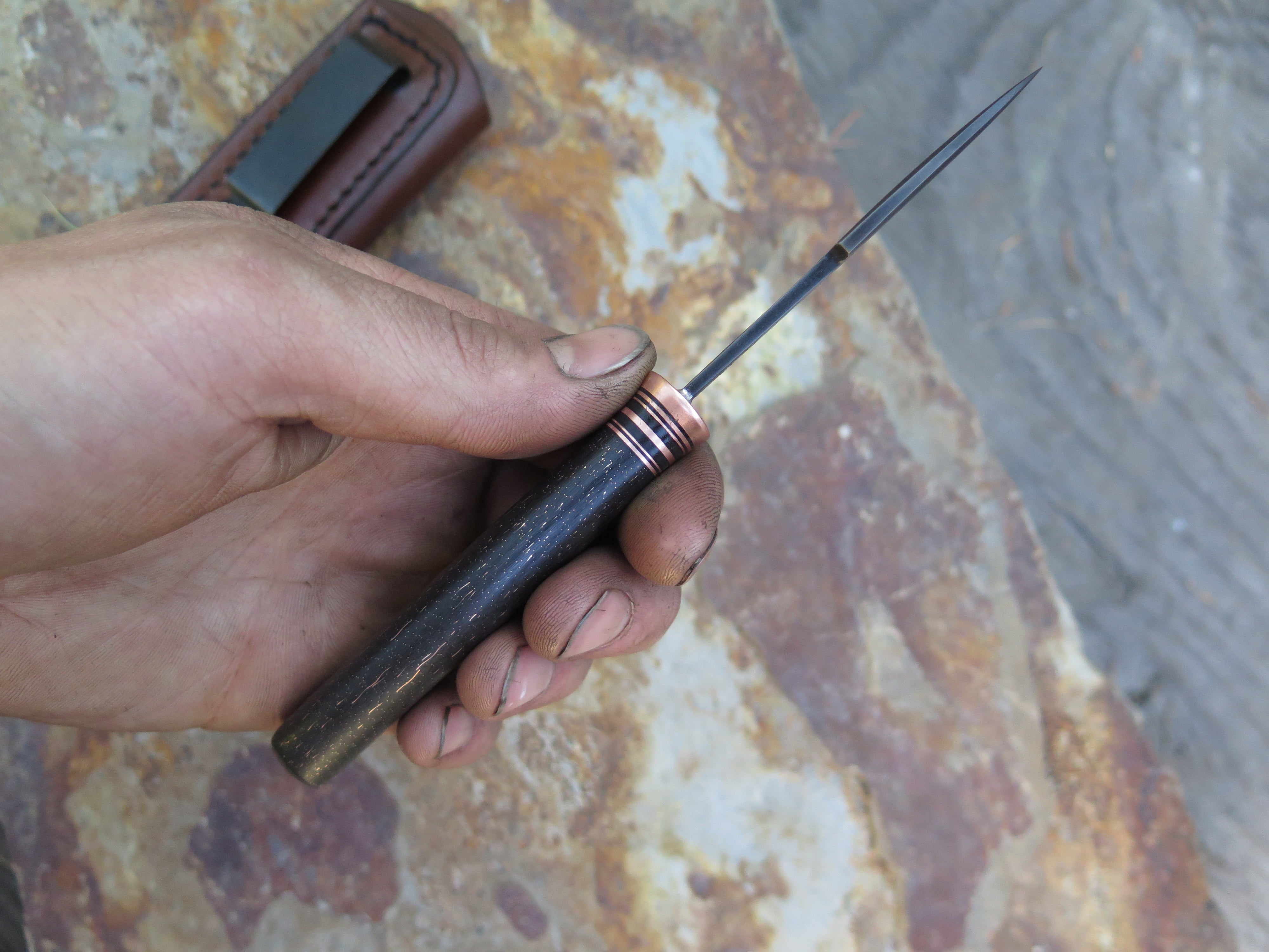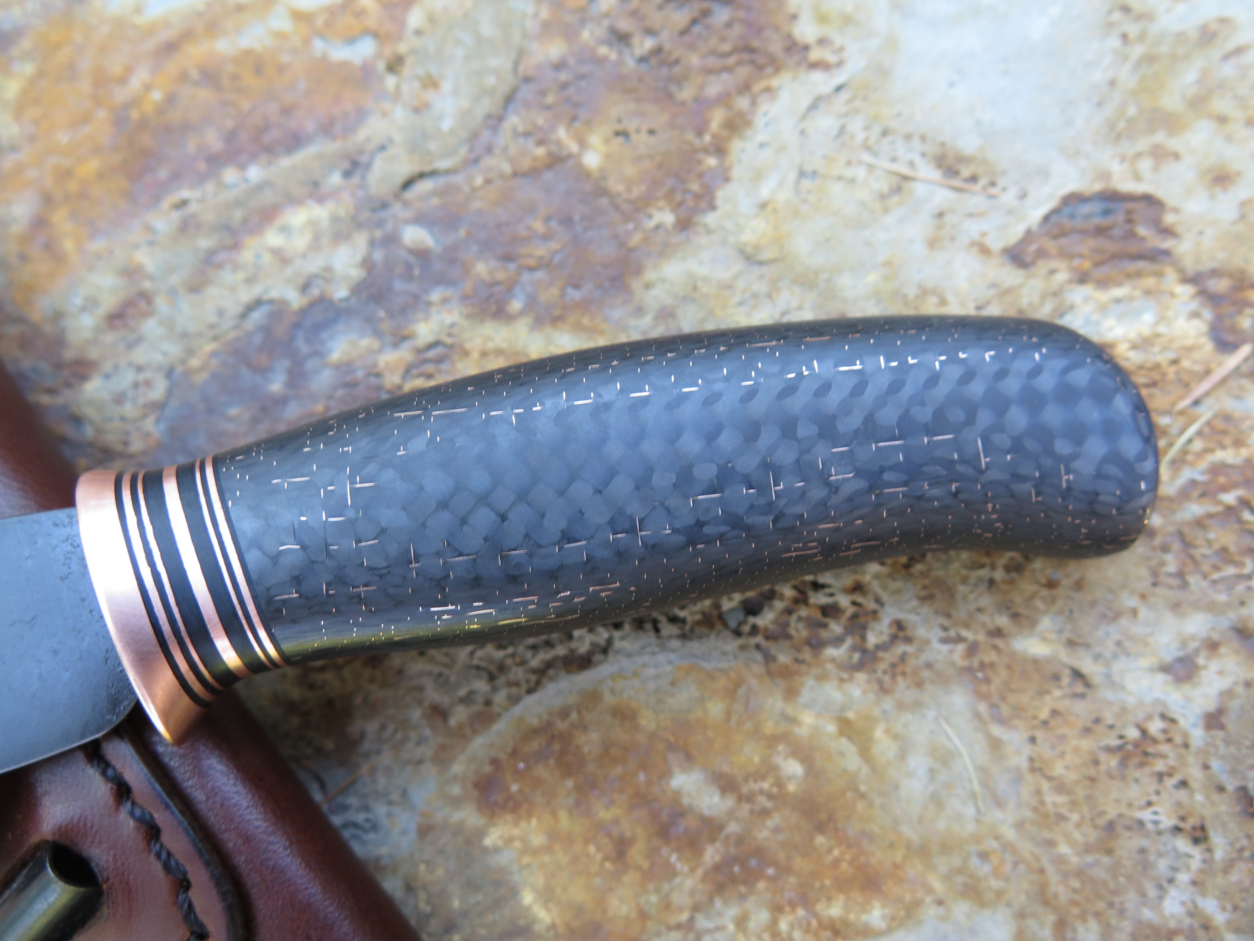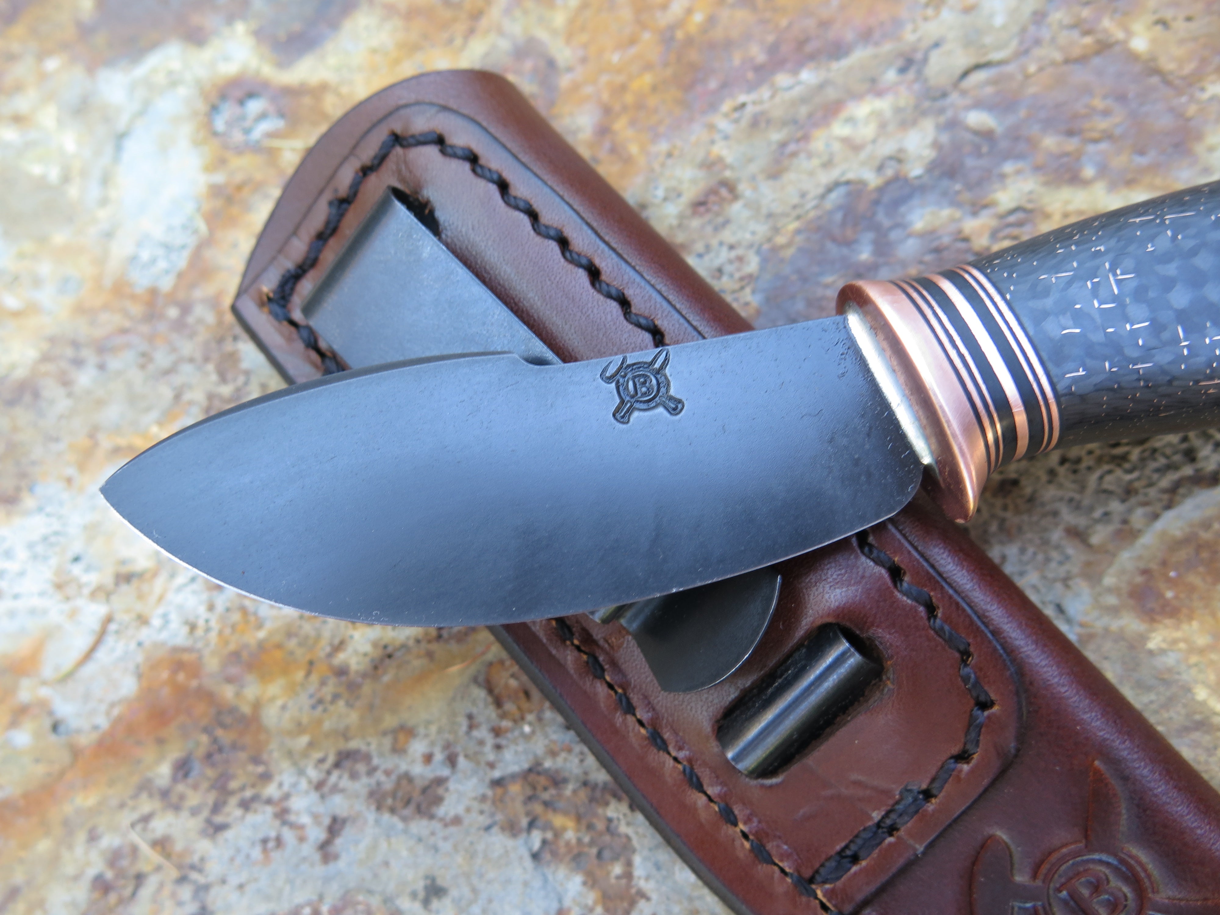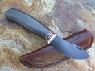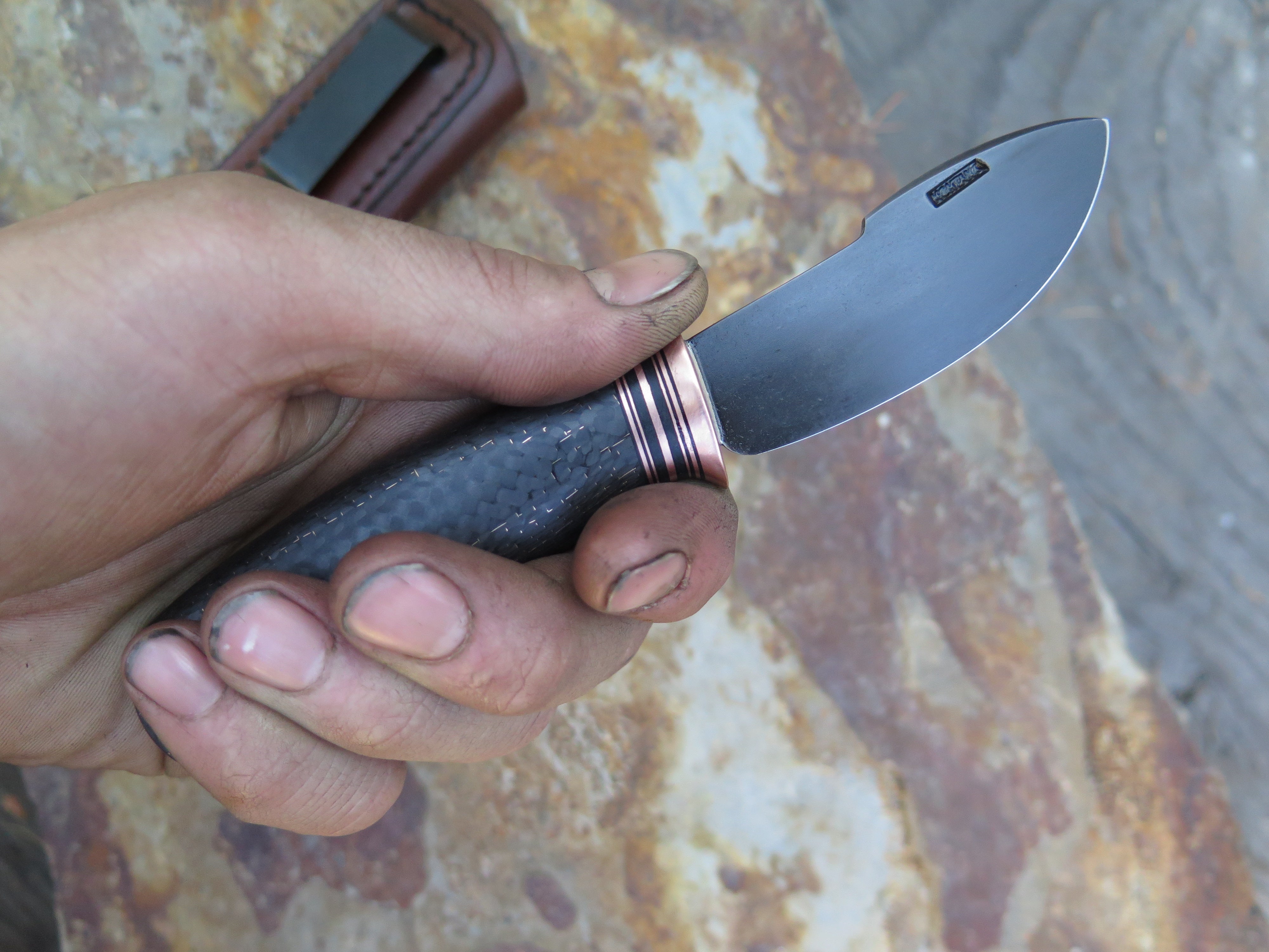 This beautiful new Canoe Knife from Behring Made© is hand forged from 1/8" thick high carbon 01 tool steel and it measures 2 3/4" from tip to guard with a razor sharp convex and a forced patina blued finish. The copper guard is soldered in place above black fiber and copper spacers with a copperweave carbon fiber handle. The overall length measures 6 3/8" and this one comes in a custom tooled spring clip pocket sheath designed for the inside the pocket. *Archive listing, please allow 4-8 weeks for delivery