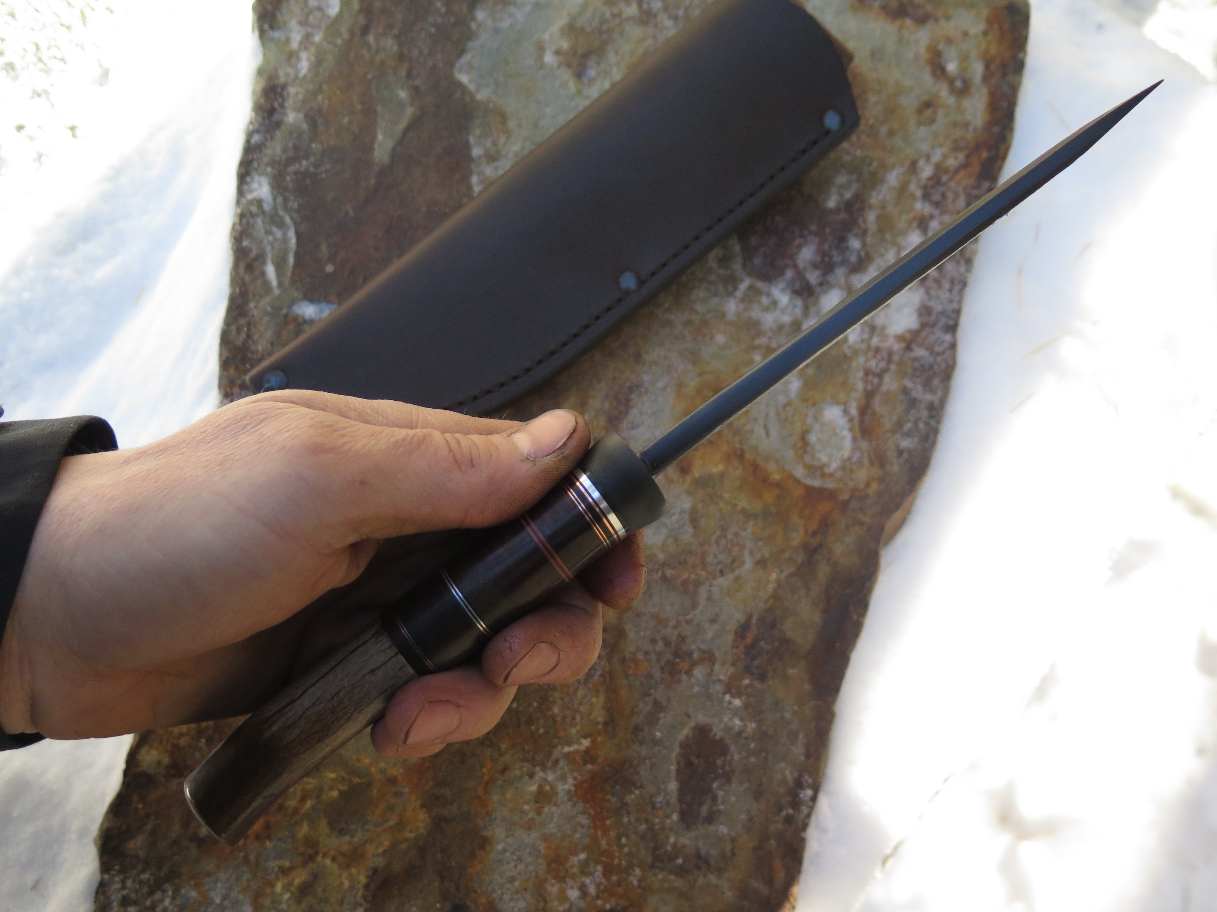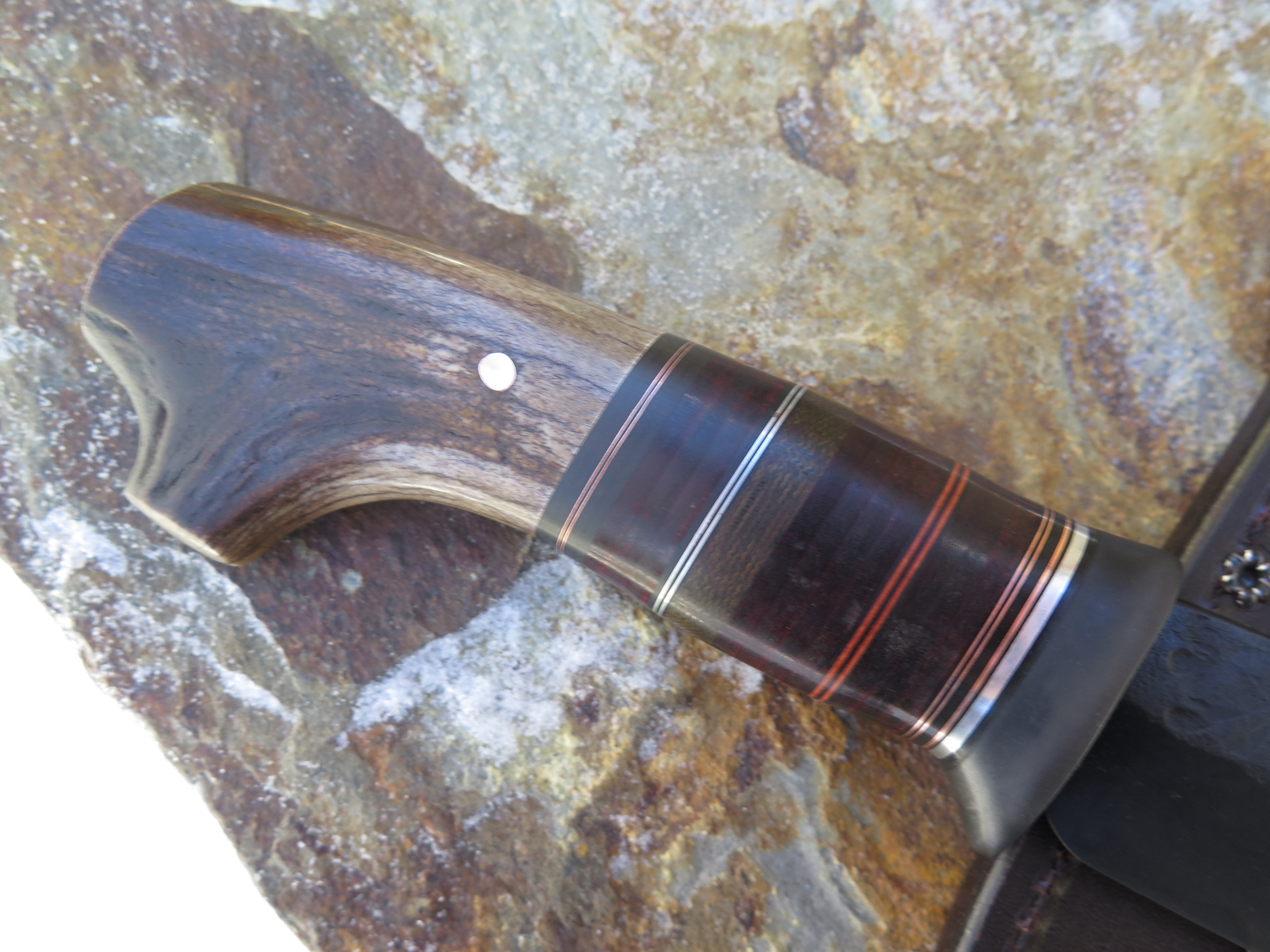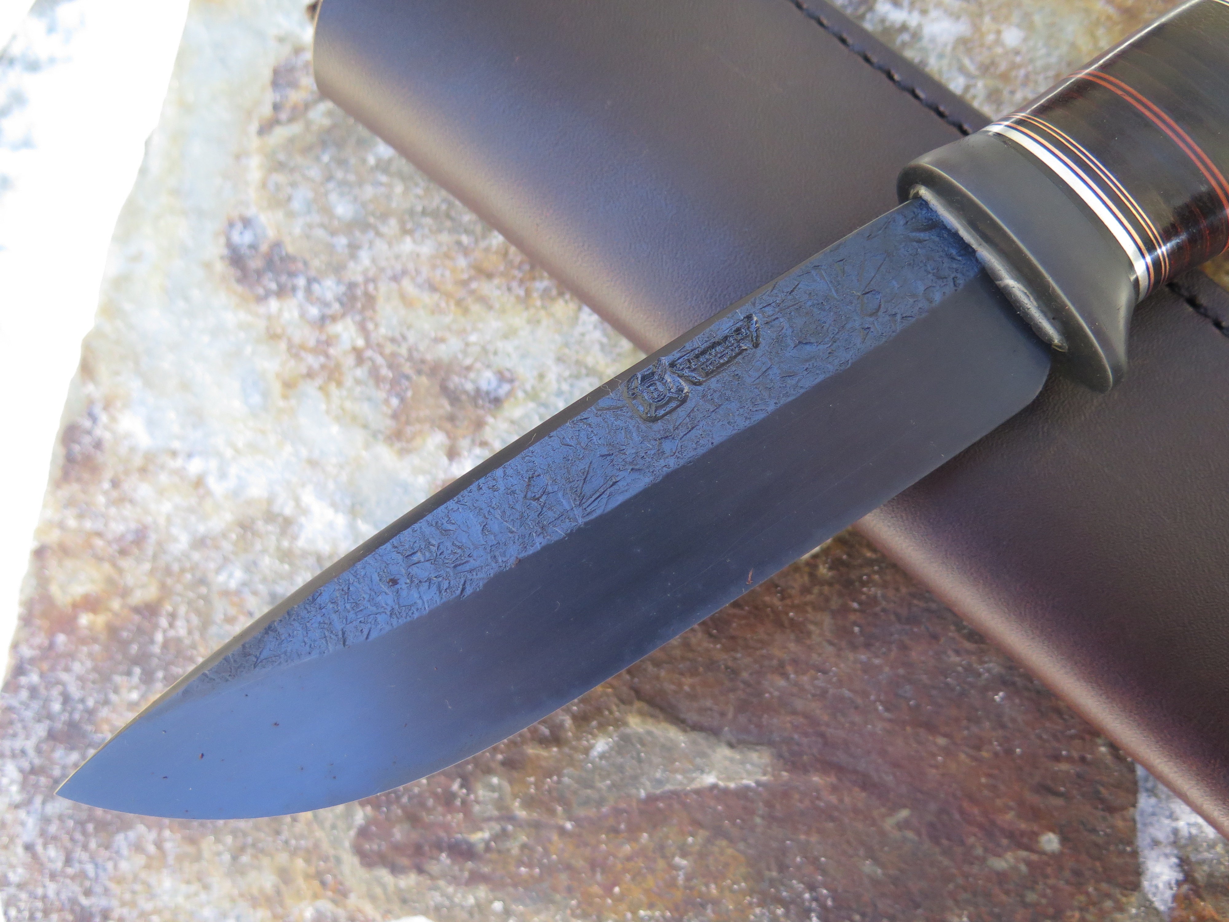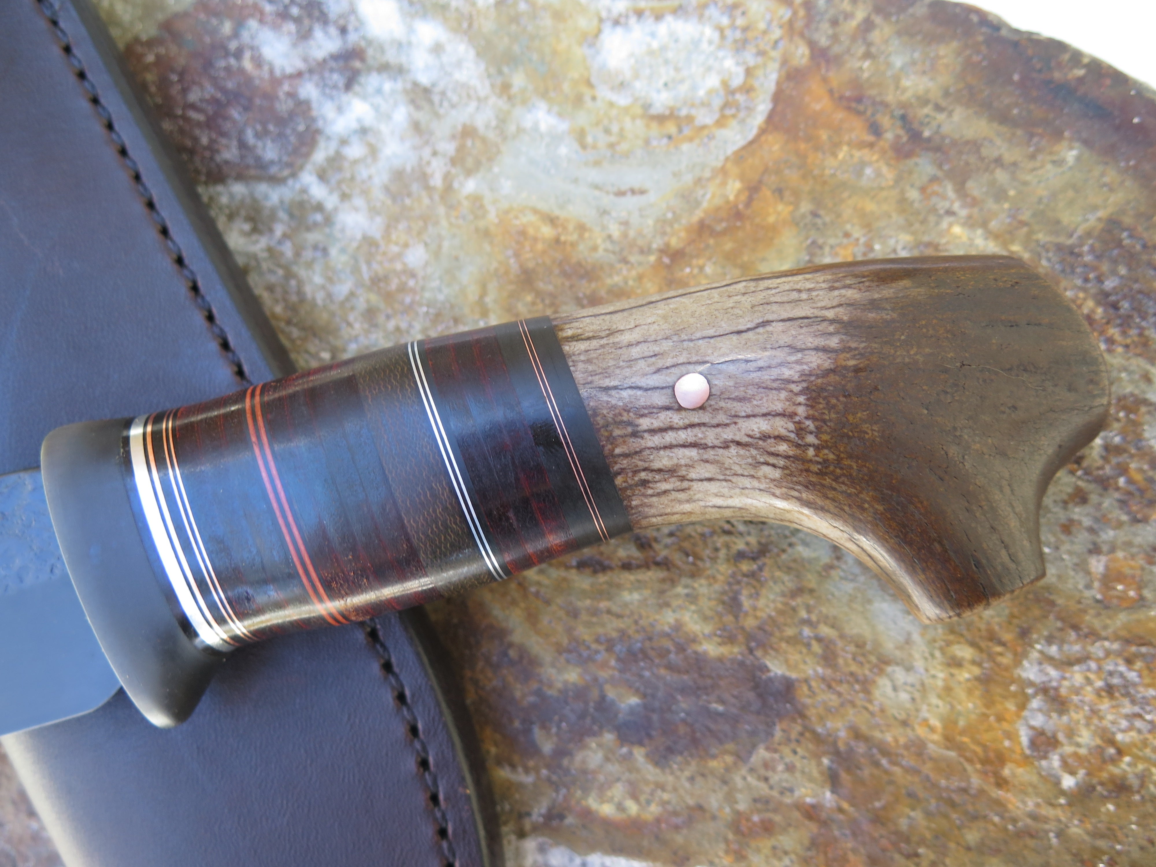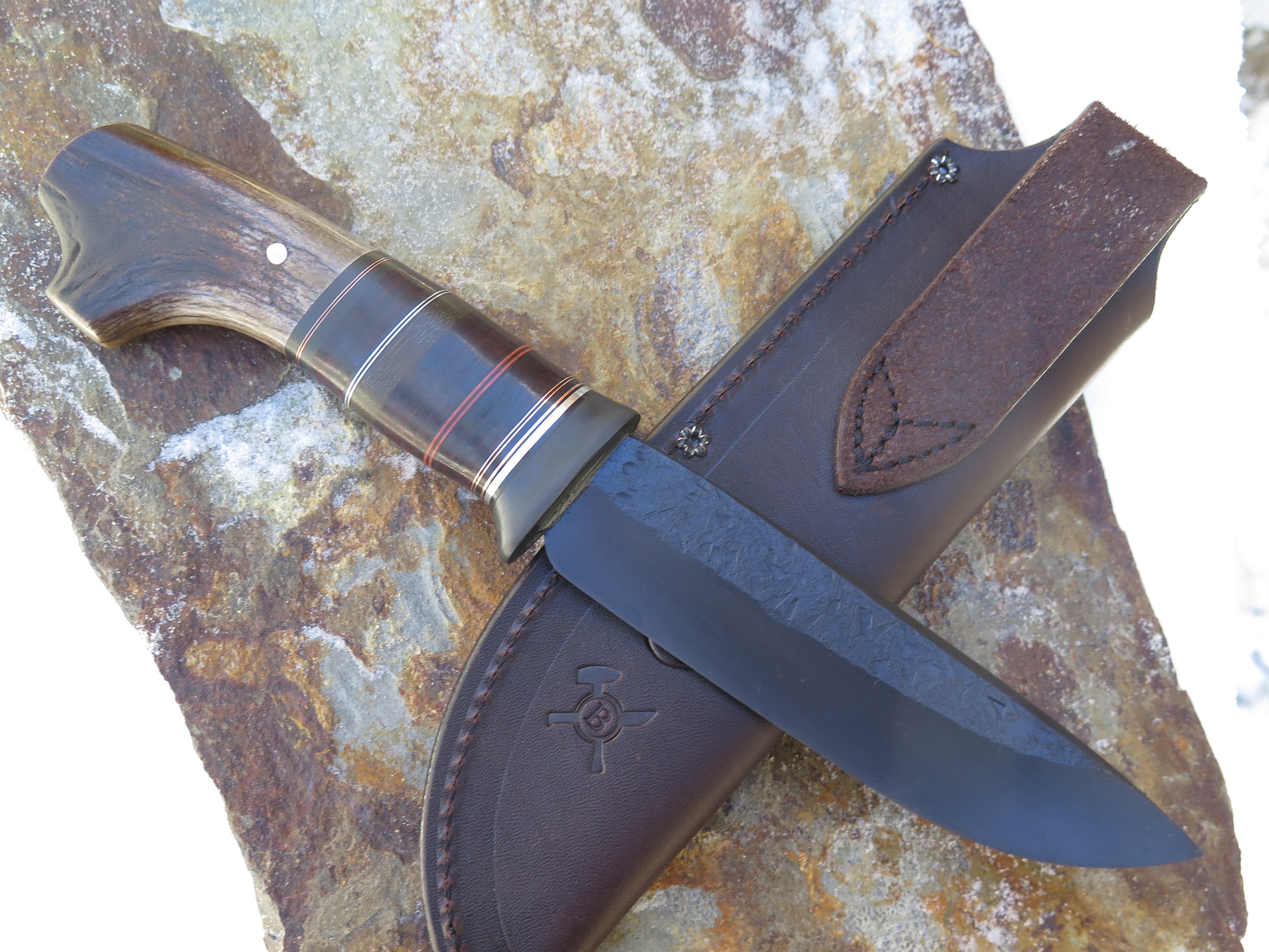 This handsome new Drop Point from Behring Made© is hand forged from 1/4" thick high carbon 01 tool steel and it measures about 6" from tip to guard with a razor sharp hollow grind, hammermarks and our forced patina blued finish. The blued steel guard is soldered in place above black and maroon fiber, green micarta, horsehide, aluminum and copper spacers that all wonderfully compliment the crotch stag butt with a copper pin. Overall length measures right over 11" and it comes in a Warlander Leather pouch sheath.