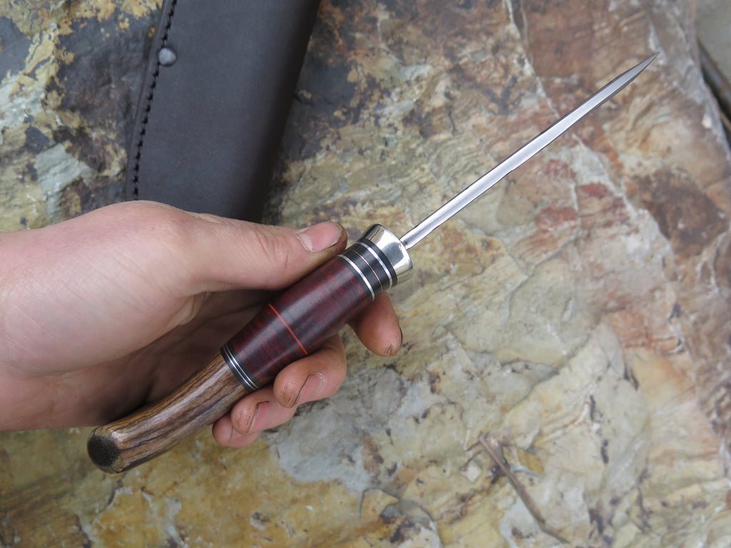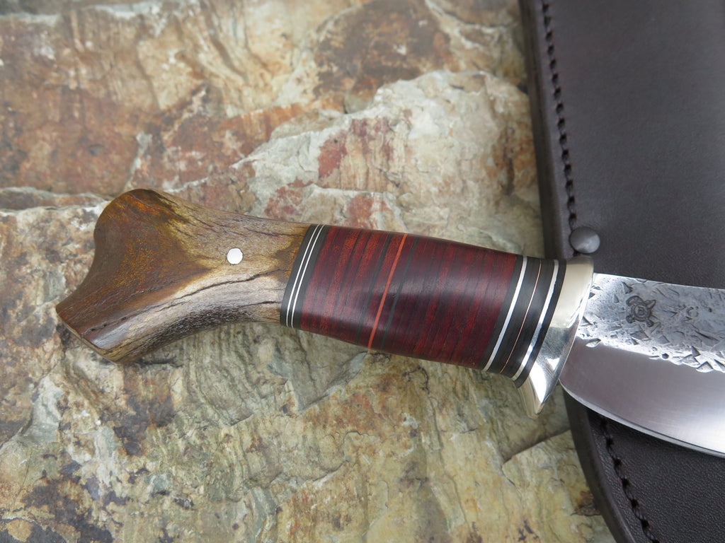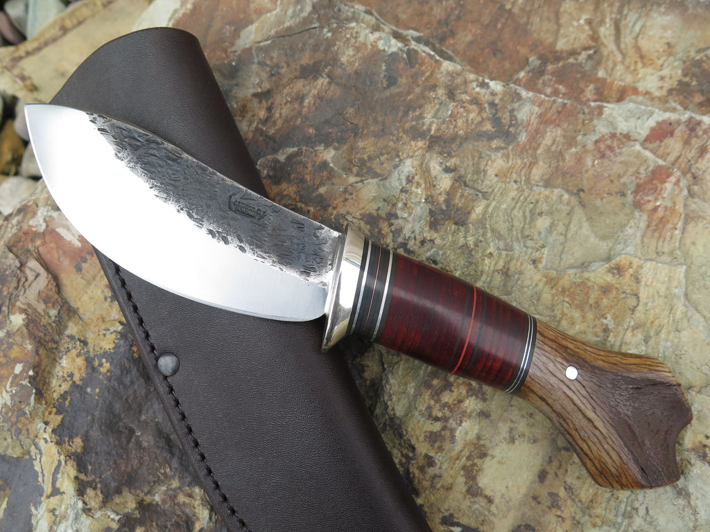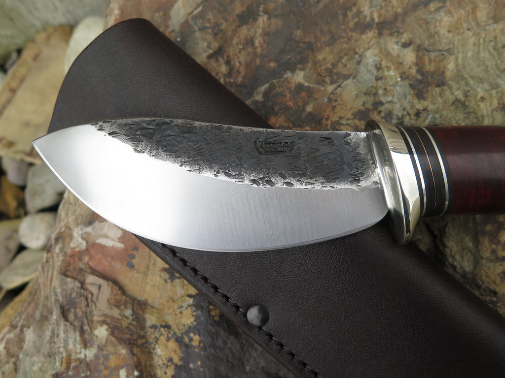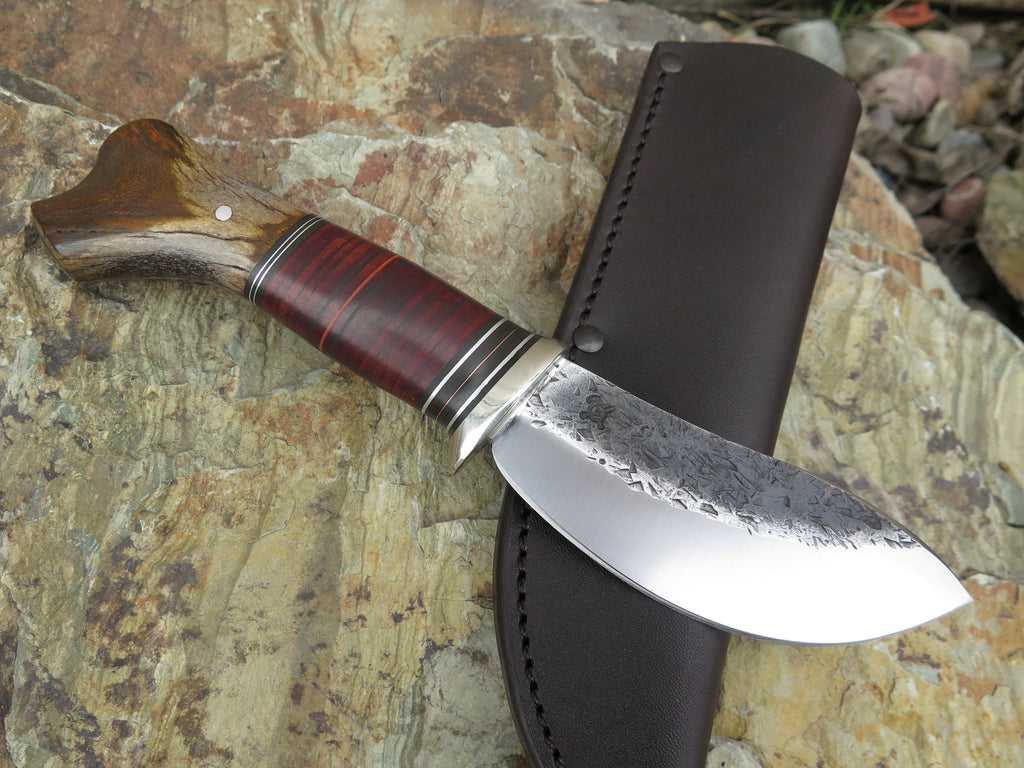 This wonderful new Nessmuk from Behring Made© is hand forged from 3/16" thick high carbon 01 tool steel and it measures 4 1/2" from tip to guard with a razor sharp hollow grind and our hammermark finish. The nickel silver guard is silver soldered in place above black and maroon fiber, copper, and horsehide leather spacers in addition to the crotch stag butt that's pinned through the tang with aluminum. The overall length measures 9 1/2" from tip to guard and it comes in a classic pouch sheath from Warlander Leather.