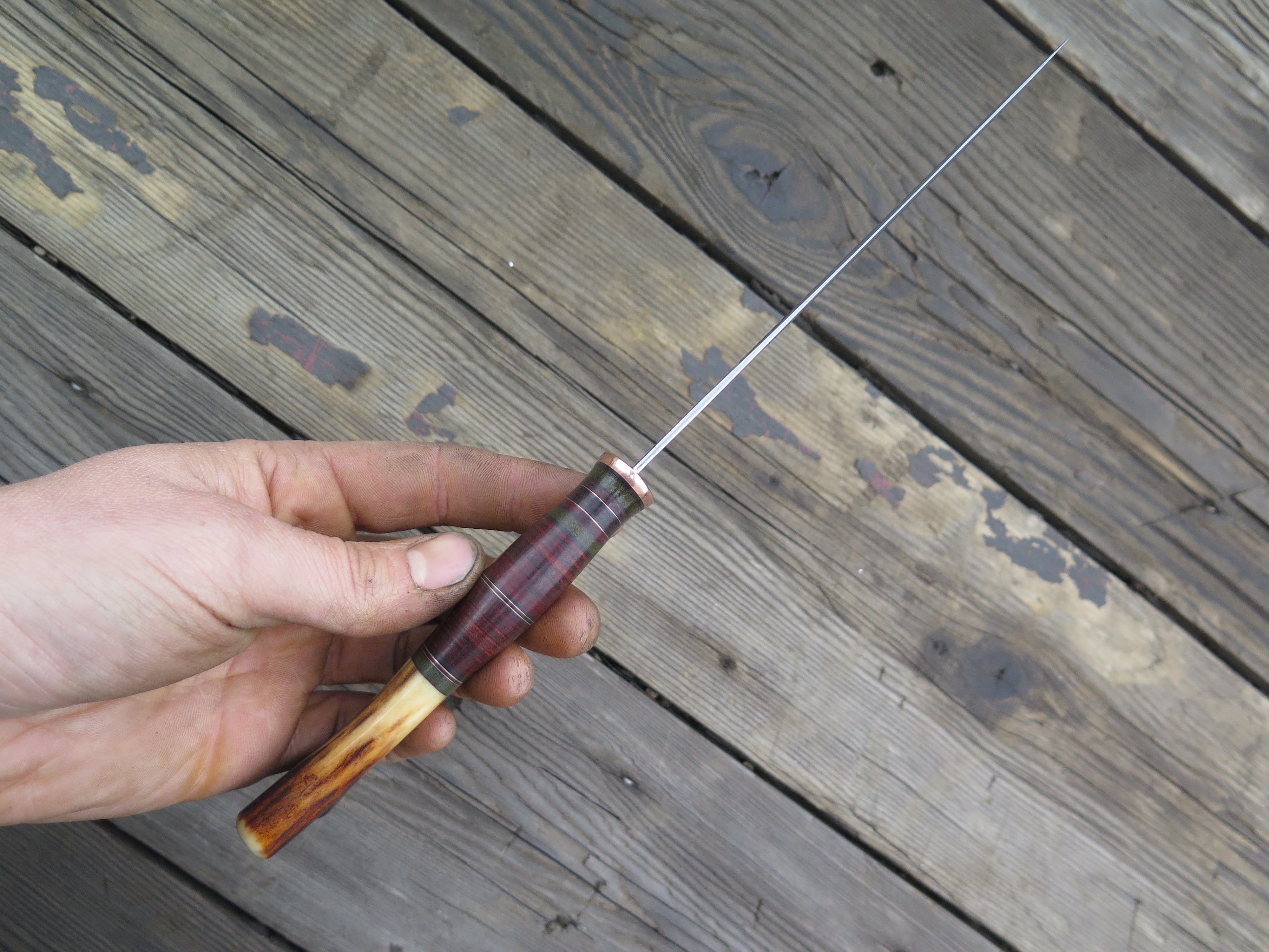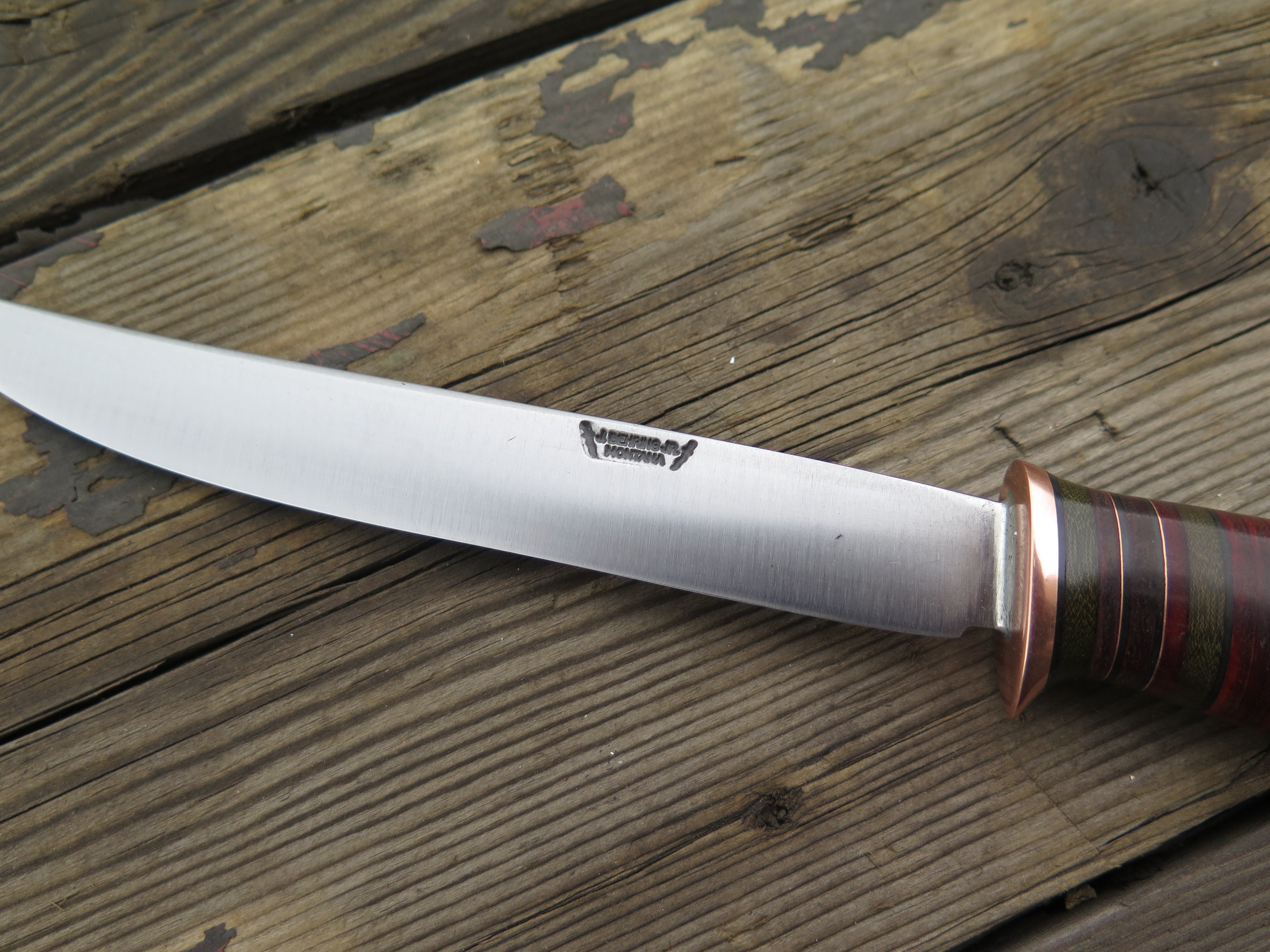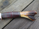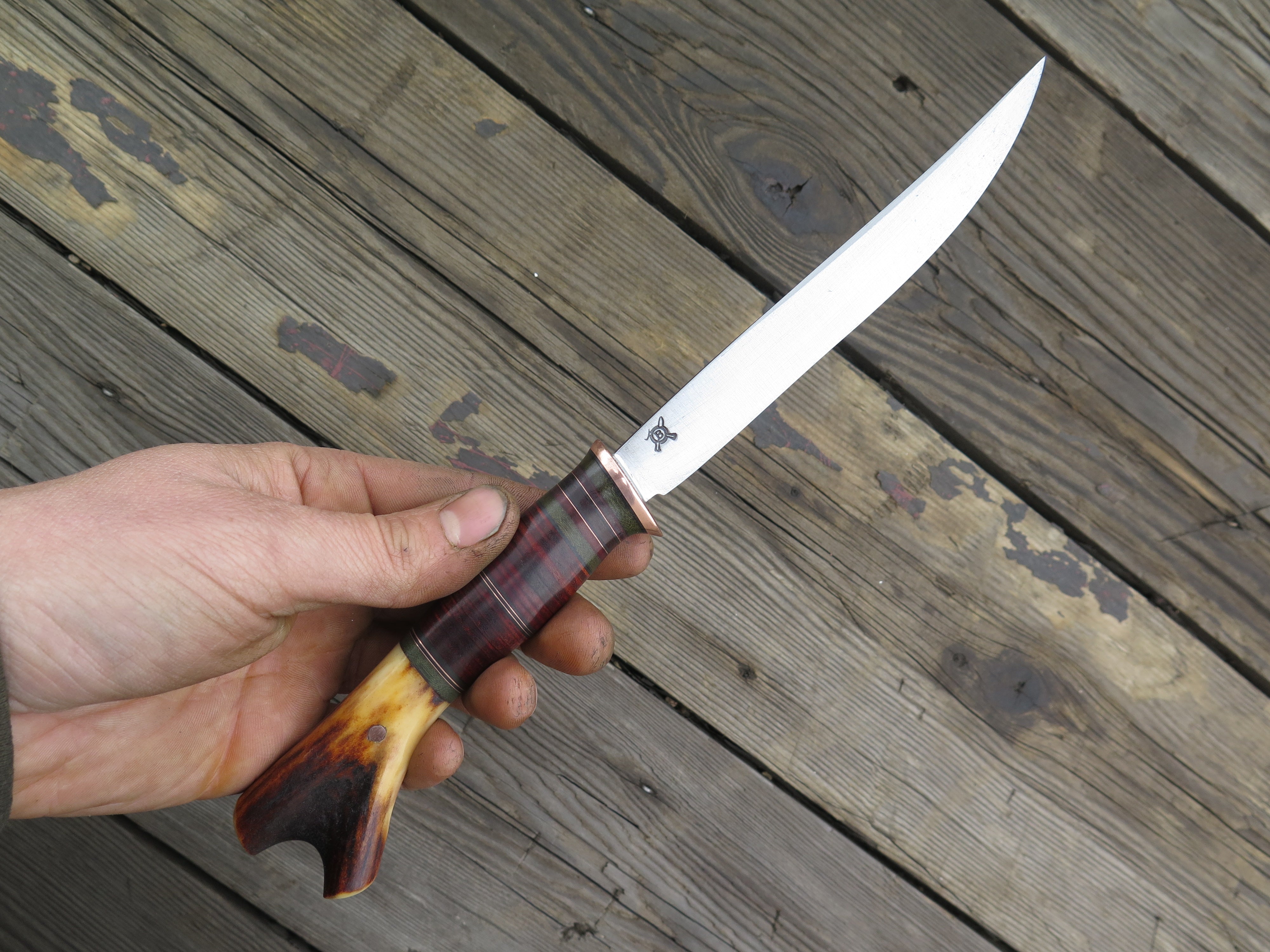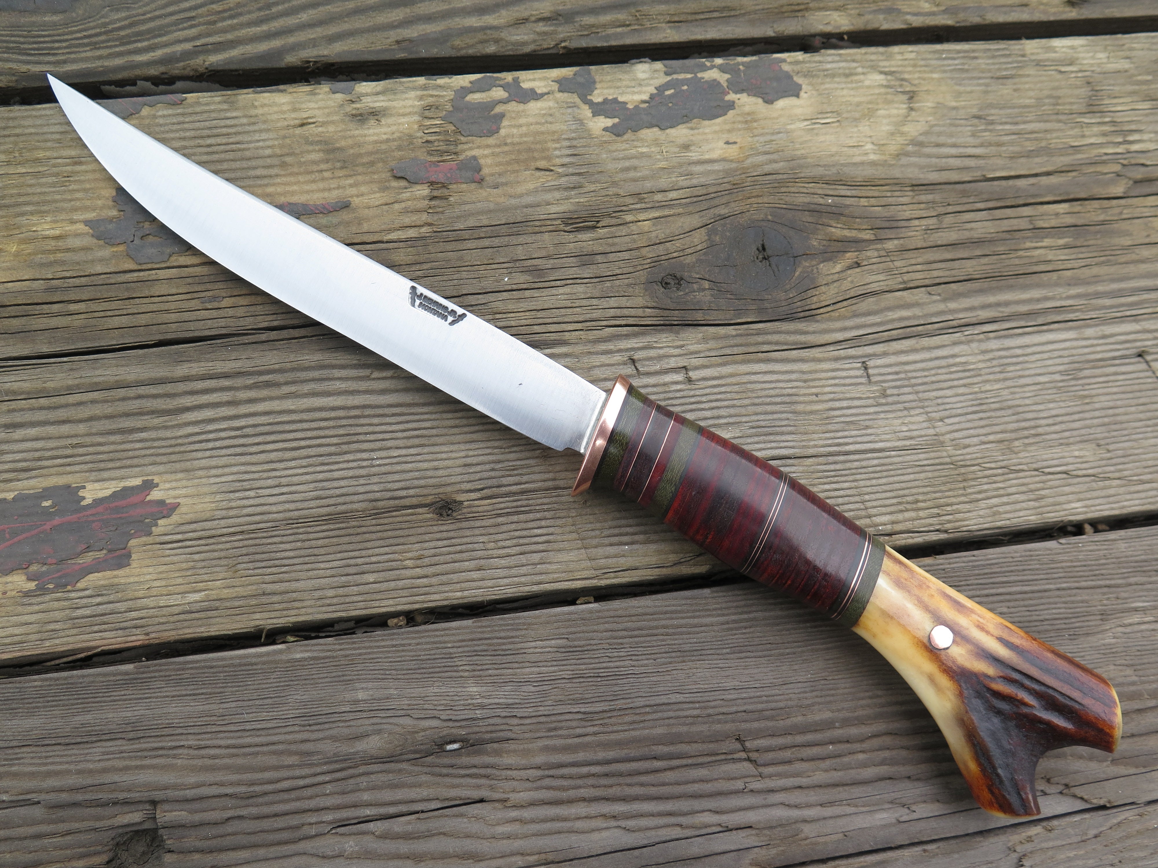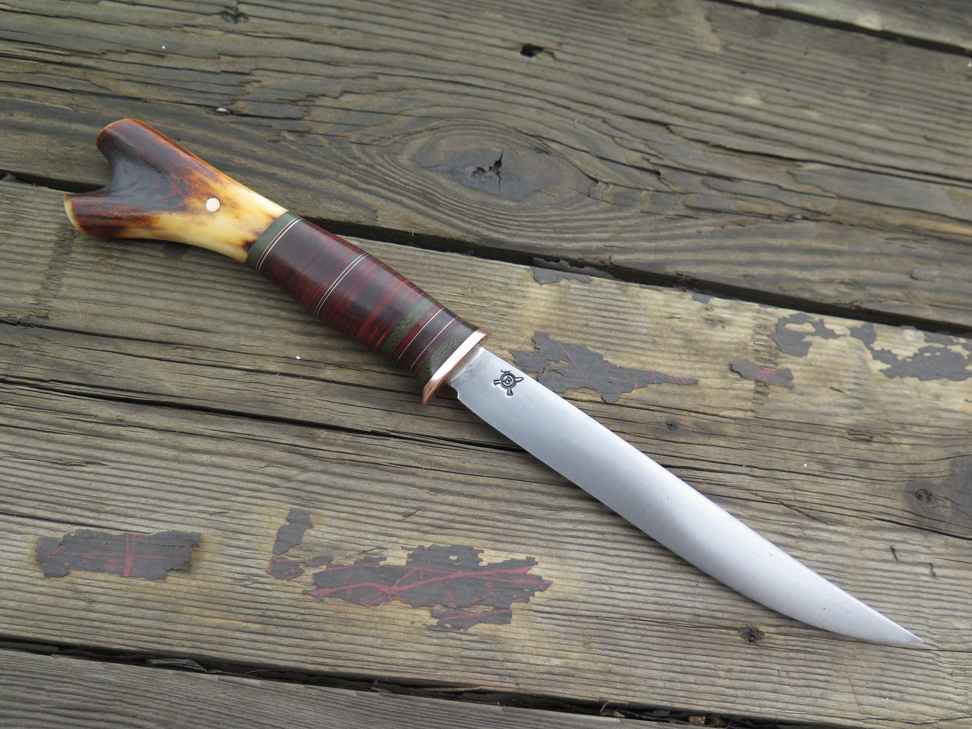 This new Blackfoot Fillet from Behring Made© knives is hand forged from ultra thin 5160 spring steel and it measures 5 3/4" from tip to guard with a razor sharp convex grind and a functional flex. The copper guard is soldered in place above black fiber, green micarta and copper spacers in addition to the premium horsehide leather stack and premium sambar stag crotch that's pinned through the tang with copper. The overall length of this one measures 10 1/4" and it will come in a custom sheath from Warlander Leather.