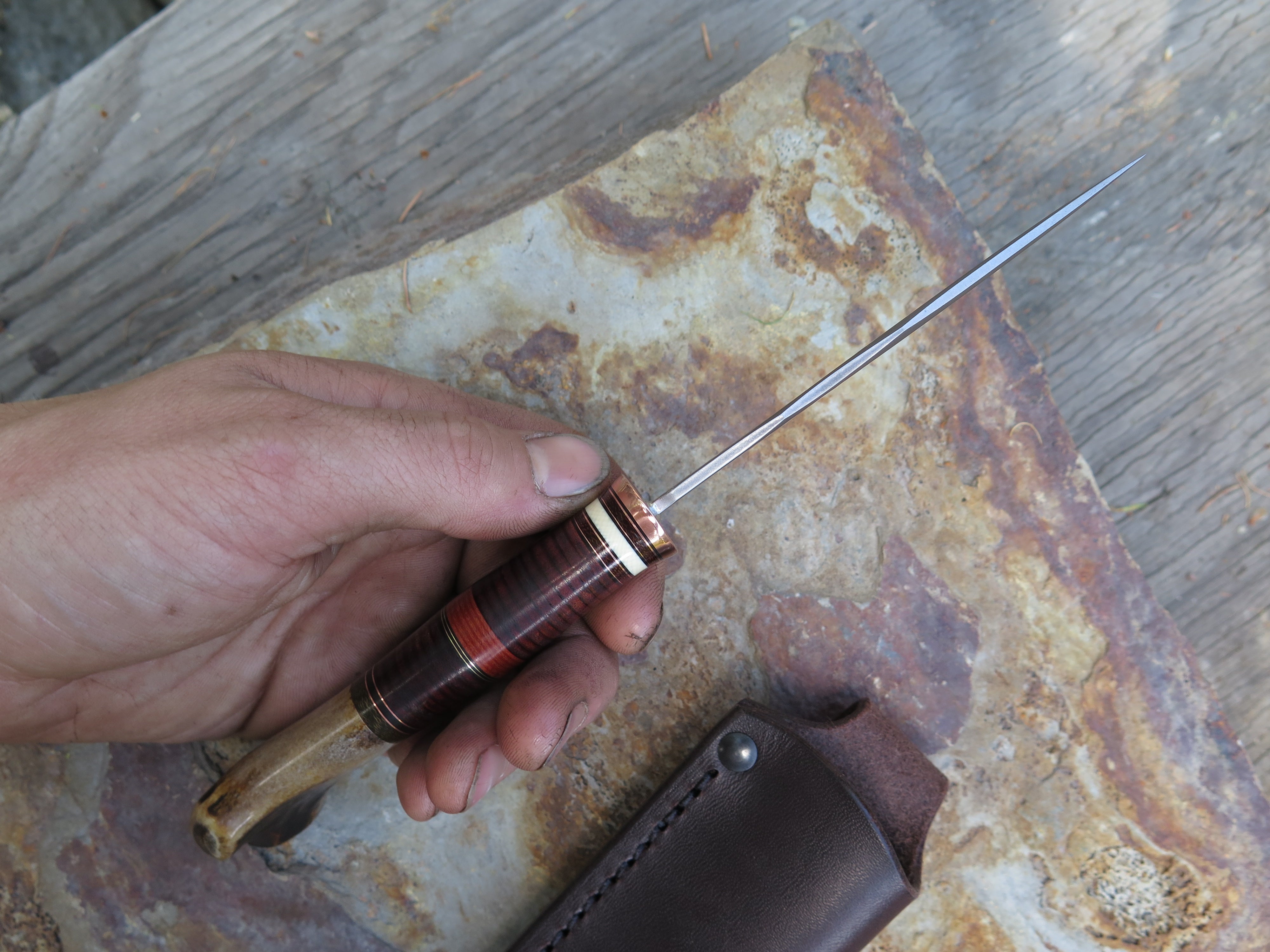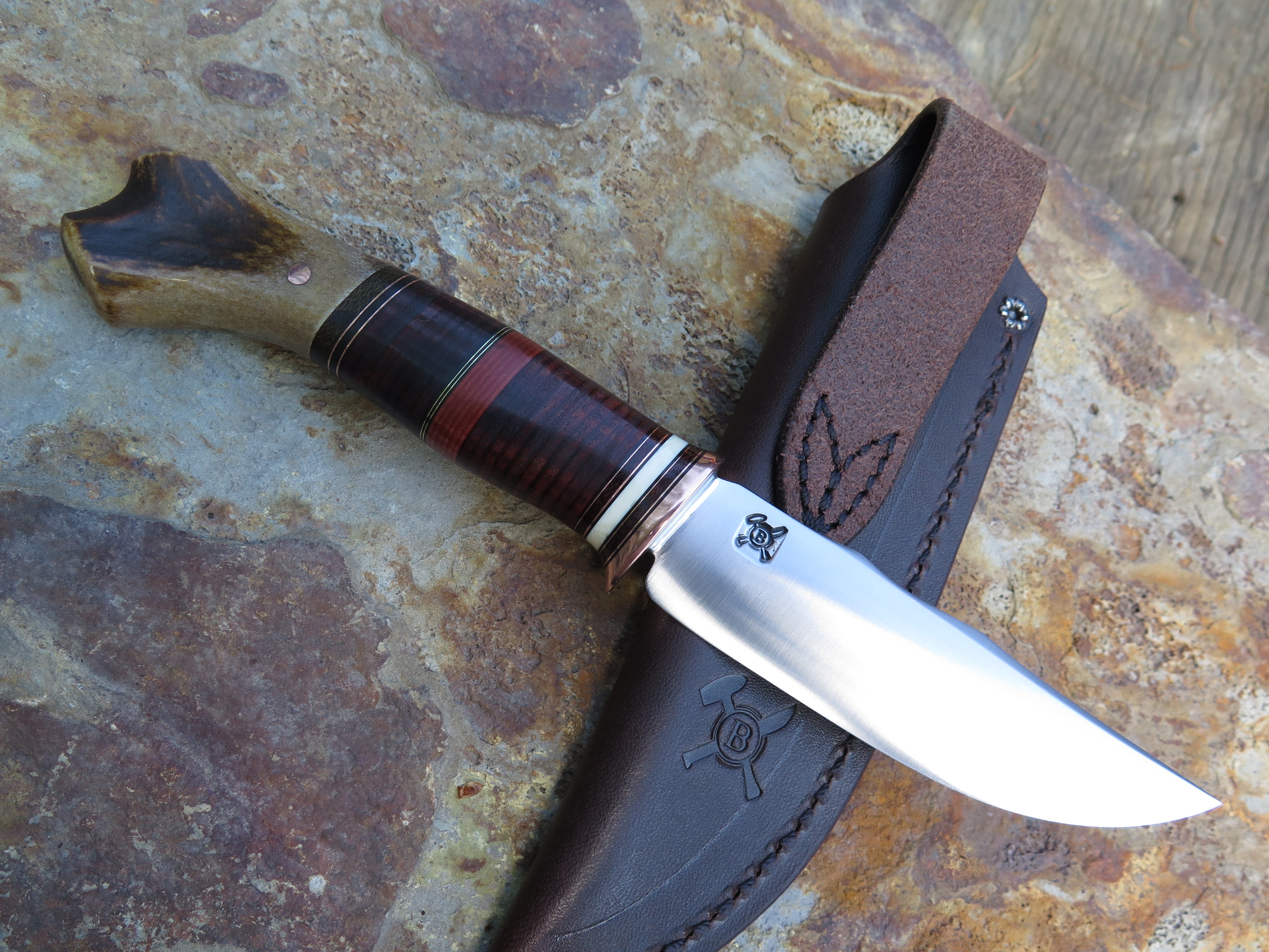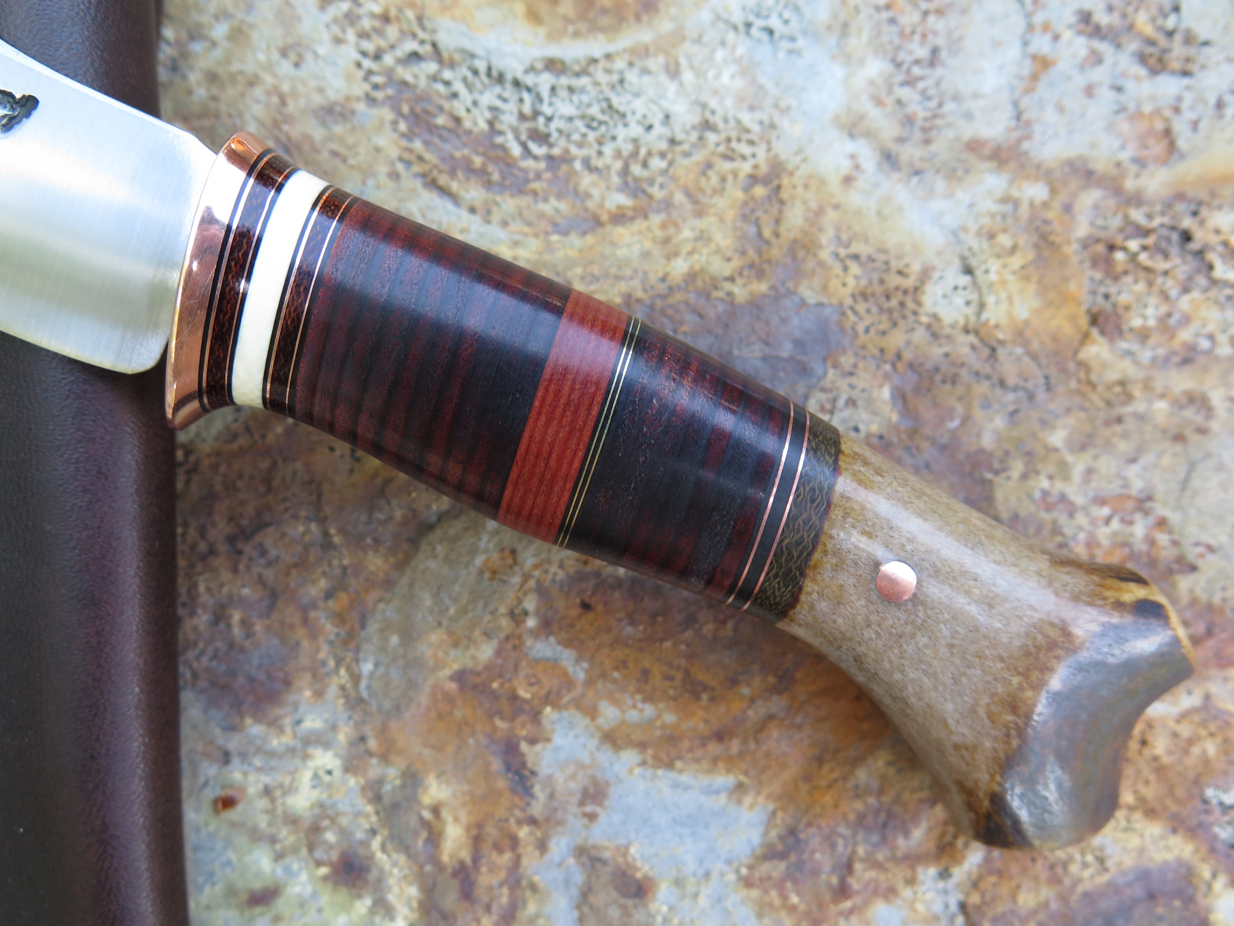 This brand new one from Behring Made© is hand forged from 1/8" thick high carbon 01 tool steel and it measures 4" tip to guard with a razor sharp convex grind. The copper guard is soldered in place above black and maroon fiber, brass, copper, mammoth, green micarta and horsehide leather spacers as well as a crotch stag butt that is pinned through the tang with aluminum. The overall length measures 8 5/8" and it comes in a classic leather belt pouch sheath.