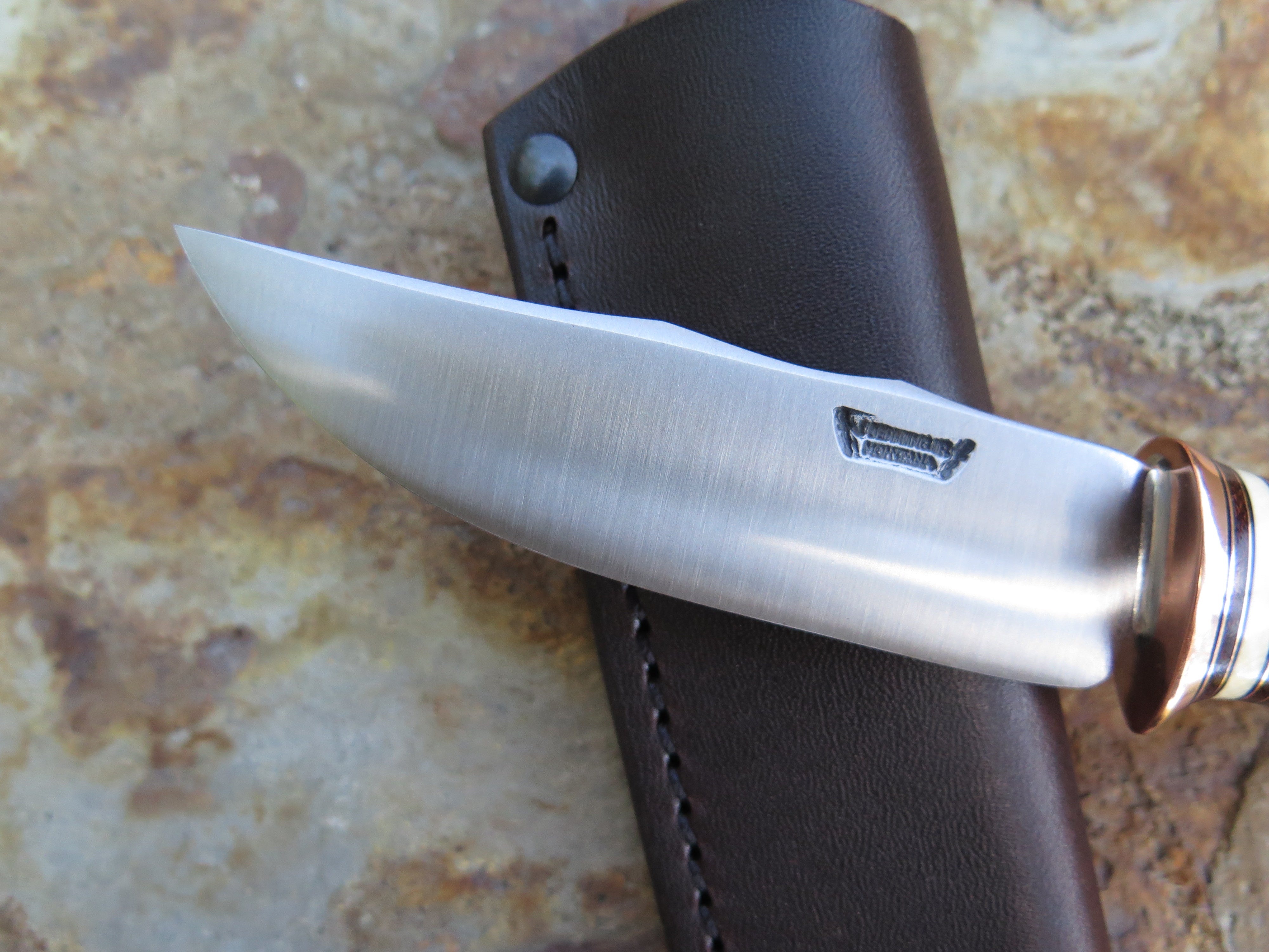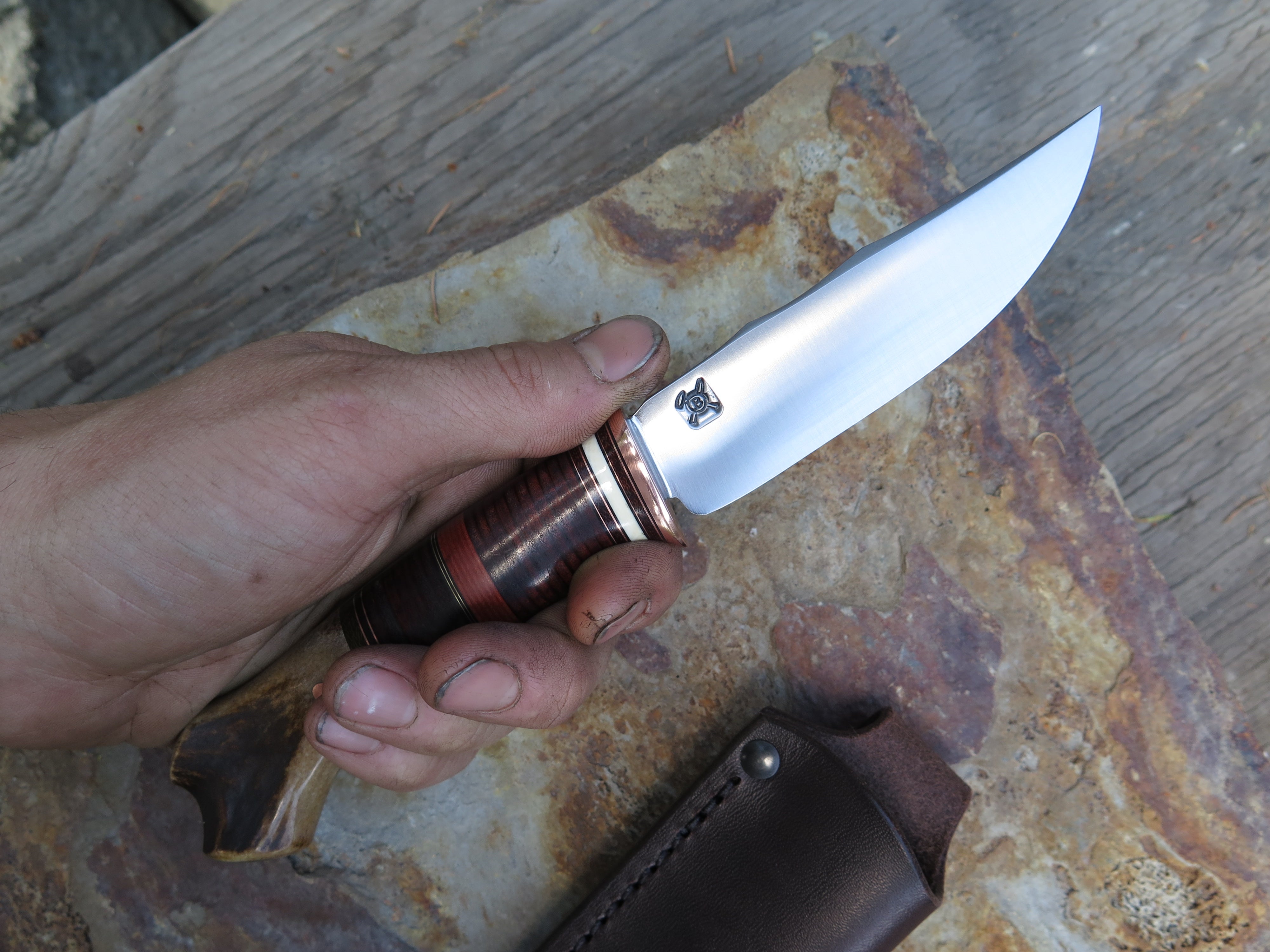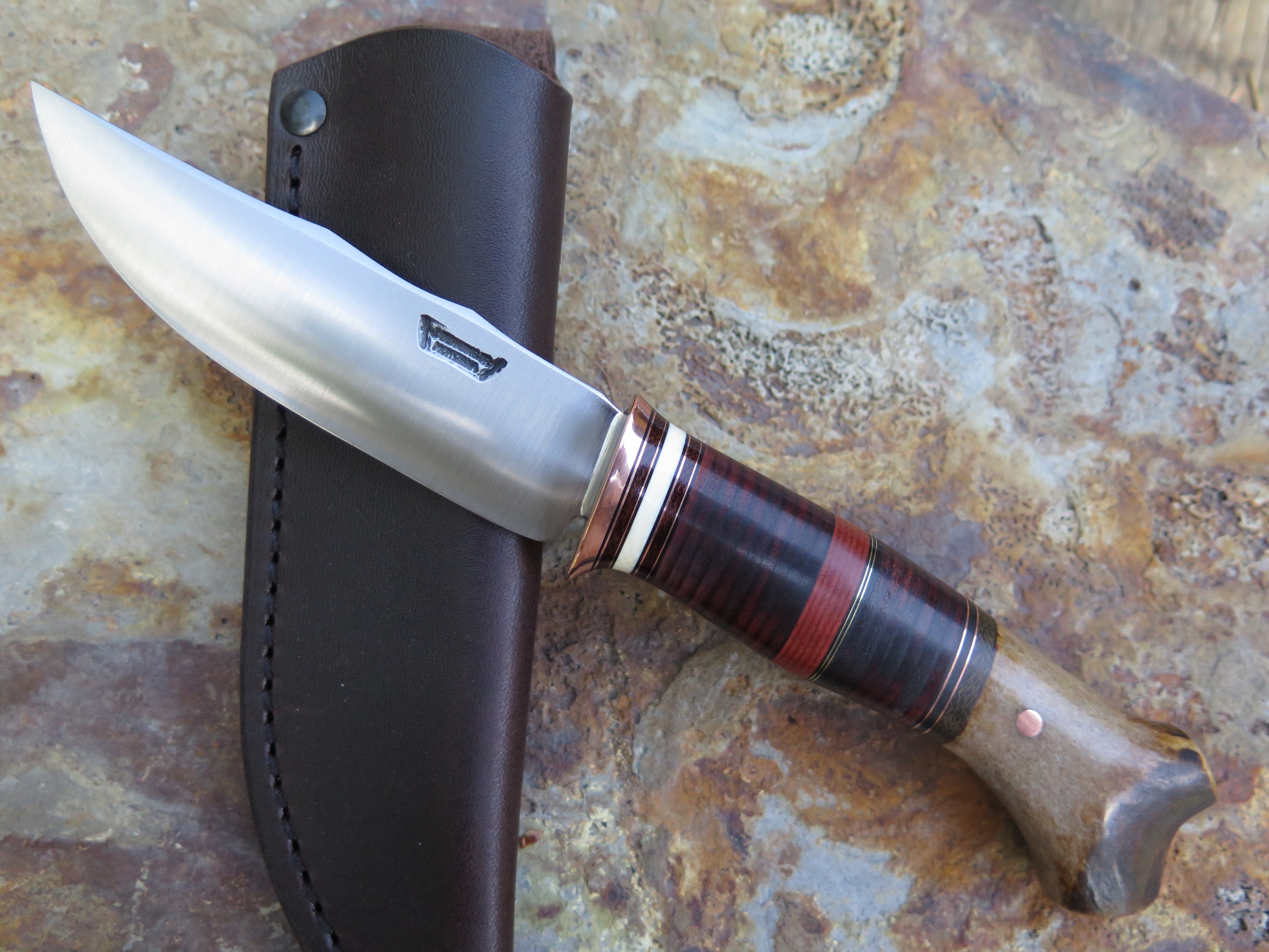 This brand new one from Behring Made© is hand forged from 1/8" thick high carbon 01 tool steel and it measures 4" tip to guard with a razor sharp convex grind. The copper guard is soldered in place above black and maroon fiber, brass, copper, mammoth, green micarta and horsehide leather spacers as well as a crotch stag butt that is pinned through the tang with aluminum. The overall length measures 8 5/8" and it comes in a classic leather belt pouch sheath.