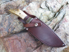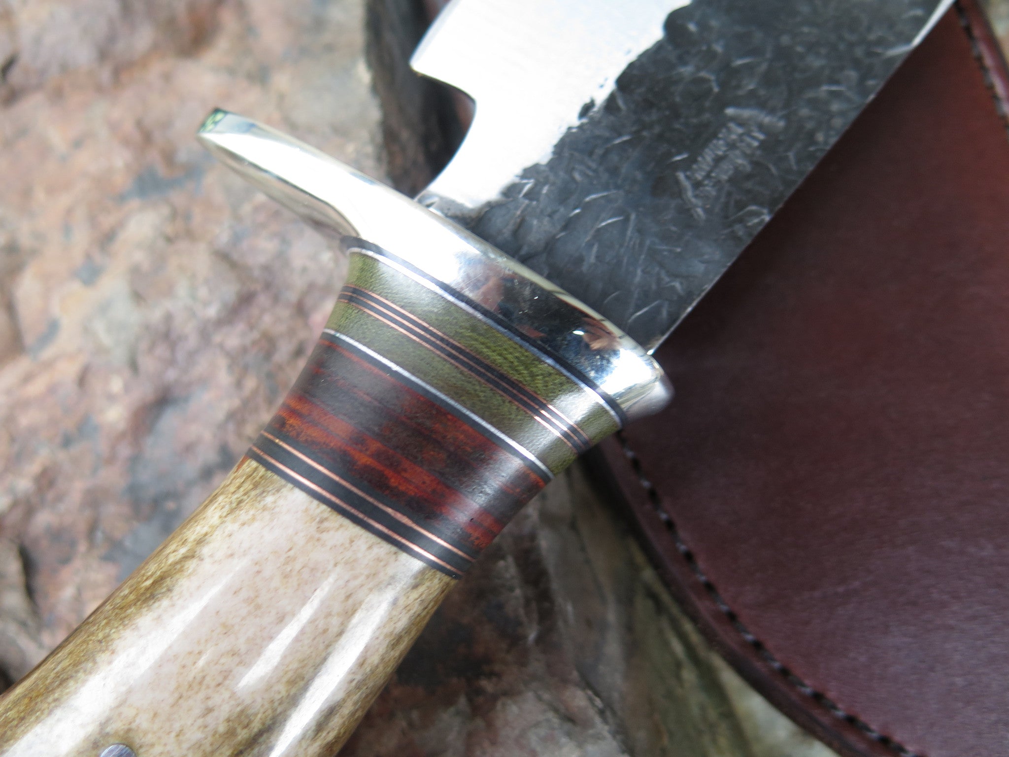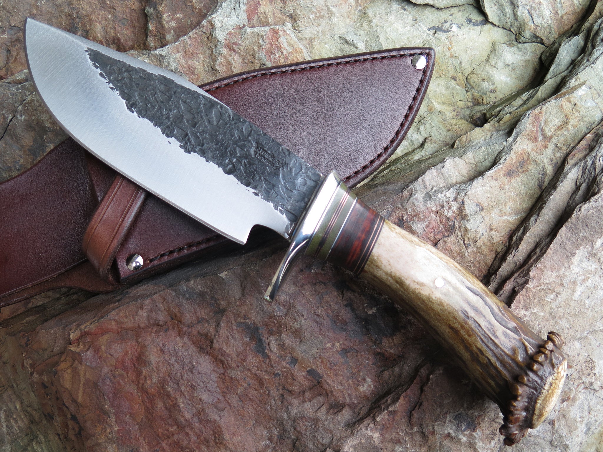This incredible Bushmaster from Behring Made is hand forged from 3/16" thick high carbon 01 tool steel and it measures 6 1/2" from tip to guard with a razor sharp hollow grind and a hammermark finish. The nickel silver guard is soldered in place above black fiber, green micarta, aluminum, copper and horsehide spacers as well as a crown stag handle that's pinned through the tang with aluminum. The overall length measures 12 1/4" and it comes in a custom sheath from Warlander Leather.