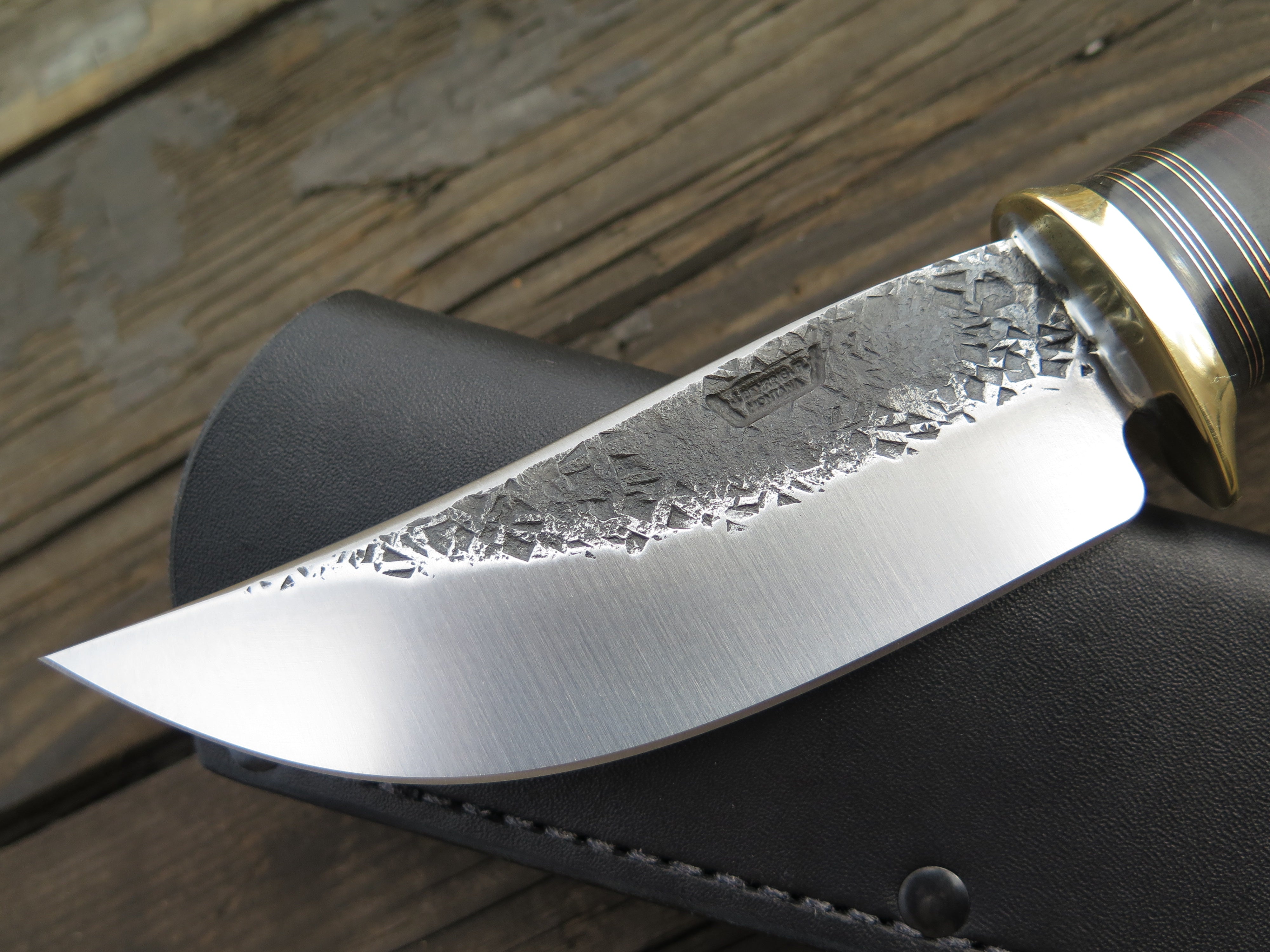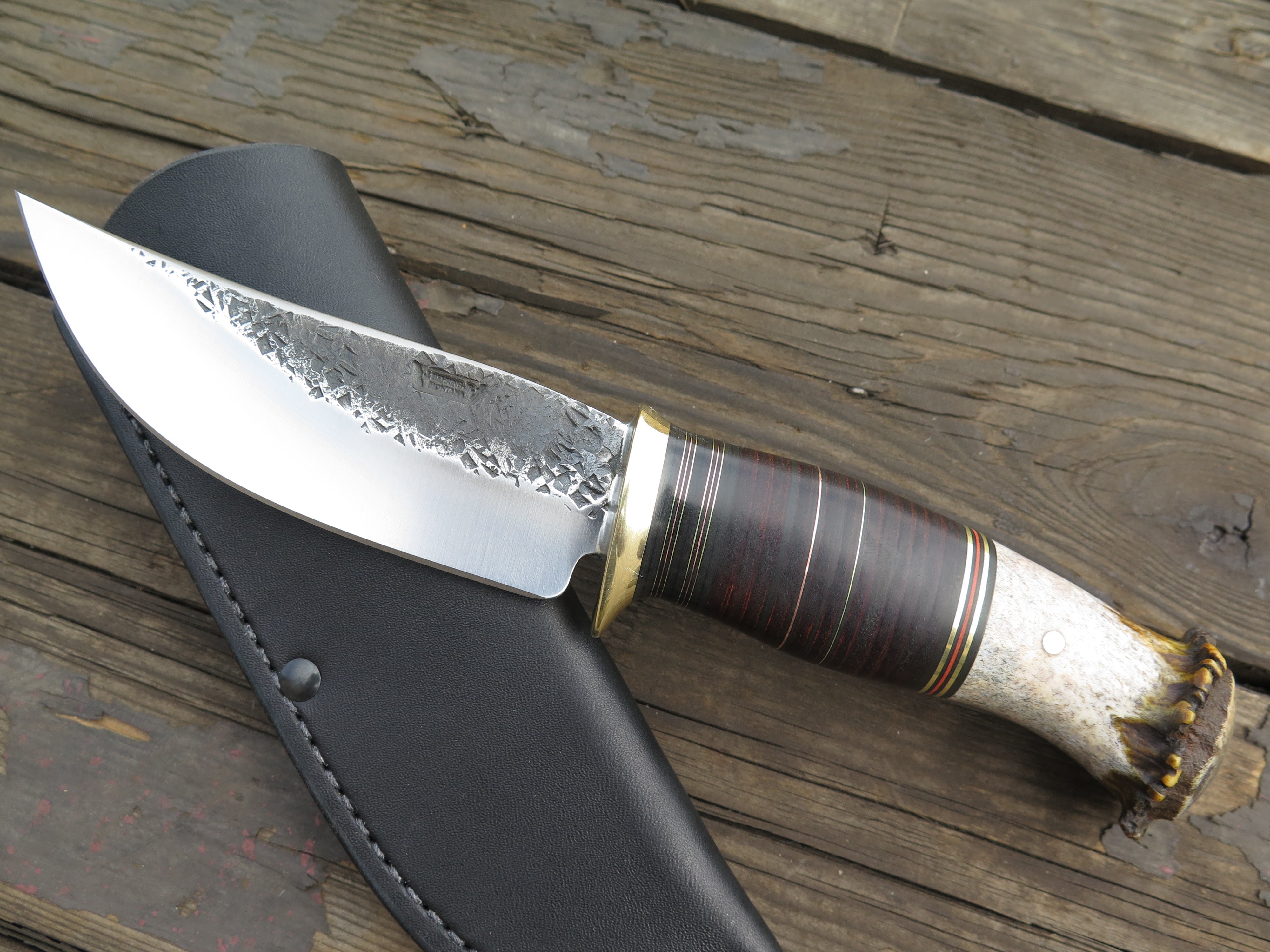 This beast mode Hunter from Behring Made™ knives is hand forged from 3/16" thick high carbon 01 tool steel and it measures just under 5" from tip to guard with a razor sharp hollow grind and our hammermark finish. The brass guard is soldered in place above a Scagel inspired stack of black and maroon fiber, brass, copper and horsehide leather spacers as well as a premium mule deer crown stag butt that is also pinned through the tang with copper. The overall length of this perfect field companion measures 9 7/8" and it comes in a Warlander Leather pouch sheath- easily the envy of hunting camp!