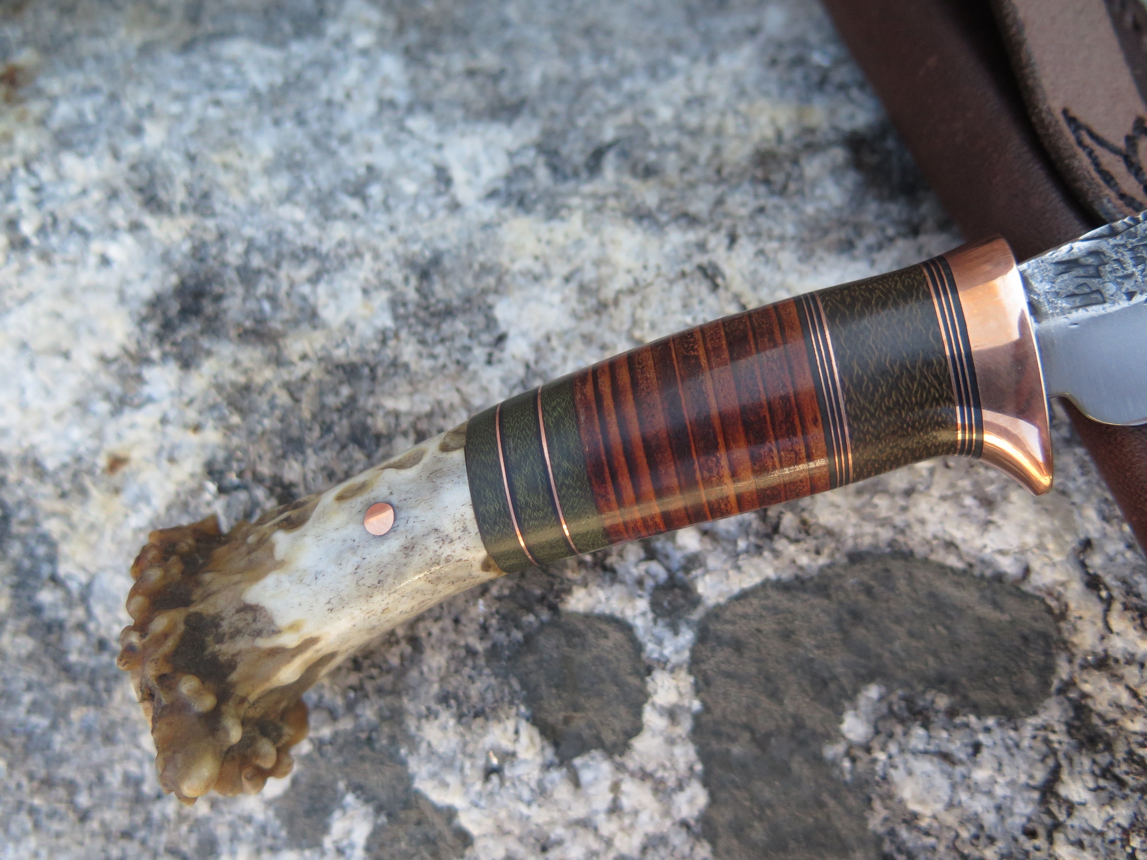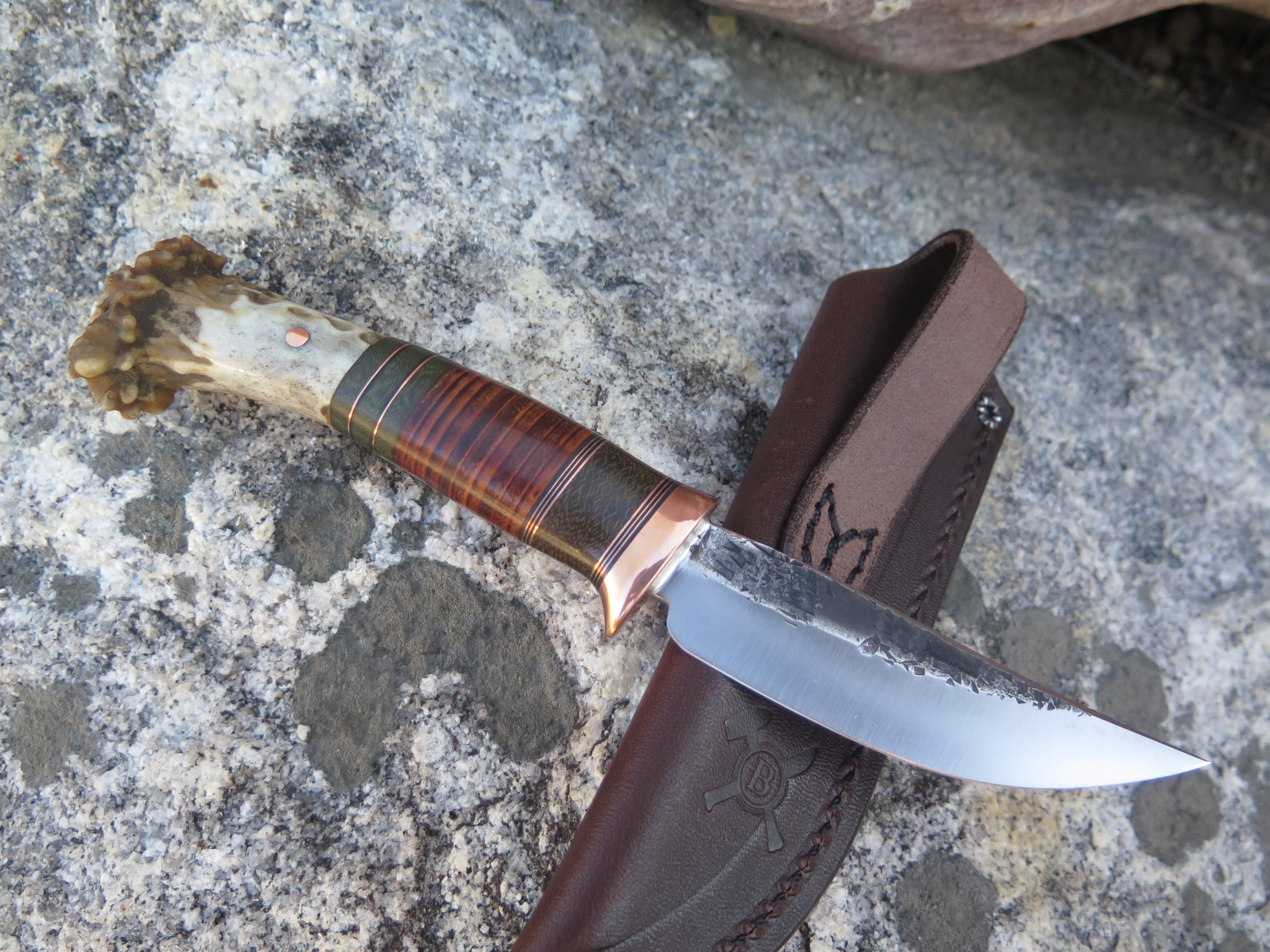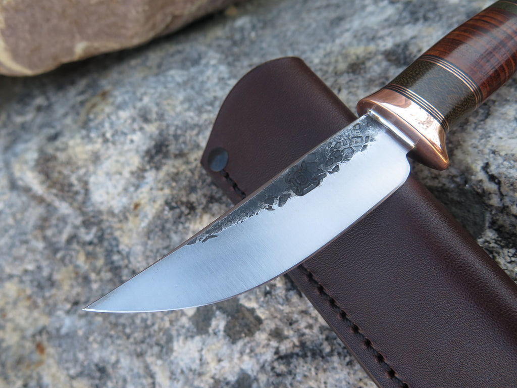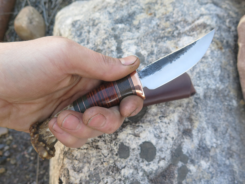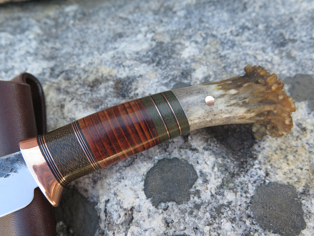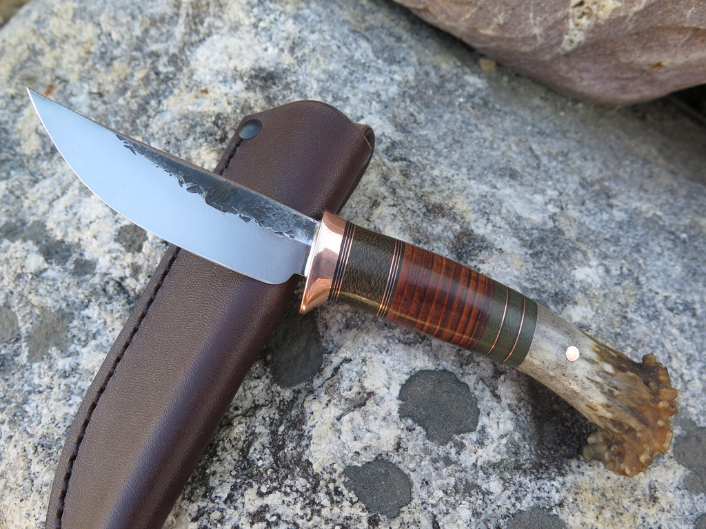 This beautiful new Pintail from Behring Made© is hand forged from 1/8" thick high carbon 01 tool steel and it measures 3 1/2" from tip to guard with a razor sharp hollow grind and our hammermark finish. The copper guard is soldered in place above a Scagel style stack of green micarta, copper and horsehide spacers with a crown stag butt that's pinned through the tang with copper. The overall length measures 7 1/4" and it comes in a simple belt pouch sheath- we guarantee this rig for life!