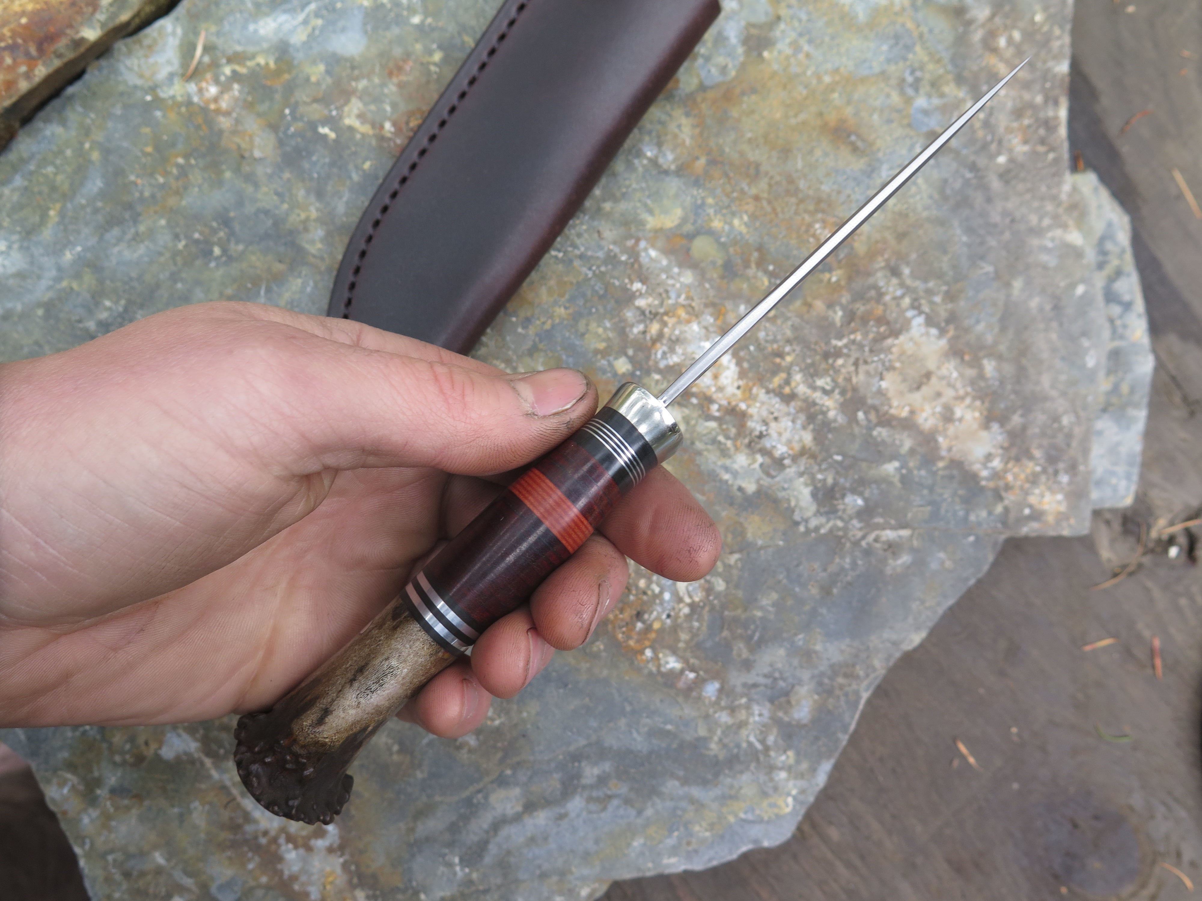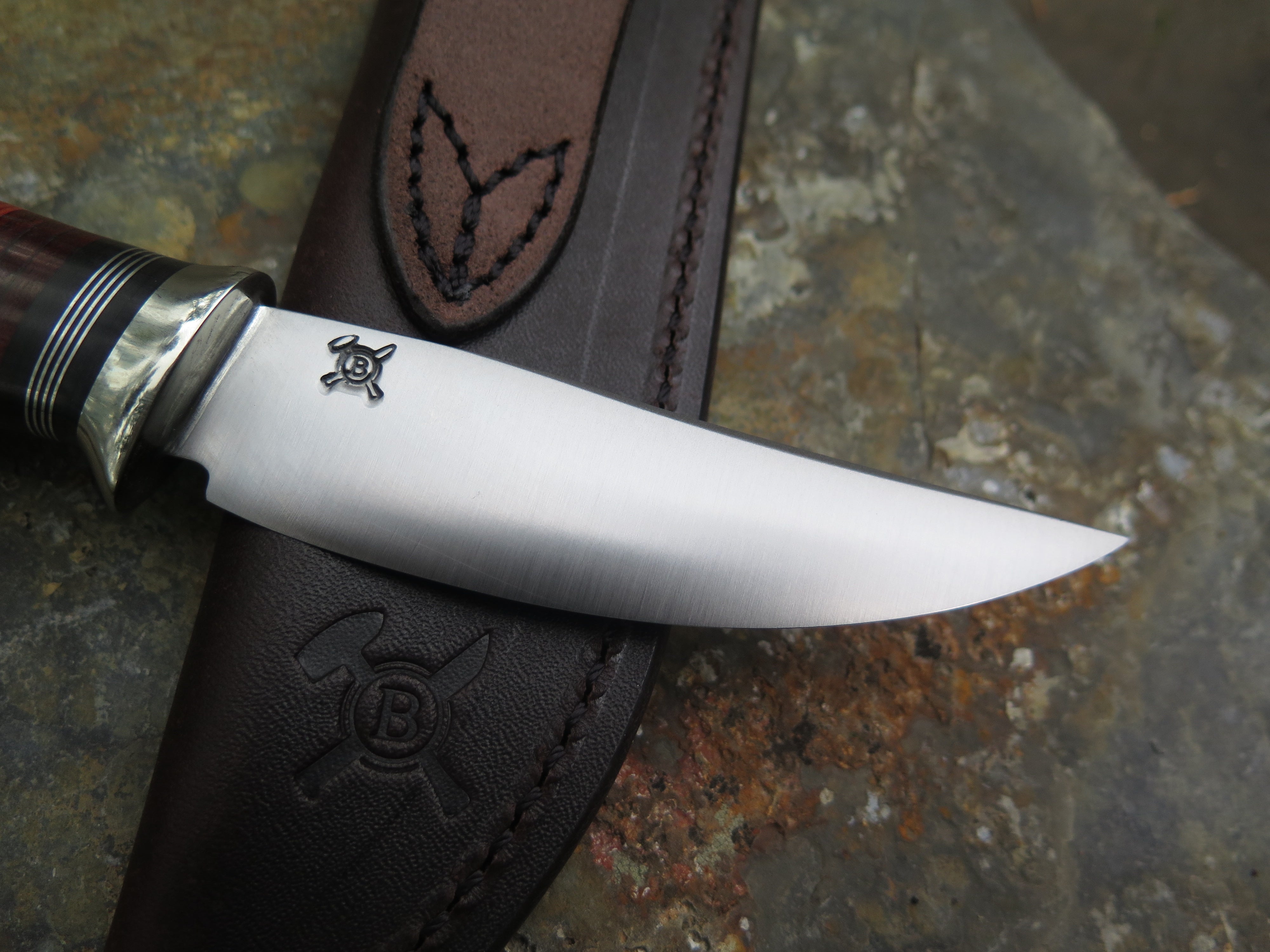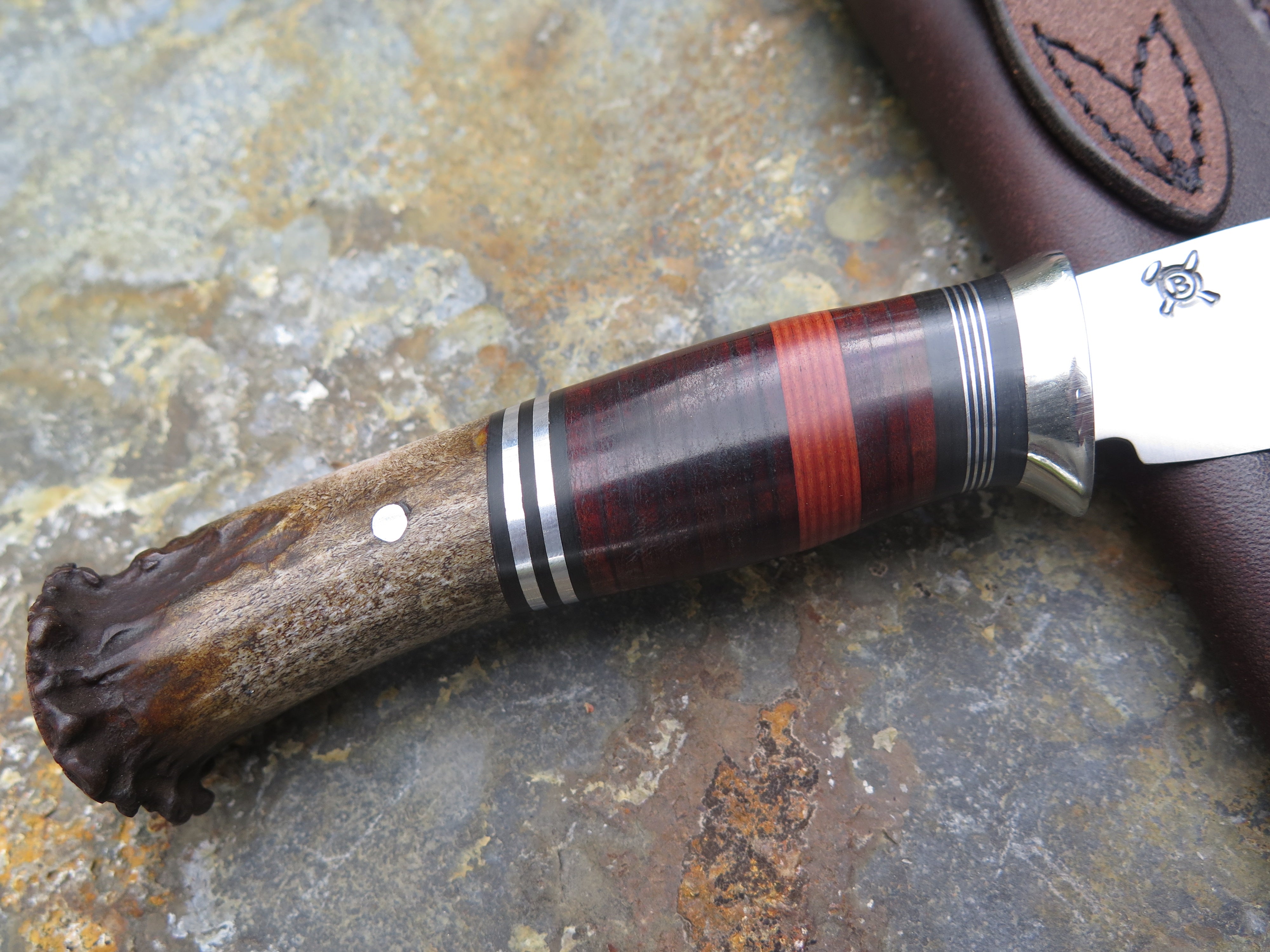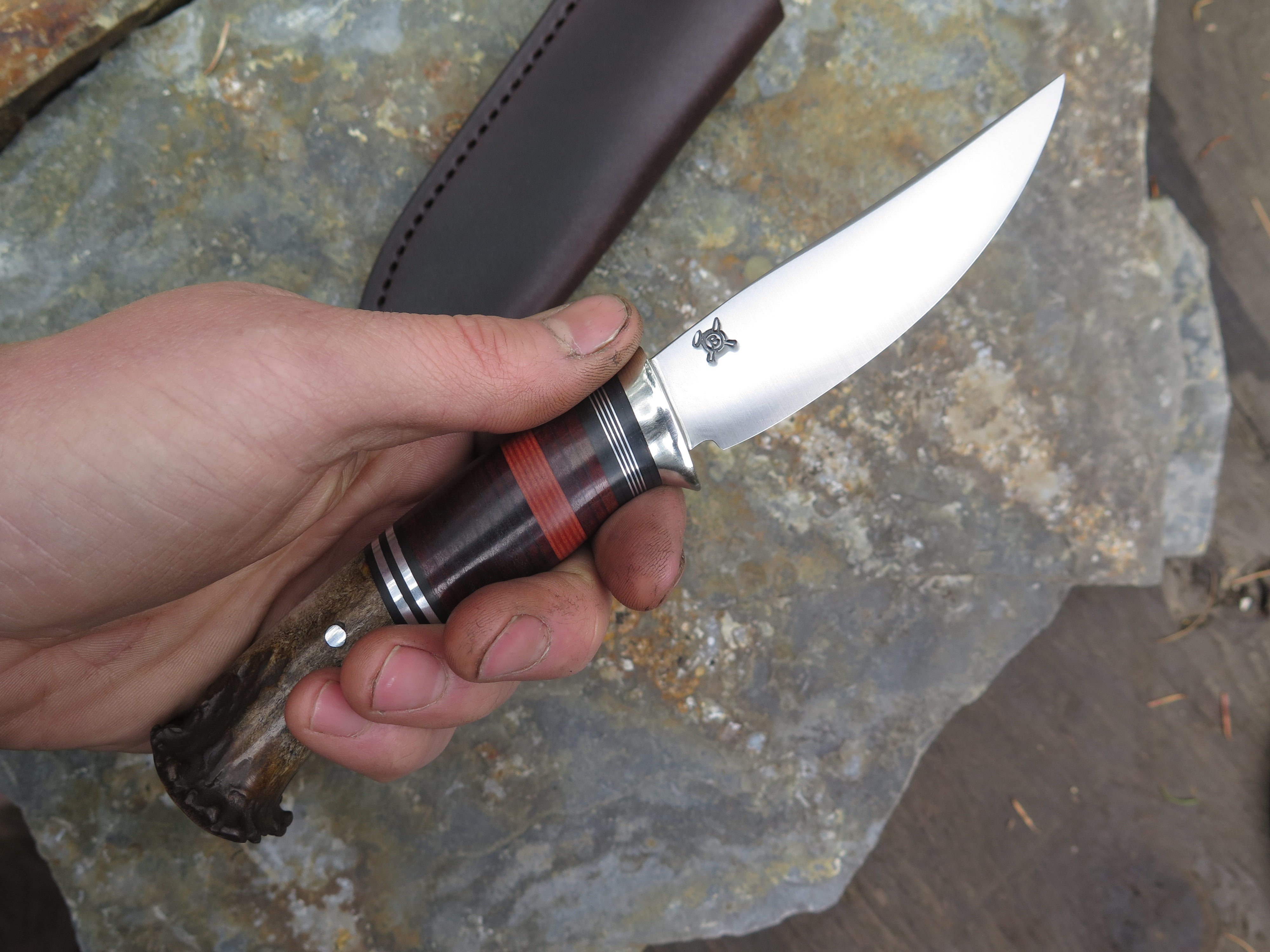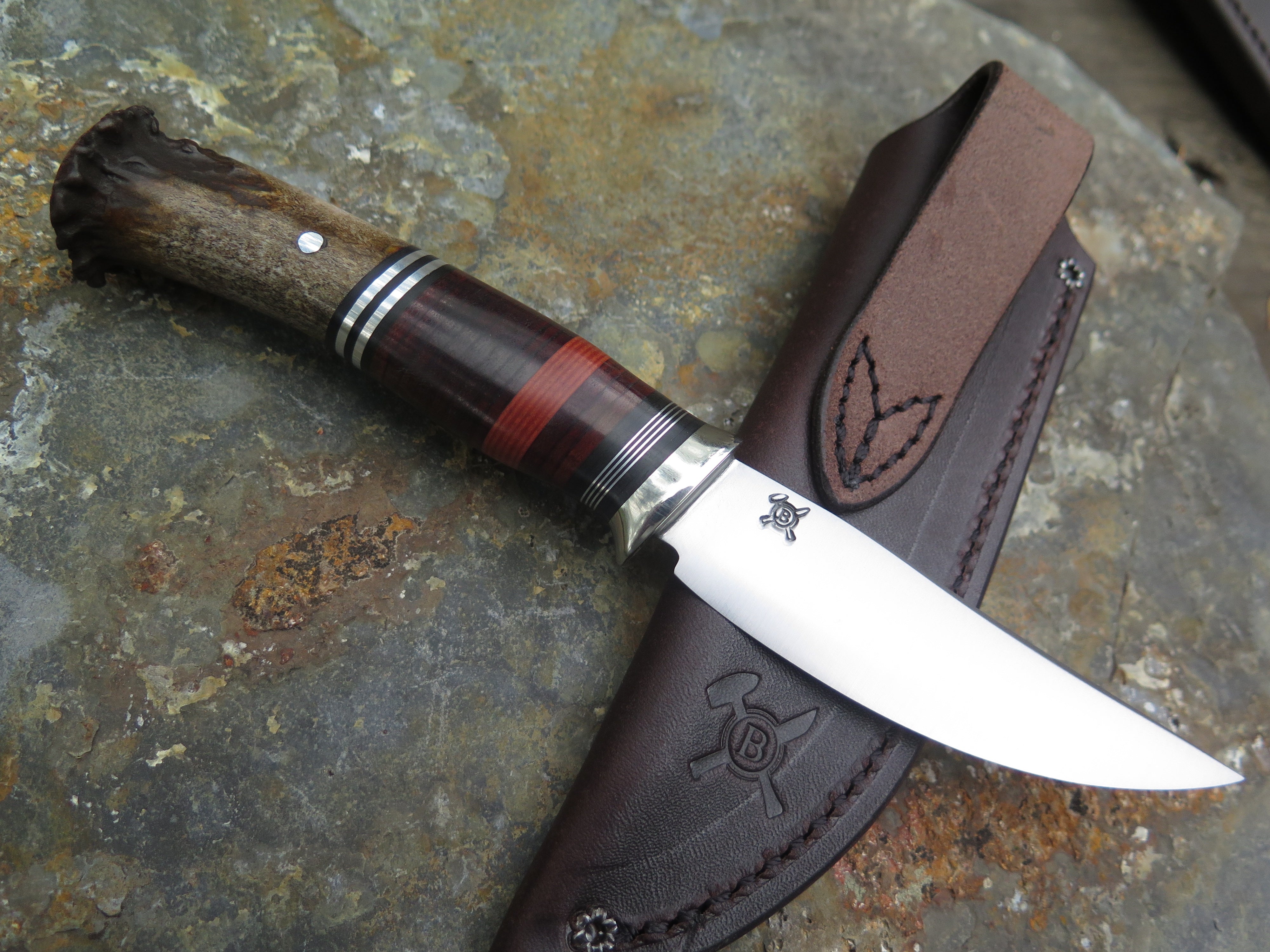 This classic Pintail from Behring Made© is hand forged from 1/8" thick high carbon 01 tool steel and it measures 3 3/4" from tip to guard with a razor sharp convex grind. The nickel silver guard is soldered in place above black and maroon fiber, aluminum and horsehide leather spacers. The crown stag butt is pinned through the tang with aluminum and overall length measures 8 1/4". This one comes in a brown leather belt pouch sheath and we guarantee it for life.