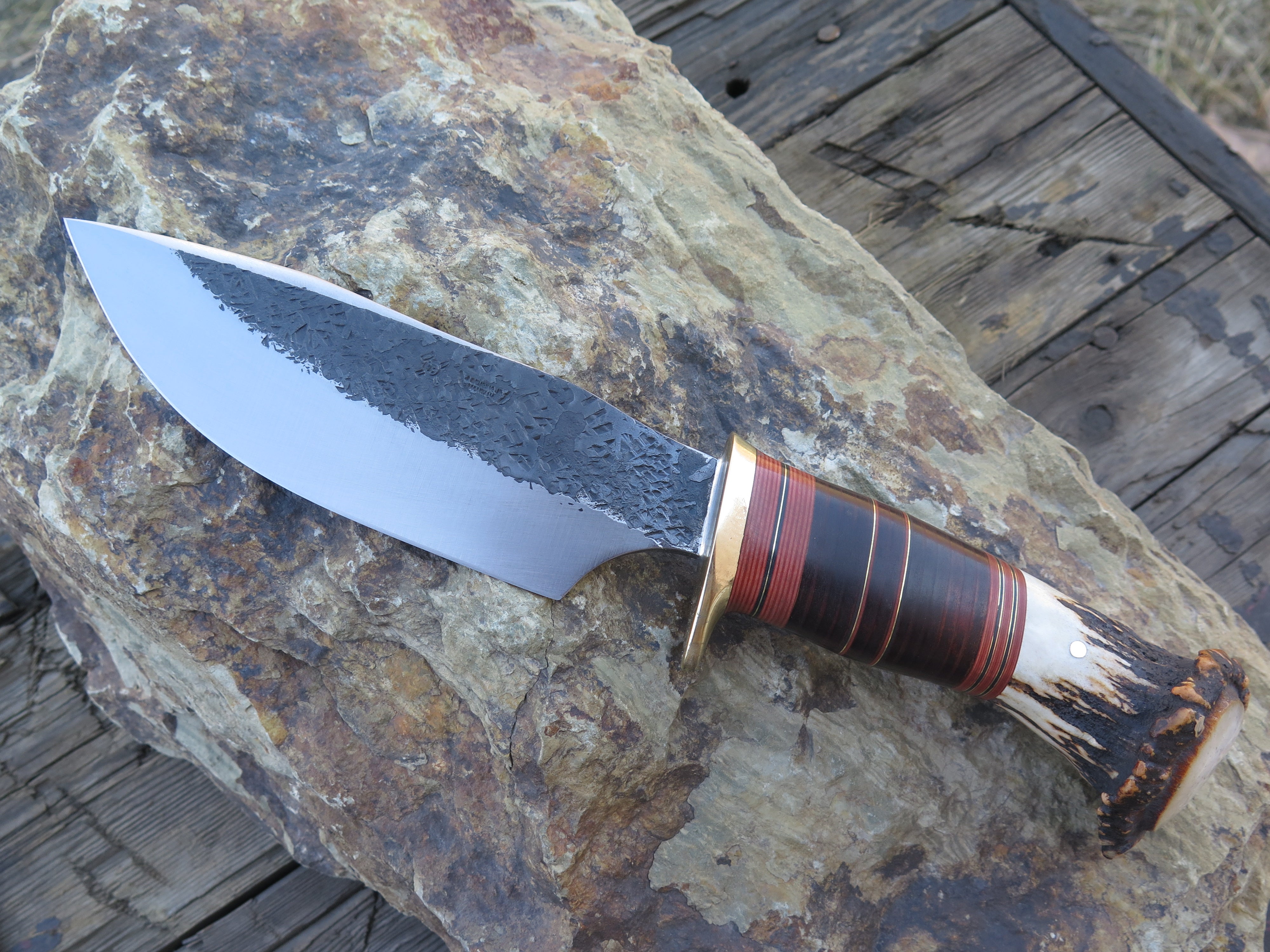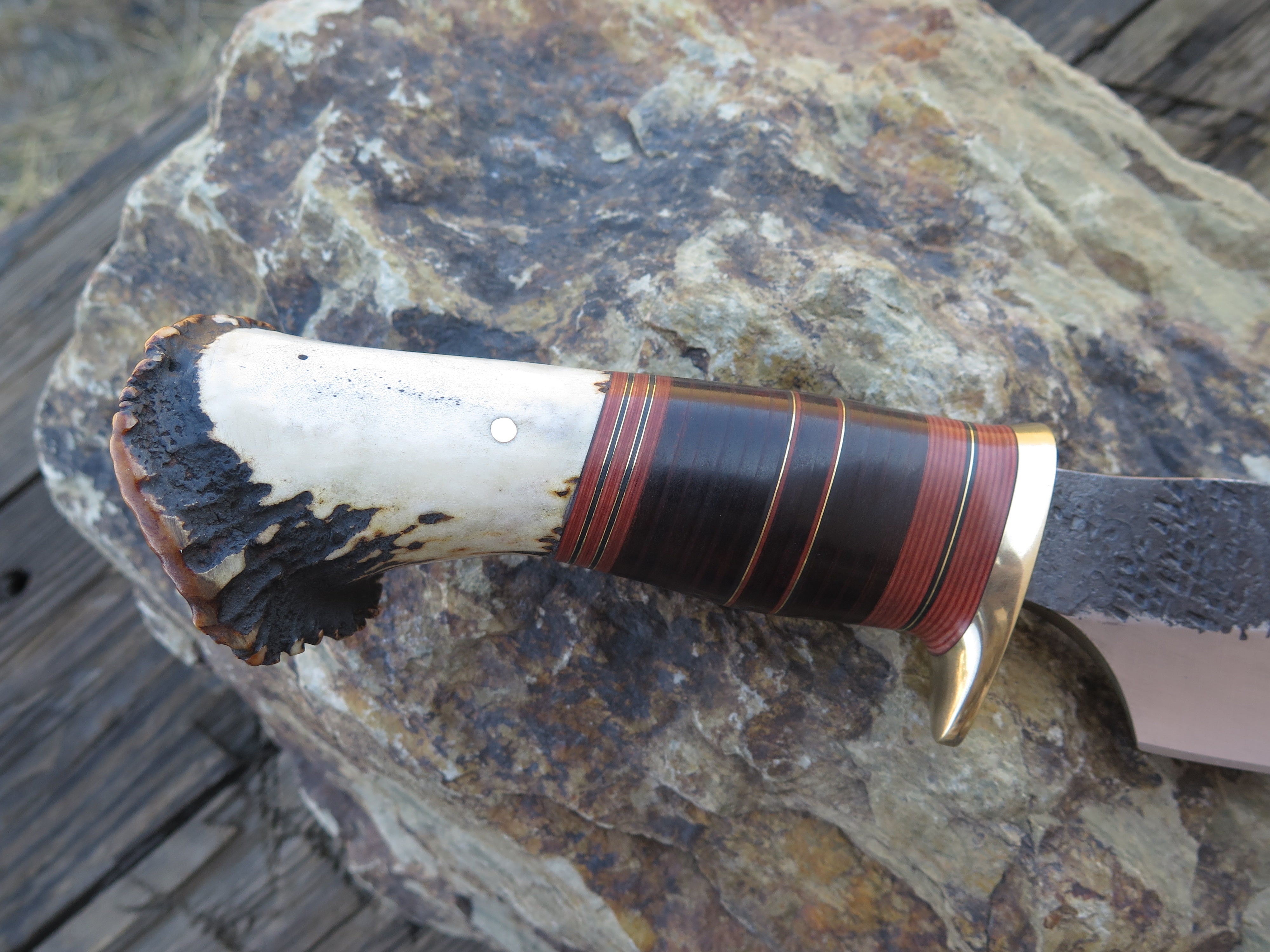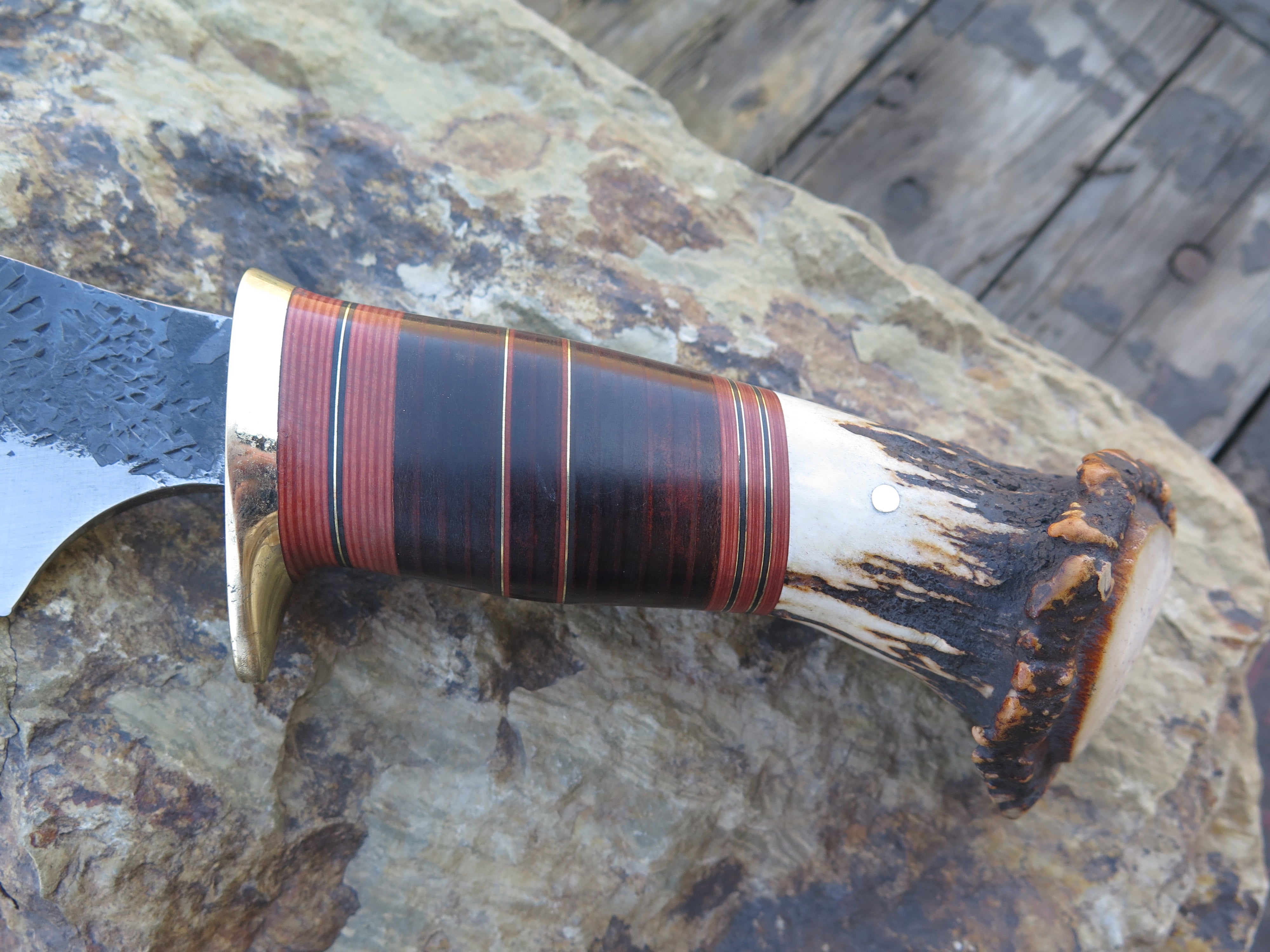 This beast of a knife is the Behring Made© Alaskan Camp knife. We hand forged the the 1/4" thick high carbon 01 tool steel blade to measure 6 3/4" from tip to guard with a razor sharp hollow grind and our hammermark finish. The brass guard is soldered in place above black and maroon fiber, brass and horsehide leather spacers in addition to the premium sambar crown stag butt that's also pinned with brass. The overall length measures 12 1/4" and it comes in a custom sheath, designed however you'd like.