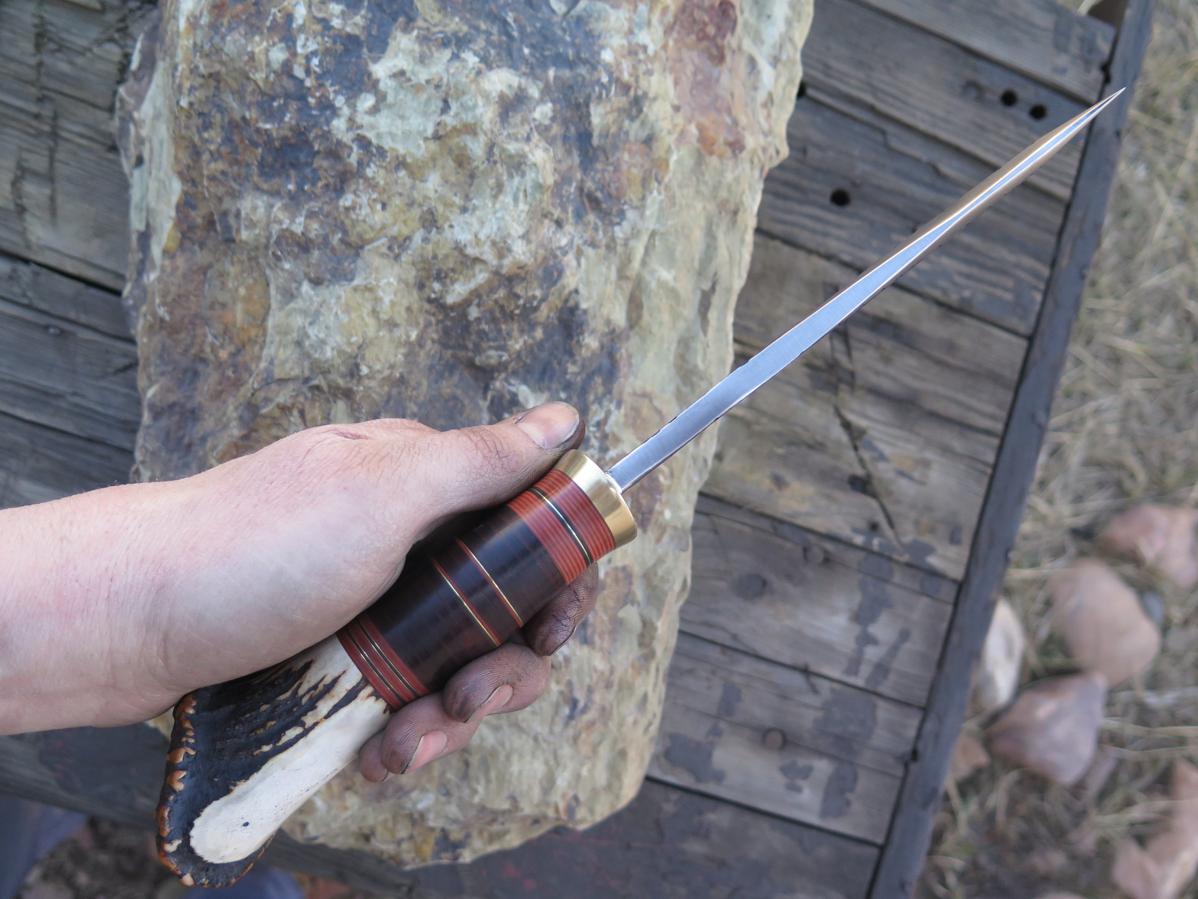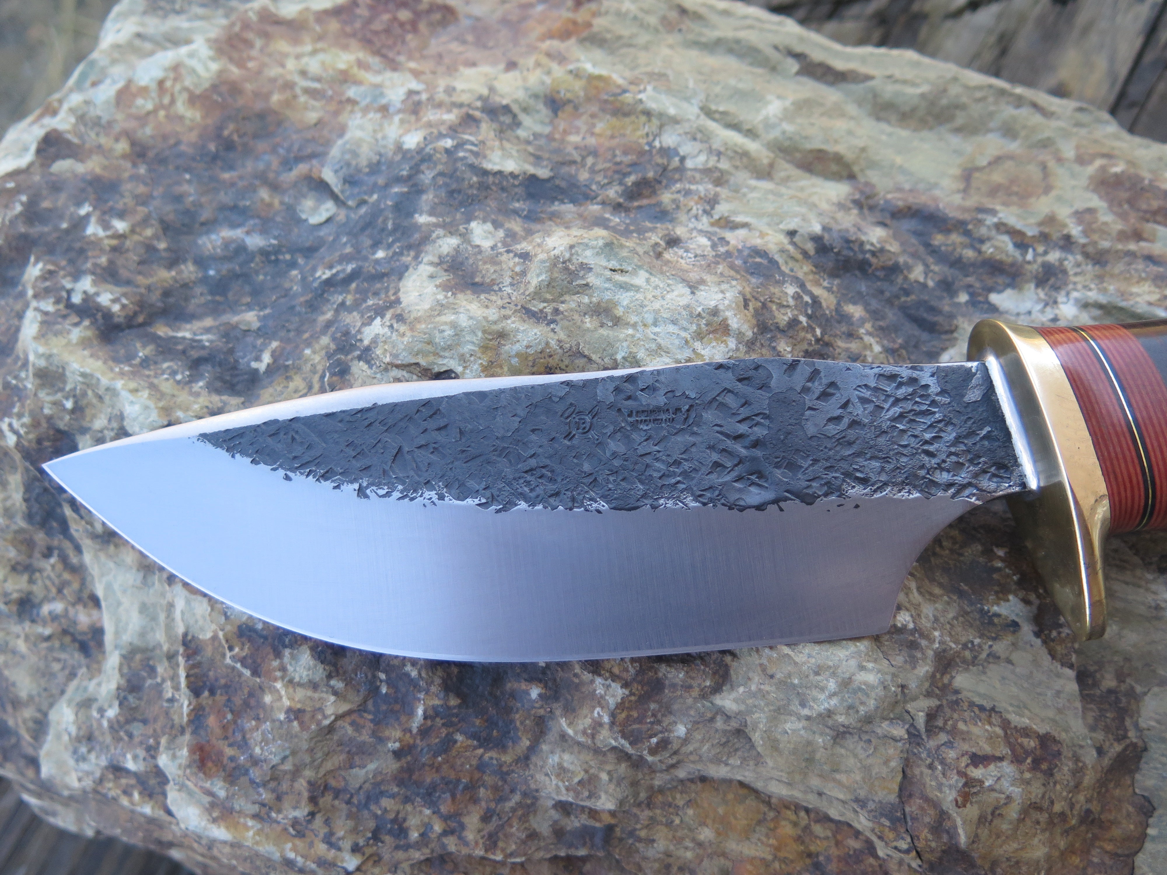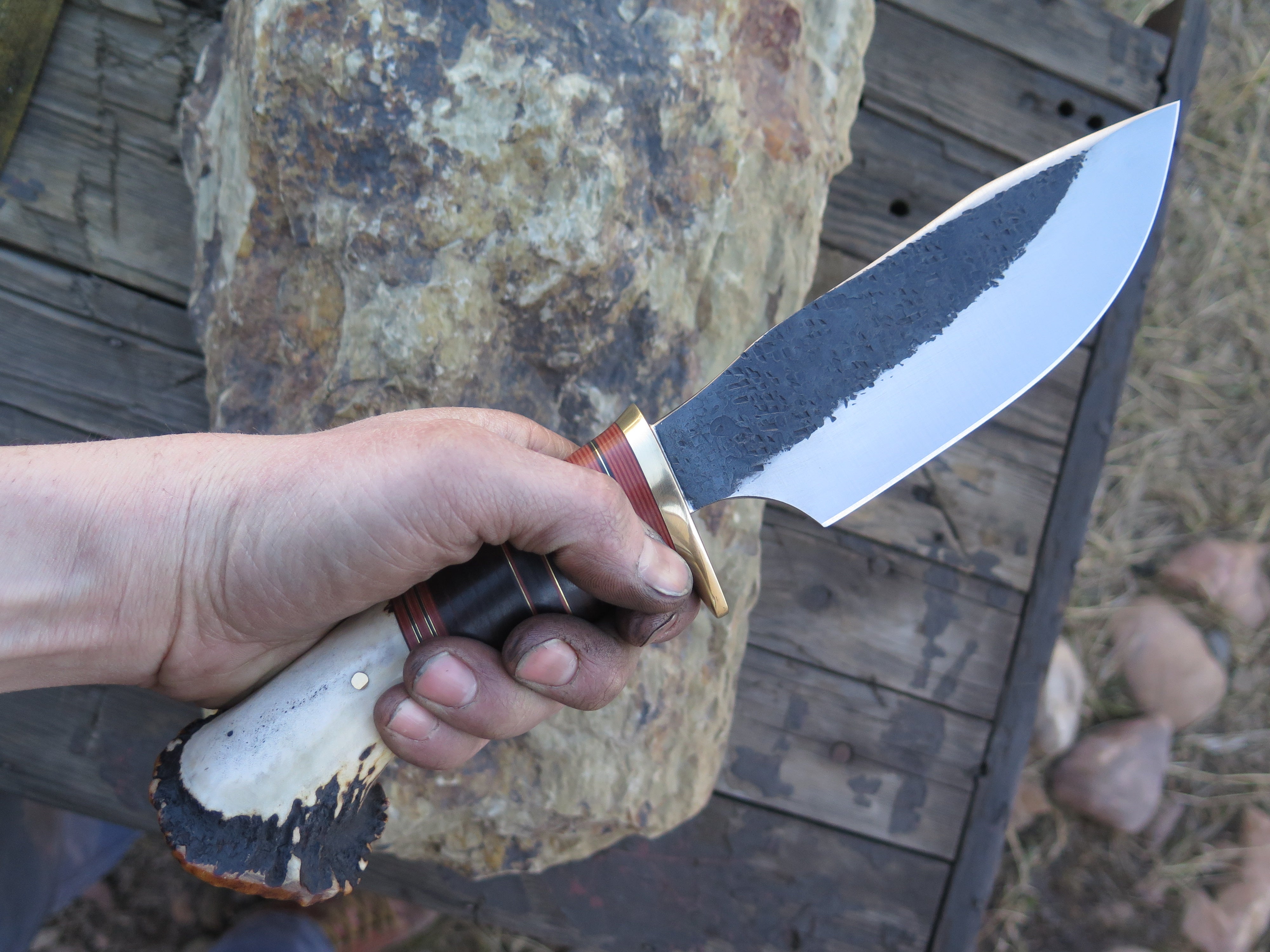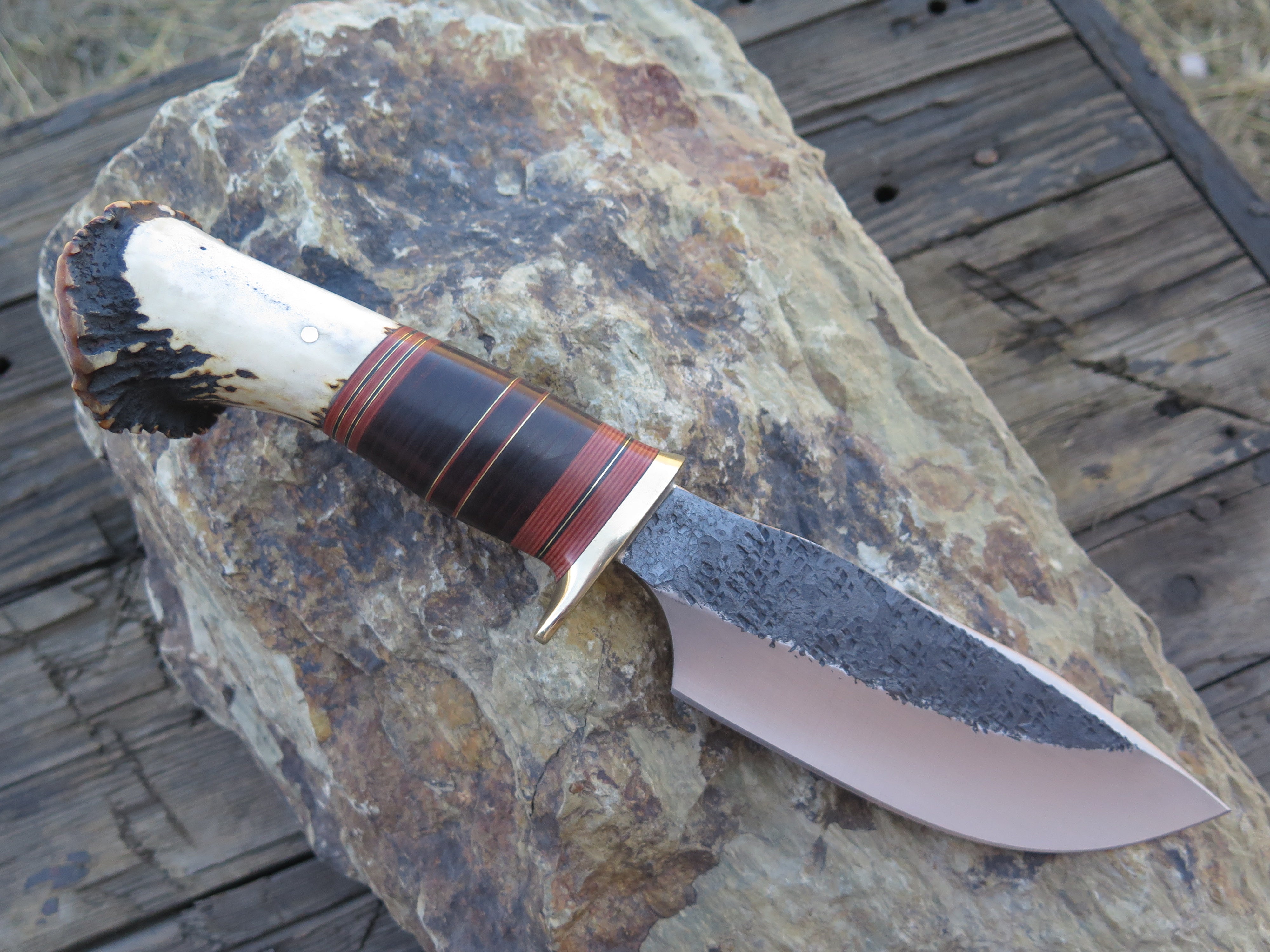 This beast of a knife is the Behring Made© Alaskan Camp knife. We hand forged the the 1/4" thick high carbon 01 tool steel blade to measure 6 3/4" from tip to guard with a razor sharp hollow grind and our hammermark finish. The brass guard is soldered in place above black and maroon fiber, brass and horsehide leather spacers in addition to the premium sambar crown stag butt that's also pinned with brass. The overall length measures 12 1/4" and it comes in a custom sheath, designed however you'd like.