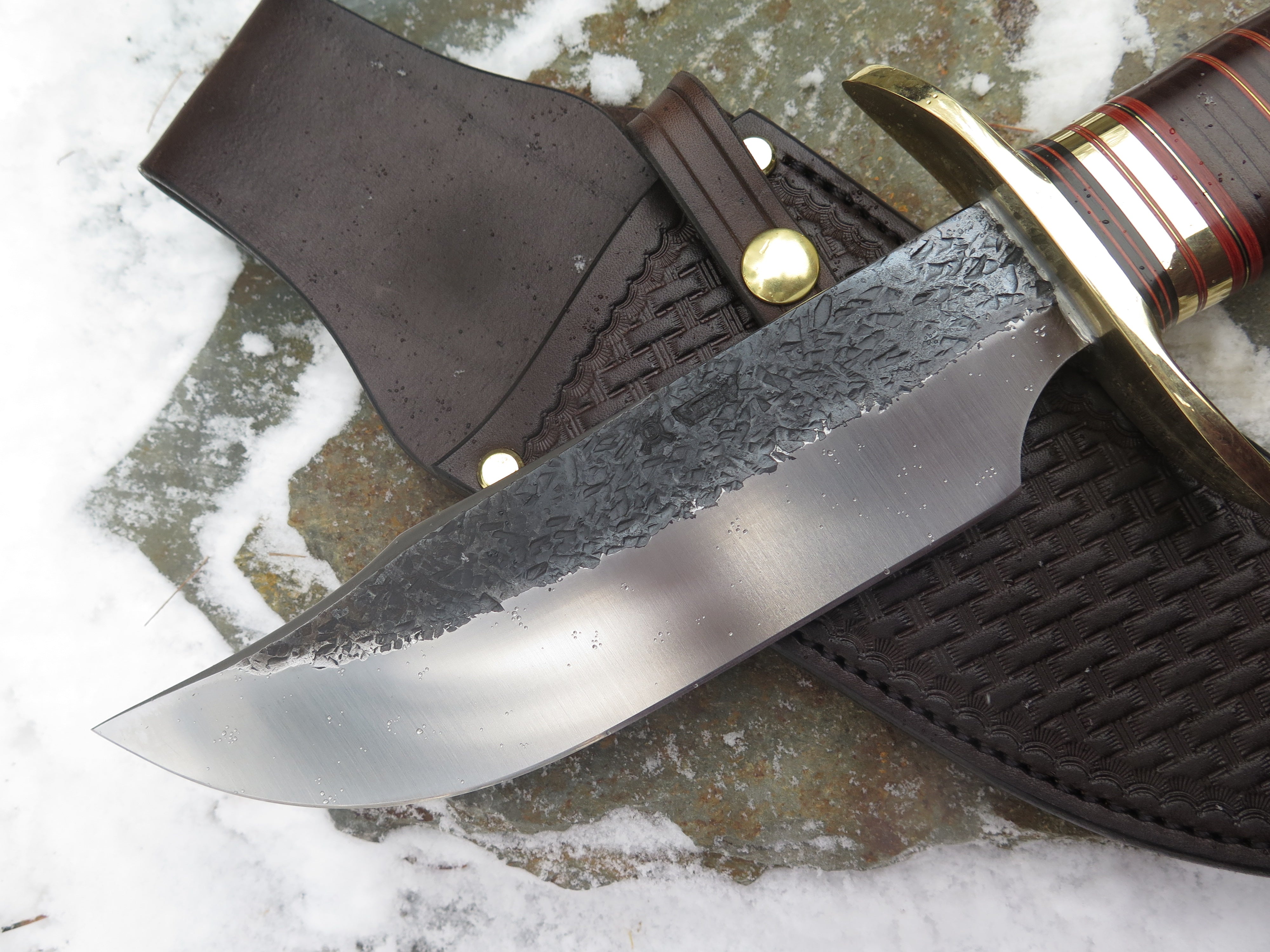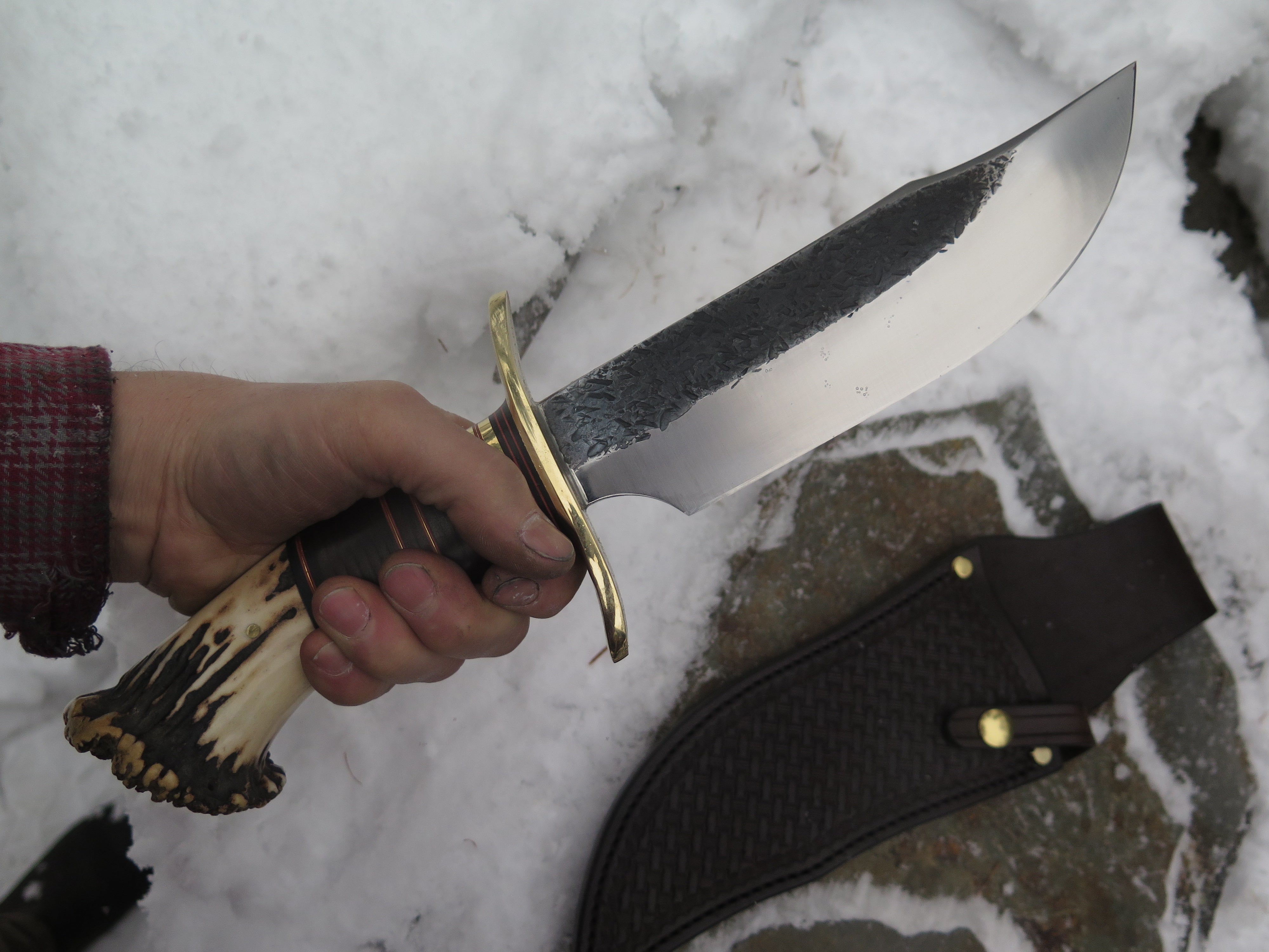 This new Bowie from Behring Made© means serious business. It's hand forged from 1/4" thick high carbon 01 tool steel and it measures 8 1/2" from tip to guard with a razor sharp hollow grind and our hammermark finish. The forged brass s-guard is soldered in place above a William Scagel inspired stack of black, maroon, brass and horsehide leather spacers as well a sambar crown stag butt that's pinned through the tang with brass and overall it measures 14 1/2". The sheath is a custom basketweave from Warlander Leather as well- a combo fit for the frontier.