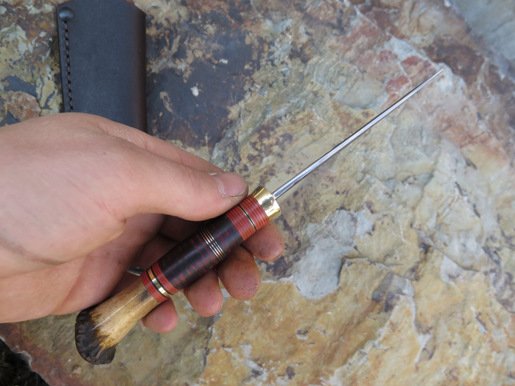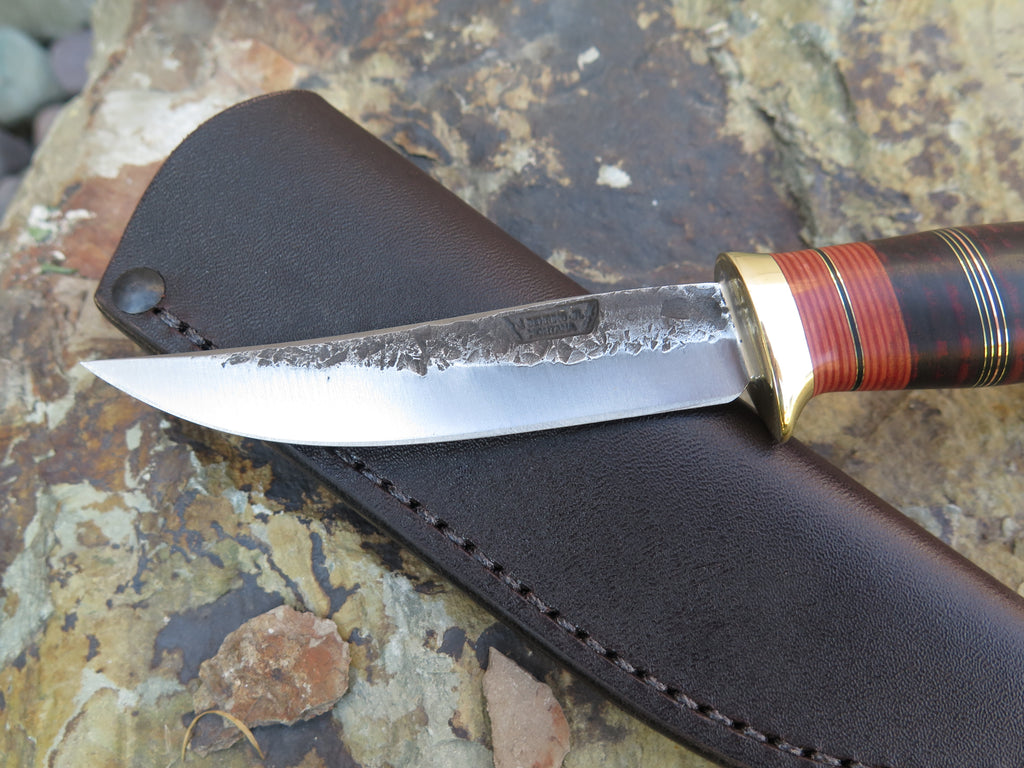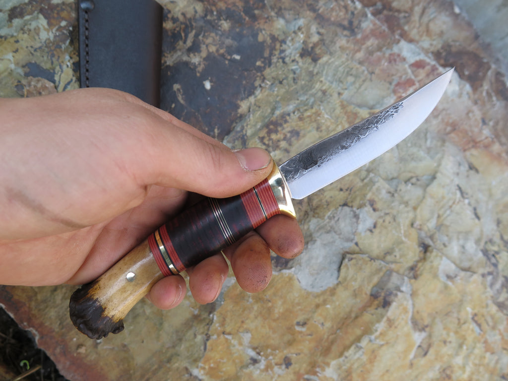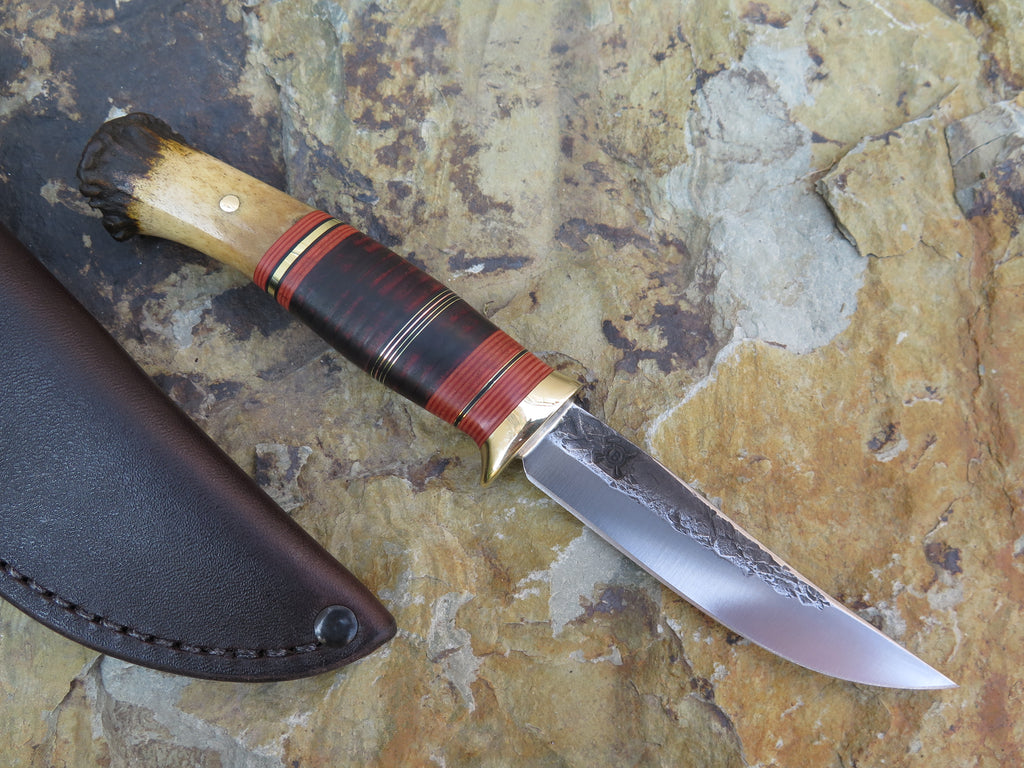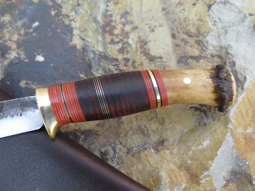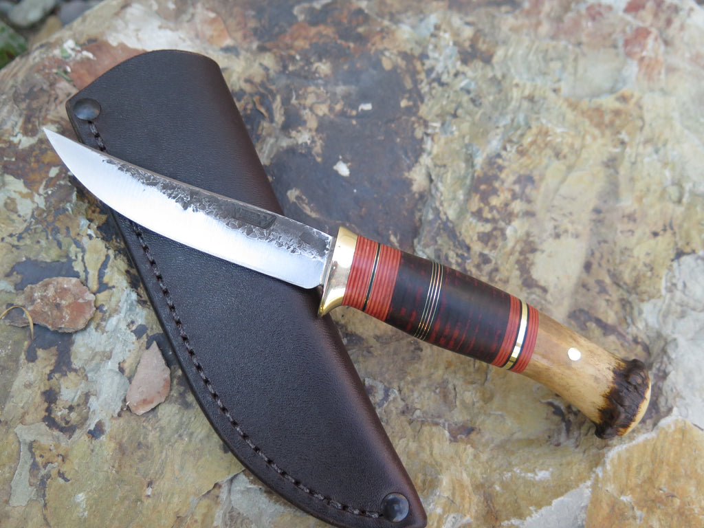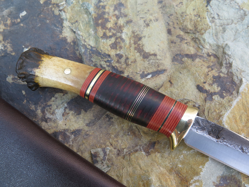 This beautiful new Pintail from Team Behring Made™ is genuine tribute to William Scagel, one of the pioneers of what is now the American modern fixed blade. This one is hand forged from 1/8" thick high carbon 01 tool steel and it measures 3 3/4" from tip to guard with a razor sharp hollow grind and our hammermark finish. The brass guard is silvered soldered in place above black and maroon fiber, brass, copper and horsehide leather spacers as well as a crown stag butt that we've pinned through the tang with brass. The overall length measures 8" and it comes in a Warlander Leather pouch sheath- a true classic!