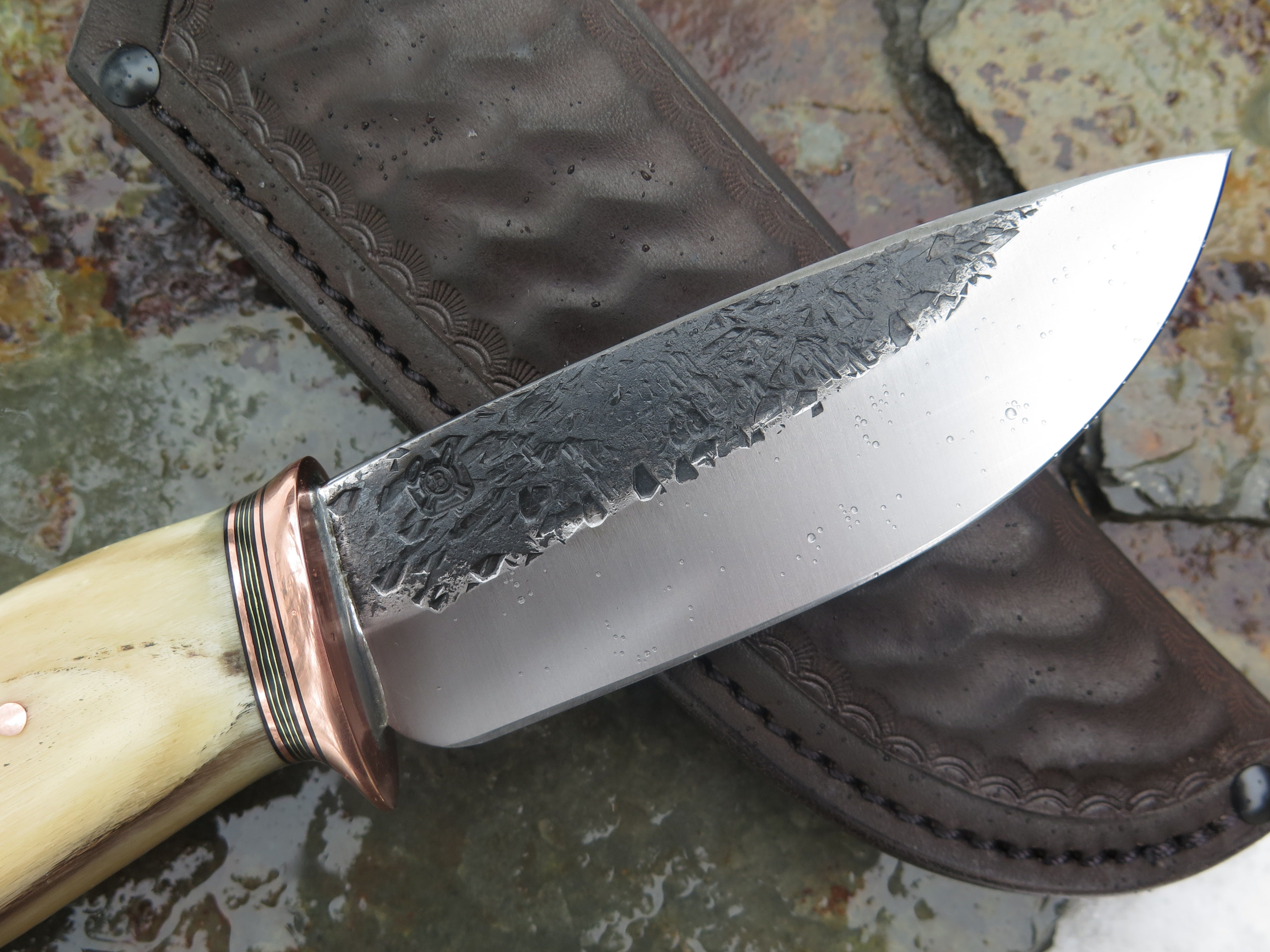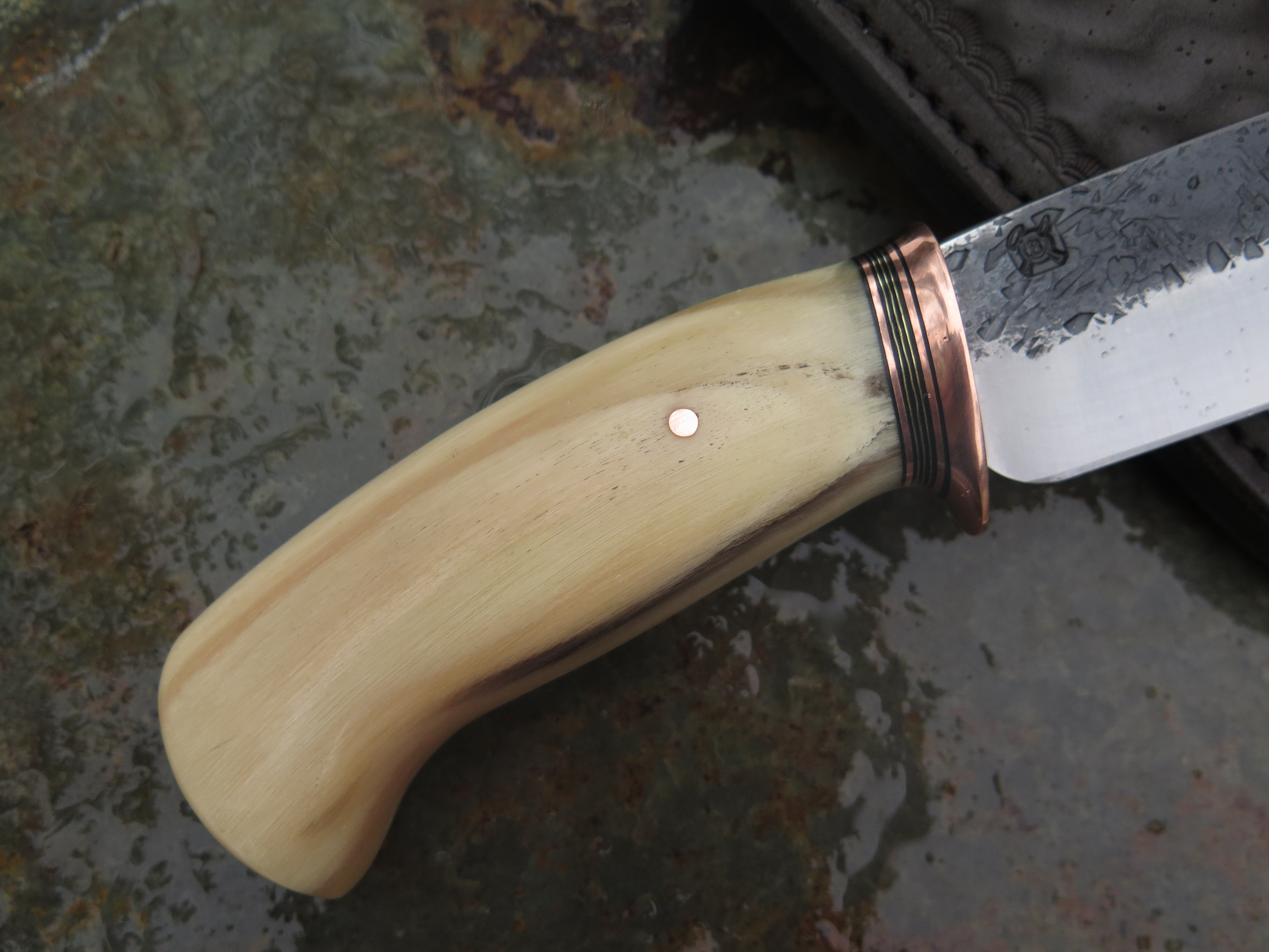 This remarkable Drop Point from Behring Made© is hand forged from 3/16" thick high carbon 01 tool steel and it measures 5" from tip to guard with a razor sharp convex grind. The copper guard is soldered in place above black, brass and copper spacers in addition to the top shelf Dall's sheep horn handle with a wonderful texture and color range. The overall length measures 9 1/2" and it comes in a full cover classic belt pouch sheath.