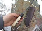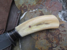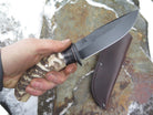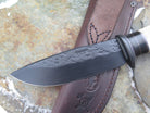 This incredible new Drop Point from Behring Made© is hand forged from 3/16" thick high carbon 01 tool steel and it measures 5" from tip to guard with a razor sharp hollow grind, hammermarks and a forced patina blued finish. The blued steel guard is soldered in place above black fiber, copper, aluminum and African ebony wood spacers as well as a premium Dall's sheep horn handle that is pinned with copper. The overall length measures 9 3/8" and it comes in a classic leather belt pouch sheath.
