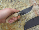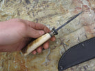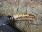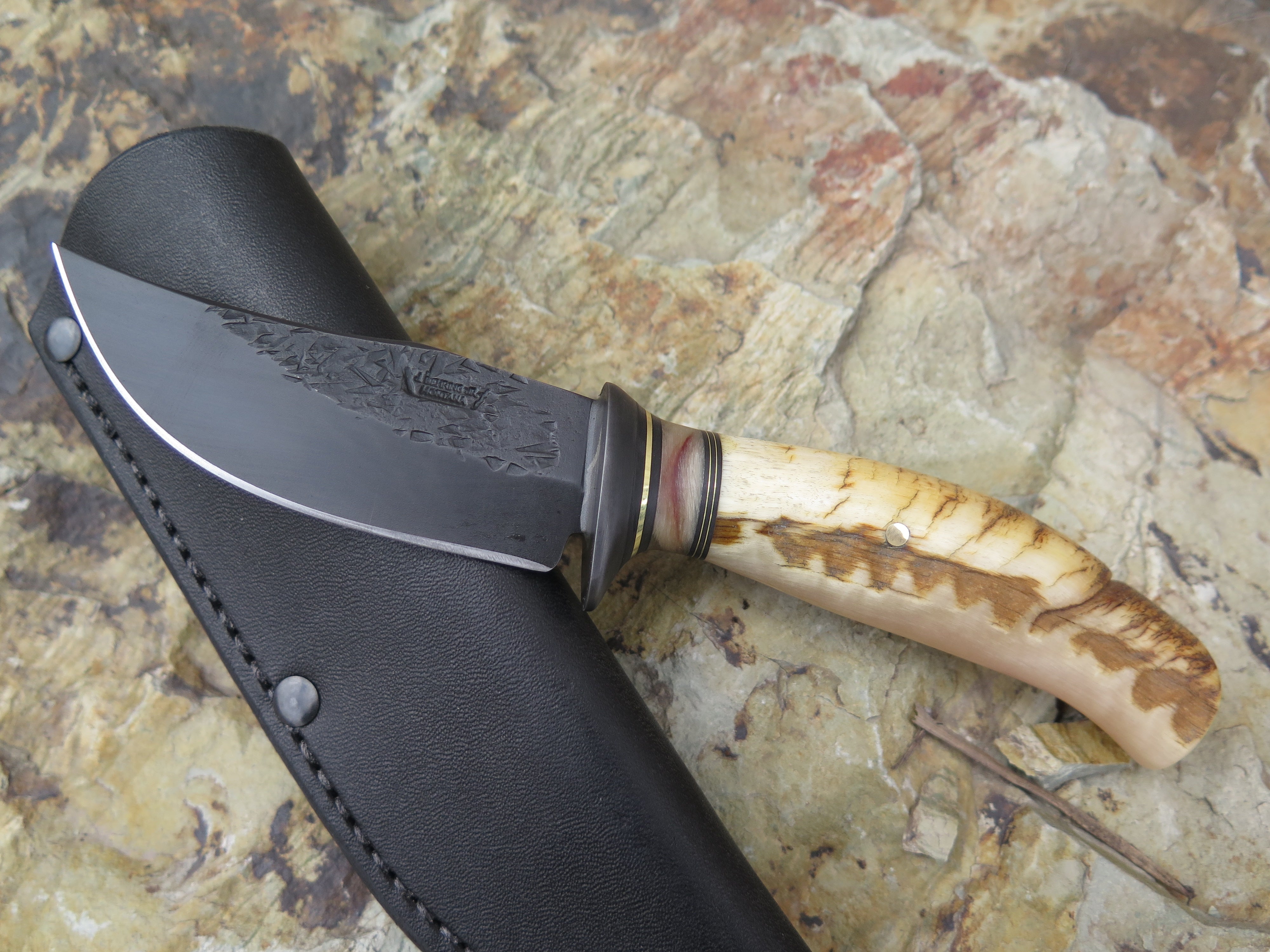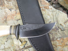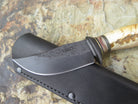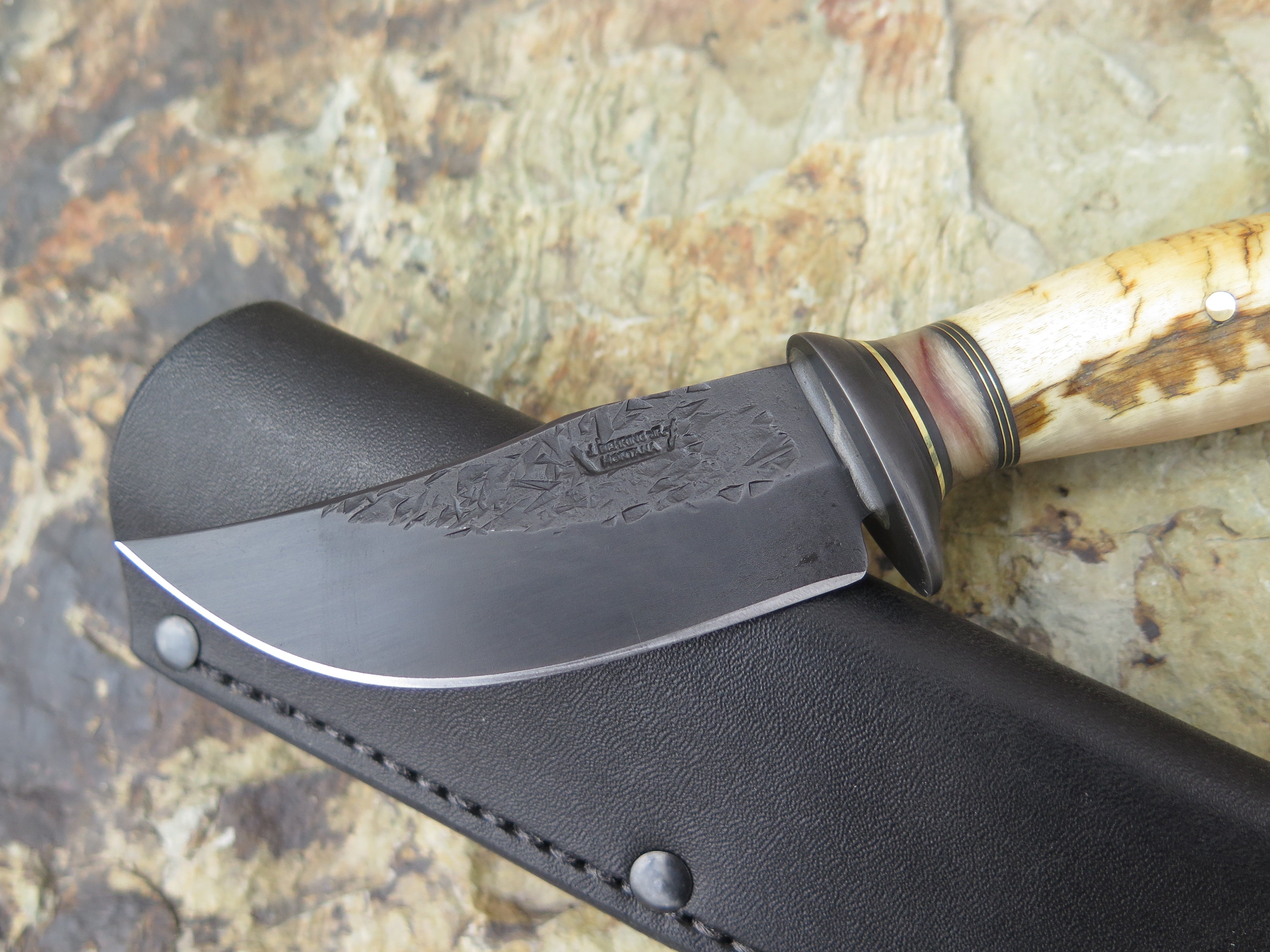 This bad ass new Sharptail from team Behring Made© is hand forged from 3/16" thick high carbon 01 tool steel and it measures 3 1/2" from tip to guard with a razor sharp hollow grind, hammermarks and our forced patina blued finish. The blued steel guard is soldered in place above black fiber, brass and Dall's sheep horn spacers as well as a remarkable Dall's sheep horn handle that we've pinned through the tang with copper as well. Overall length measures just shy of 7 1/2" and it comes in a classic Warlander Leather pouch sheath.