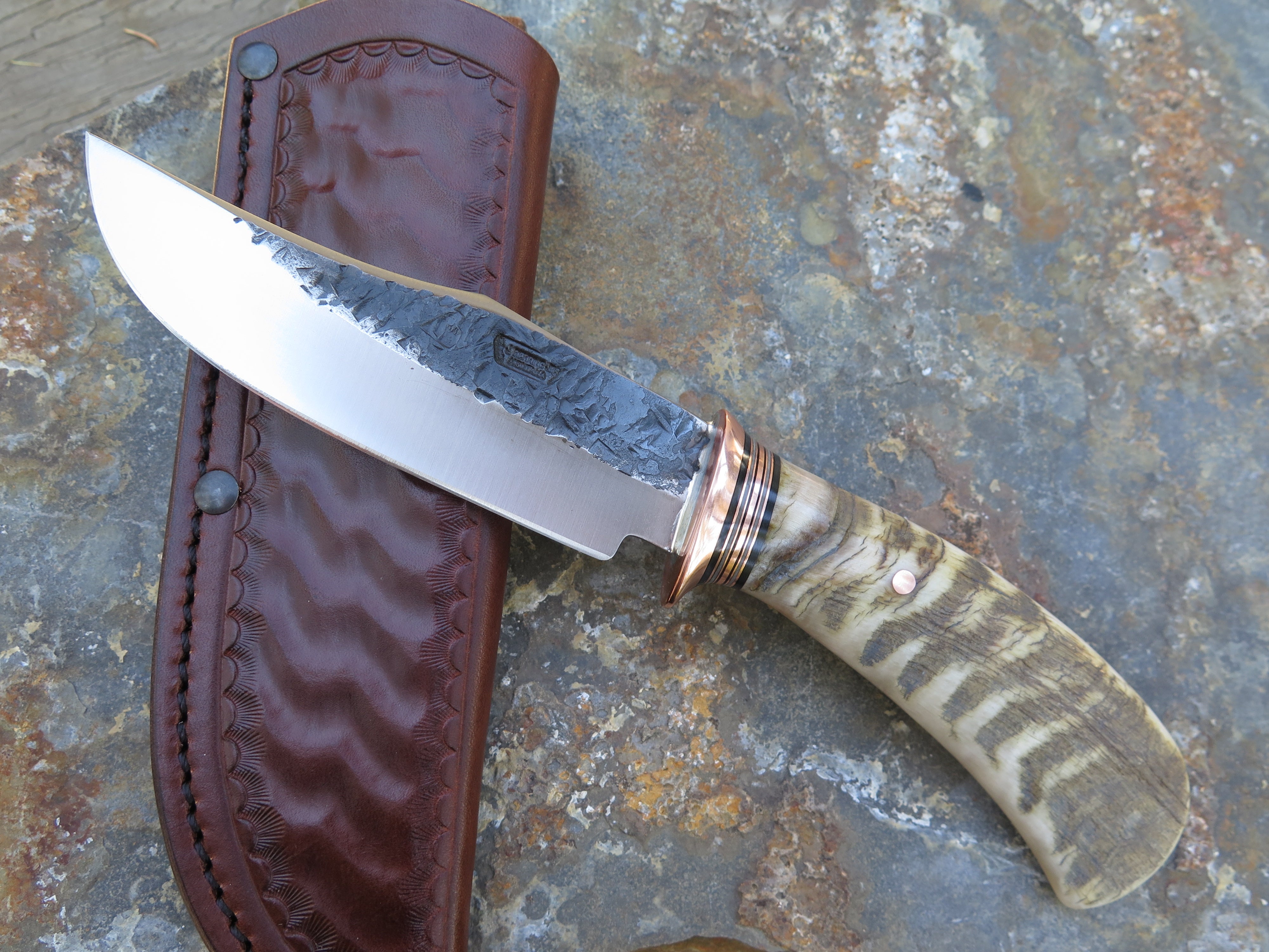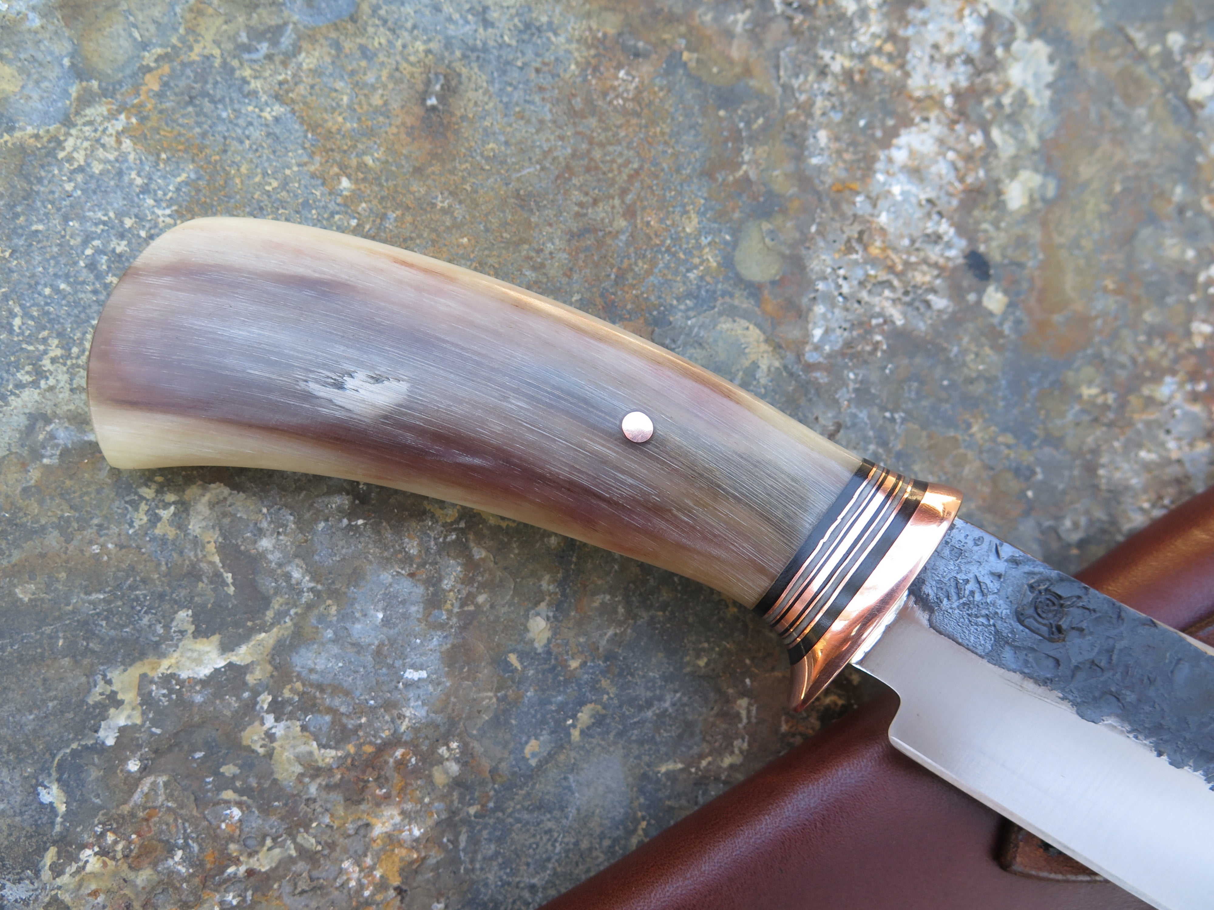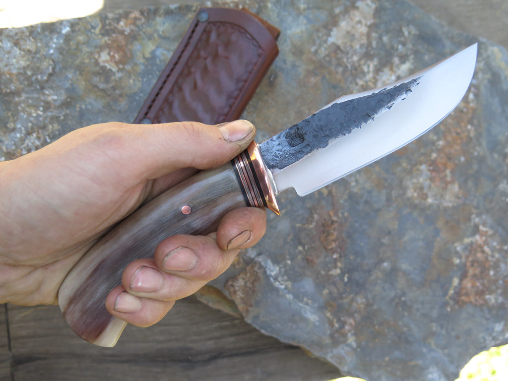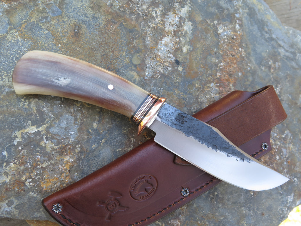 This incredible new Hunter from Behring Made© is hand forged from 3/16" thick high carbon 01 tool steel and it measures 4 3/4" from tip to guard with a razor sharp hollow grind and our hammermark finish. The copper guard is soldered in place above black, gray and copper spacers. The handle is premium Dall's sheep horn that is pinned through the tang with copper, and overall is measures 9 1/4". The sheath is a primo sheep tooled pouch and this one is guaranteed field ready.